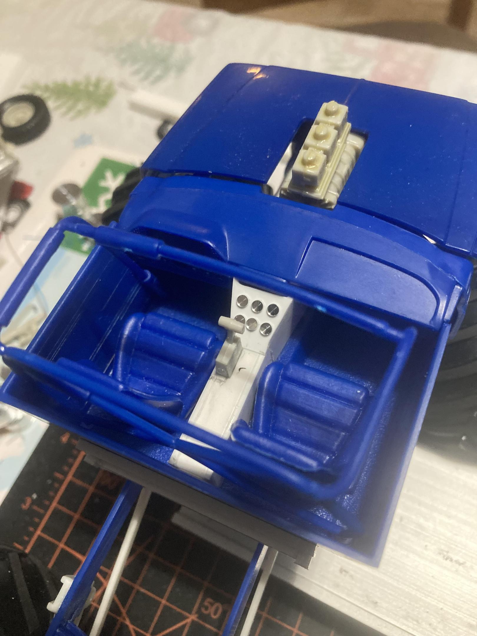 Decided last night that I didn’t like the radiator support and cut it out. I also made the decision to move the engine forward slightly. Doing both of these things, I feel, netted me a better result. The cab now sits exactly where I need it, and the engine is just off the firewall. This also allows me to fit the moebius core support with hood latch, and the radiator of my choosing. I now have plenty of room forward the cooling fan. This has also centered up my wheel to wheelwell position. Amazing what a scale 3” can do in terms of looks