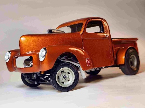 Now that High School boys swimming has started up my building is going to slow down. I did get some things chipped away at though. I cut the floor out of the frame and started work on angling the rear up and bobbing it. I also scratch built a model a style rear cross member. And the quick change is out of the monogram t bucket. The front wheels are out of a polar lights funny car and the tires are the Perelli front runners out of the Revell 31 sedan. The rear wheels believe it or not are are the front wheels out of the AMT 40 Willys, sanded down the rim for a better look because the amt rims always seamed to thick. I also cleaned up the engine by taking off the heads and actually gluing them on correctly, I also stripped the brush painted paint off to reveal that 90s AMT brown plastic because this is out of the amt 57 Chevy with the yellow car on the front.