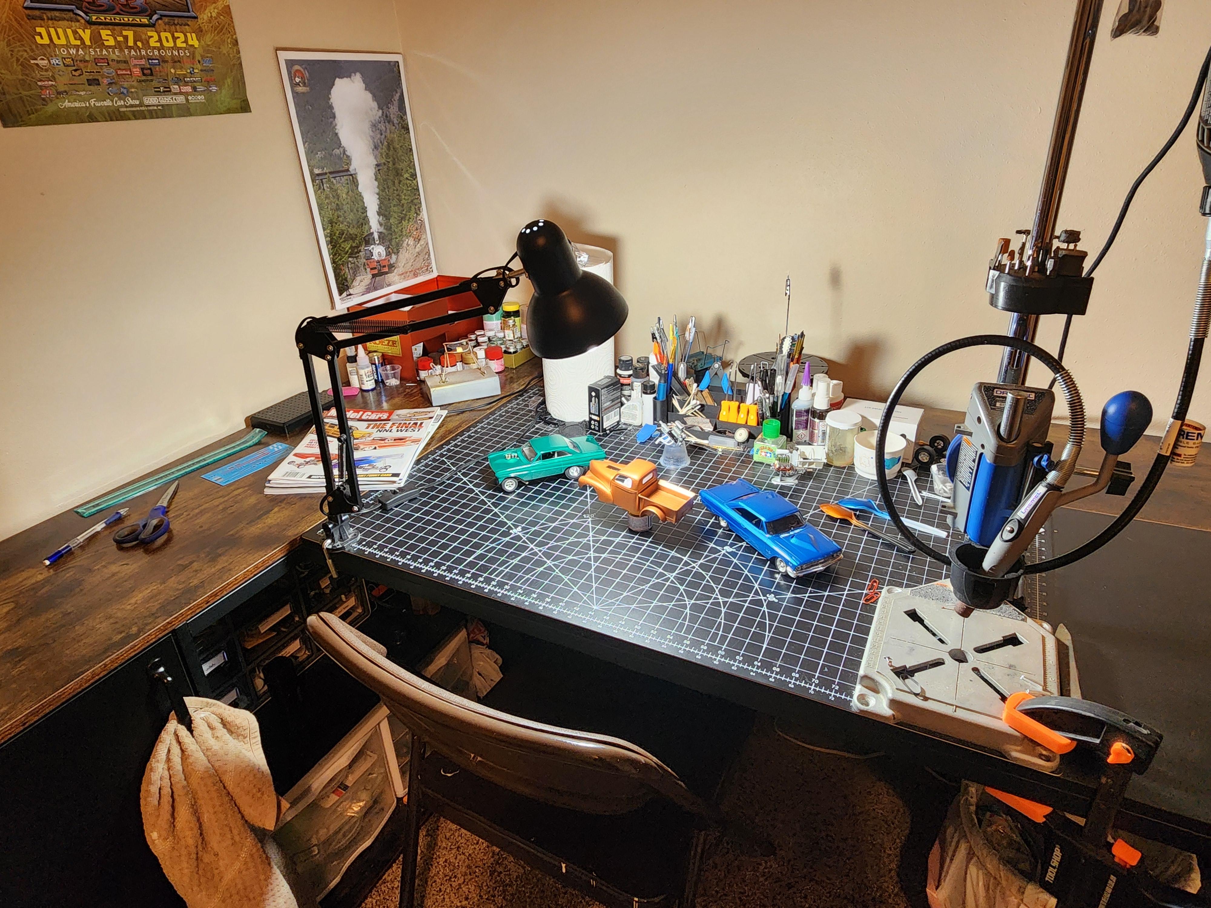 Cleaned it up big time for this shot, definitely needed it. The black desk around it really gets dusty when i start hammering away at sanding though. I do really need better storage for my paints, right now there just in an old cashew box. -