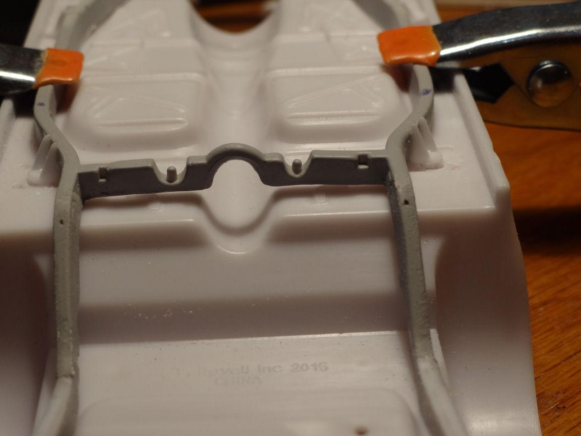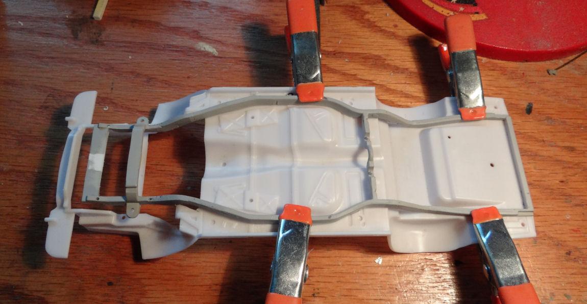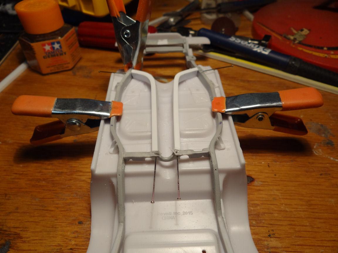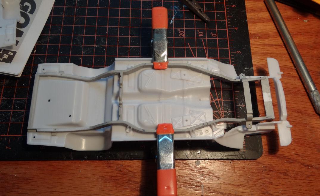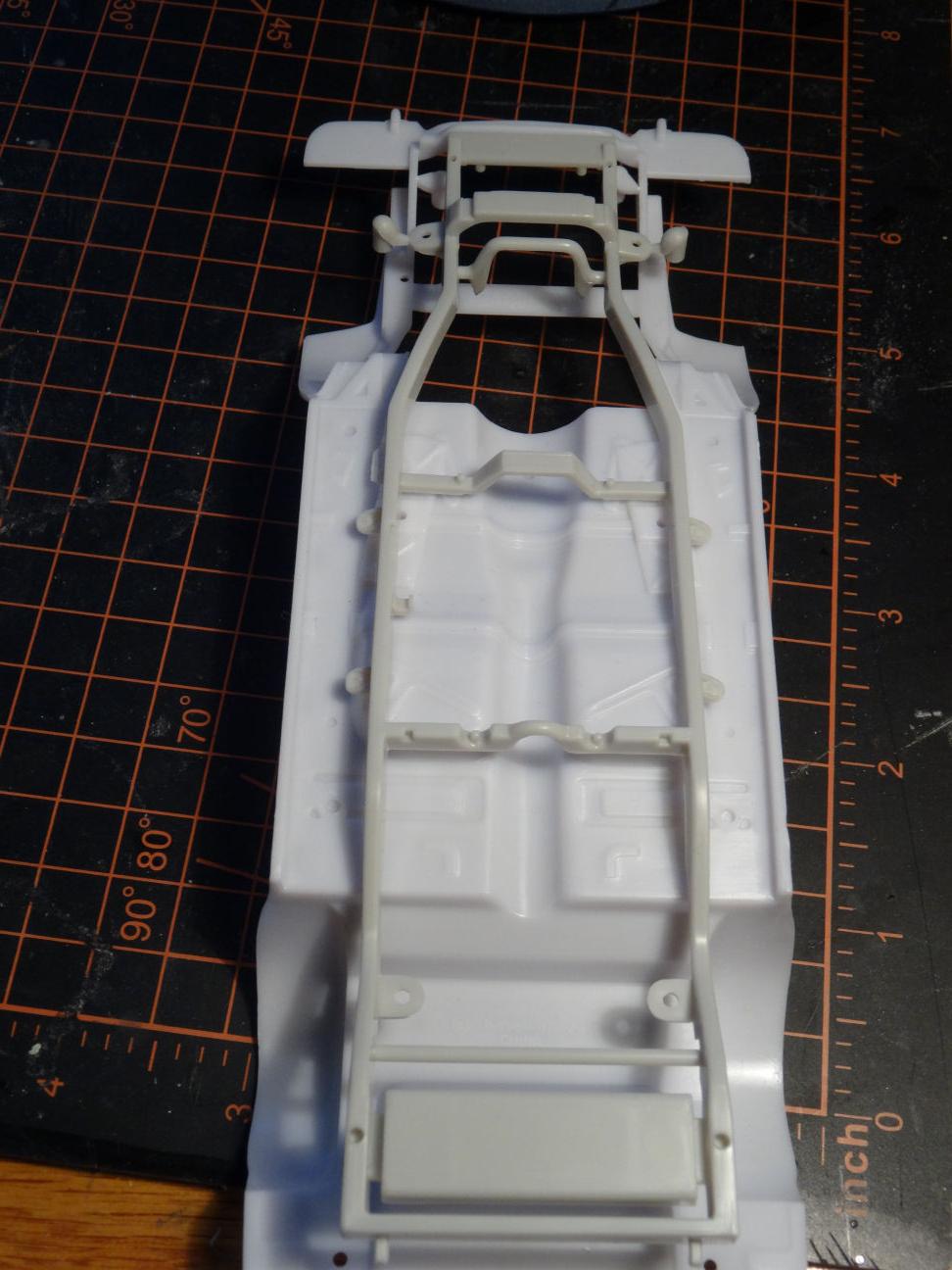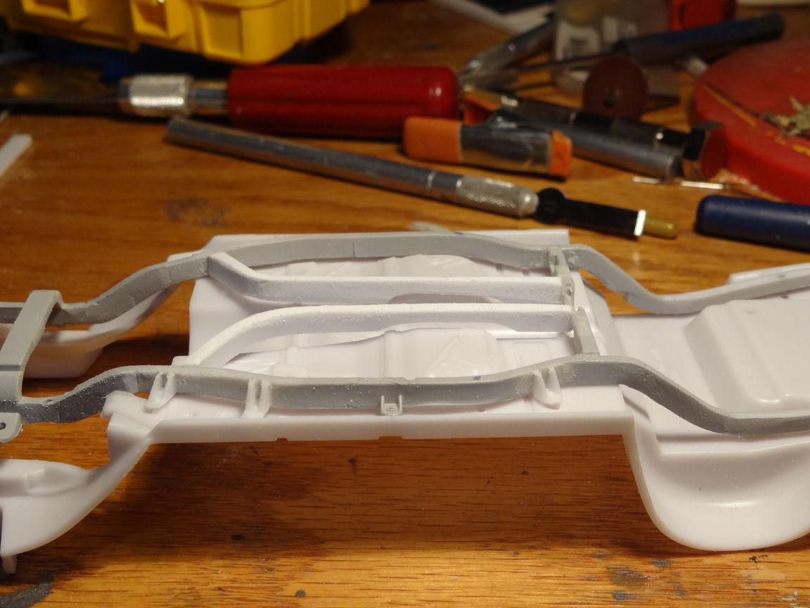 The rear cross-member on the kit chassis is upside down compared to the '57. The exhaust cutouts face the ground when they need to face the floor. That will need to be inverted. This now sits more like the real car. Next we have to add the inner frame rails. Crafted from some .100 x .188" styrene strips, which are slightly larger then the other rails but will be sanded down to size. I pinned them in place until the glue set. I took a liberty on the top side of the new rail where it passes below the chassis pan. Rather then carving into the pan which would then create a domino effect on the interior I scalloped out the rail a bit. That center rail mount, the one original to the chassis will need to be moved to the inside of the rail. Then we need to add some bracing at the front and rear intersection where the rails unit. Bob, any photos of those braces would be welcome. That's a wrap for now, catch ya next time.