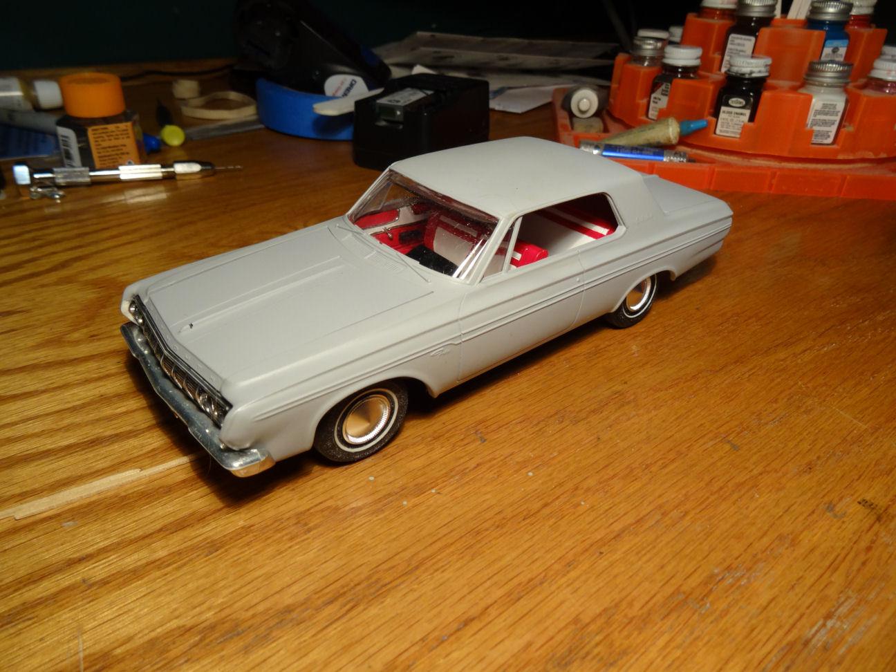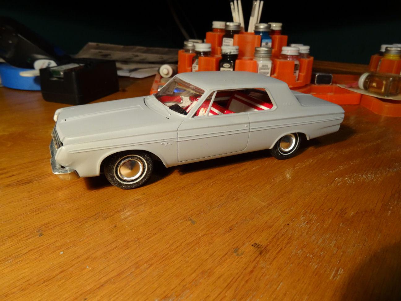 Fundamentally the parts I am using from the '64 Lindberg kit I'm building OOB. For the most parts things are going together nicely. The chassis has nice detailing and most things fit well. Somehow they completely missed the boat with the wheel fitment. The stubs that the wheels mount to are much smaller then the holes in the wheels. And why couldn't they put some detail on the so called 'BRAKE PLATES'. Another issue is the interior sides, they are too short front to rear so they don't fit nicely into the tub. Otherwise I like what I see and will probably use the same bits for another build. Making some progress as the interior is coming together, still have a few minor bits to do but it's getting there. The interior is 90% Lindberg and 10% Johan. The dash and steering wheel are Johan. The seats are from a Lindberg '64 Dodge 330 and the rest is the '64 Lindberg Plymouth for those of you keeping score. Got the reliable old slant six into the chassis and it's feeling at home. Don't know why the intakes look green in this shot, but they are different shades of gray. And a good portion of the chassis is together. Still a few bits here as well along with some touch up work. But then trouble arose when trying to build the engine compartment and attache the six banger to the radiator. The radiator hoses don't line up with the holes in the radiator. Dug out a few more of these kits and not one of them had a radiator suited for the six cylinder. What's the deal with that???? The radiator had holes in the top right and lower left. The six needed holes top center and lower right. Had to take the radiator back out, plug 2 holes and drill 2 new ones. The top center hole is right below the radiator cap which is not a proper spot for it so I guess I need to move the cap as well. Have to research where it belongs. I mocked everything up to get a feel for the old girl. I originally was thinking about red-lines with poverty caps. Trying to scrounge up four red-lines I came across and envelope marked 1957 Plymouth. My old man loves these wheel covers for some reason. He had them on the '57 Dodge, '66 Fury wagon, even put them on my brother's '71 Valiant. And right at this moment I'm sure they are hanging out in his garage. So I put on some whitewalls and the '57 covers for a look-see. WDYT? They still need a black wash. Not sure if I like them or not. Might have to wait until I get color on the body. Which is going to be black BTW. Now it's time for a break or should I say brake???? Has anyone else noticed how many people on the internet and especially fleabay use the work break when referring to car brakes. Drives me nuts.? Do you really want to buy from someone who sells "break parts" ? Thanks for listening, catch ya next time.