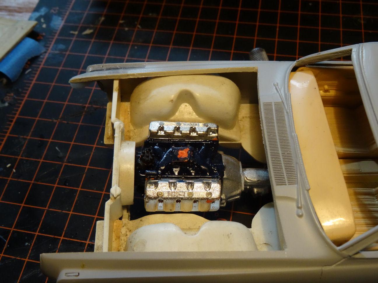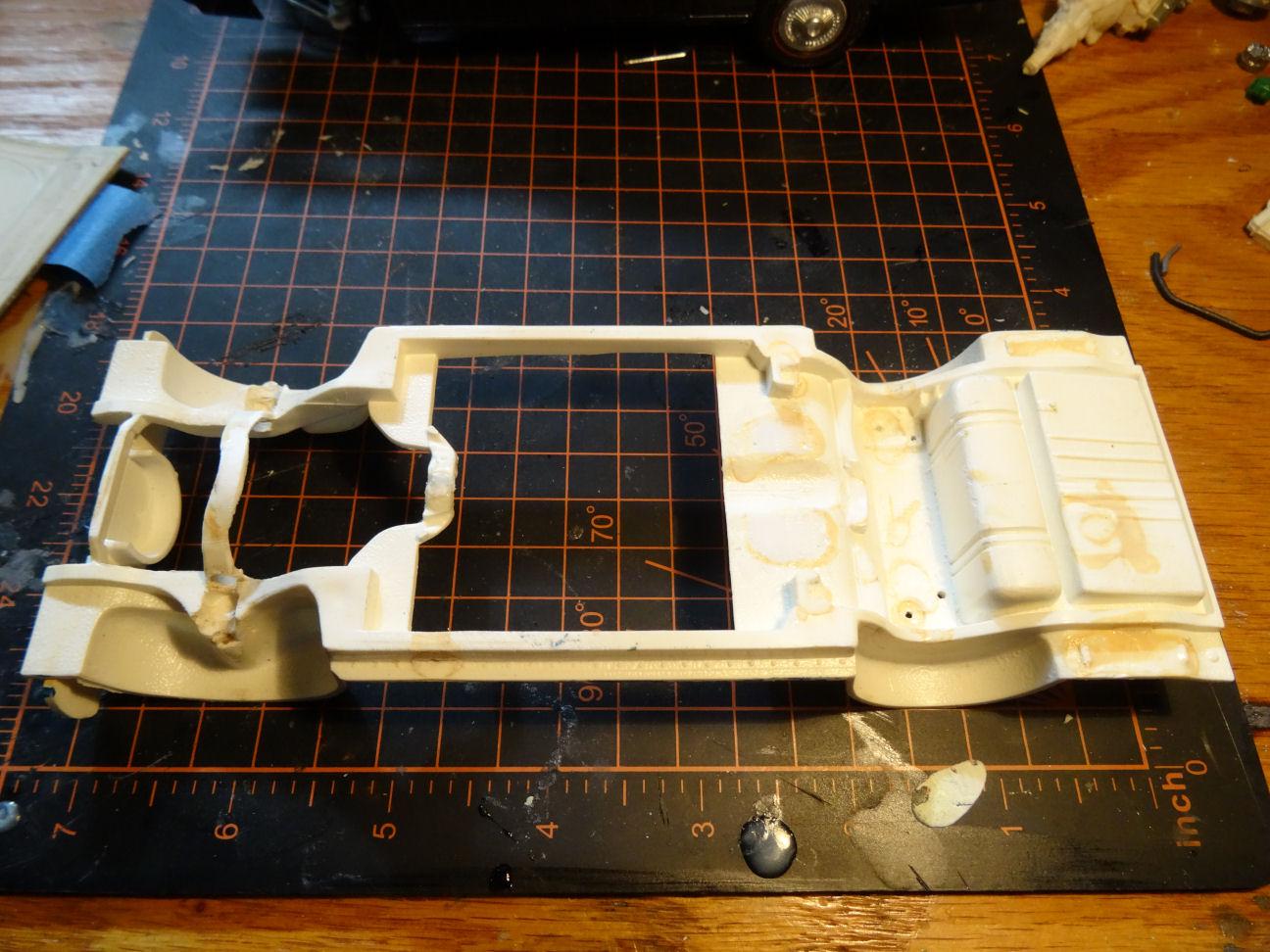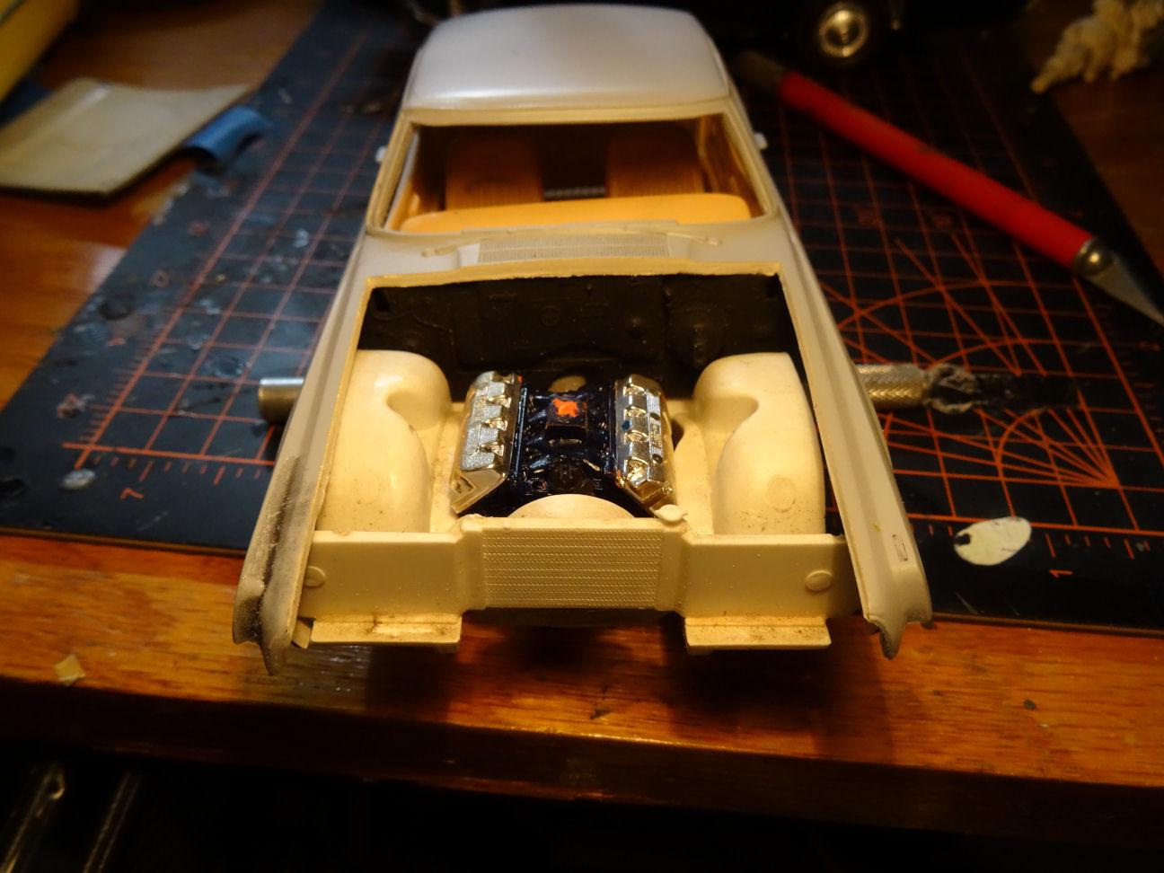 Work progresses on the sad little chassis so I can do a mock up and figure out what is going to fit. First order of business is to clean up the glue bomb. Don't know if anyone else has ever tried this but I will actually apply liquid cement around the glued in pieces to soften the glue before I try to remove pieces. Got everything off and only suffered a little damage. The mufflers did not come off without a fight and actually left two gaping holes behind. Covered the outside of the holes with some duct tape and then poured some casting resin over them from the inside. Trunk floor will need some repair work and the area where the resonators were as well. 1/24th Boss 429 in place and it actually fits rather well. The transmission mount will need to be moved rearwards or the frame mount forwards. We are a little cramped up front but I can move the radiator core support forward so we can squeeze a fan in. But the engine really fills in the engine bay. Think this is the engine we are going to stick with. So off to clean things up a bit more, see ya soon.