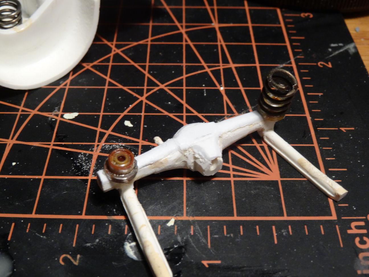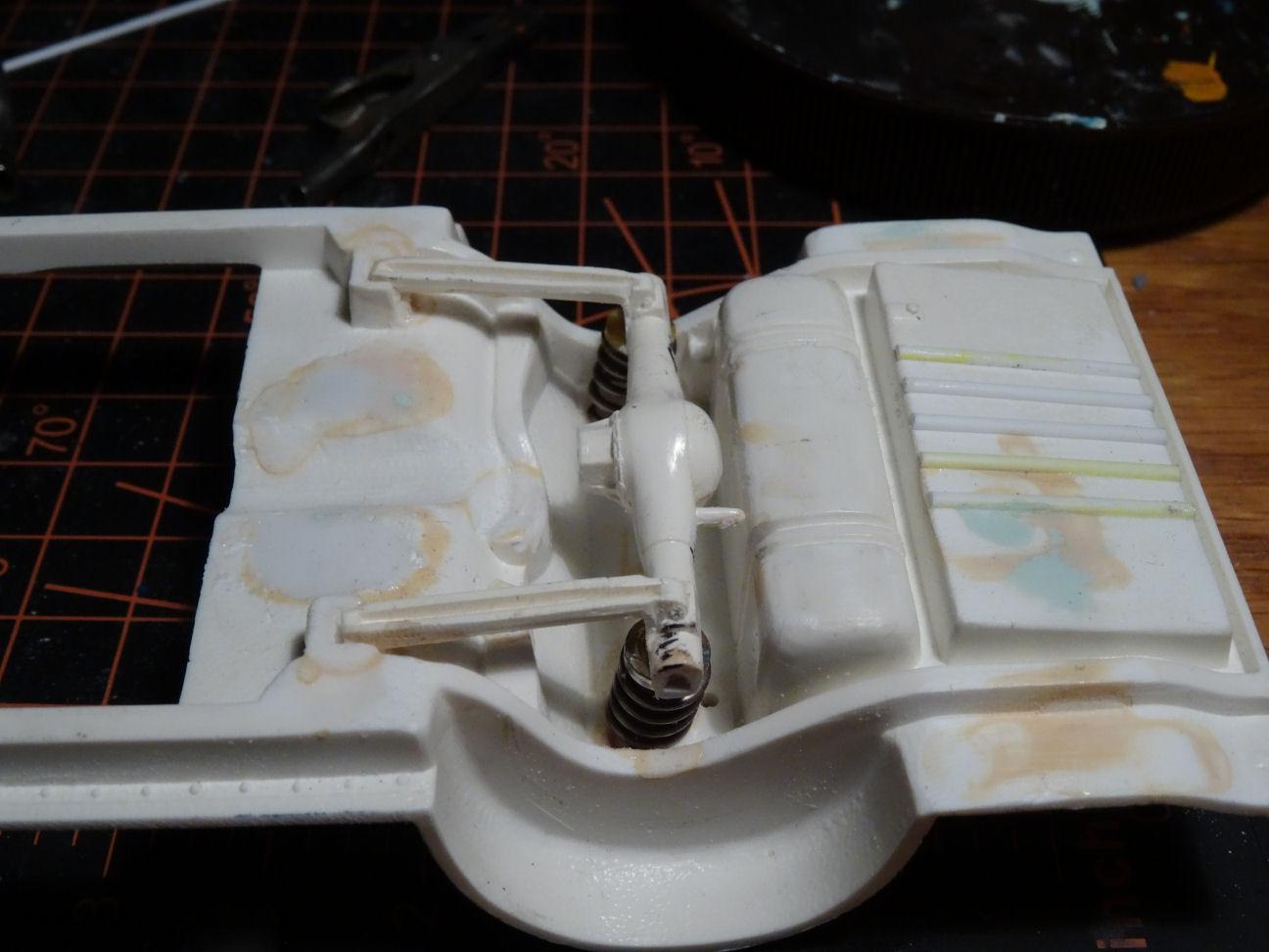 Some more chassis work done this afternoon. Didn't find exactly the type of rear axle I was looking for so I settled on one from the AMT 1965 Galaxy. Problem with this axle happens to be the fact that it is open on the underside. Closed that up with some styrene strips. Axle is coil spring mounted so I added some spring perches to the underside of the axle. Can anyone identify the source for the spring perches? Found some springs lying around which I cut to the approximate length. Size will be determined later when I establish the ride height. Axle in place and it seems to line up all together pretty well. That's all for now, dogs have been fed and now it's time to cook dinner, chow🤓