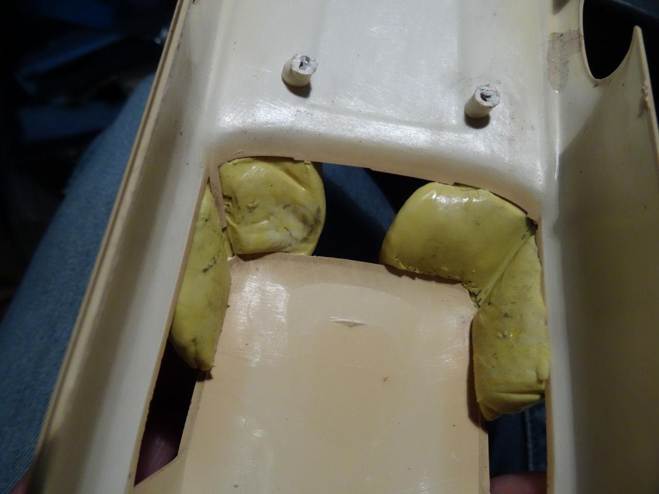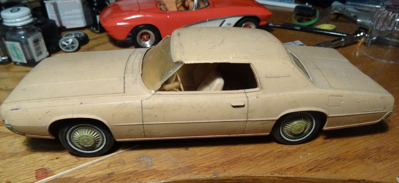 While I was working on my 1967 Galaxie project I was in need of a stock steering wheel. This brought me to look at other 1967 Ford vehicles in my stash as '67 was a one year steering wheel with an odd cylindrical shaped safety pad on the wheel. My digging brought up another poor soul from the Hershey flea market this T-Bird which had been in a flood at some point. Sad looking chap isn't it. But it has a nice steering wheel😁 This was a promo with a friction chassis the same as the Galaxie was. But this was in much worse shape with broken "A" pillars on both front corners. And now the steering wheel is gone, what the.... And a bite out of the right rear corner. Also has a bite out of the right front corner as well. But out of these ashes I want to see if I can build this. A Boss 429 powered bird. Not sure if I want to keep the shaker scoop. A huge 429 scoop would be more appropriate. WDYT? First order of bushiness was repairing the "A" pillars. With the help of the forum who taught me this trick, I used some Amazing Mold Putty to cast the "A" pillars from another body. Looks rather ugly at this point as if it's being eaten by the blob and his younger brother. New pillars in place and I noticed when I compare the body to the pic above that AMT didn't get it quite right. Maybe it's because the sample above has a vinyl top, which I plan to recreate, but there is more trim present then what AMT molded in. Added some strip styrene to correct that deficiency . The area between the two moldings on the pillar is actually painted body color as well as the leading edge of the roof. Odd, but true. Right rear corner has been mended as well. I'm not totally happy with the repair as I have lost some of the detail in the Thunderbird script in doing the repair from a few coats of primer. I'm looking at a photo-etched emblem to replace this one at this point. From the parts bin I found this Boss 429 that I think came from the Monogram/Revell Mustang kit which is 1/24th. Thinking the bigger size might go well with the big bird. And off of flea-bay I picked up this glue-bomb chassis which hopefully I can resurrect. We shall see. Well, that is all the bits and pieces I have collected thus far. We shall see if it survives to ride another day. See ya!🙂 Comments & criticisms always welcome.