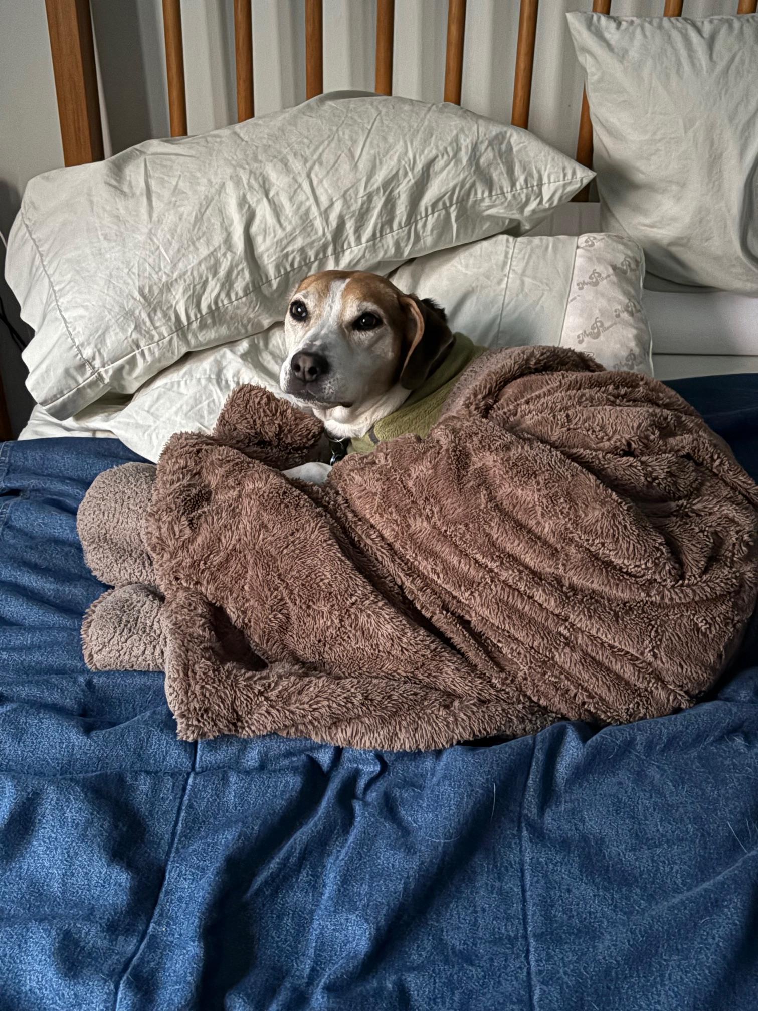 13. This morning it was 14 degrees when my dog Gracie went out to do her business. When done she came racing back into the house and sped down the hall. This pic tells the rest of the story.