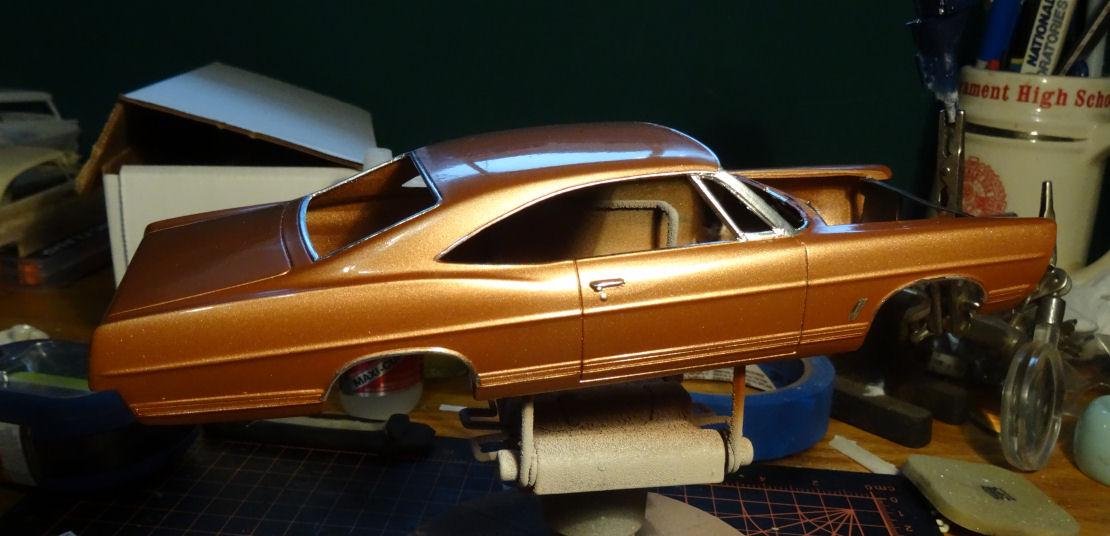 Work progresses on the Galaxie. Started building up the 390 and got some Ford Blue on it. The detail on this is fairly decent, much better then what the AMT kit would have had. As it originated in a truck I will have to make a few minor adjustments. For one the PVC valve is on the drivers side front while on the car it's passenger side rear. The steering wheel finally arrived and got added to the dash that had been waiting impatiently. Column shifter installed as well. Also decided to add some extra detail to the interior by putting Feefee on the rear seat. Printed up some Poodles trying to get the size correct. The one in the middle "was just right". I left the resin unpainted but added some details to the face and applied Tamiya black and grey accents to the body. No, the dog did not make that puddle. Good dog, now go sit down. And finally got out the BMF and started working on the trim. I switched over to the matte aluminum for this build and I do think it looks more realistic then the chrome. However I found it didn't adhere all that well. I even went over the body with some prep-sol to make sure that wasn't the issue. The adhesion got better as I got closer to the center of the sheet. I did the front and rear window frames with the BMF but switched to Molotow for the side window trim, emblems and the wheel openings. I will go back to the BMF for the side molding once everything dries. That's all for today, tune in next time same 🦇 channel.