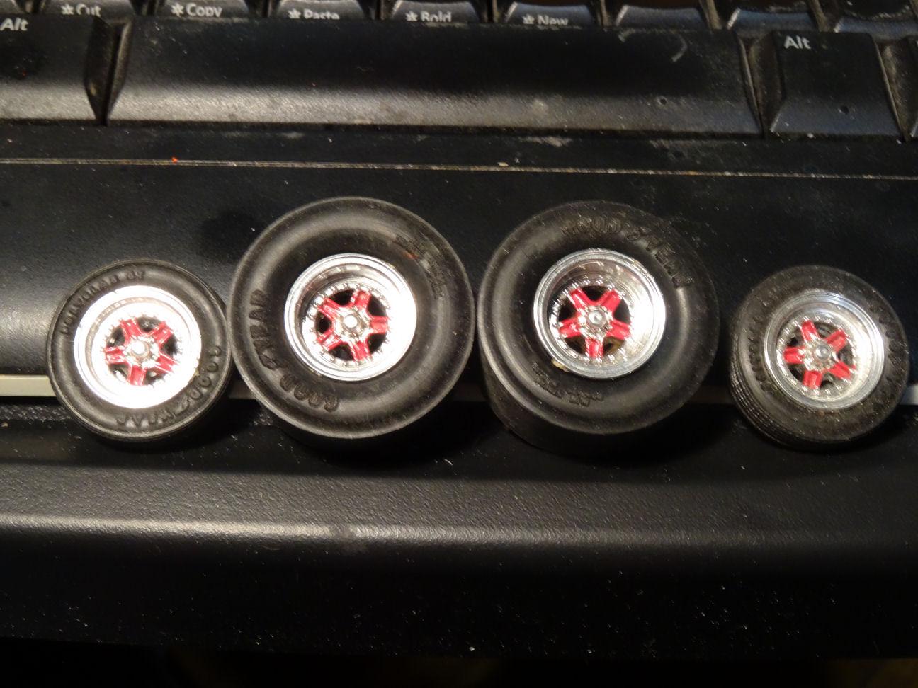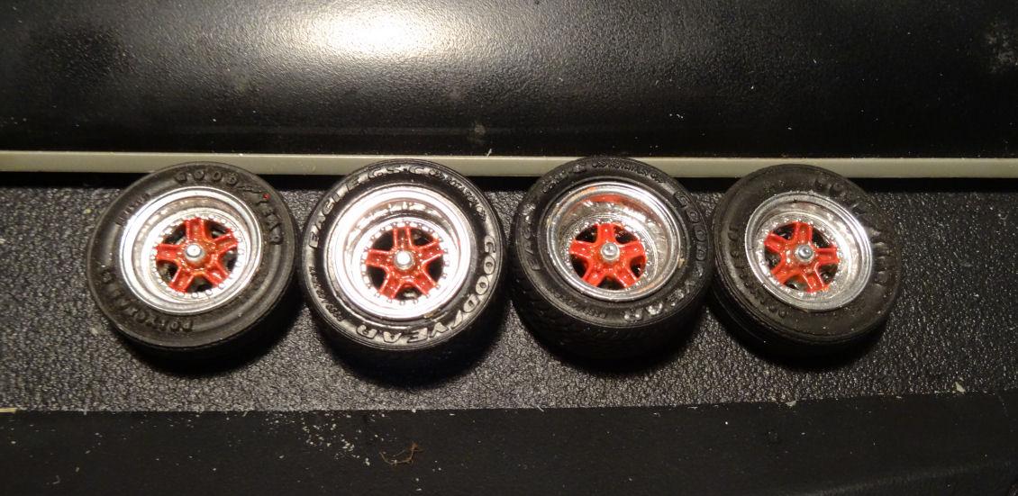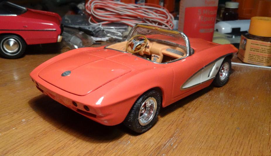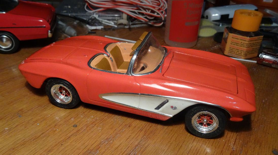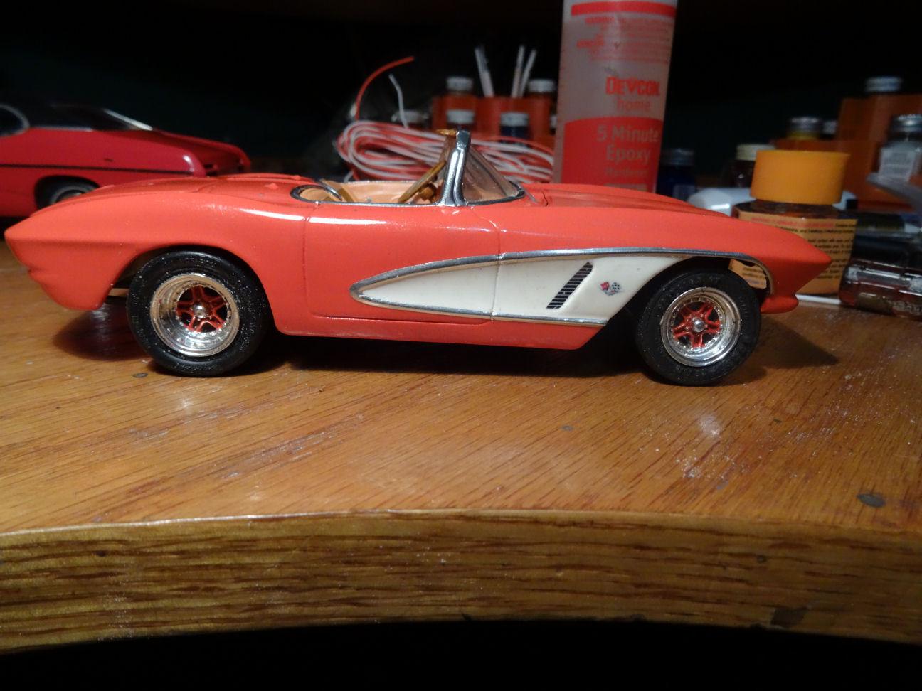 Been making some progress on the Vette of late. Trying to get the front end put together I started assembling it as MPC had in mind. The chassis if you recall comes from their 1956/1957 Corvette kit. I had several of these kits from different generations so I have a mix of parts. The later gen kits have a lot of flash, I mean a lot. I glued the A-Frame connector and the front A frames in one night and set it aside to dry. Came back the next night and I'm looking at it and something just doesn't look right. I glued the A frames upside down. Which seems to be par for the course lately. Luckily I was able to sneak them out and flip them over without incident. The rest of the front end went together OK but it's a really sloppy assembly. Had to do a lot of tweaking to get the front wheels into alignment. Needed to make my own center link to get them pointing straight. Although they don't look straight in the next pic, that's just an illusion. I searched long and hard for some wheels I liked but could not find a full set of four I liked in my parts bin. Finally settled for a set that was in the Vette junkyard. They had slicks on the rear which I wasn't going to use but something about them struck me. The centers were painted red but I repainted the centers with the Rally Red body paint and found some different tires. I had to cheat a bit for the rear wheels. The rear end uses the traditional metal axle but the hole in the rims was a large one. So the hole was filled with some styrene rod and then drilled for the axle. But I found that the rear axle sat a bit too far forward. So instead of moving the axle, I offset drilled the hole in the rims. This allowed me to center the wheel properly in the wheel opening. And now we finally have the Vette sitting on all fours. I think I want to find a larger diameter tire for the front. While the body has a nice rake, there is a lot of air around the tire. Bumpers have been cleaned up and sprayed with Revell chrome but won't go on until the very last thing. A couple of more shot of the car on all four. We might actually have this one done before the ball drops. Time will tell.....