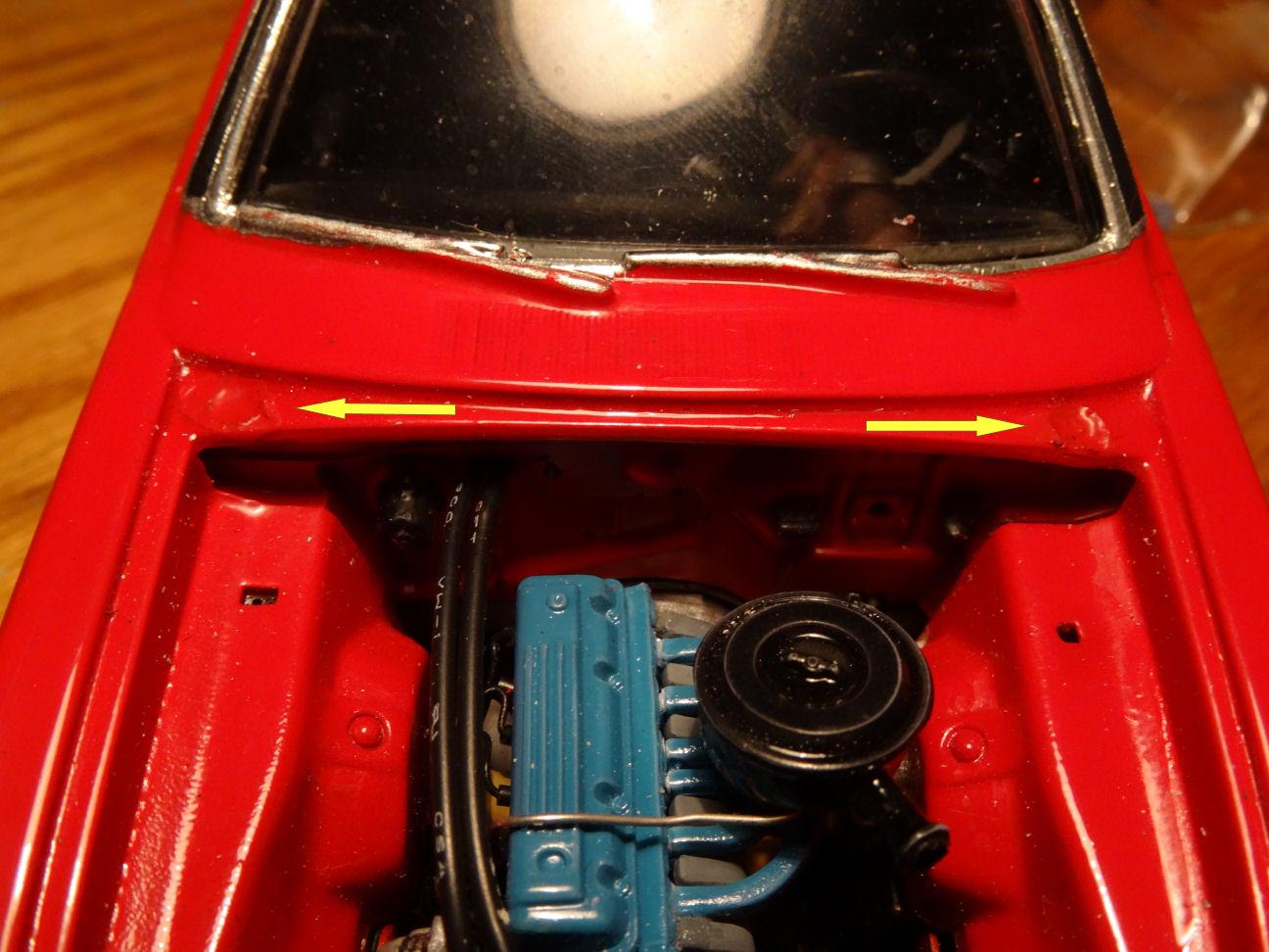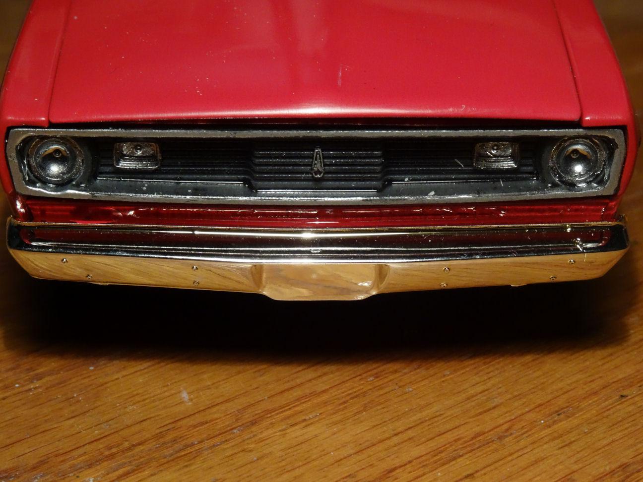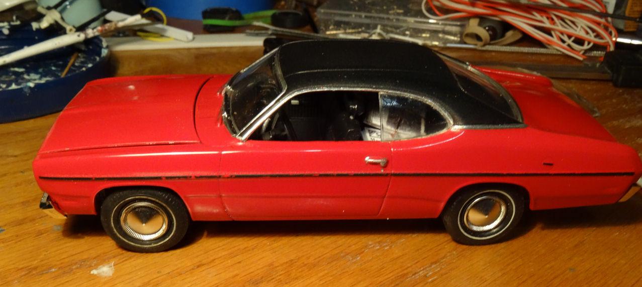 3. Resolved a couple of small issues on the Duster the past few days. Added two pin heads (no comments from the peanut gallery please) to the rear corners of the hood and put two little magnets on the cowl and hid them under some paint. Now the hood doesn't slide off every time I brake for a light. Next up I painted the gravel shield for the front. What a PIA it is to mix up 2-part urethane clear in such a small quantity. I needed a thimble full, try measuring that in a 4 to 1 ratio. Got that in place followed by the bumper and we now have the grill in place. Still need to install the lenses. And I countersunk the front spindles into the front rims a bit for some added clearance and committed to permanently affixing the wheels. This is how it's going to be from here on, understand. Only problem now is my big grubby mitts keep rubbing the rubber off the side molding. Have to touch it up again. We are getting closer to finishing this one. Perhaps before the year is out. See ya next time.