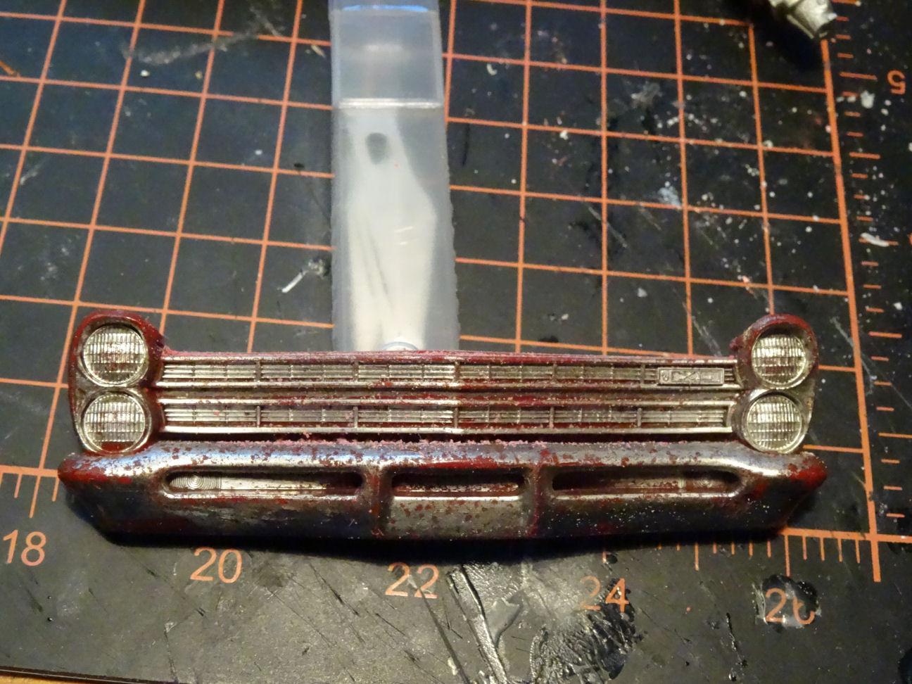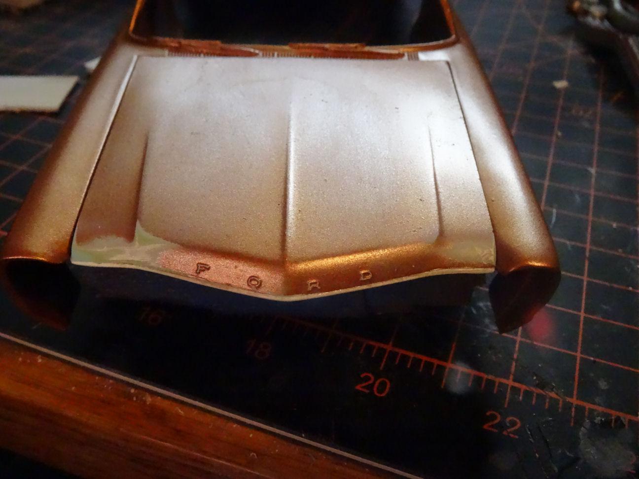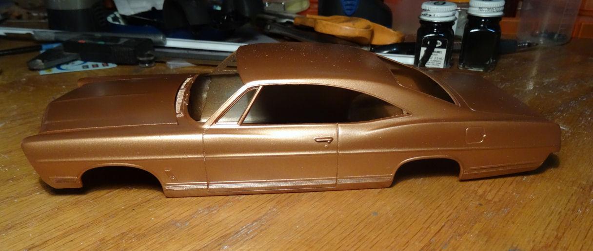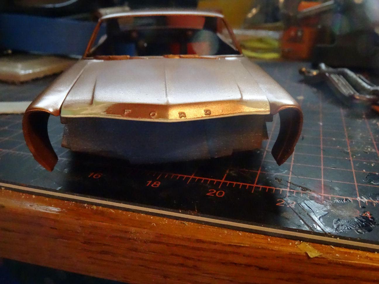 There has been some headway made on Jimmy's Galaxie, although it might fall into the category of one step forward, two back. I had some good weather and I was anxious to get some paint on the body but I probably should have waited. Not that anything went wrong with the paint mind you. I started mocking up the car and realized AMT did a rather silly thing with this car. The have the front hood molding molded as part of the front grill. (say that 3 times fast) For the promo I guess they can be forgiven as the hood doesn't open, but for the kit, sorry but that's a Bozo NoNo.. So despite the hood being painted I needed to do some additional work on it. I took some strip styrene and made a hood molding. Then with the molding on the hood, I removed it from the front bumper assy. Here we have paint on the hood again and my fingers trying to keep everything held together for a quick look-see. I think I am going to do some further work on the bumper unit and open up some of the other cavities like the bumper next to the parking lights. I bet you didn't even see those in there did you? A bit of work has progressed on the chassis as well. With and without the interior in place. There are still things I like to do the old fashioned way. A lot of the bits on the chassis I hand paint with good old Testors, and yes, my jars are old. Can't really tell in the pics but there are 4 or 5 different shades of black at work here. Need to find the rear end next. I'm sure it has highway gears.🥱 And I'll leave you with a pic of the painted body, dust flakes and all. Need to get it clearcoated next and then, Happy Happy Joy Joy, BMF time....