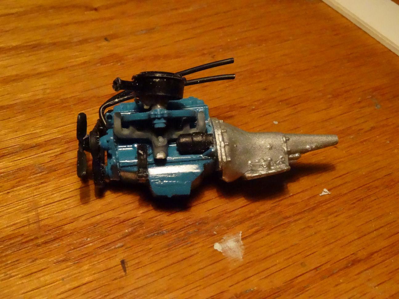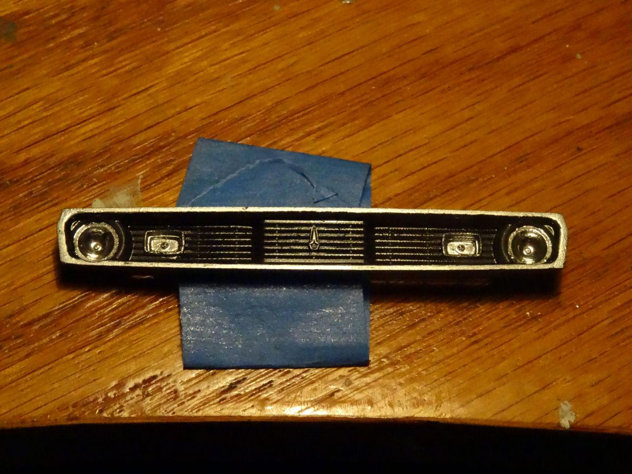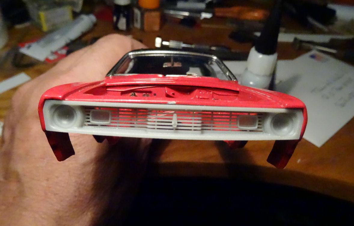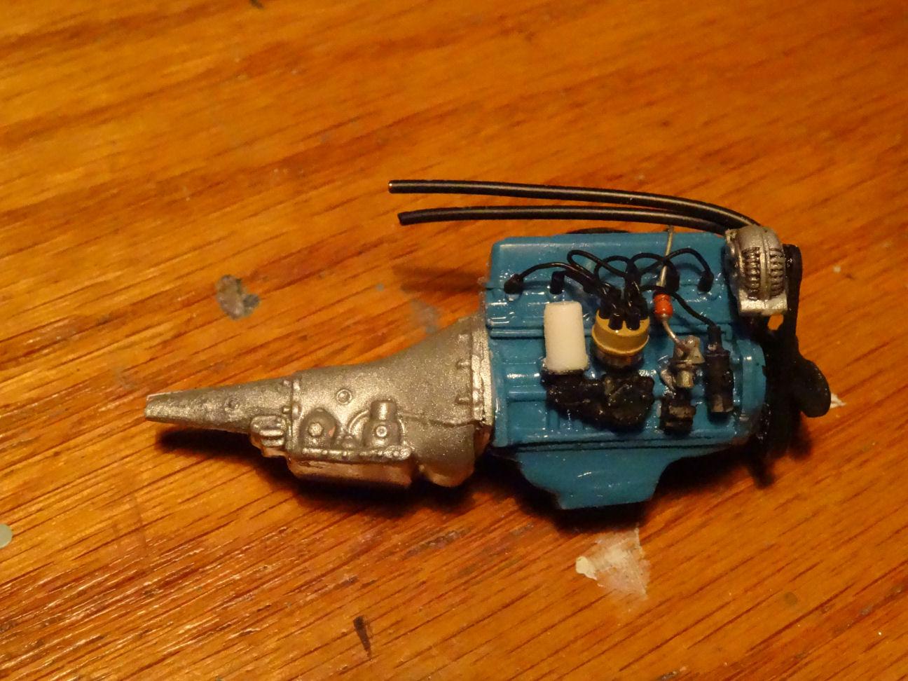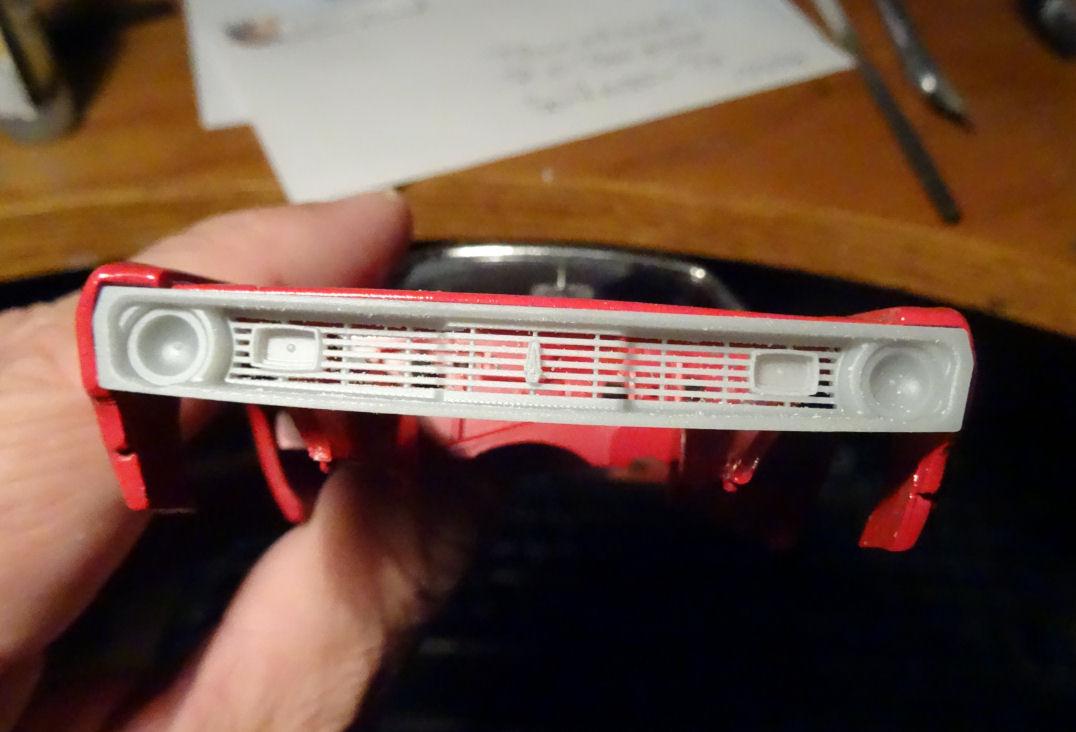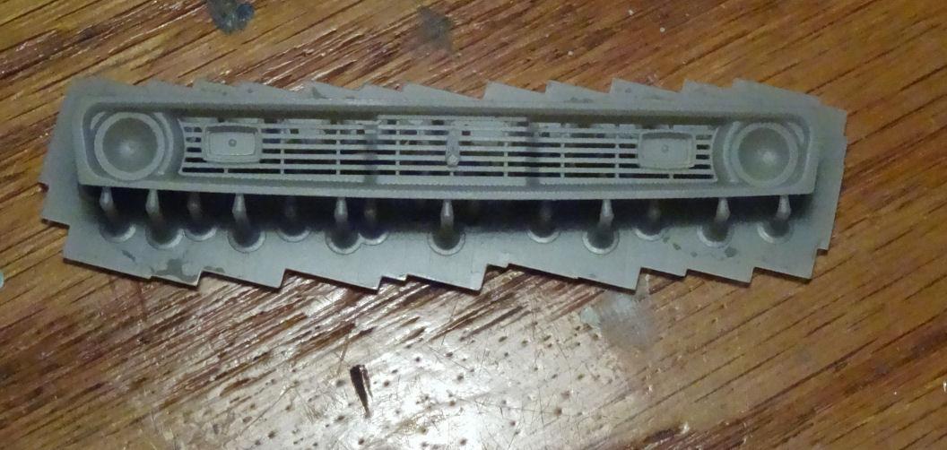 Duster has been making some backwards progress. It's my own stupid fault. Started mocking up the slant six into the chassis and found the tail shaft binding on something. Well, I guess it's the first time I really looked at the tranny and realized it was a manual. The Duster that wouldn't die had a slush box. So did some digging through the parts bin an found a close semblance of a proper transmission. That would be the one in the center.... It funny, the last slant six I took from a Lindberg kit had an automatic, guess they came in two flavors. Little bit of plastic surgery and we are now back on tract. Grill from Few Sprues Loose came during the week and it's light years above the resin one. It feels rather brittle so care must be exercised when removing the supports. It fits fairly well but the body needs a bit of a trim as shown so the grill recesses properly between the fenders. Unfortunately I nicked the paint a bit with the trim but that can be easily touched up. Now it sits in place better. Painted the grill and used some Molotow inside the headlight buckets and parking lamps. When this is dry the lenses will go on. Can't really tell in the pic but the perimeter of the grill is painted with good old Testors silver as that was not chrome in real life That's all for now as we sit and watch the paint dry.
