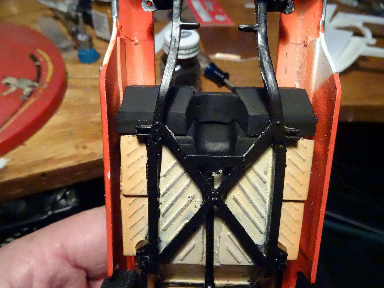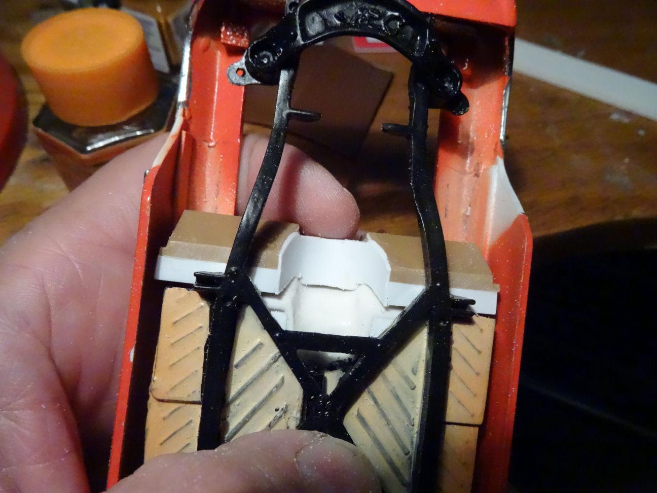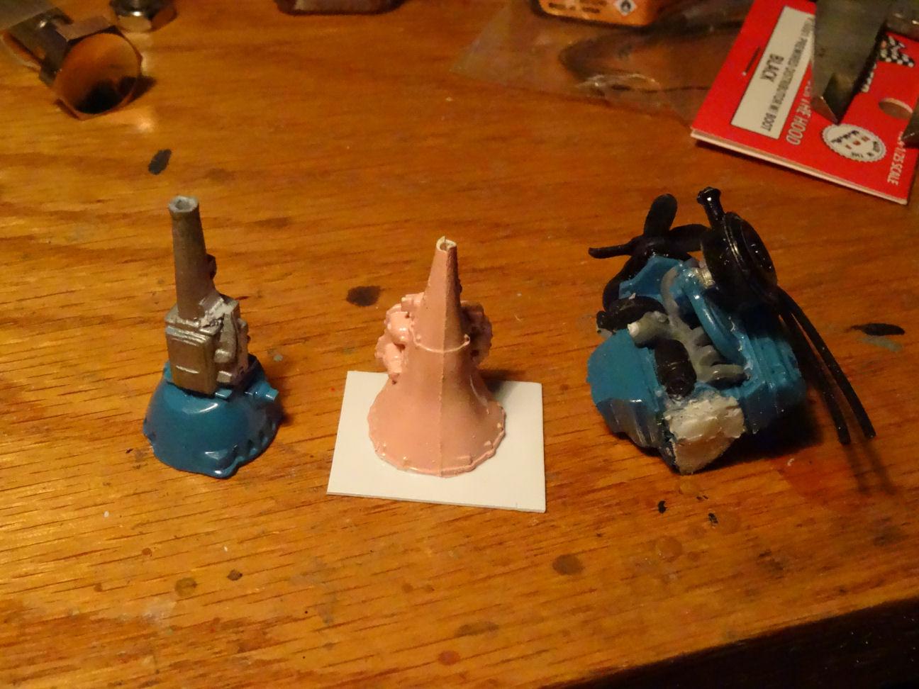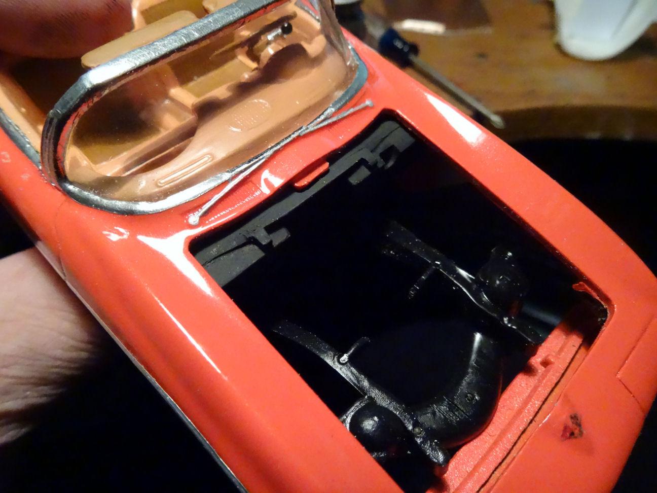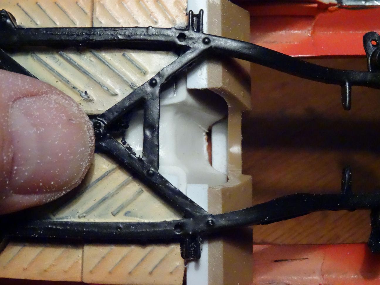 Duster has been making some backwards progress. It's my own stupid fault. Started mocking up the slant six into the chassis and found the tail shaft binding on something. Well, I guess it's the first time I really looked at the tranny and realized it was a manual. The Duster that wouldn't die had a slush box. So did some digging through the parts bin an found a close semblance of a proper transmission. That would be the one in the center.... It funny, the last slant six I took from a Lindberg kit had an automatic, guess they came in two flavors. Little bit of plastic surgery and we are now back on tract. Grill from Few Sprues Loose came during the week and it's light years above the resin one. It feels rather brittle so care must be exercised when removing the supports. It fits fairly well but the body needs a bit of a trim as shown so the grill recesses properly between the fenders. Unfortunately I nicked the paint a bit with the trim but that can be easily touched up. Now it sits in place better. Painted the grill and used some Molotow inside the headlight buckets and parking lamps. When this is dry the lenses will go on. Can't really tell in the pic but the perimeter of the grill is painted with good old Testors silver as that was not chrome in real life That's all for now as we sit and watch the paint dry.