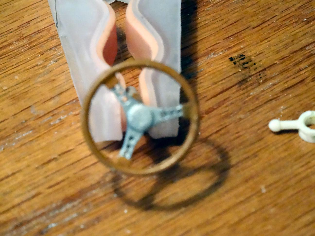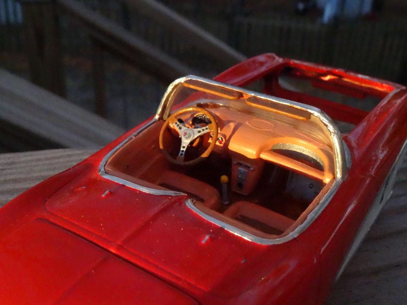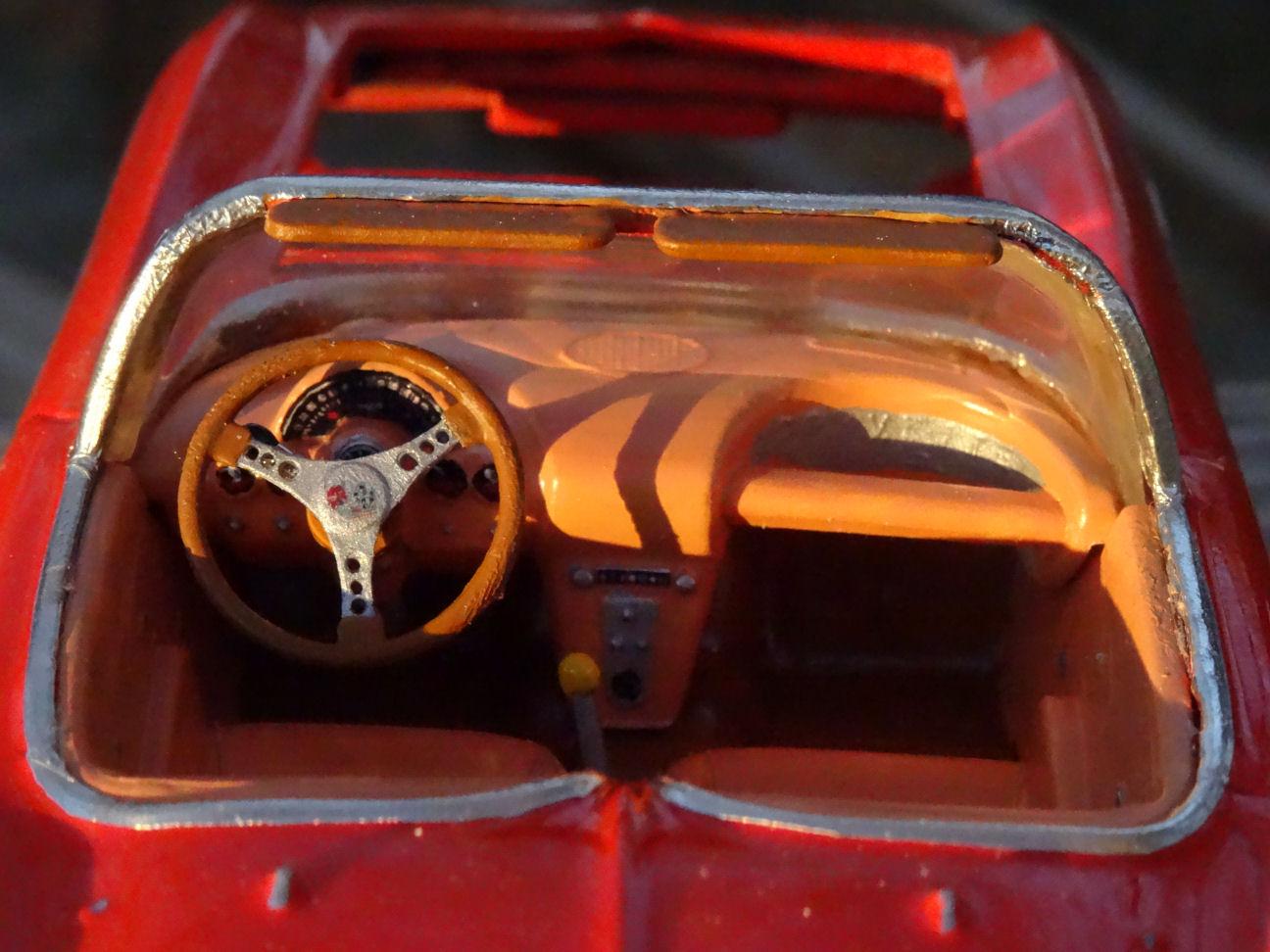 So work has ensued on the interior. I got a different bottle of Testors brown which took care of the seat inserts. The original SMP steering wheel was broken but it did have one redeeming artifact. It had the column hub and turn signal. That appears to have been dropped from the subsequent AMT reissues. So I added the original hub, with it's oversized turn signal lever, to the reissues steering wheel. I drilled out the holes in the steering wheel. My pics of this turned out like ? I added the printed instruments to the dash with some difficulty. The speedo was too large for the dash, or maybe it fits the repo dash better. So it took some carving to make it fit. I didn't use the gauges or clock that came with the set as trying to cut perfect circles out for them proved futile. I instead painted the gauges. I did use the radio dial. The pic accentuates the wrinkles in the BMF as it wraps around the inside of the windshield frame. In hindsight I probably would have been better off doing it with Molotow. But I'm not going back and redoing it at this point since the glass and interior are glued in place. Besides this was meant to be a simple quick build to finish a project someone else started and it's gone a lot further then I originally planned. And we're not done yet. That's all folks....