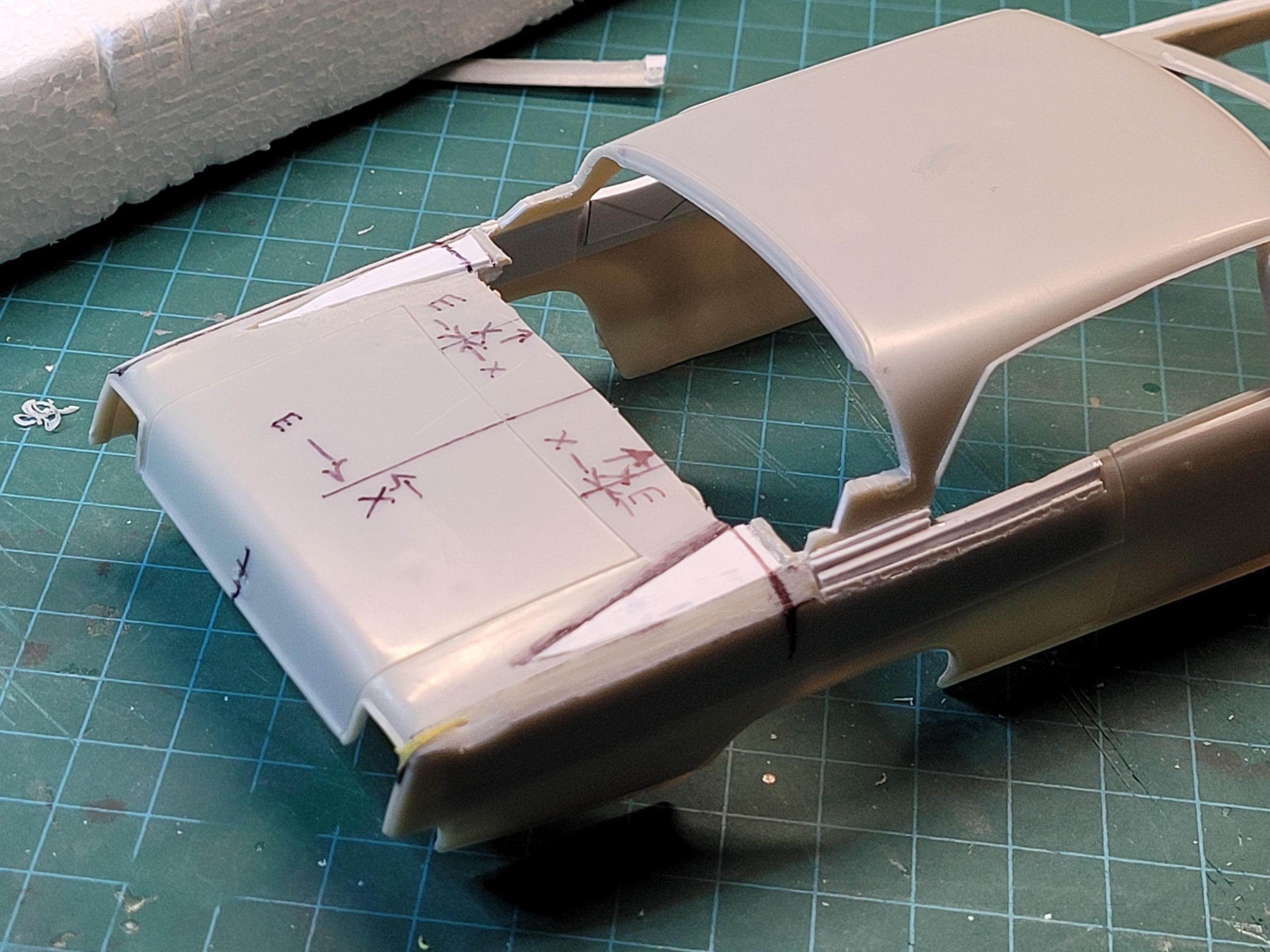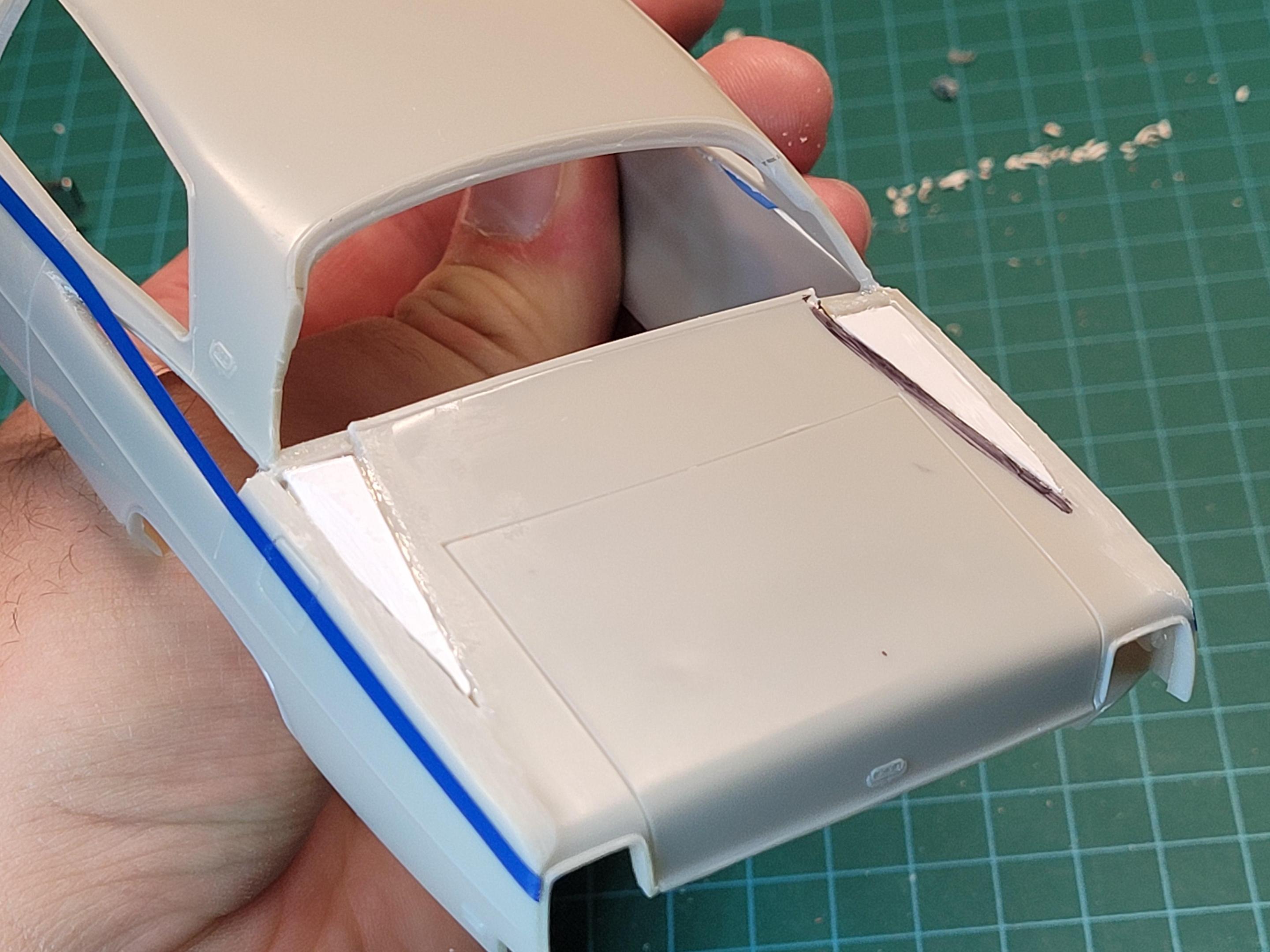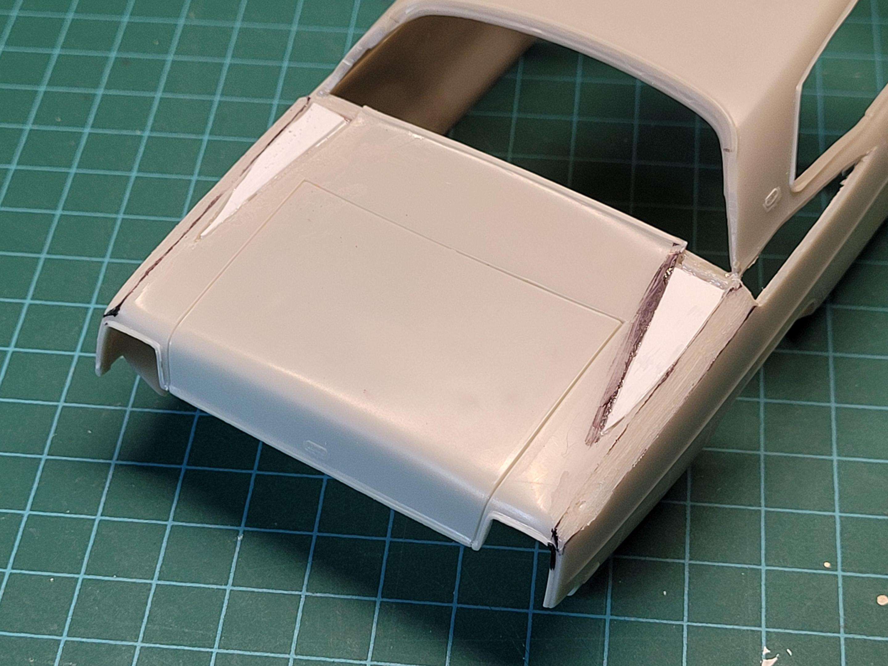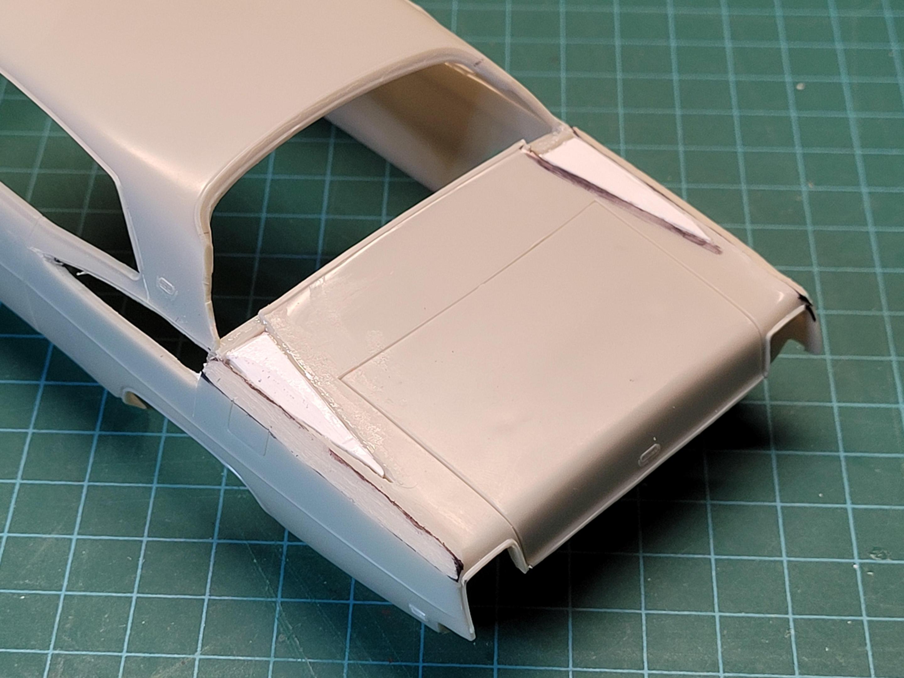 Here's some work from September 11th. That day consisted of extending the rear side windows back, building a new B-pillar, and adding more material to the bottom of the decklid in preparation for carving out the new shape. I also made an attempt at expanding the front wheel arches with a Dremel tool.