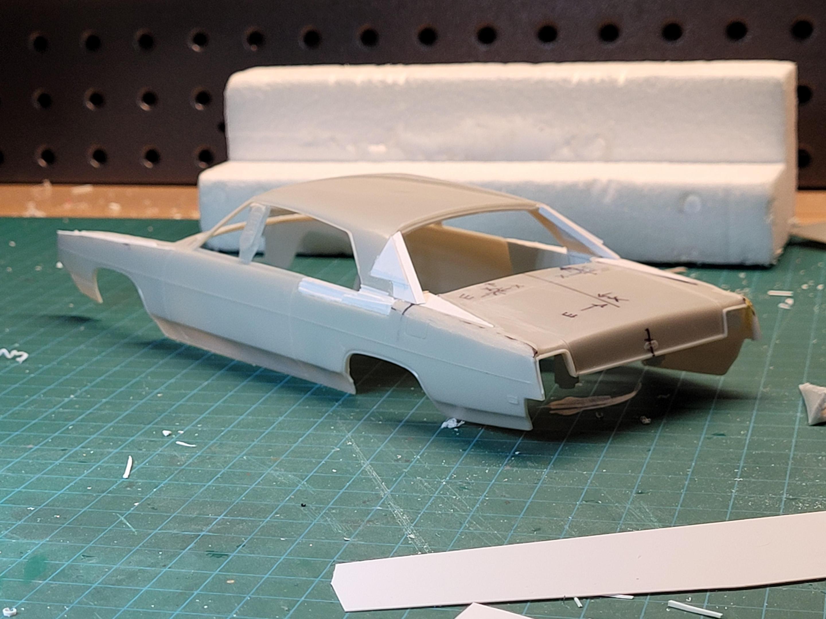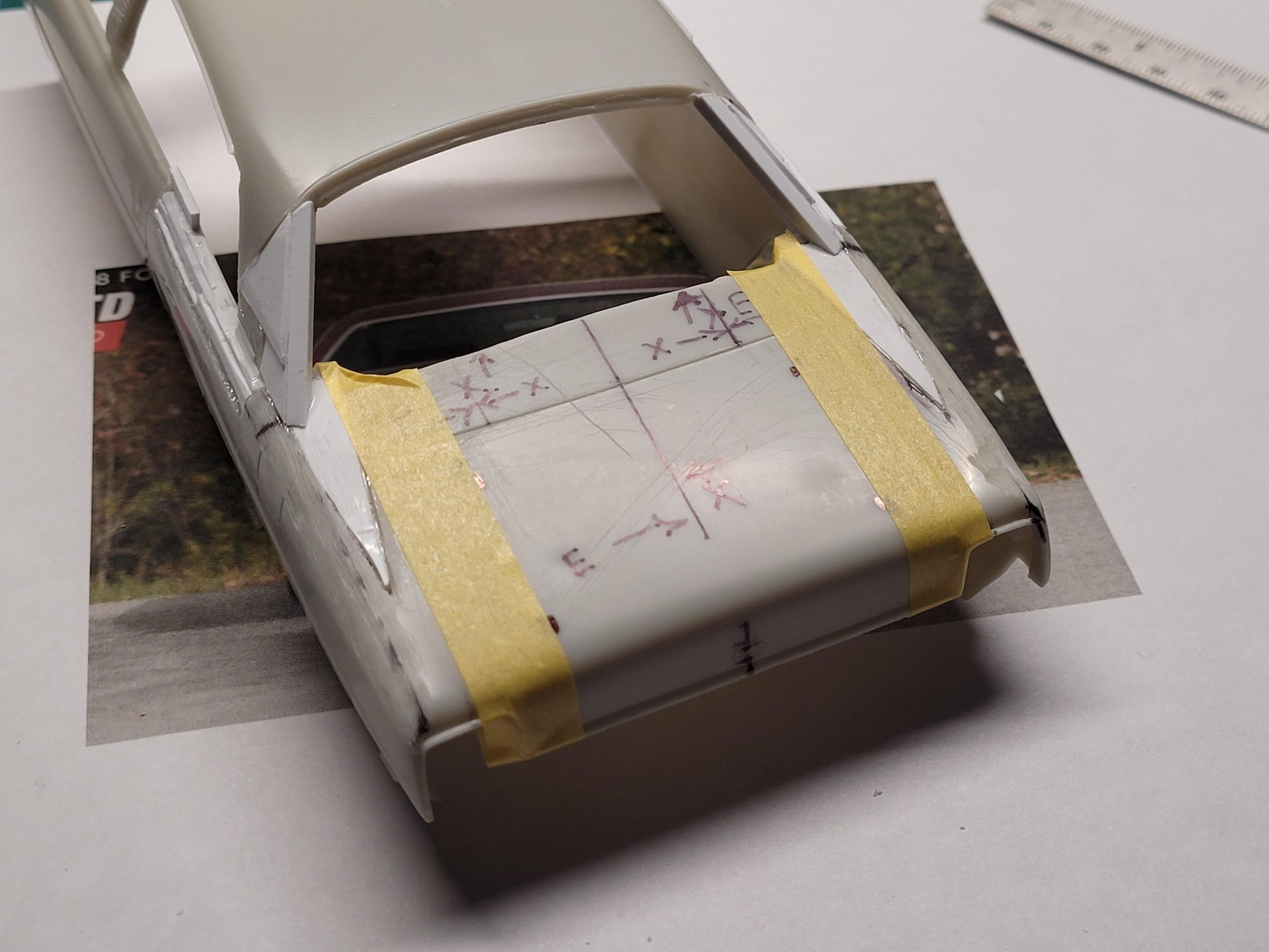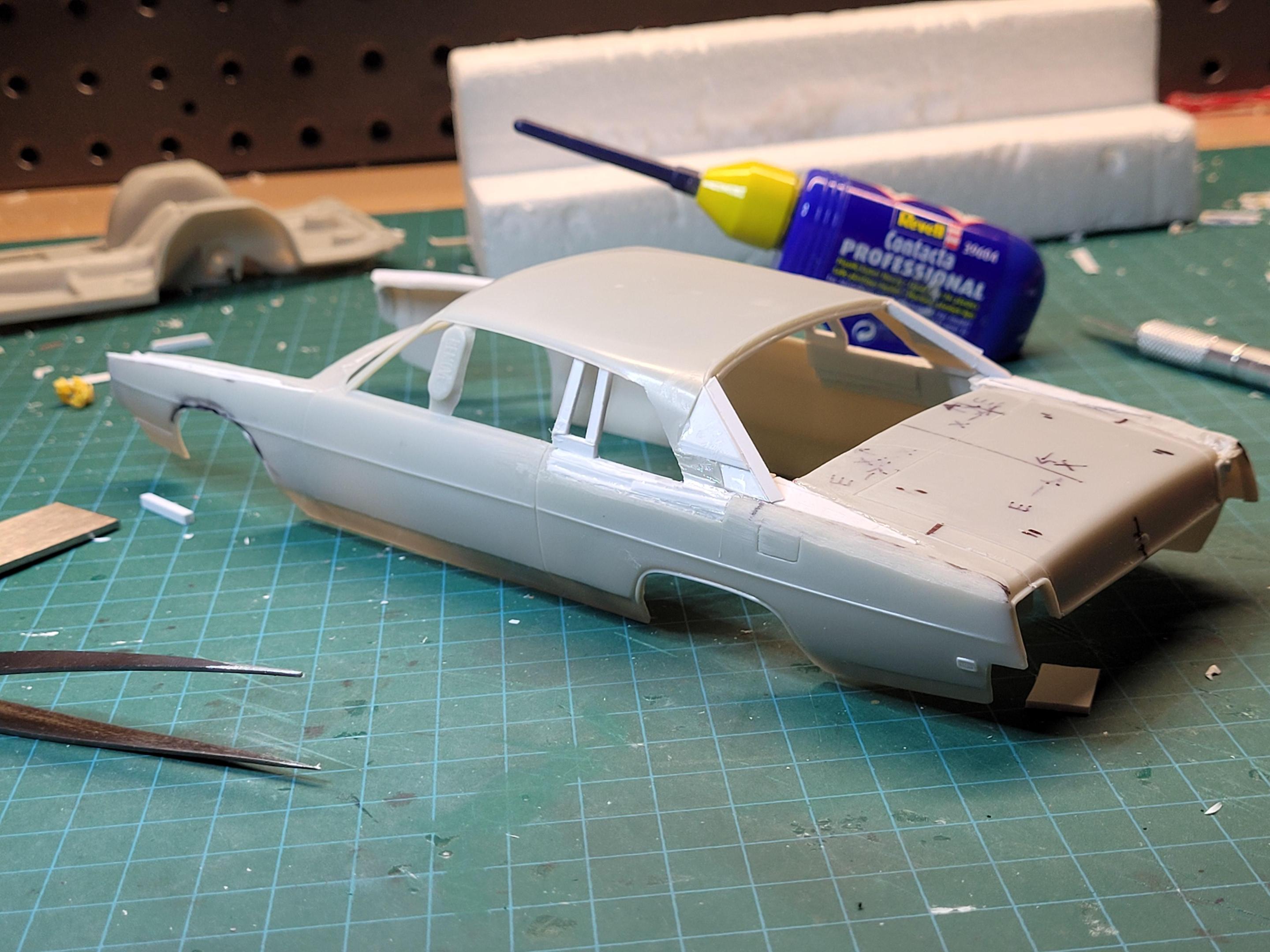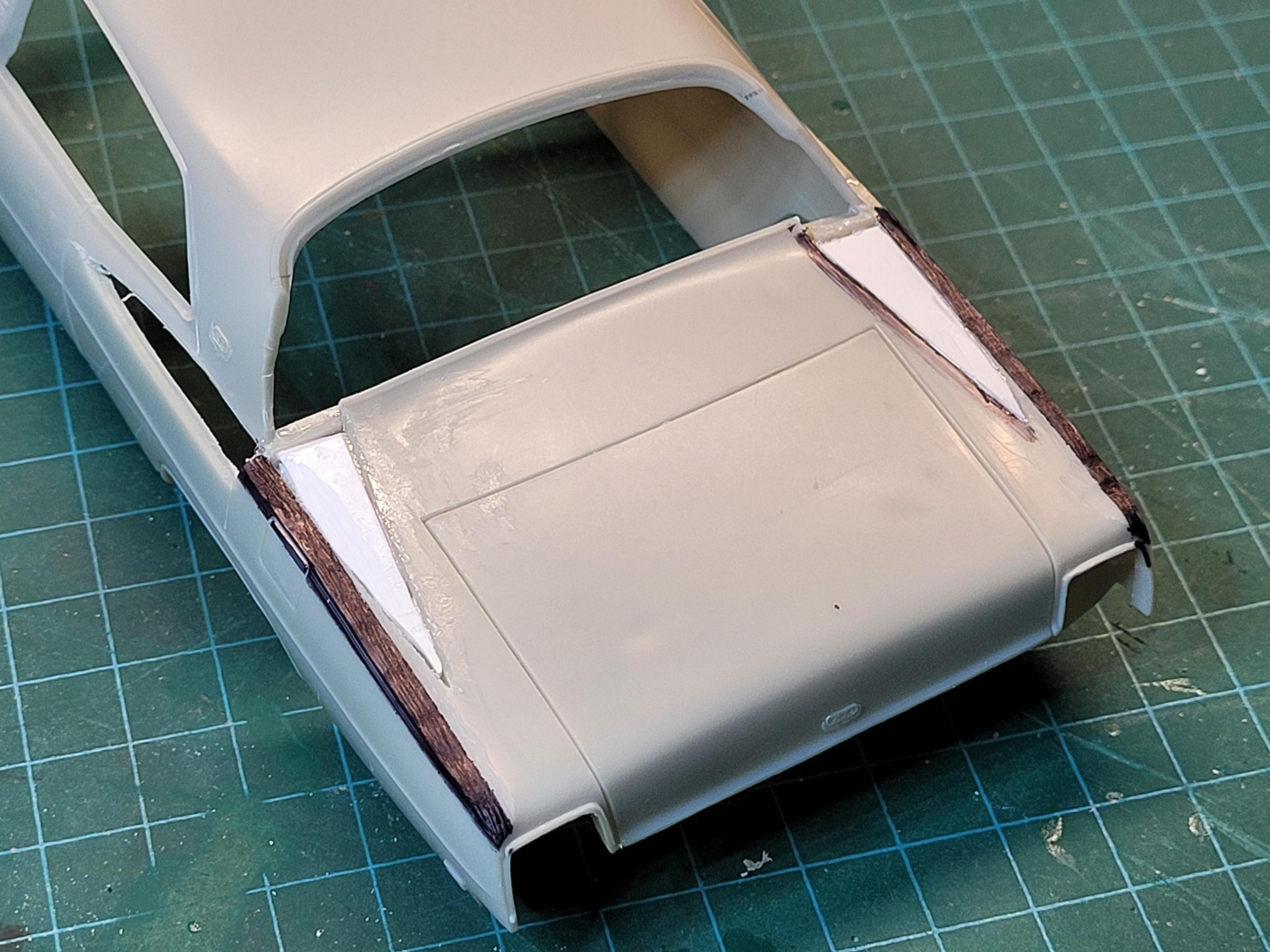 Here's some work from September 11th. That day consisted of extending the rear side windows back, building a new B-pillar, and adding more material to the bottom of the decklid in preparation for carving out the new shape. I also made an attempt at expanding the front wheel arches with a Dremel tool.