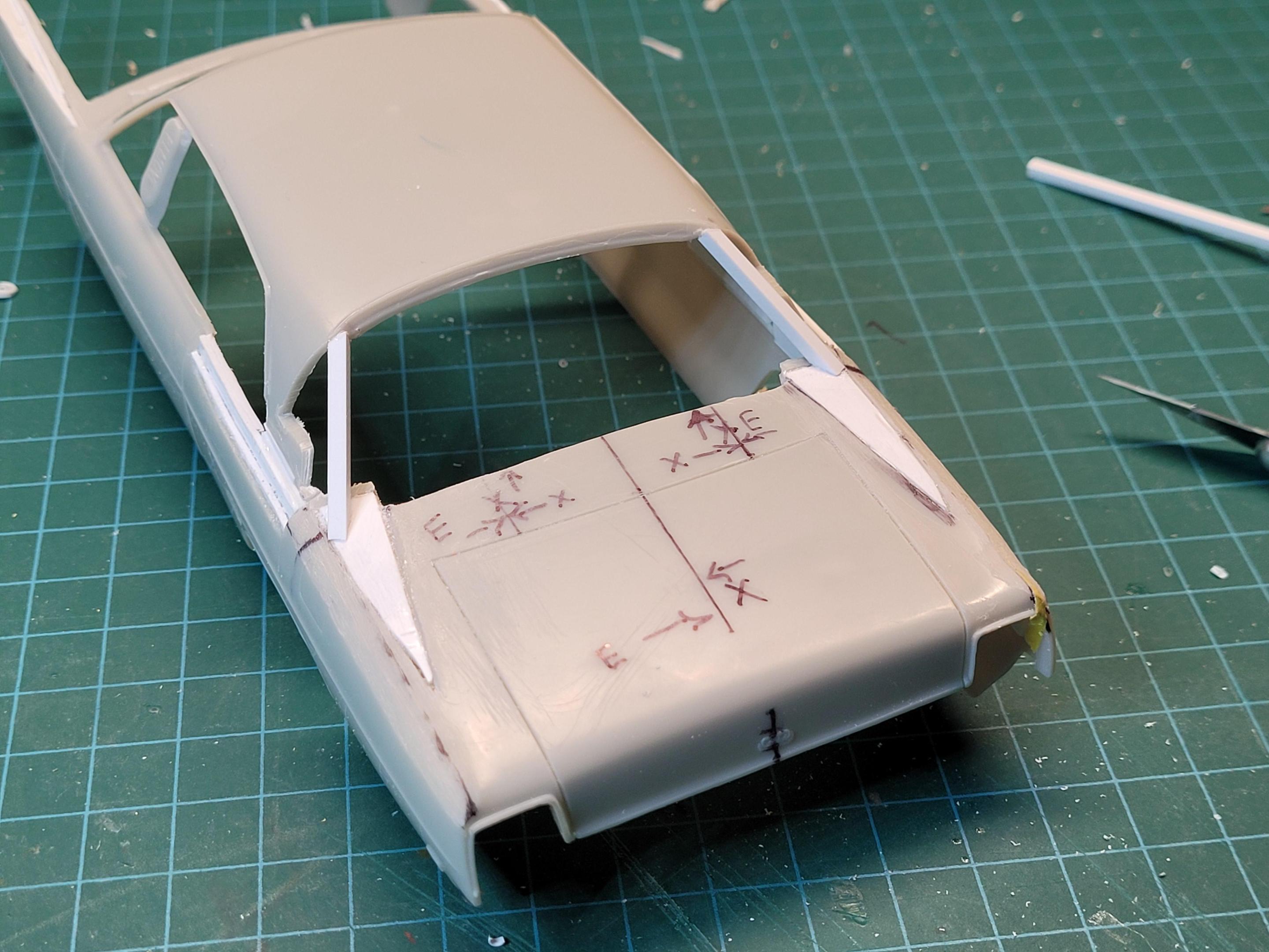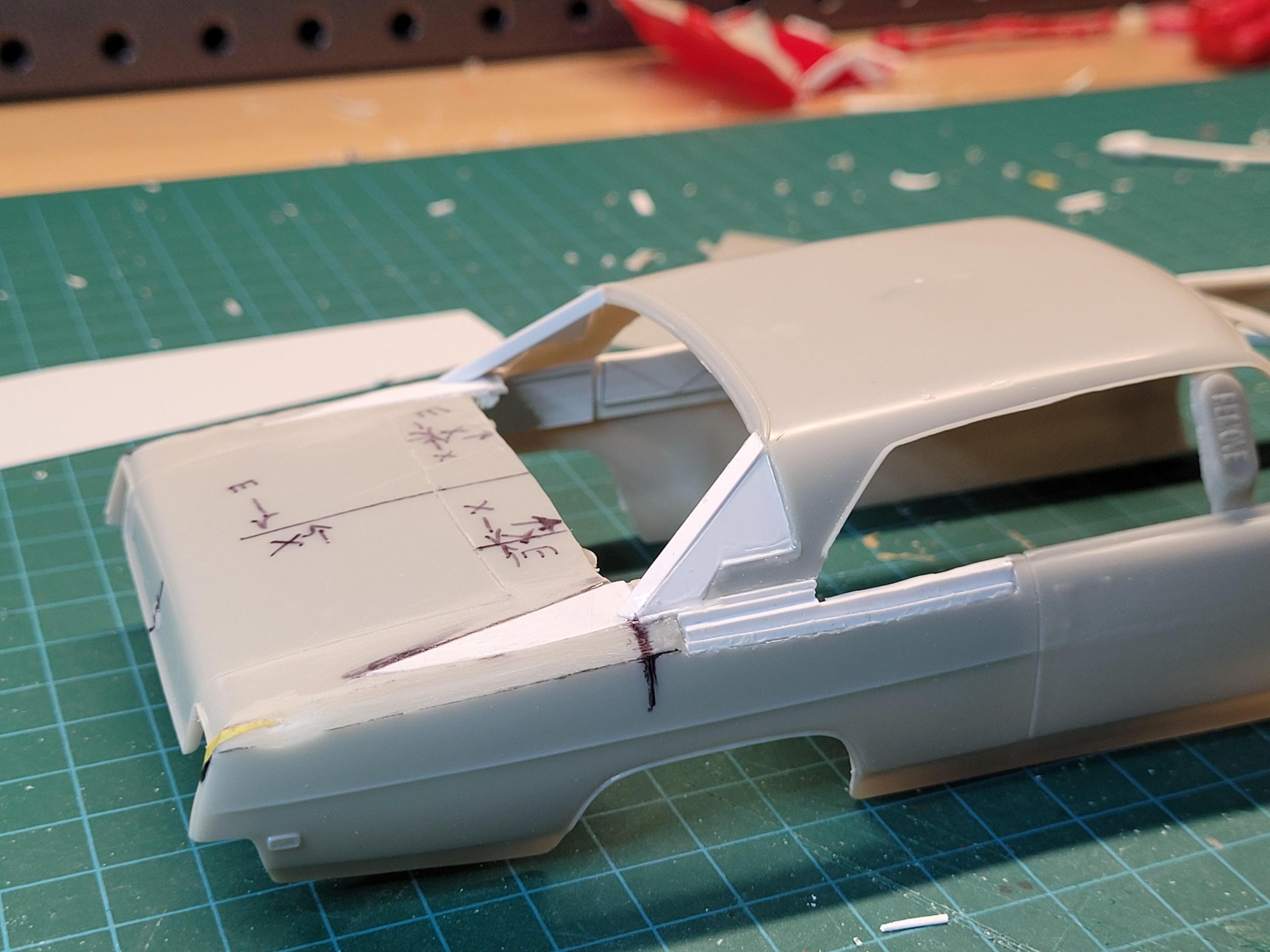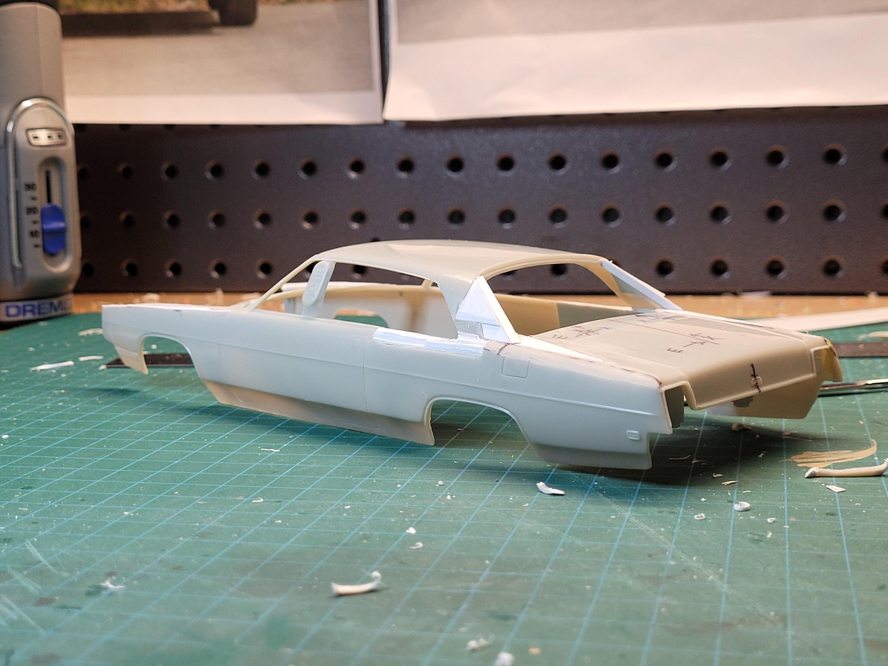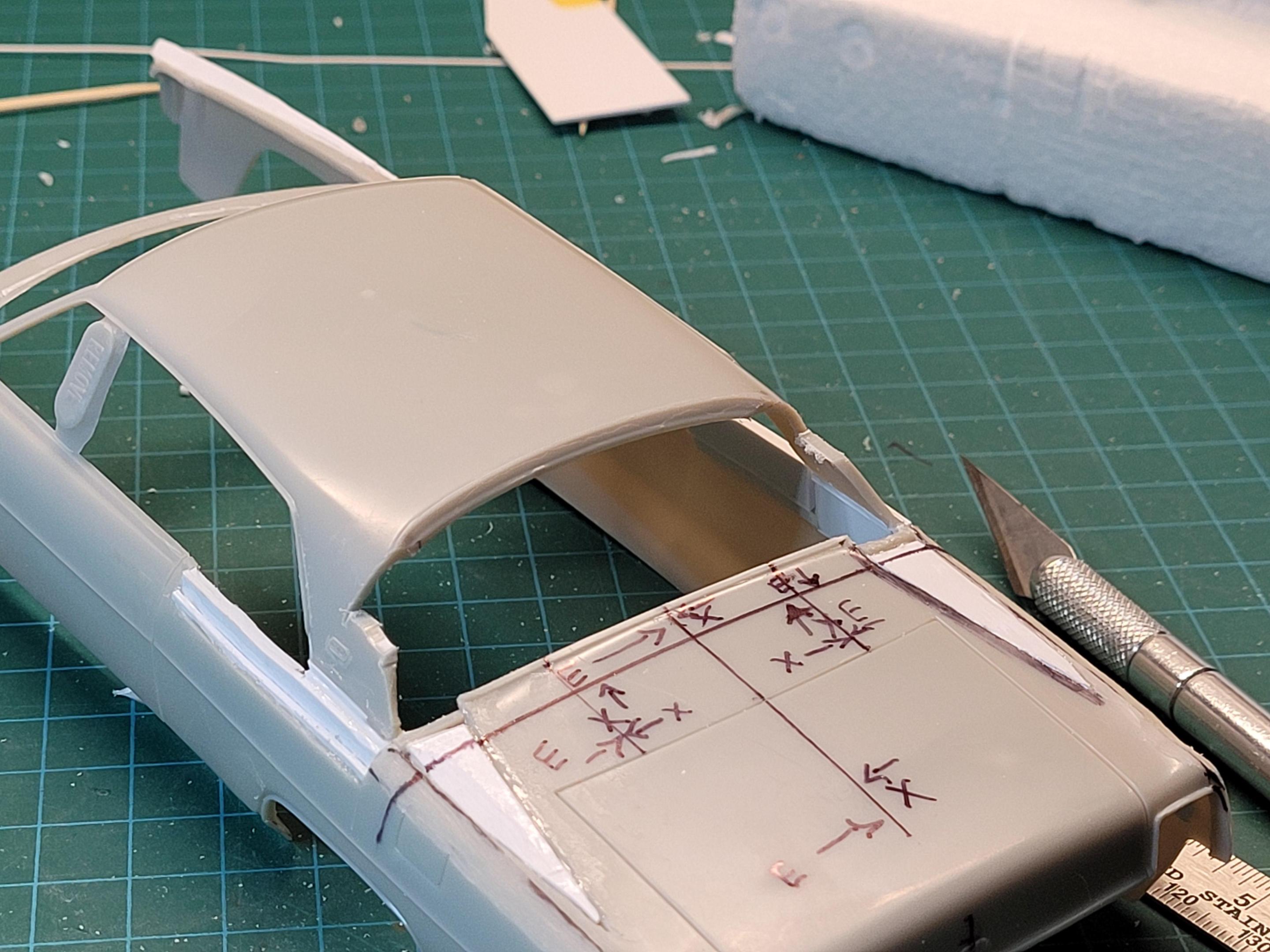 Here's some work from September 11th. That day consisted of extending the rear side windows back, building a new B-pillar, and adding more material to the bottom of the decklid in preparation for carving out the new shape. I also made an attempt at expanding the front wheel arches with a Dremel tool.