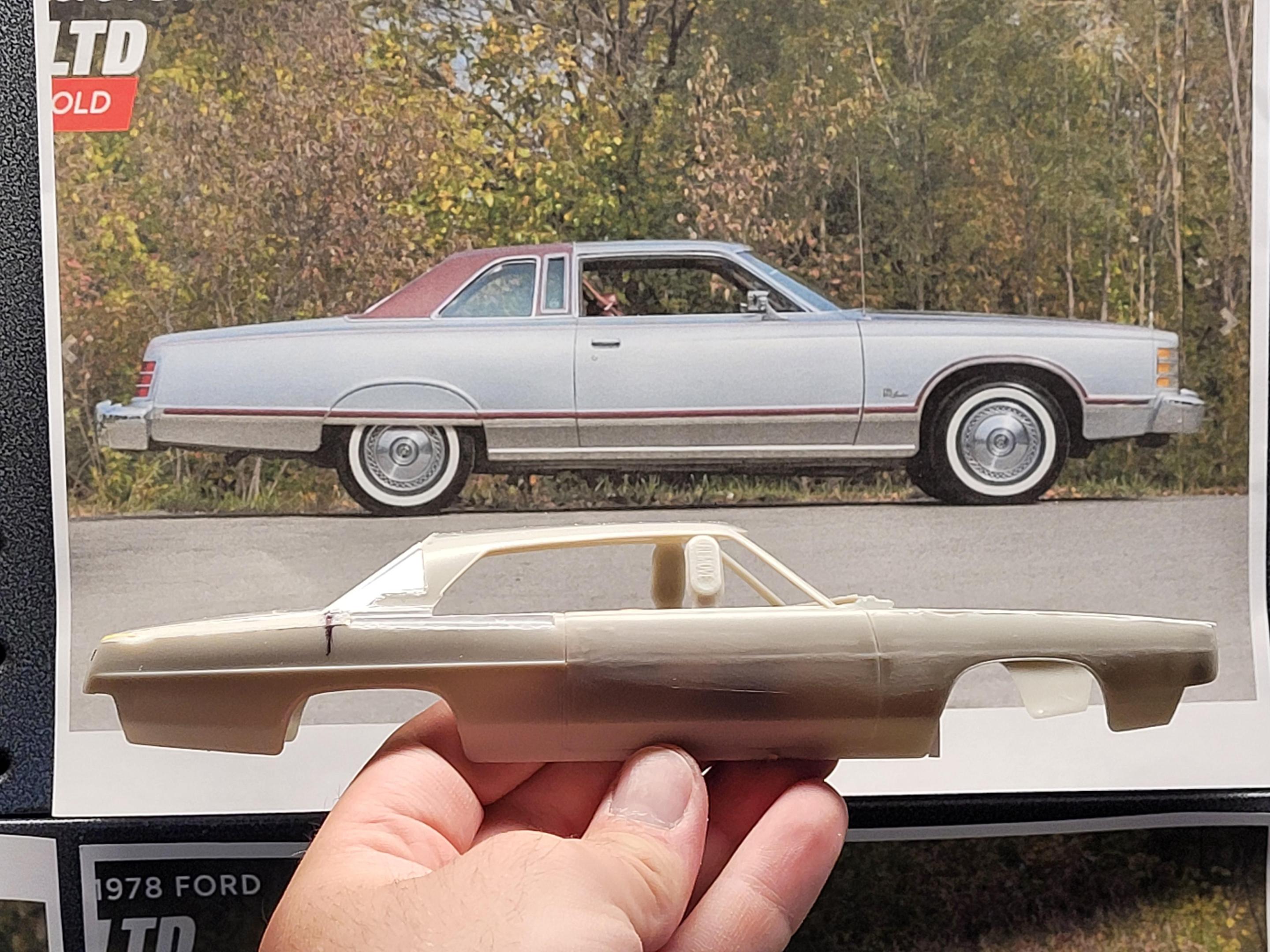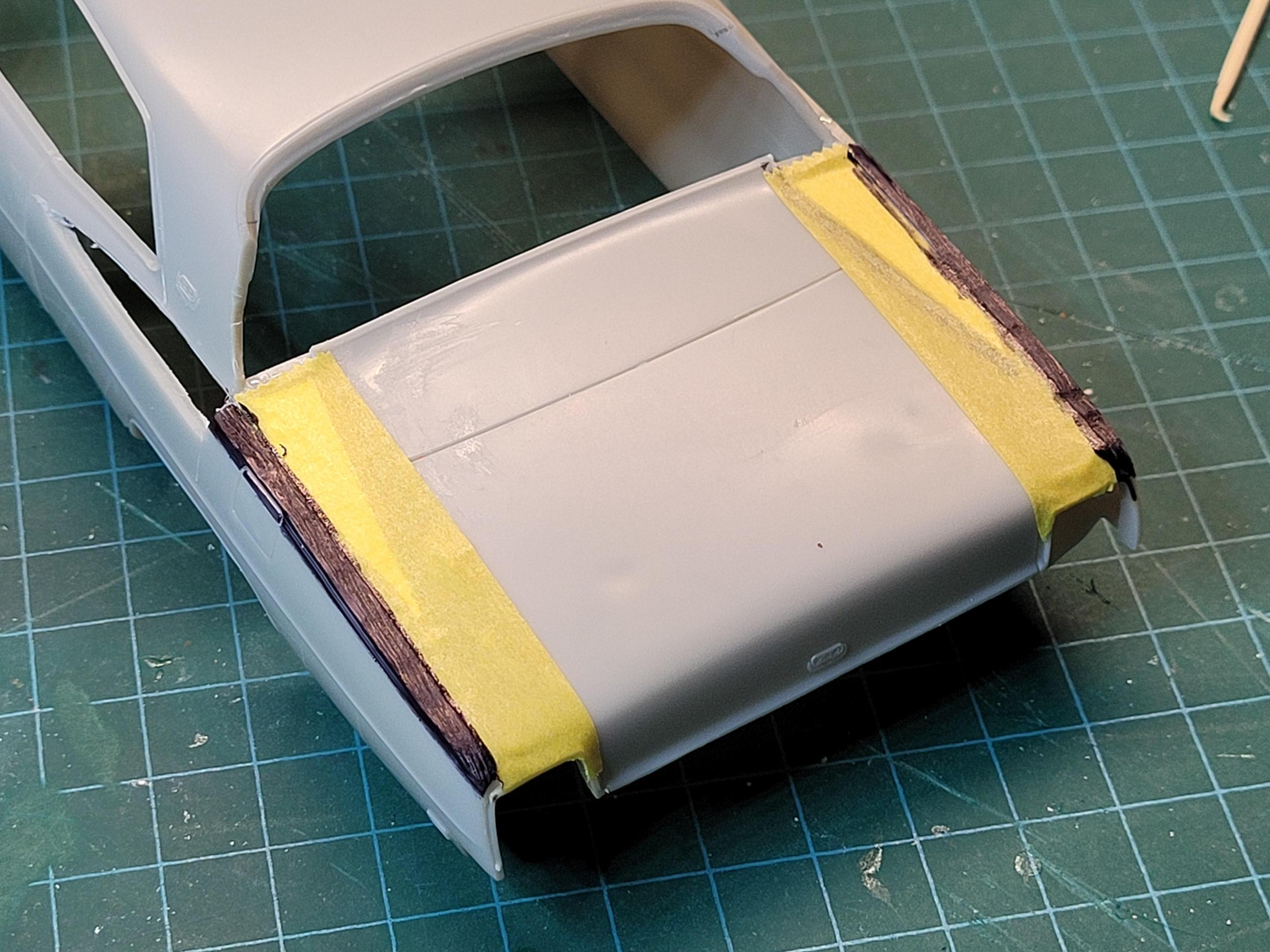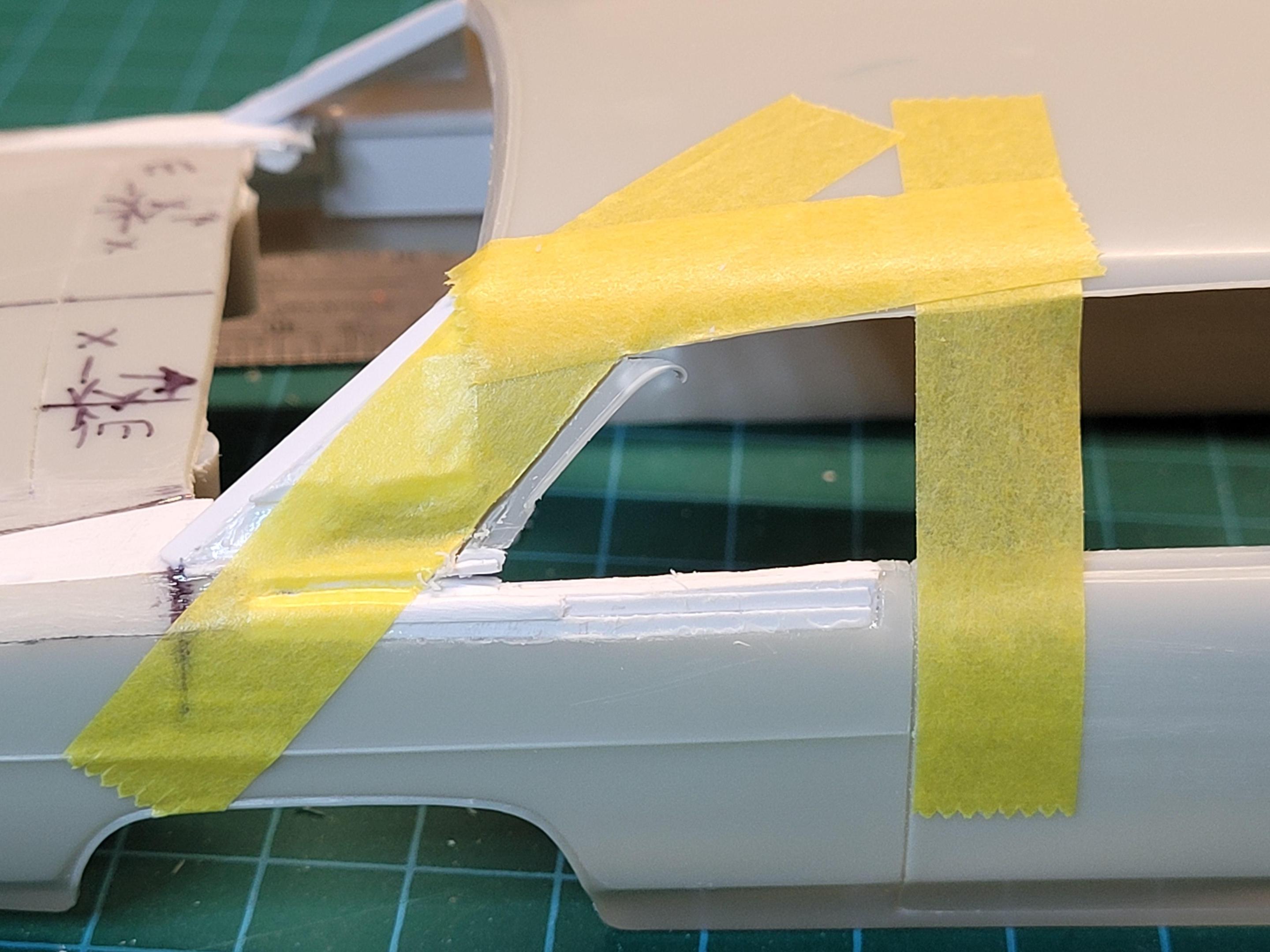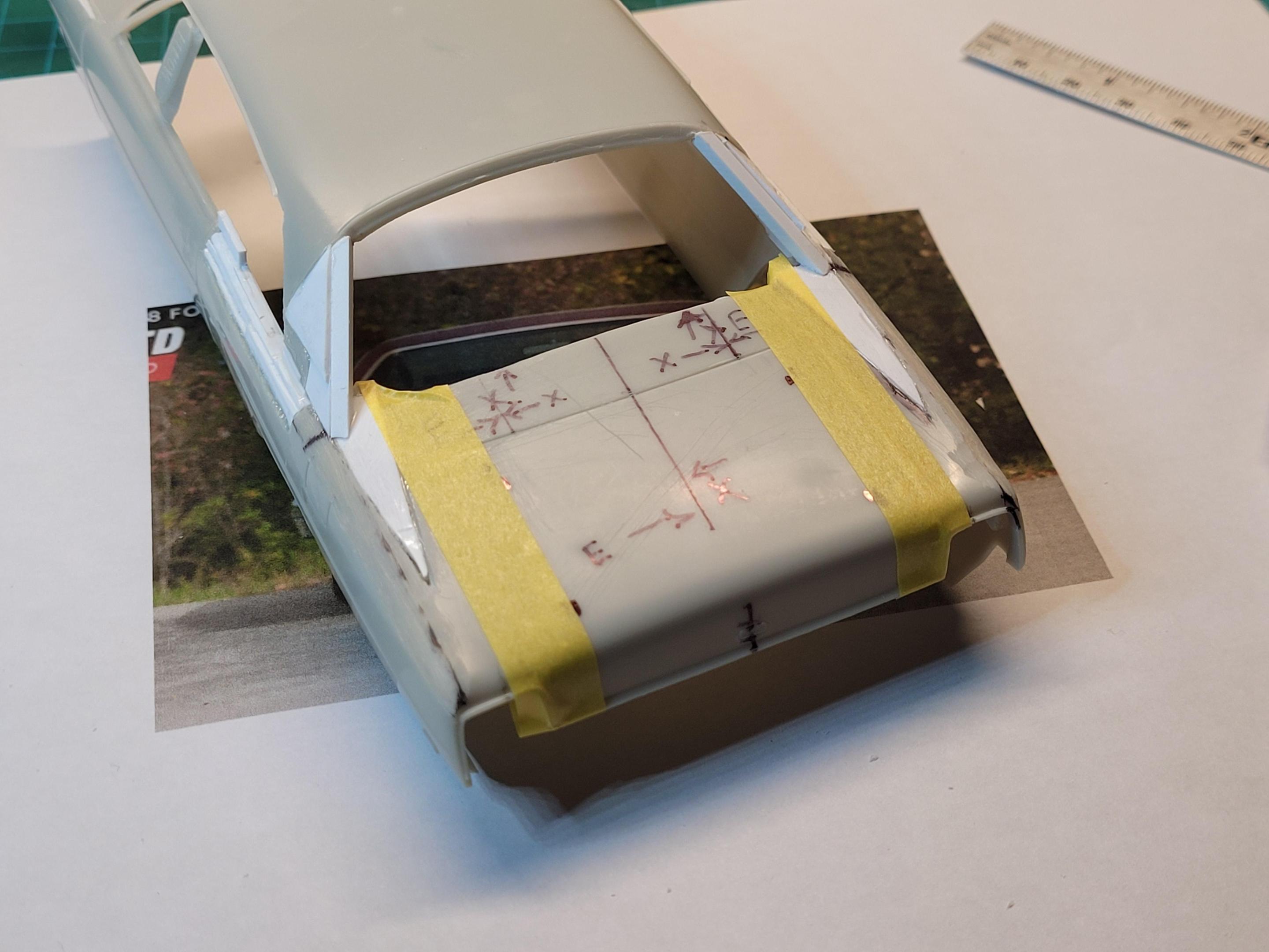 Here's some work from September 11th. That day consisted of extending the rear side windows back, building a new B-pillar, and adding more material to the bottom of the decklid in preparation for carving out the new shape. I also made an attempt at expanding the front wheel arches with a Dremel tool.