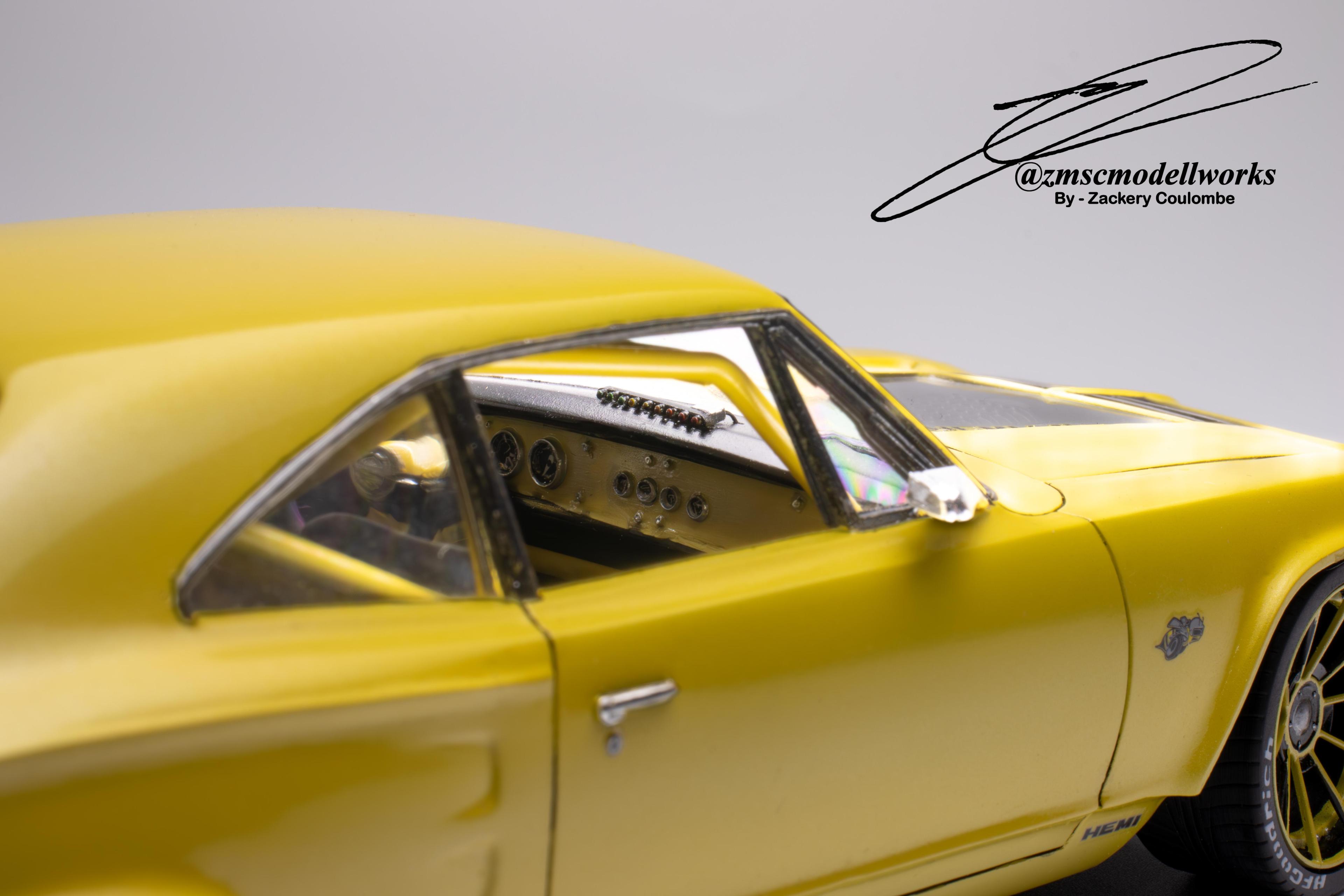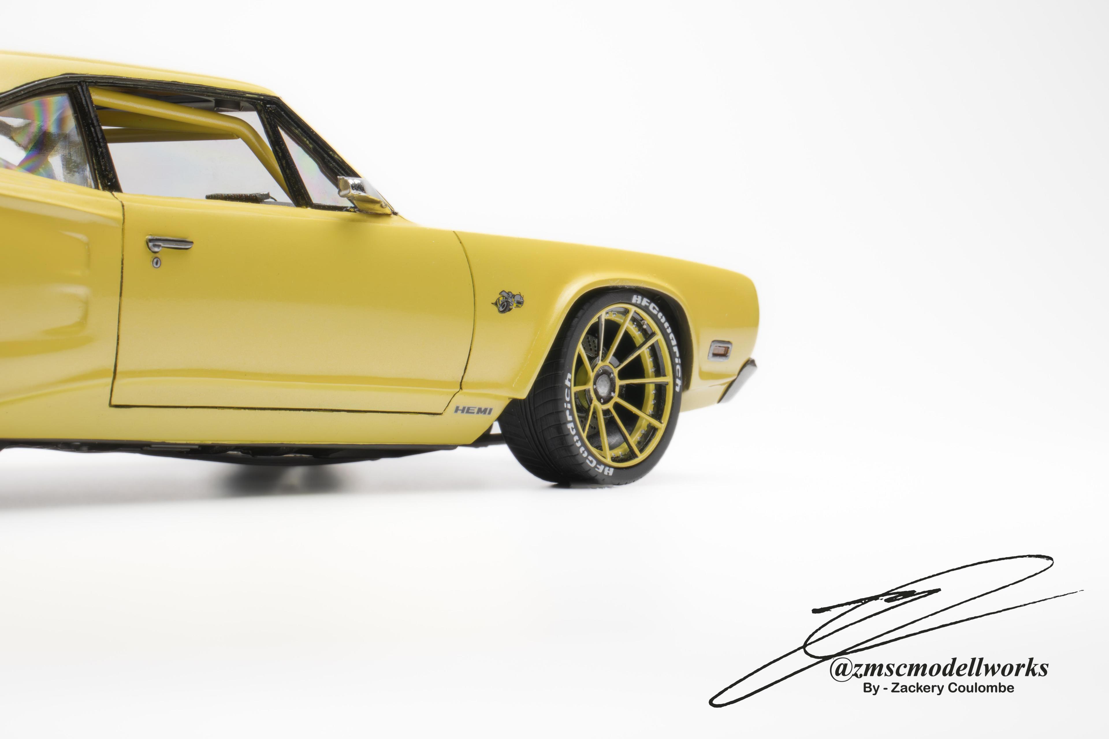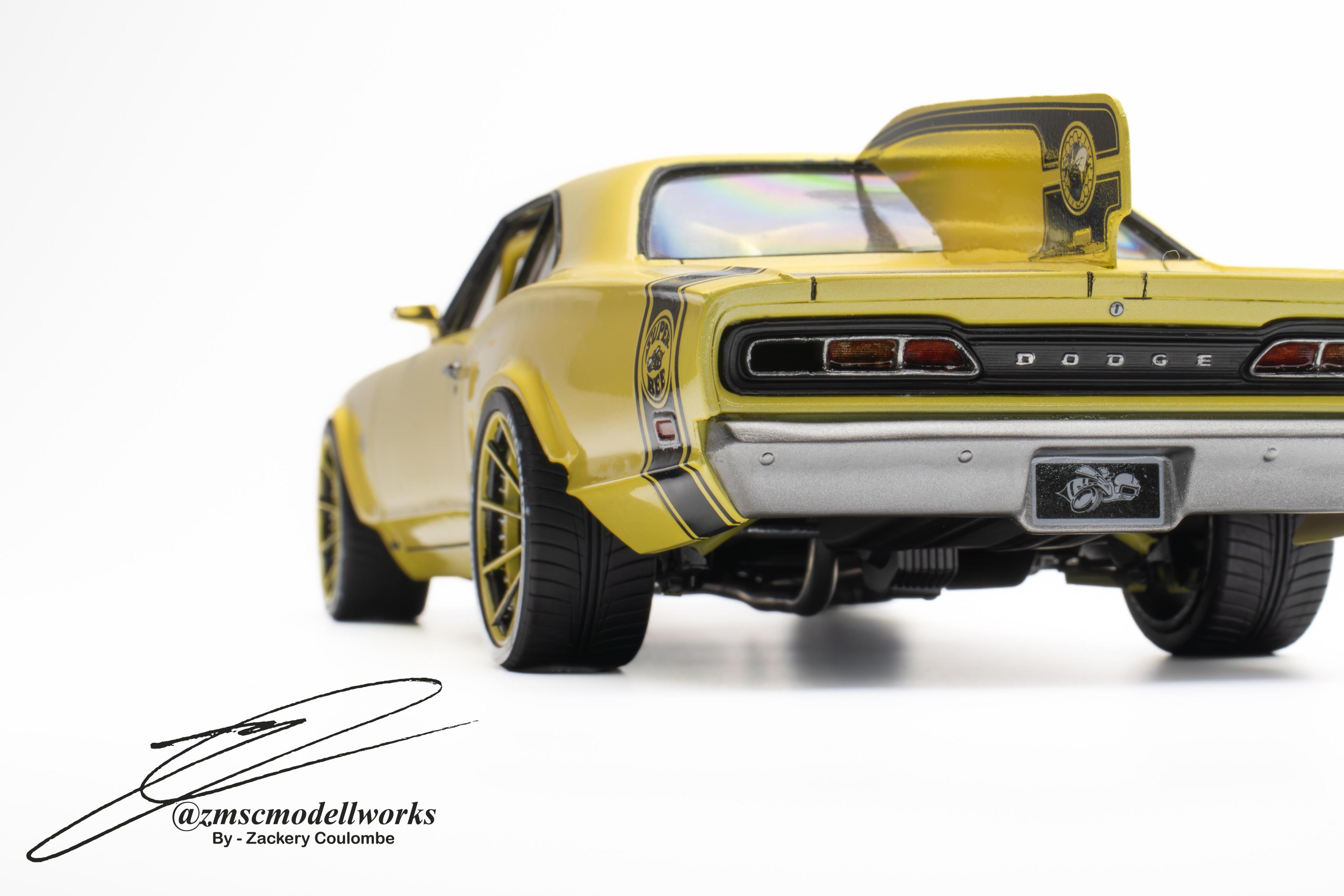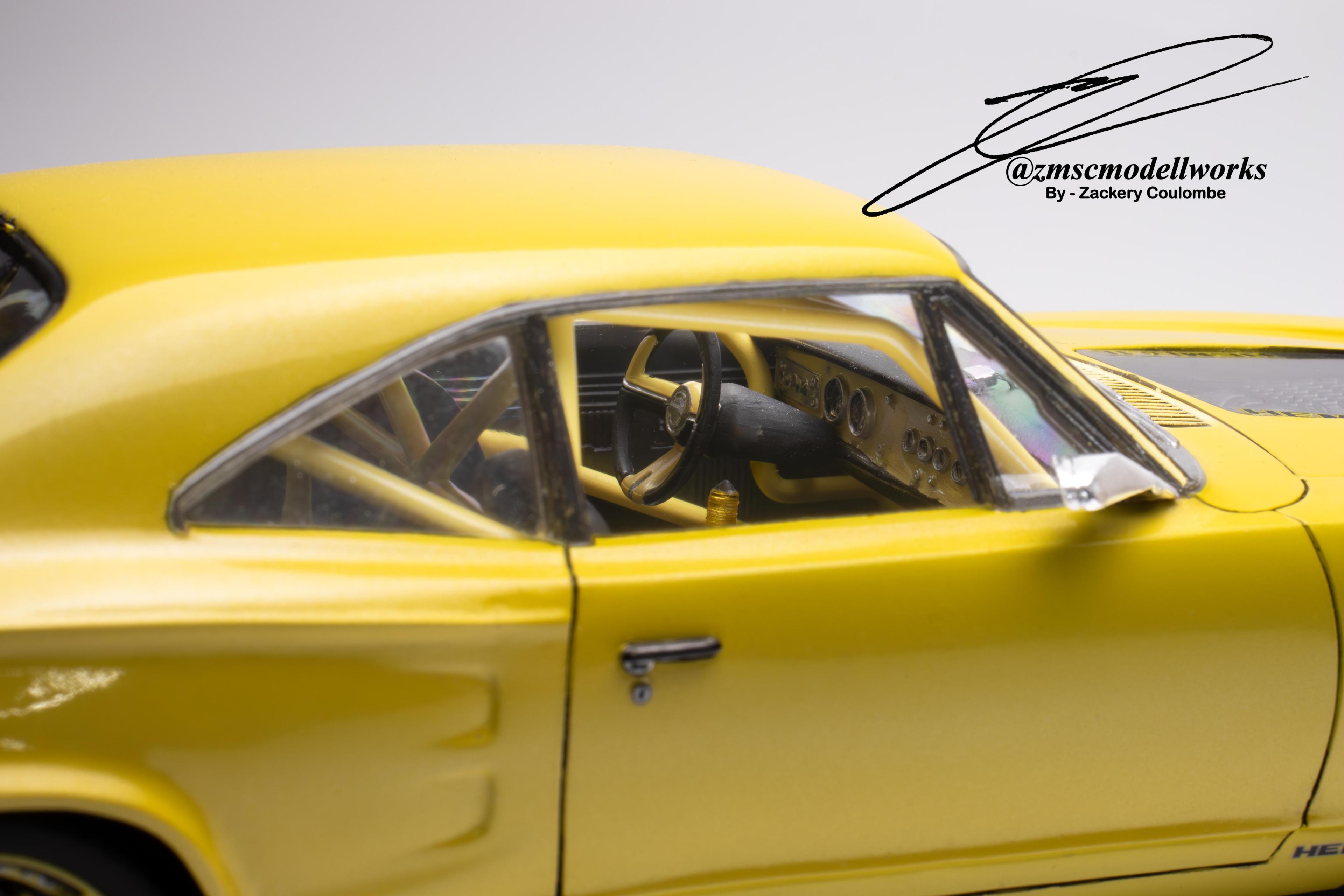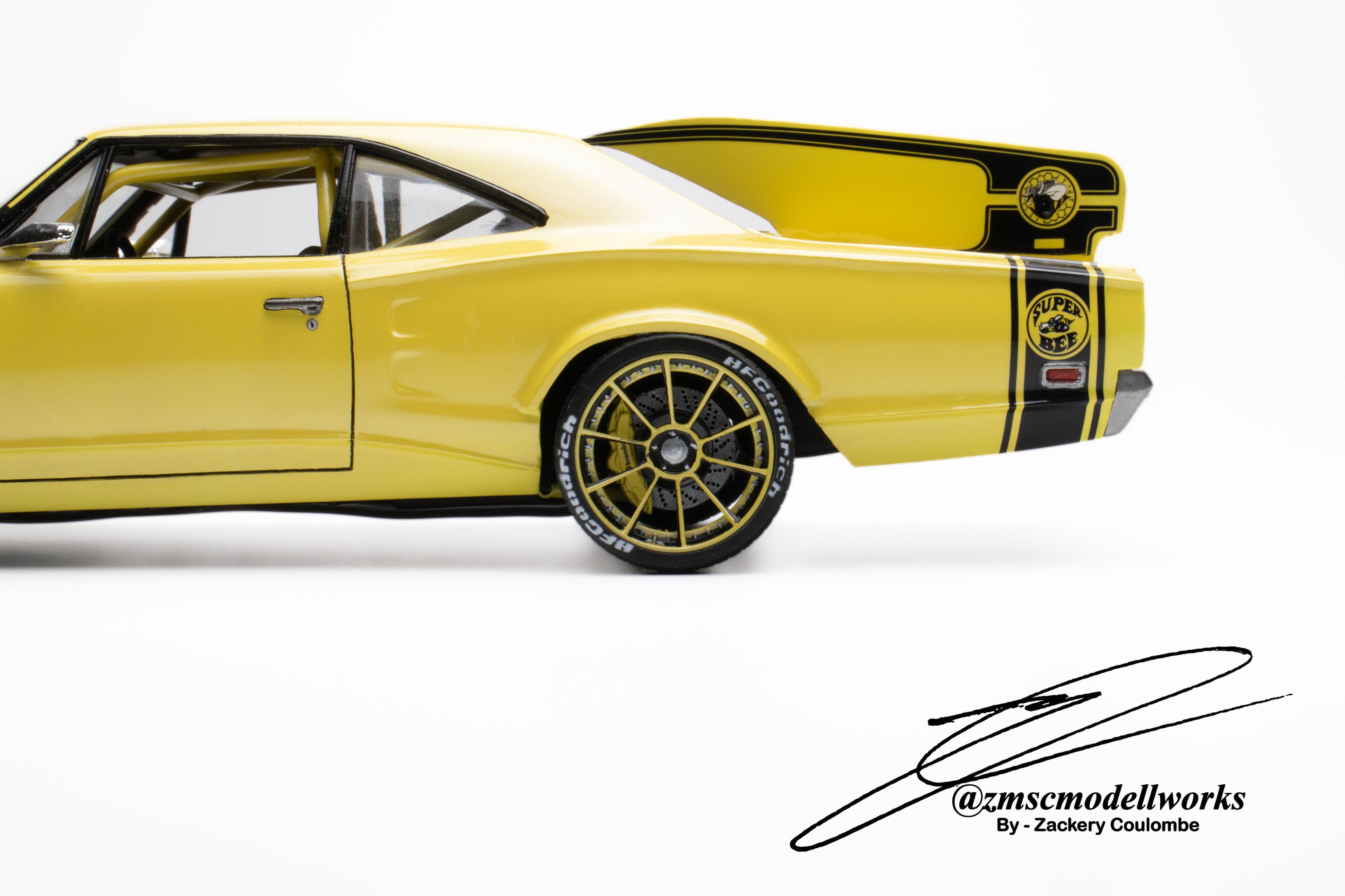 Next on the block of my heavily modified MOPARs is this 1969 Dodge Super Bee Ill start on the exterior and move down and in. First off and most notable is the large tail fin out the back. The profile was shaped off of the Dodge Coronet Super Bee's stripe that runs from the back of the rear quarter up to midway on the door. Besides that I wanted to keep the rest of the body lines yet make those more aggressive. 0.5mm Rod was laid along some of these sharper lines to extend them out from the body, the 2 part autobody filler was put in and sanded to blend everything together. 1x2mm rectangular styrene was used around the wheel arches and got the same treatment. The body was finished off with Splash Paints-Lemon Twist, a factory matched MOPAR color before being given 3 layers of Zero Paints Pearl Effect top coat. Decals were applied and then sealed in with Splash Paints 2K Clear. As I couldn't find any mirror STLs that suited the build, I went diving into the spares box and came across a bunch of parts I didn't use on an old Concept Camaro. These were left chrome to keep with a bit of the factory flair. I did however decide to not rechrome the front and rear bumpers as they sat out too wide from the body and required shortening. These were simply painted Steel from Splash Paints. With the huge wing out back, this prevented the trunk from opening and closing normally. The idea then was to do side opening trunks with a nitrous bottle and fuel cell on each side but erring on the side of not completing the build from being too complex, I opted to just re-scribe the panel lines to show two halves. The exhaust was initially going to run down the side of the rocker panels but mocking it up I felt like it was going to add too much visual weight si I ran the 3in exhaust all the way to the back like normal but entering the trunk spack from the back of the wheel arches. This was then "run" through to the outermost taillight housings and exits through there. The front grille was opened up to give some space in the nose for the radiator and supercharger heat exchanger while the headlight buckets themselves were removed and replaced with rounded lead wire to represent HALO lights. More airflow was gained by cutting out sections of the front bumper. Of course I had to add the yellow fog lamps. Originally the plan was going to use the Charger hood scoop from the 2 in 1 '68 kit but then while building my 07 Super Bee and Super Bee Wagons, I noticed that the black HEMI logo looked like a really good shape for a window so I made a template, rotated it 90 degrees and made that the top down window into the engine bay. The extra space up front was measured and cut for air extraction. Some 6.1L HEMI decals were sourced from the newer Revell Charger Super Bee with the scissor doors which was the donor kit to the Charger Super Bee XL. Wheels and Tires I could not remember what they were or where they came from but they were in the spares box and tickled my fancy at the time so they got body colored and blacked out as well, fairly certain that they scale measured at 22x13. The tires were painted with Splash Paints Rubber Black. 3D printed Brembo 6 Pots were body matched and paired to 18" drilled rotors. The front end was caged to make a custom subframe to mount the Hellcrate in. This allowed me to pretty much do whatever I wanted suspension wise on the front so I opted to do double wishbones and coilovers to modernize the ride height. The engine is the Hellcrate design from Motabas on Cults 3D, minus the exhaust manifolds. These were custom made, 4 to 1, equal length headers made scratch from 2.0mm lead wire leading into the dual 3in exhaust out back. With the dropped engine and custom subframe, over and down was required to get proper ground clearance The engine was plumbed, wired and belted to keep a clean look. Had this not been done in 2 months for a group build I probably would have not gone for a "tucked look" and made everything look more or less an OEm styled harness. The tube front end and the cylinder heads were body colored as well. Moving inside, nothing too crazy was done. While the back seat was "retained", its not much good now with the intricate, body matched roll cage installed. The dash was refaced with a flat sheet, riveted in with some custom '70s era NASCAR gauges with chrome bezels. Along with the mirrors and rear diff, the steering wheel + column also came from the Concept Camaro kit. The sequential shifter was a scratch made piece, the grip being made from clear styrene rod and dipped in Tamiya Clear Yellow. I usually keep the longest and thickest pieces in the spares box for instances like this. In keeping with the racecar theme, I made a digital light rev counter. Just a rectangular styrene piece with 0.25mm rod ends glued along and painted with clears gives a good effect on what exactly it may be. A simple set of factory MOPAR buckles finished off the interior. Hope You enjoy this one, let me know if you'd like to see more like this.
