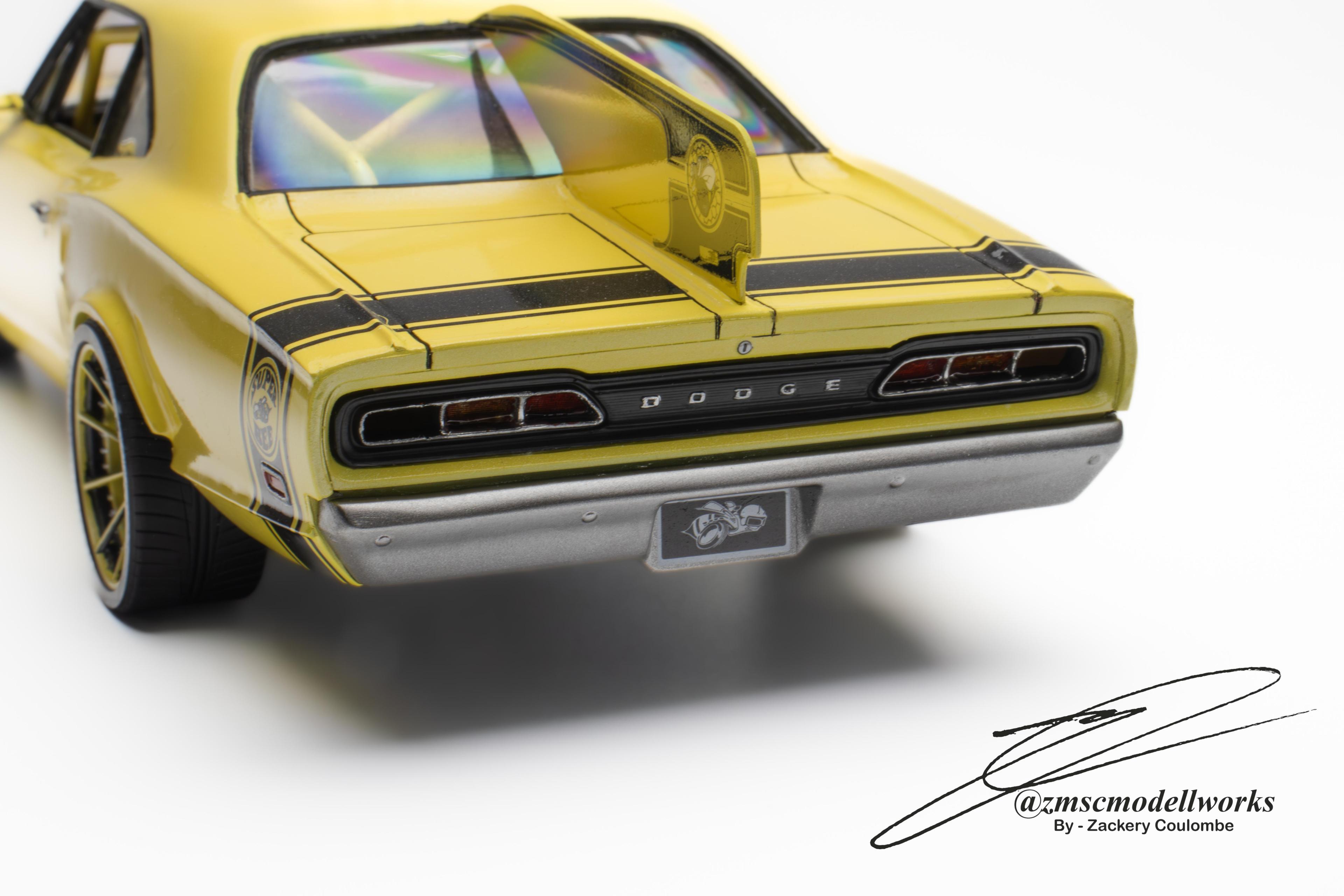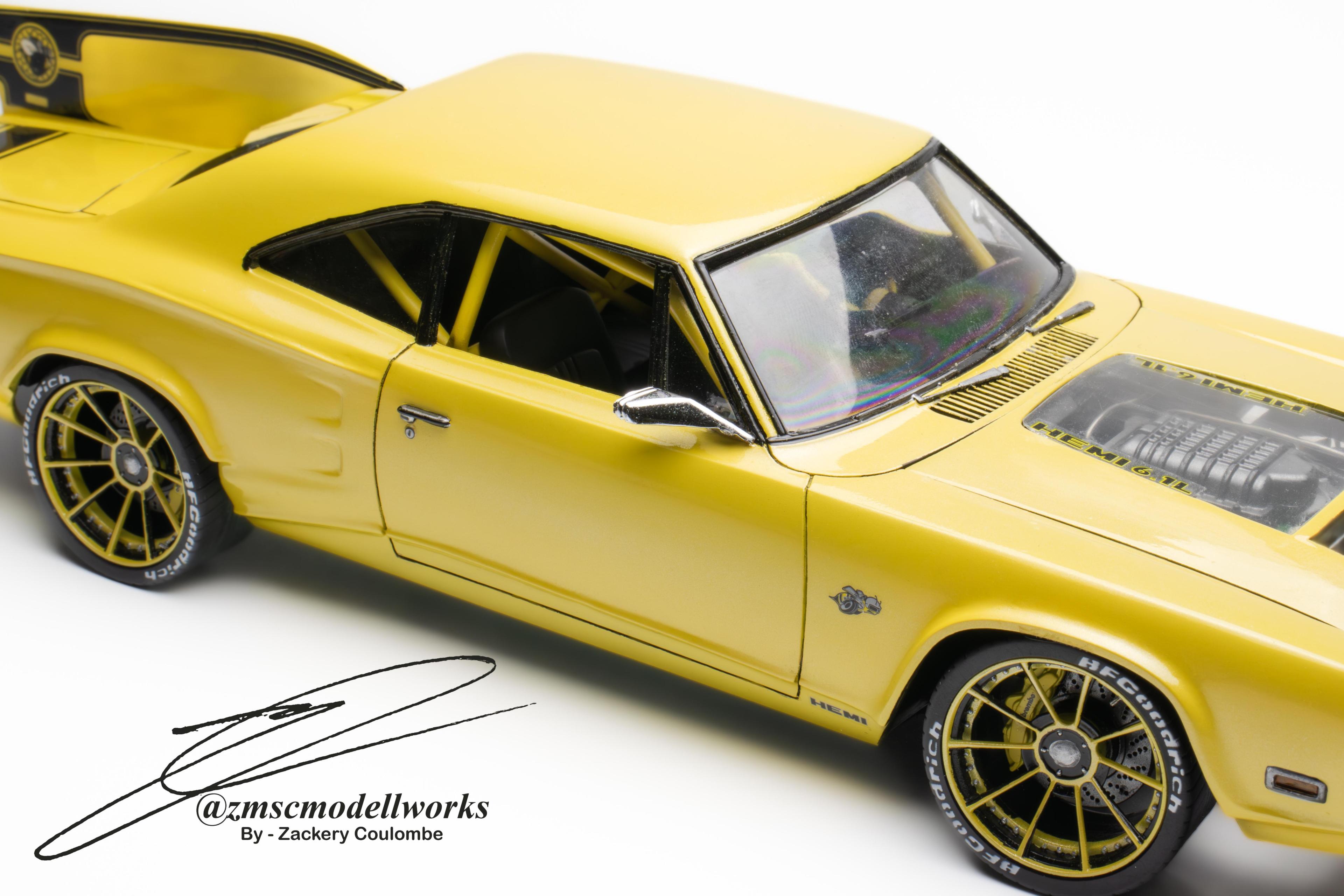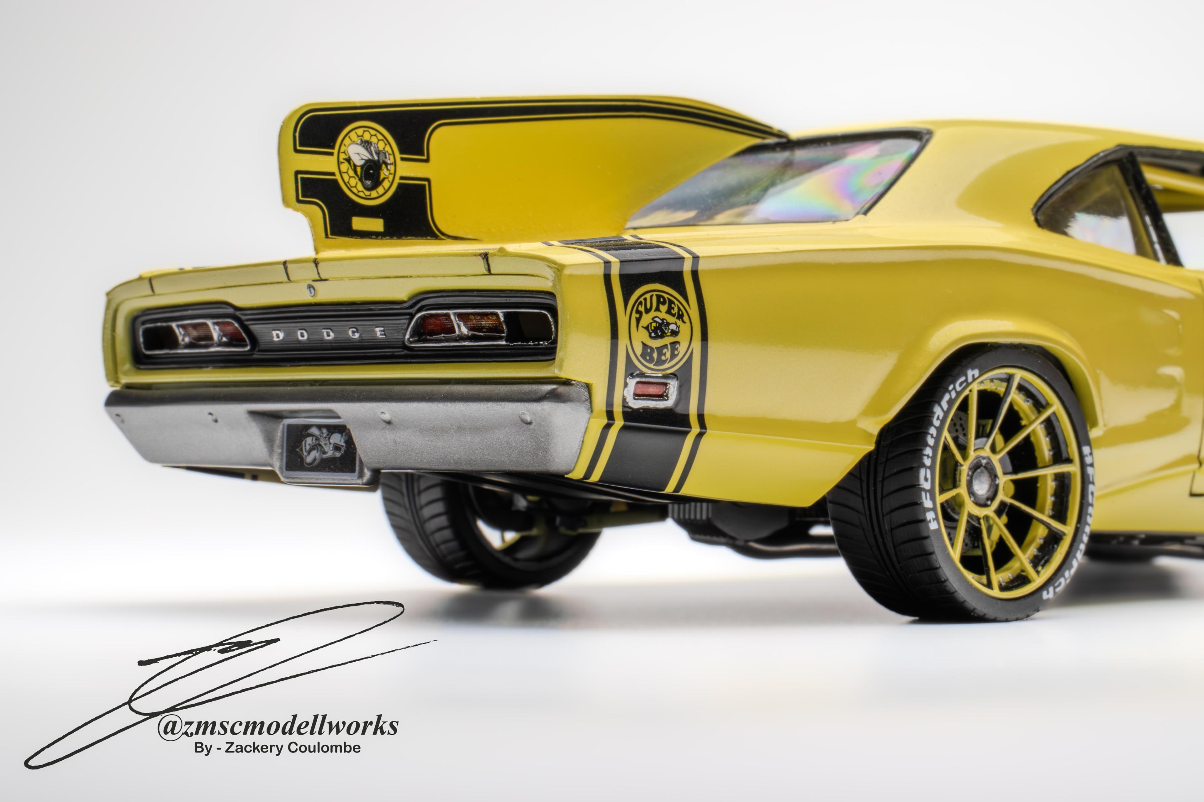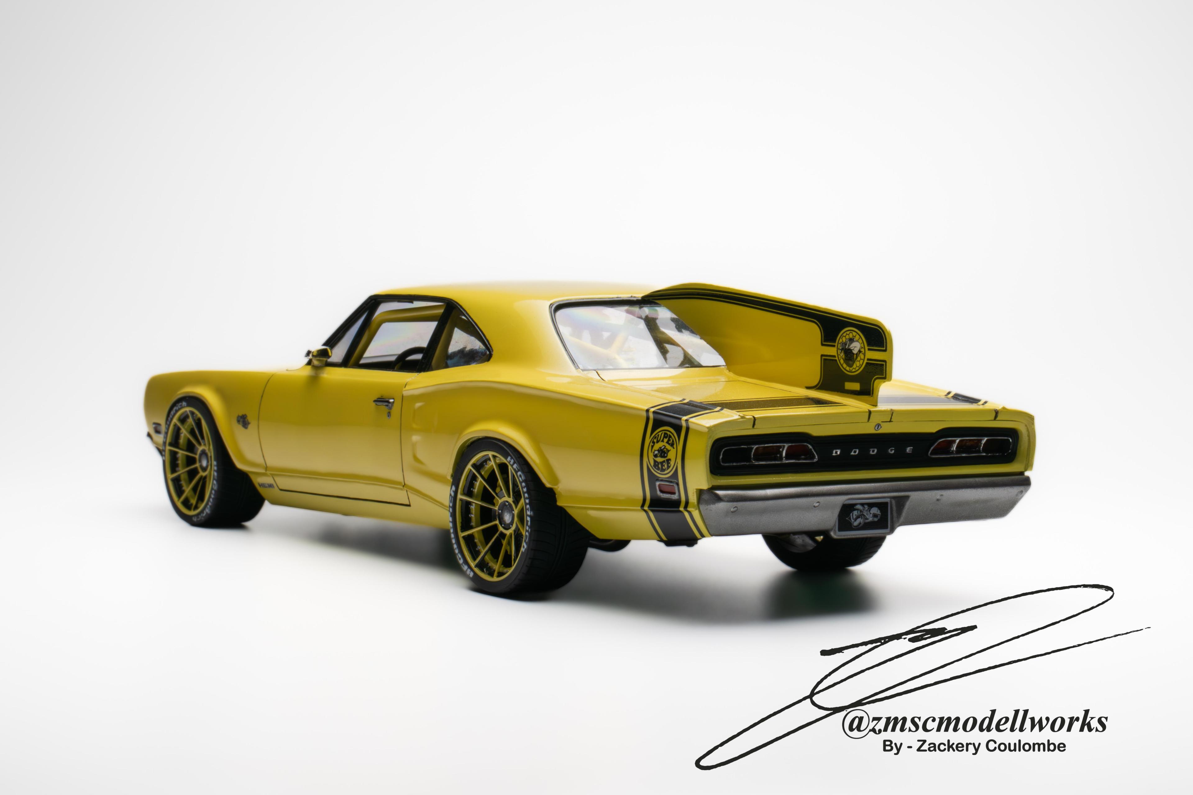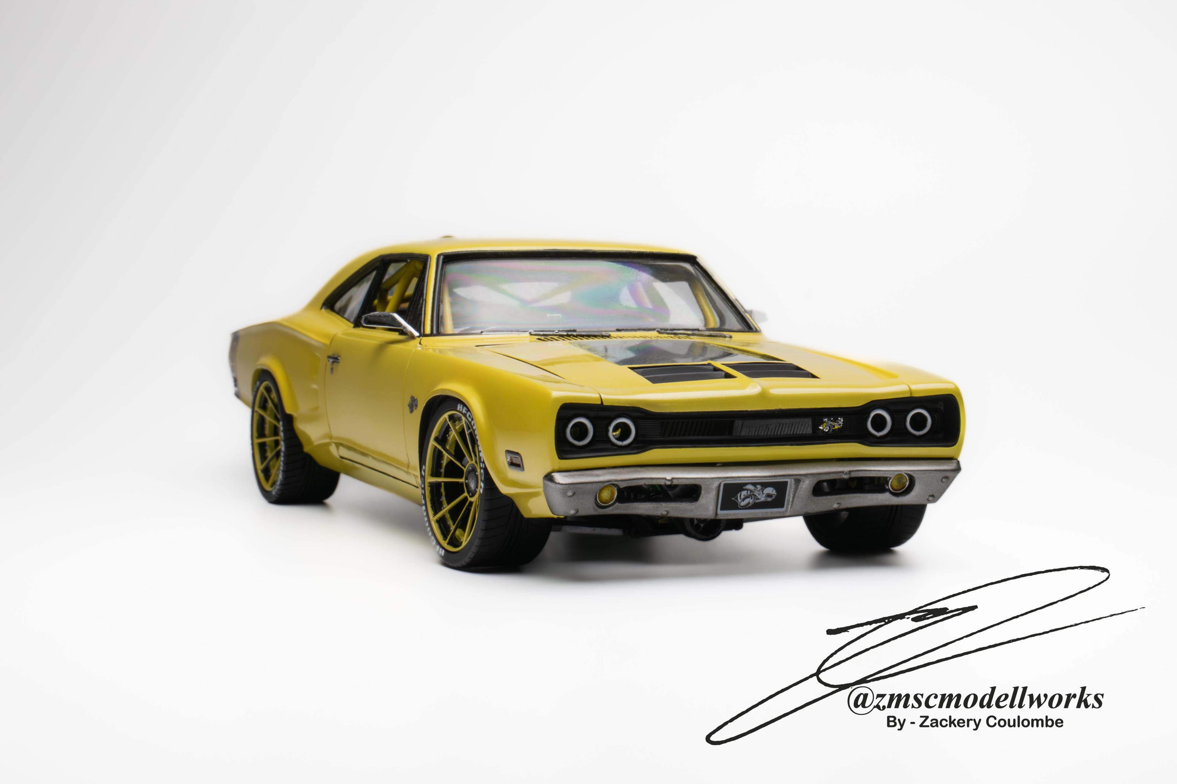 Next on the block of my heavily modified MOPARs is this 1969 Dodge Super Bee Ill start on the exterior and move down and in. First off and most notable is the large tail fin out the back. The profile was shaped off of the Dodge Coronet Super Bee's stripe that runs from the back of the rear quarter up to midway on the door. Besides that I wanted to keep the rest of the body lines yet make those more aggressive. 0.5mm Rod was laid along some of these sharper lines to extend them out from the body, the 2 part autobody filler was put in and sanded to blend everything together. 1x2mm rectangular styrene was used around the wheel arches and got the same treatment. The body was finished off with Splash Paints-Lemon Twist, a factory matched MOPAR color before being given 3 layers of Zero Paints Pearl Effect top coat. Decals were applied and then sealed in with Splash Paints 2K Clear. As I couldn't find any mirror STLs that suited the build, I went diving into the spares box and came across a bunch of parts I didn't use on an old Concept Camaro. These were left chrome to keep with a bit of the factory flair. I did however decide to not rechrome the front and rear bumpers as they sat out too wide from the body and required shortening. These were simply painted Steel from Splash Paints. With the huge wing out back, this prevented the trunk from opening and closing normally. The idea then was to do side opening trunks with a nitrous bottle and fuel cell on each side but erring on the side of not completing the build from being too complex, I opted to just re-scribe the panel lines to show two halves. The exhaust was initially going to run down the side of the rocker panels but mocking it up I felt like it was going to add too much visual weight si I ran the 3in exhaust all the way to the back like normal but entering the trunk spack from the back of the wheel arches. This was then "run" through to the outermost taillight housings and exits through there. The front grille was opened up to give some space in the nose for the radiator and supercharger heat exchanger while the headlight buckets themselves were removed and replaced with rounded lead wire to represent HALO lights. More airflow was gained by cutting out sections of the front bumper. Of course I had to add the yellow fog lamps. Originally the plan was going to use the Charger hood scoop from the 2 in 1 '68 kit but then while building my 07 Super Bee and Super Bee Wagons, I noticed that the black HEMI logo looked like a really good shape for a window so I made a template, rotated it 90 degrees and made that the top down window into the engine bay. The extra space up front was measured and cut for air extraction. Some 6.1L HEMI decals were sourced from the newer Revell Charger Super Bee with the scissor doors which was the donor kit to the Charger Super Bee XL. Wheels and Tires I could not remember what they were or where they came from but they were in the spares box and tickled my fancy at the time so they got body colored and blacked out as well, fairly certain that they scale measured at 22x13. The tires were painted with Splash Paints Rubber Black. 3D printed Brembo 6 Pots were body matched and paired to 18" drilled rotors. The front end was caged to make a custom subframe to mount the Hellcrate in. This allowed me to pretty much do whatever I wanted suspension wise on the front so I opted to do double wishbones and coilovers to modernize the ride height. The engine is the Hellcrate design from Motabas on Cults 3D, minus the exhaust manifolds. These were custom made, 4 to 1, equal length headers made scratch from 2.0mm lead wire leading into the dual 3in exhaust out back. With the dropped engine and custom subframe, over and down was required to get proper ground clearance The engine was plumbed, wired and belted to keep a clean look. Had this not been done in 2 months for a group build I probably would have not gone for a "tucked look" and made everything look more or less an OEm styled harness. The tube front end and the cylinder heads were body colored as well. Moving inside, nothing too crazy was done. While the back seat was "retained", its not much good now with the intricate, body matched roll cage installed. The dash was refaced with a flat sheet, riveted in with some custom '70s era NASCAR gauges with chrome bezels. Along with the mirrors and rear diff, the steering wheel + column also came from the Concept Camaro kit. The sequential shifter was a scratch made piece, the grip being made from clear styrene rod and dipped in Tamiya Clear Yellow. I usually keep the longest and thickest pieces in the spares box for instances like this. In keeping with the racecar theme, I made a digital light rev counter. Just a rectangular styrene piece with 0.25mm rod ends glued along and painted with clears gives a good effect on what exactly it may be. A simple set of factory MOPAR buckles finished off the interior. Hope You enjoy this one, let me know if you'd like to see more like this.