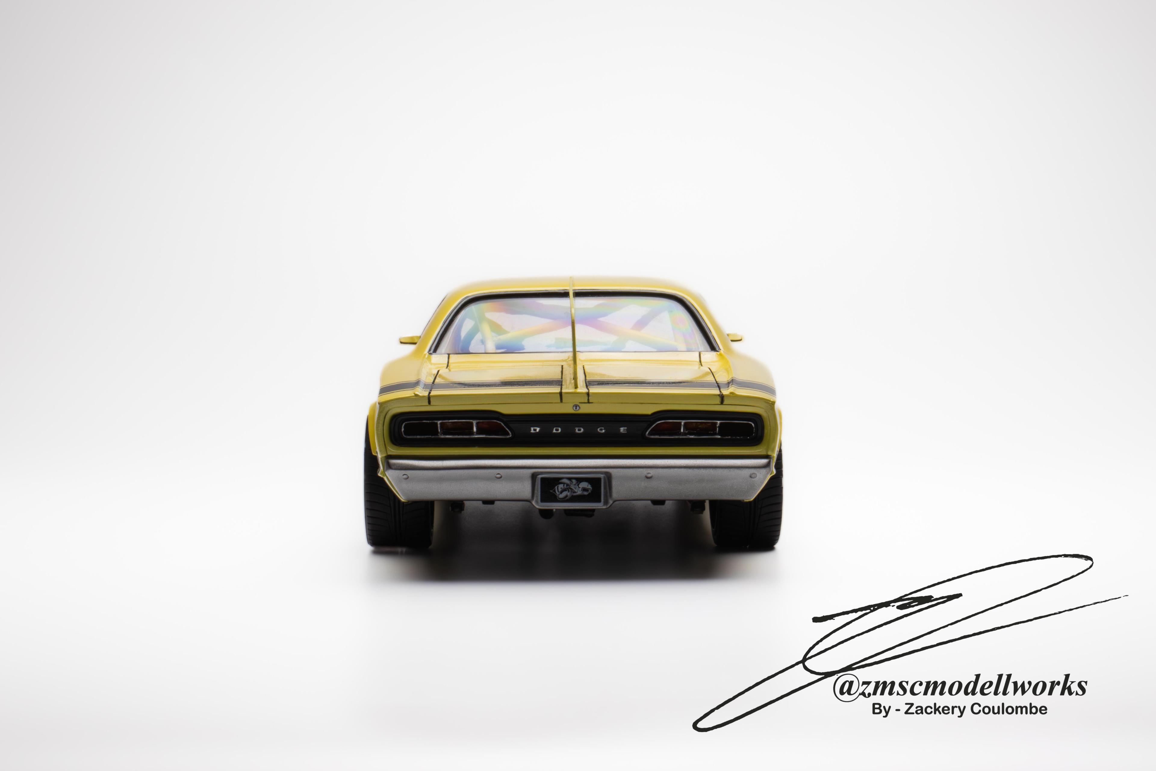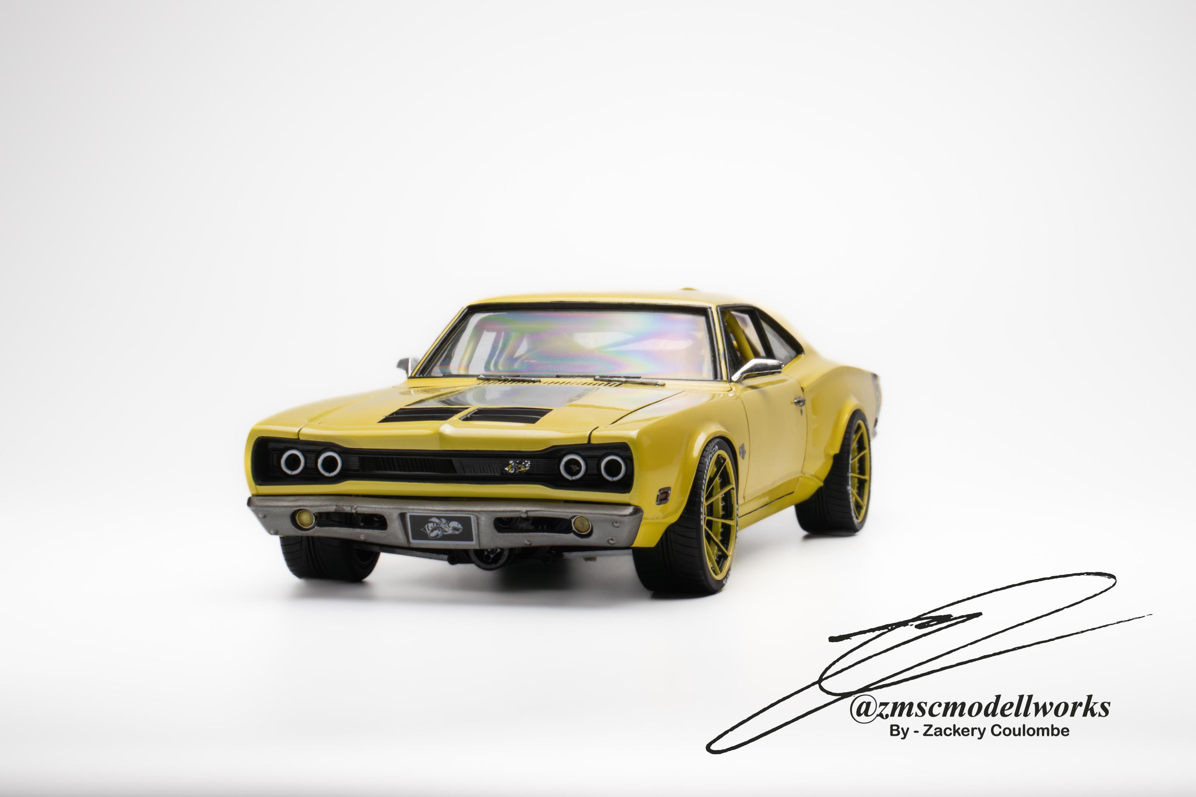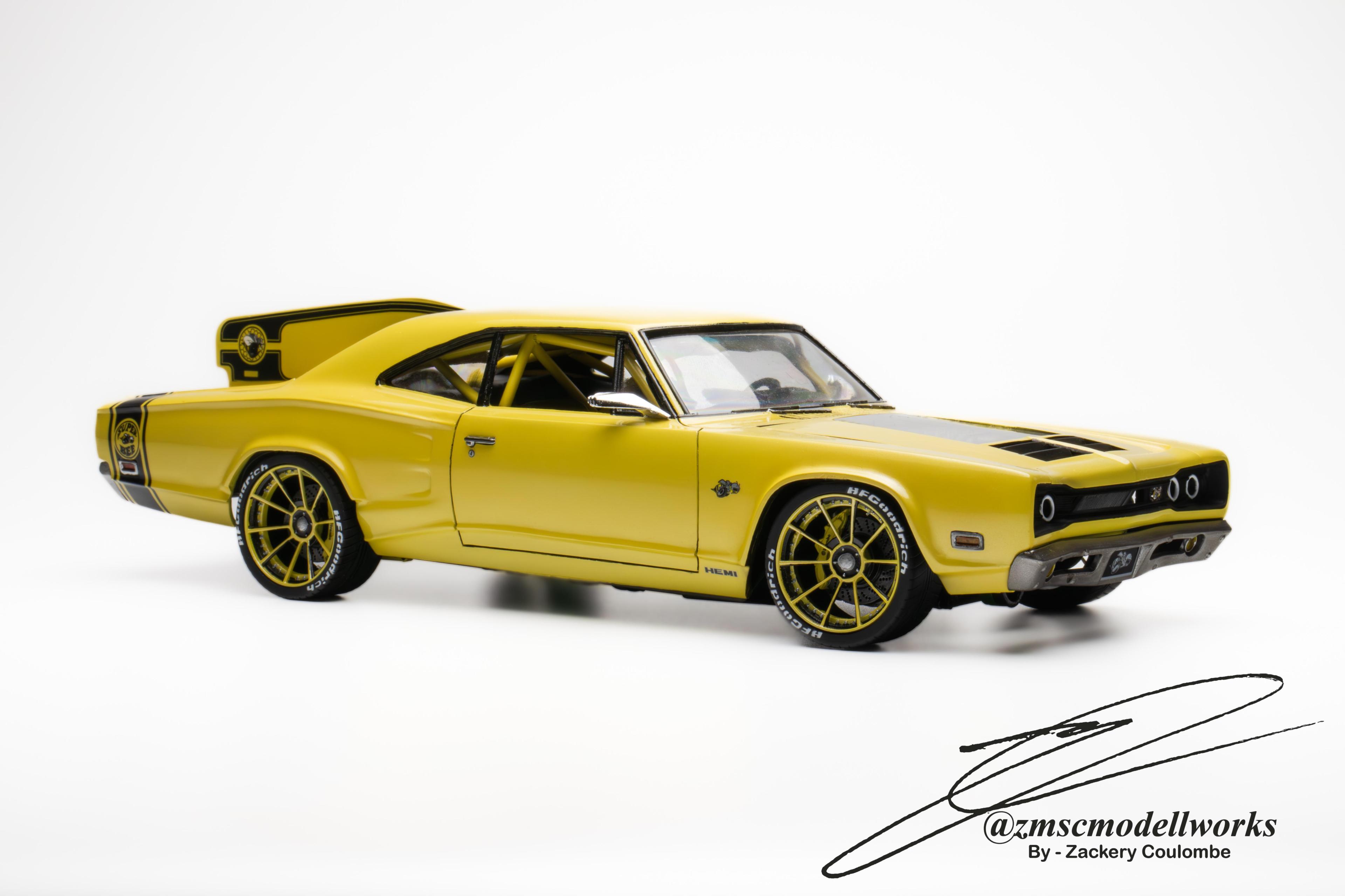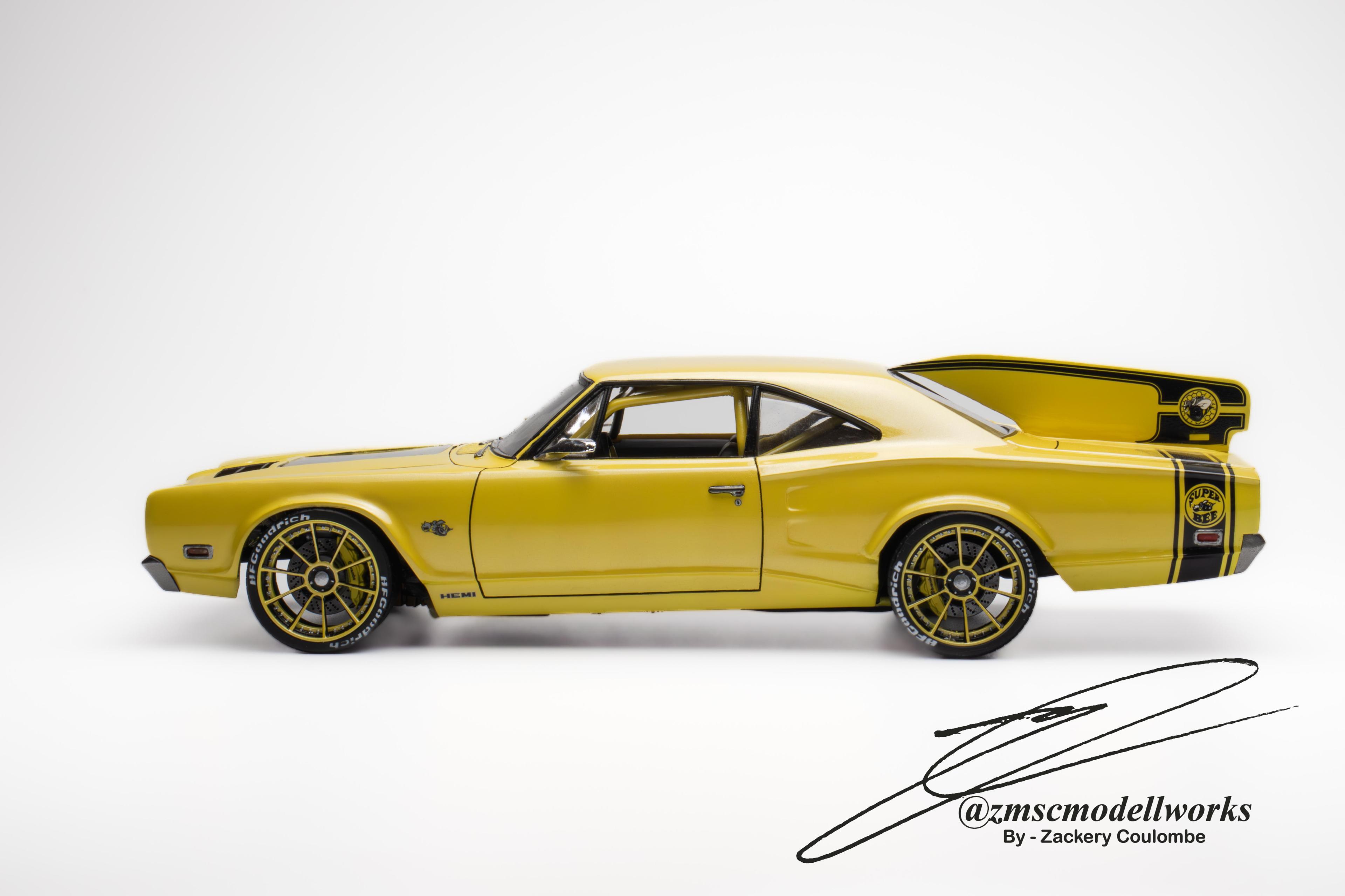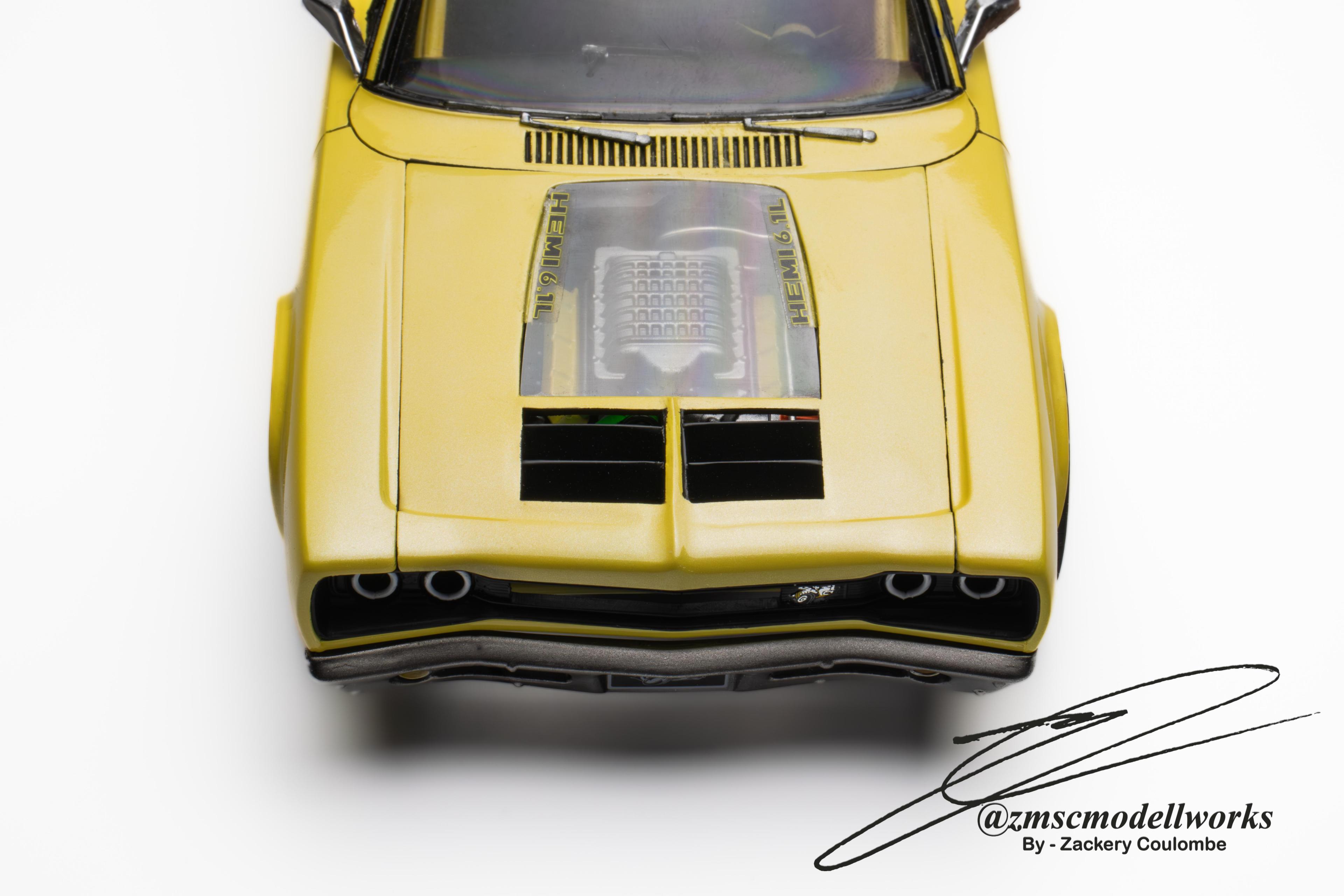 Next on the block of my heavily modified MOPARs is this 1969 Dodge Super Bee Ill start on the exterior and move down and in. First off and most notable is the large tail fin out the back. The profile was shaped off of the Dodge Coronet Super Bee's stripe that runs from the back of the rear quarter up to midway on the door. Besides that I wanted to keep the rest of the body lines yet make those more aggressive. 0.5mm Rod was laid along some of these sharper lines to extend them out from the body, the 2 part autobody filler was put in and sanded to blend everything together. 1x2mm rectangular styrene was used around the wheel arches and got the same treatment. The body was finished off with Splash Paints-Lemon Twist, a factory matched MOPAR color before being given 3 layers of Zero Paints Pearl Effect top coat. Decals were applied and then sealed in with Splash Paints 2K Clear. As I couldn't find any mirror STLs that suited the build, I went diving into the spares box and came across a bunch of parts I didn't use on an old Concept Camaro. These were left chrome to keep with a bit of the factory flair. I did however decide to not rechrome the front and rear bumpers as they sat out too wide from the body and required shortening. These were simply painted Steel from Splash Paints. With the huge wing out back, this prevented the trunk from opening and closing normally. The idea then was to do side opening trunks with a nitrous bottle and fuel cell on each side but erring on the side of not completing the build from being too complex, I opted to just re-scribe the panel lines to show two halves. The exhaust was initially going to run down the side of the rocker panels but mocking it up I felt like it was going to add too much visual weight si I ran the 3in exhaust all the way to the back like normal but entering the trunk spack from the back of the wheel arches. This was then "run" through to the outermost taillight housings and exits through there. The front grille was opened up to give some space in the nose for the radiator and supercharger heat exchanger while the headlight buckets themselves were removed and replaced with rounded lead wire to represent HALO lights. More airflow was gained by cutting out sections of the front bumper. Of course I had to add the yellow fog lamps. Originally the plan was going to use the Charger hood scoop from the 2 in 1 '68 kit but then while building my 07 Super Bee and Super Bee Wagons, I noticed that the black HEMI logo looked like a really good shape for a window so I made a template, rotated it 90 degrees and made that the top down window into the engine bay. The extra space up front was measured and cut for air extraction. Some 6.1L HEMI decals were sourced from the newer Revell Charger Super Bee with the scissor doors which was the donor kit to the Charger Super Bee XL. Wheels and Tires I could not remember what they were or where they came from but they were in the spares box and tickled my fancy at the time so they got body colored and blacked out as well, fairly certain that they scale measured at 22x13. The tires were painted with Splash Paints Rubber Black. 3D printed Brembo 6 Pots were body matched and paired to 18" drilled rotors. The front end was caged to make a custom subframe to mount the Hellcrate in. This allowed me to pretty much do whatever I wanted suspension wise on the front so I opted to do double wishbones and coilovers to modernize the ride height. The engine is the Hellcrate design from Motabas on Cults 3D, minus the exhaust manifolds. These were custom made, 4 to 1, equal length headers made scratch from 2.0mm lead wire leading into the dual 3in exhaust out back. With the dropped engine and custom subframe, over and down was required to get proper ground clearance The engine was plumbed, wired and belted to keep a clean look. Had this not been done in 2 months for a group build I probably would have not gone for a "tucked look" and made everything look more or less an OEm styled harness. The tube front end and the cylinder heads were body colored as well. Moving inside, nothing too crazy was done. While the back seat was "retained", its not much good now with the intricate, body matched roll cage installed. The dash was refaced with a flat sheet, riveted in with some custom '70s era NASCAR gauges with chrome bezels. Along with the mirrors and rear diff, the steering wheel + column also came from the Concept Camaro kit. The sequential shifter was a scratch made piece, the grip being made from clear styrene rod and dipped in Tamiya Clear Yellow. I usually keep the longest and thickest pieces in the spares box for instances like this. In keeping with the racecar theme, I made a digital light rev counter. Just a rectangular styrene piece with 0.25mm rod ends glued along and painted with clears gives a good effect on what exactly it may be. A simple set of factory MOPAR buckles finished off the interior. Hope You enjoy this one, let me know if you'd like to see more like this.