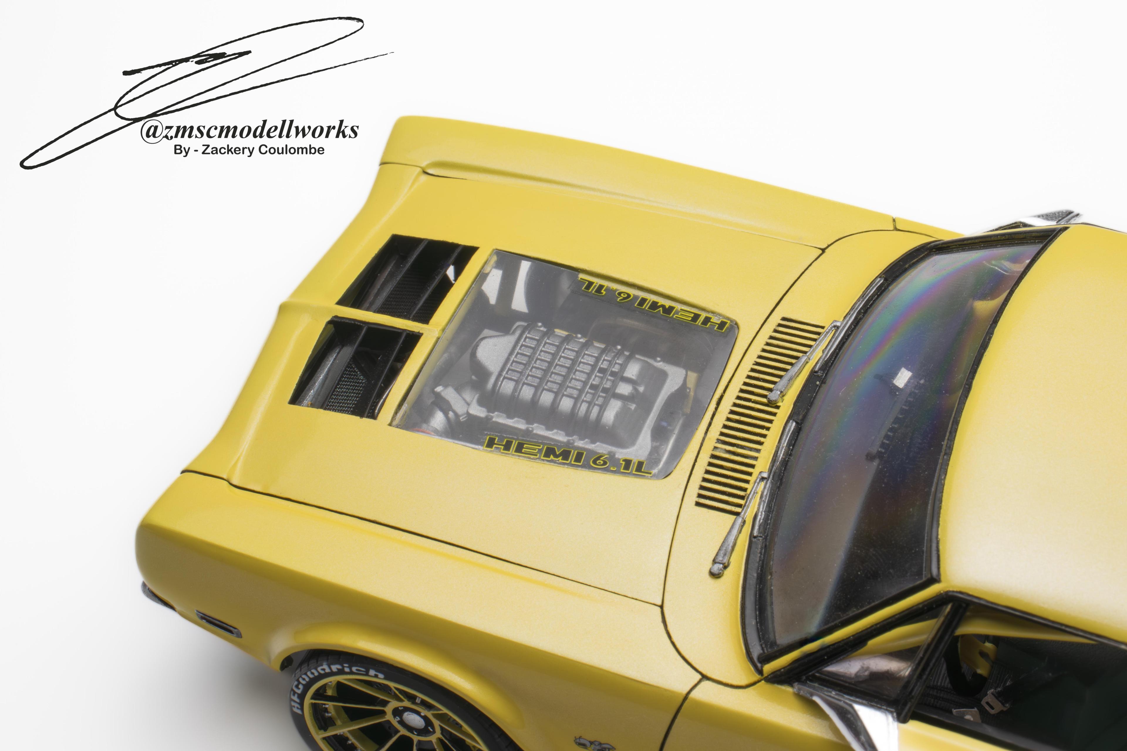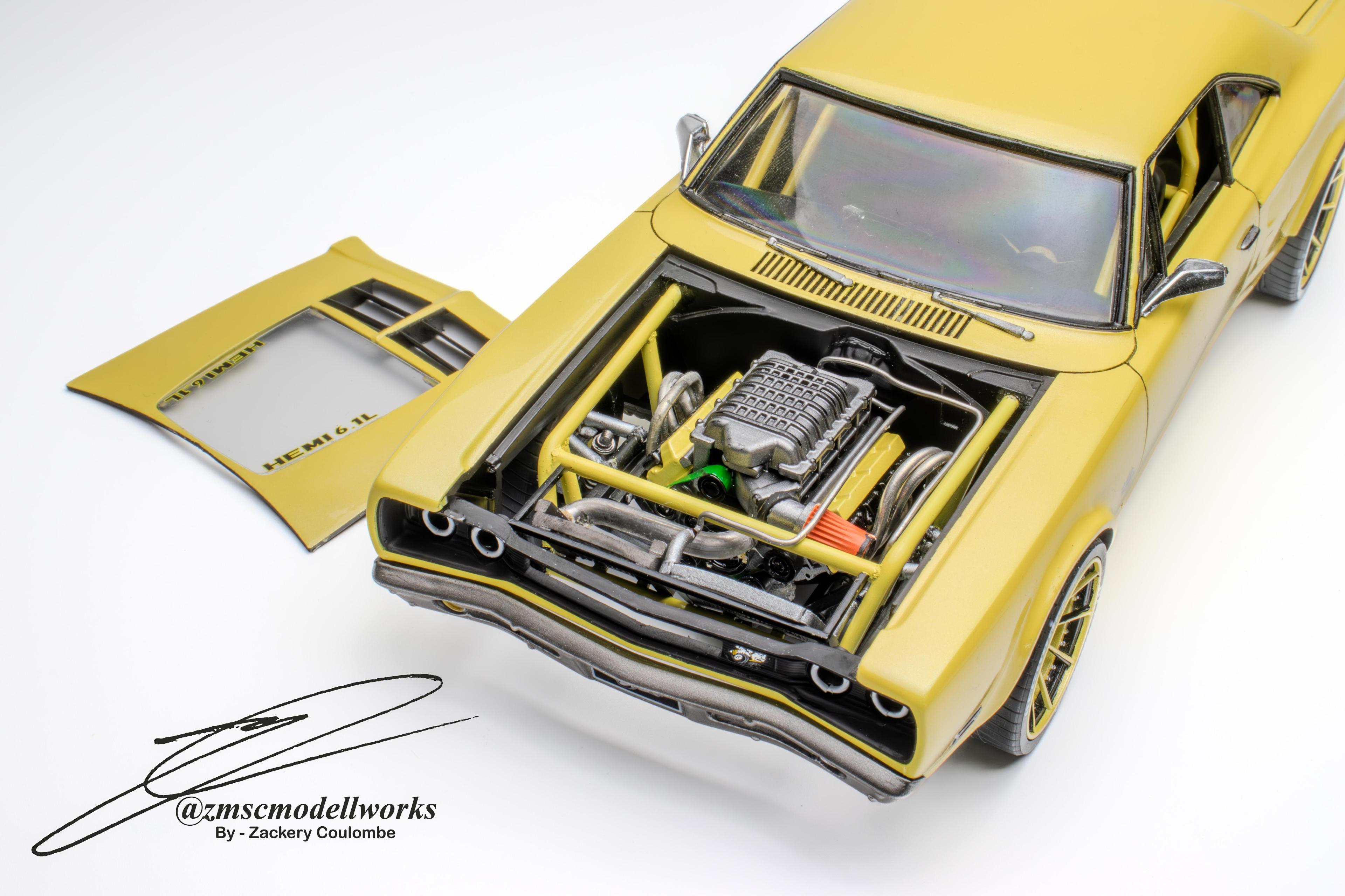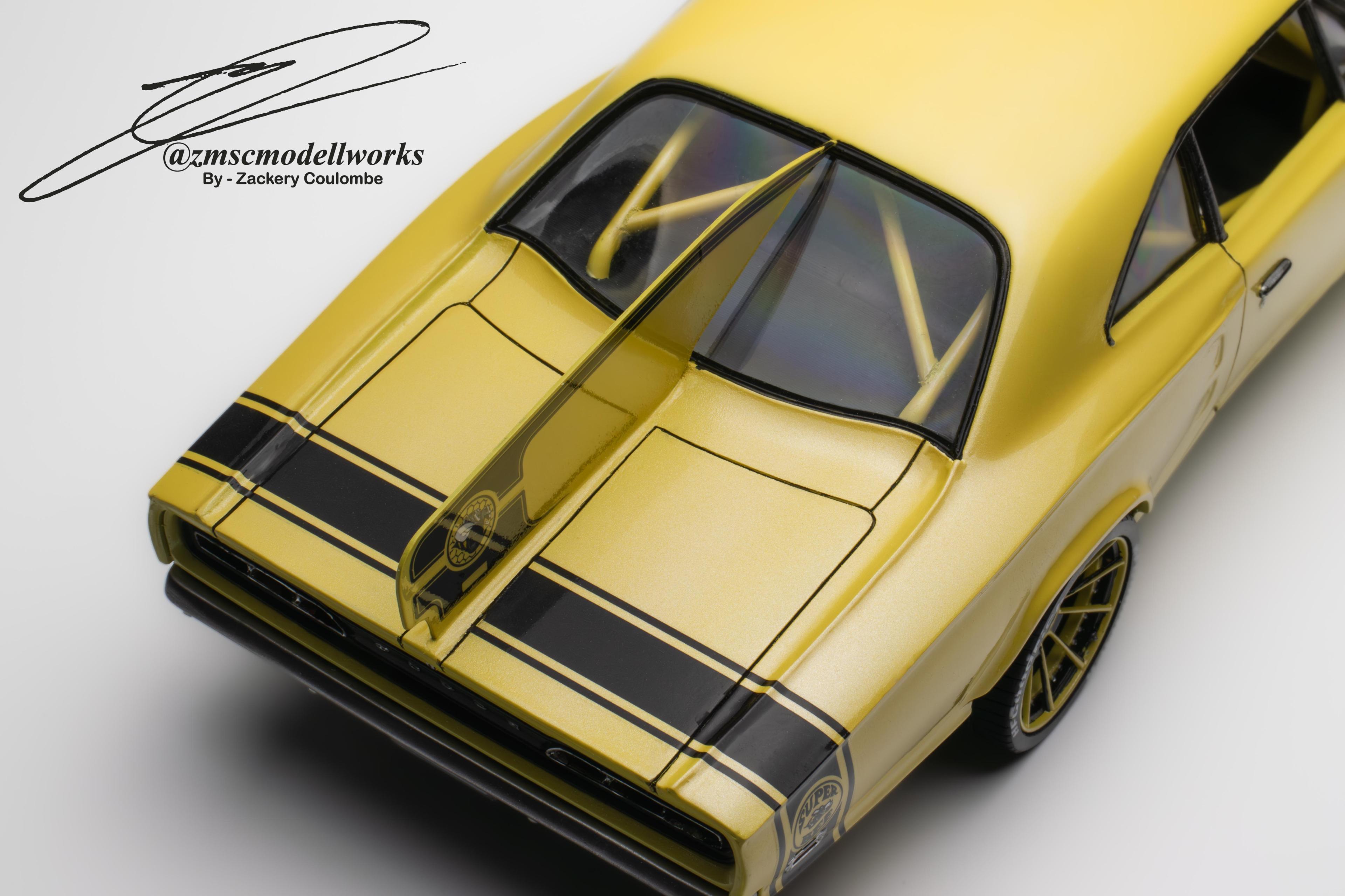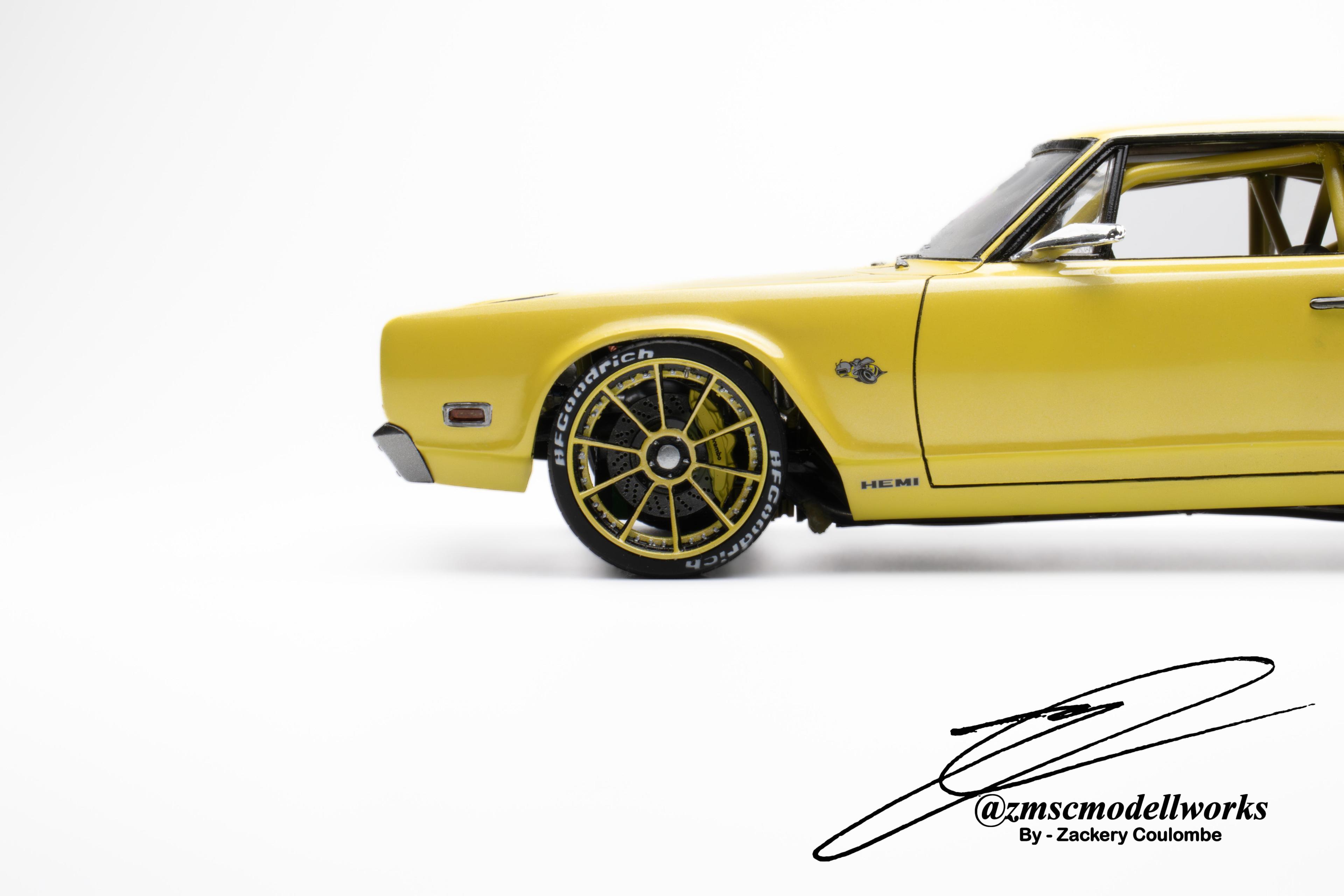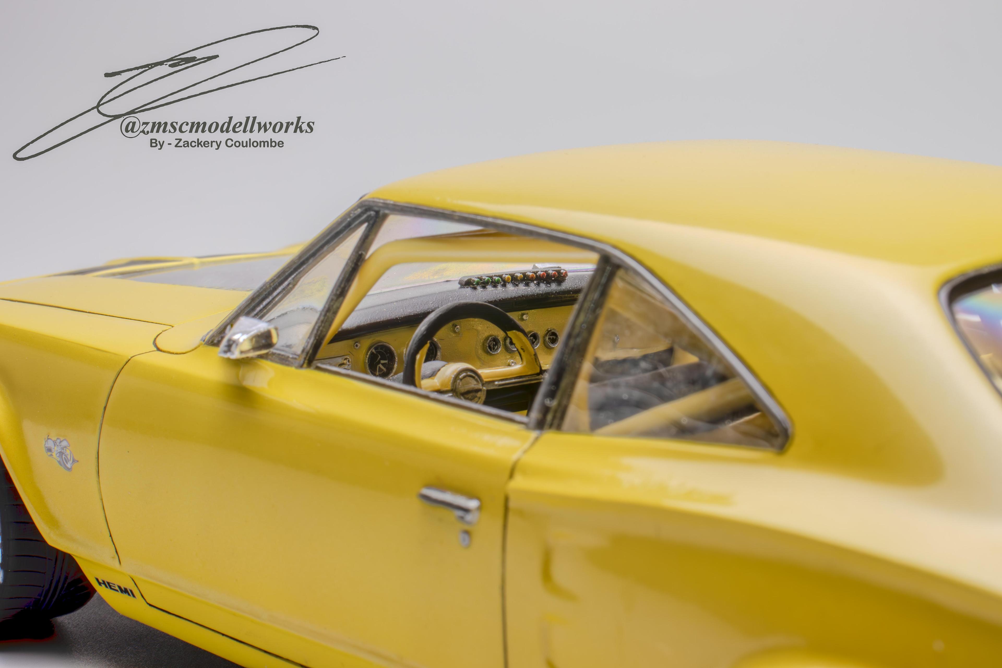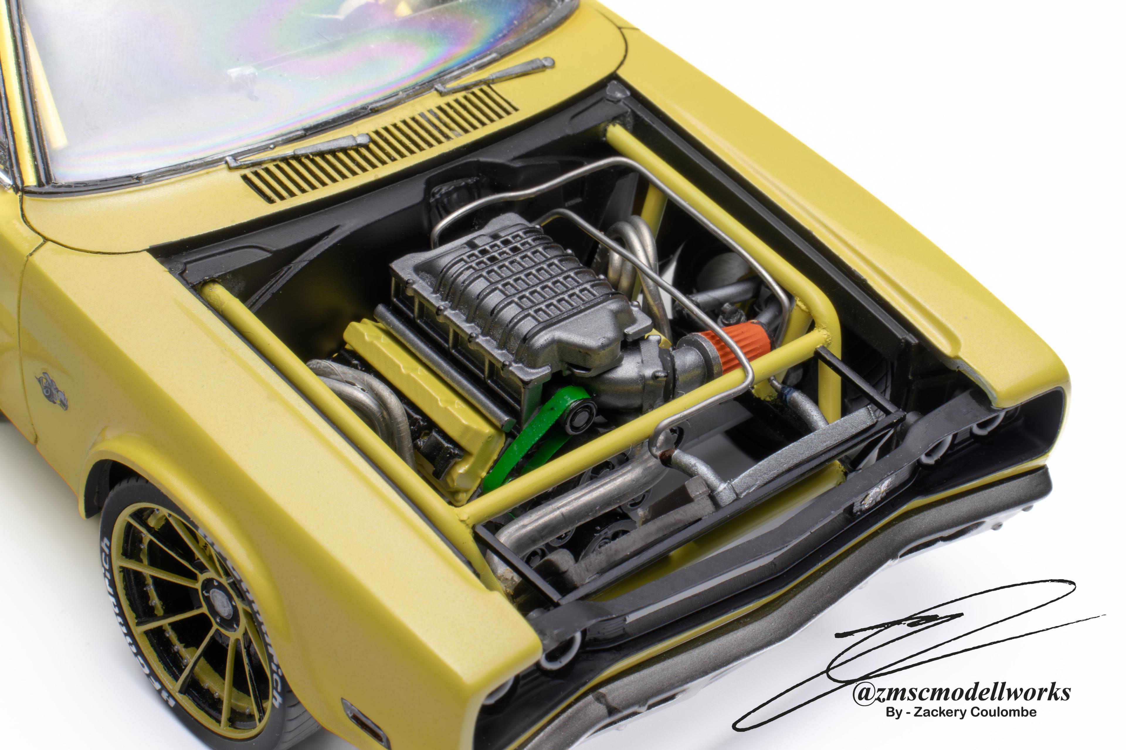 Next on the block of my heavily modified MOPARs is this 1969 Dodge Super Bee Ill start on the exterior and move down and in. First off and most notable is the large tail fin out the back. The profile was shaped off of the Dodge Coronet Super Bee's stripe that runs from the back of the rear quarter up to midway on the door. Besides that I wanted to keep the rest of the body lines yet make those more aggressive. 0.5mm Rod was laid along some of these sharper lines to extend them out from the body, the 2 part autobody filler was put in and sanded to blend everything together. 1x2mm rectangular styrene was used around the wheel arches and got the same treatment. The body was finished off with Splash Paints-Lemon Twist, a factory matched MOPAR color before being given 3 layers of Zero Paints Pearl Effect top coat. Decals were applied and then sealed in with Splash Paints 2K Clear. As I couldn't find any mirror STLs that suited the build, I went diving into the spares box and came across a bunch of parts I didn't use on an old Concept Camaro. These were left chrome to keep with a bit of the factory flair. I did however decide to not rechrome the front and rear bumpers as they sat out too wide from the body and required shortening. These were simply painted Steel from Splash Paints. With the huge wing out back, this prevented the trunk from opening and closing normally. The idea then was to do side opening trunks with a nitrous bottle and fuel cell on each side but erring on the side of not completing the build from being too complex, I opted to just re-scribe the panel lines to show two halves. The exhaust was initially going to run down the side of the rocker panels but mocking it up I felt like it was going to add too much visual weight si I ran the 3in exhaust all the way to the back like normal but entering the trunk spack from the back of the wheel arches. This was then "run" through to the outermost taillight housings and exits through there. The front grille was opened up to give some space in the nose for the radiator and supercharger heat exchanger while the headlight buckets themselves were removed and replaced with rounded lead wire to represent HALO lights. More airflow was gained by cutting out sections of the front bumper. Of course I had to add the yellow fog lamps. Originally the plan was going to use the Charger hood scoop from the 2 in 1 '68 kit but then while building my 07 Super Bee and Super Bee Wagons, I noticed that the black HEMI logo looked like a really good shape for a window so I made a template, rotated it 90 degrees and made that the top down window into the engine bay. The extra space up front was measured and cut for air extraction. Some 6.1L HEMI decals were sourced from the newer Revell Charger Super Bee with the scissor doors which was the donor kit to the Charger Super Bee XL. Wheels and Tires I could not remember what they were or where they came from but they were in the spares box and tickled my fancy at the time so they got body colored and blacked out as well, fairly certain that they scale measured at 22x13. The tires were painted with Splash Paints Rubber Black. 3D printed Brembo 6 Pots were body matched and paired to 18" drilled rotors. The front end was caged to make a custom subframe to mount the Hellcrate in. This allowed me to pretty much do whatever I wanted suspension wise on the front so I opted to do double wishbones and coilovers to modernize the ride height. The engine is the Hellcrate design from Motabas on Cults 3D, minus the exhaust manifolds. These were custom made, 4 to 1, equal length headers made scratch from 2.0mm lead wire leading into the dual 3in exhaust out back. With the dropped engine and custom subframe, over and down was required to get proper ground clearance The engine was plumbed, wired and belted to keep a clean look. Had this not been done in 2 months for a group build I probably would have not gone for a "tucked look" and made everything look more or less an OEm styled harness. The tube front end and the cylinder heads were body colored as well. Moving inside, nothing too crazy was done. While the back seat was "retained", its not much good now with the intricate, body matched roll cage installed. The dash was refaced with a flat sheet, riveted in with some custom '70s era NASCAR gauges with chrome bezels. Along with the mirrors and rear diff, the steering wheel + column also came from the Concept Camaro kit. The sequential shifter was a scratch made piece, the grip being made from clear styrene rod and dipped in Tamiya Clear Yellow. I usually keep the longest and thickest pieces in the spares box for instances like this. In keeping with the racecar theme, I made a digital light rev counter. Just a rectangular styrene piece with 0.25mm rod ends glued along and painted with clears gives a good effect on what exactly it may be. A simple set of factory MOPAR buckles finished off the interior. Hope You enjoy this one, let me know if you'd like to see more like this.