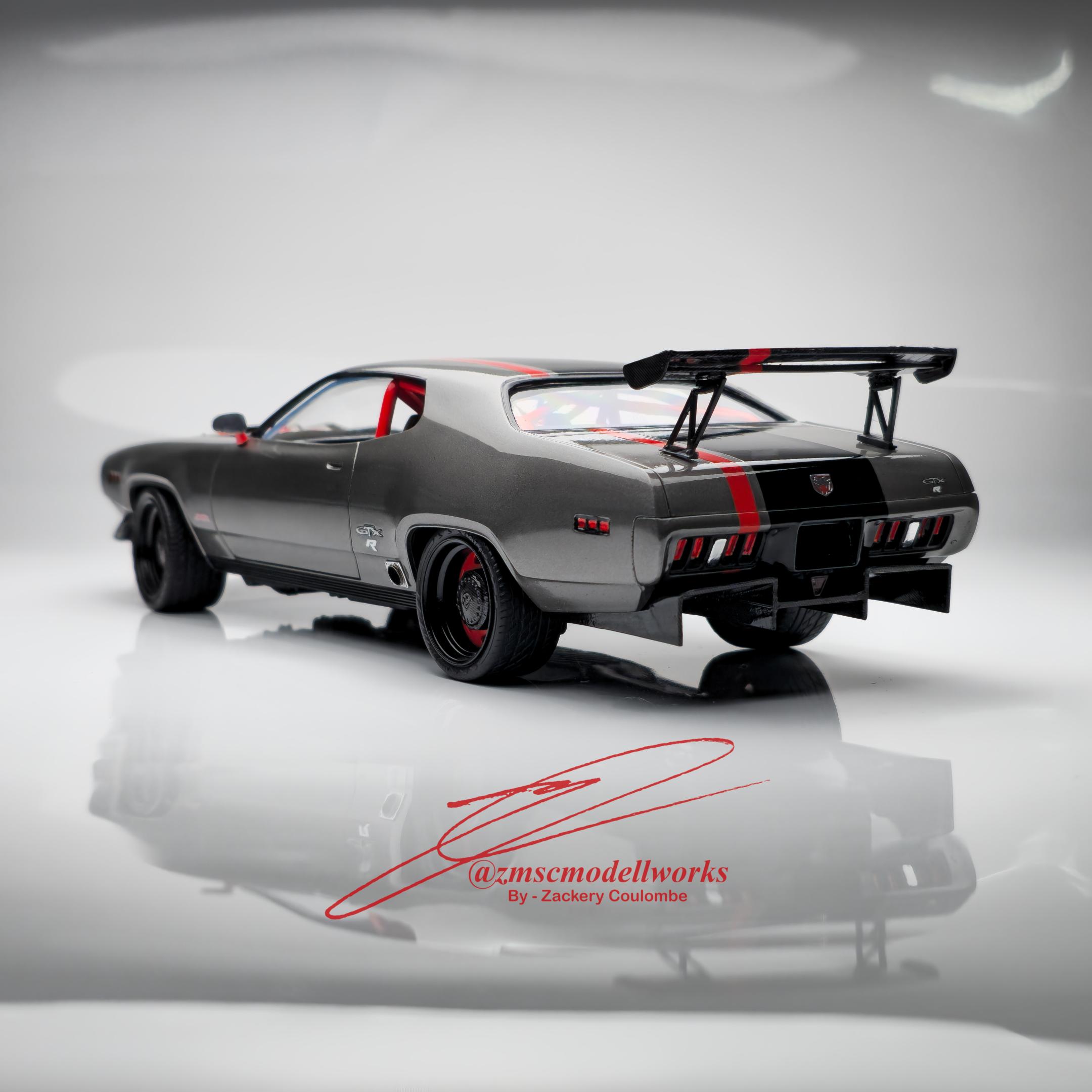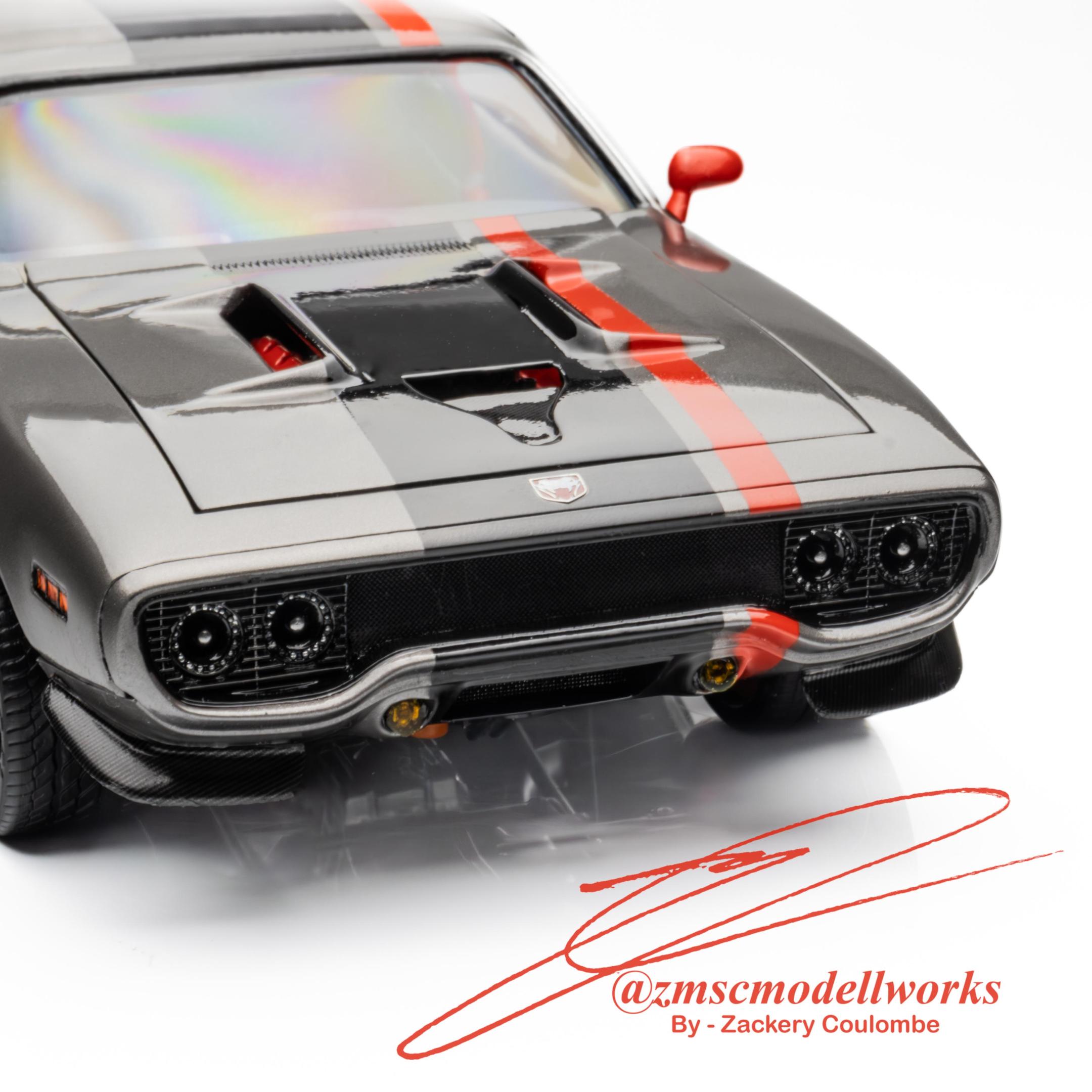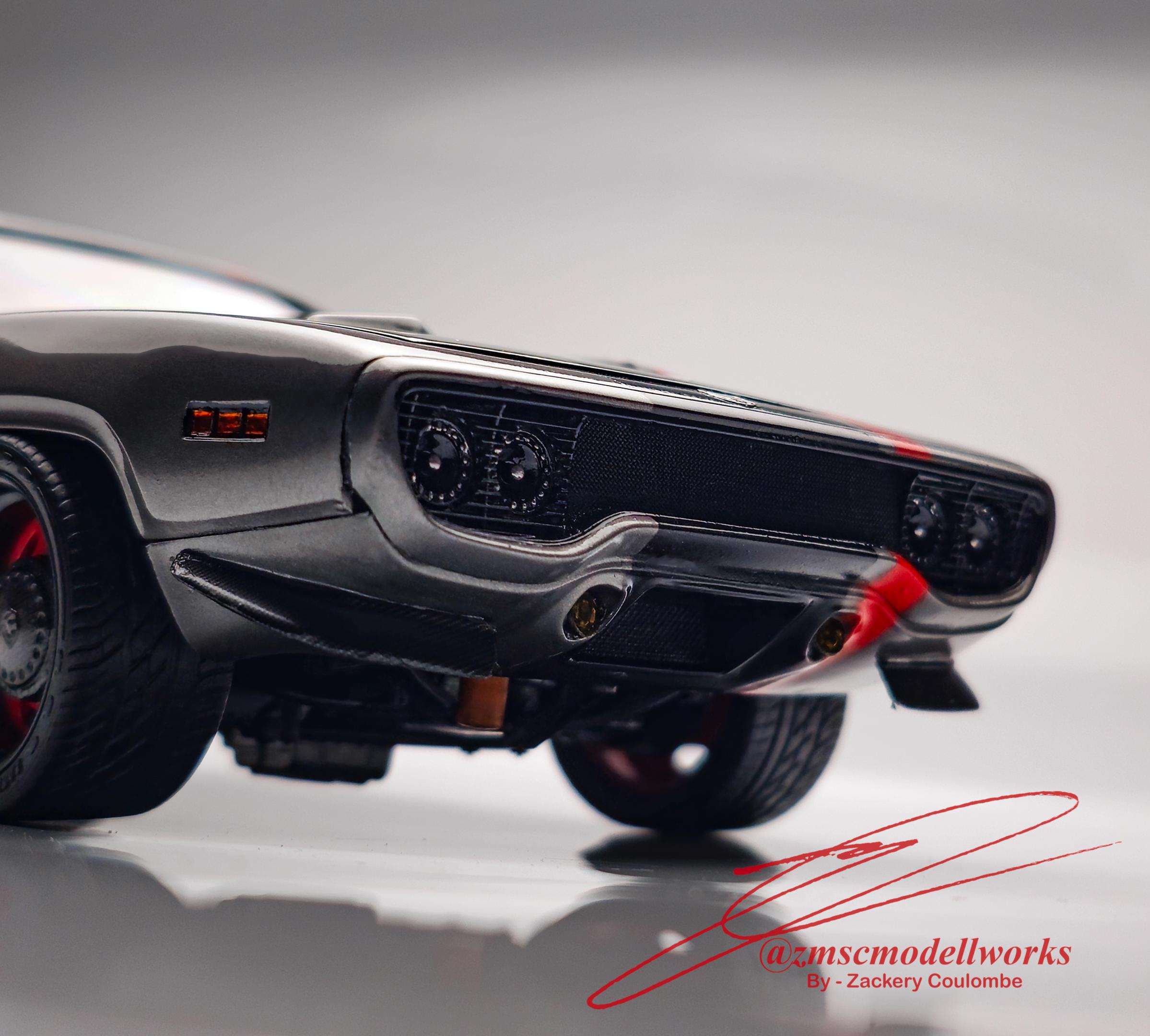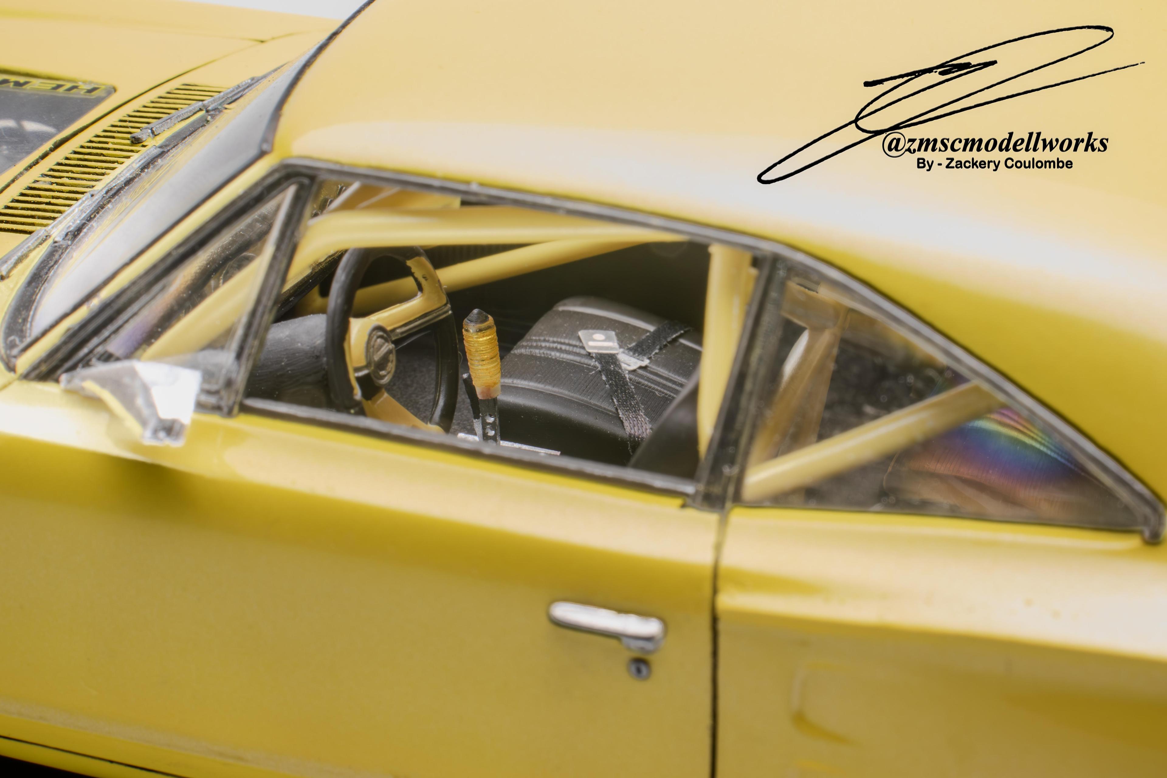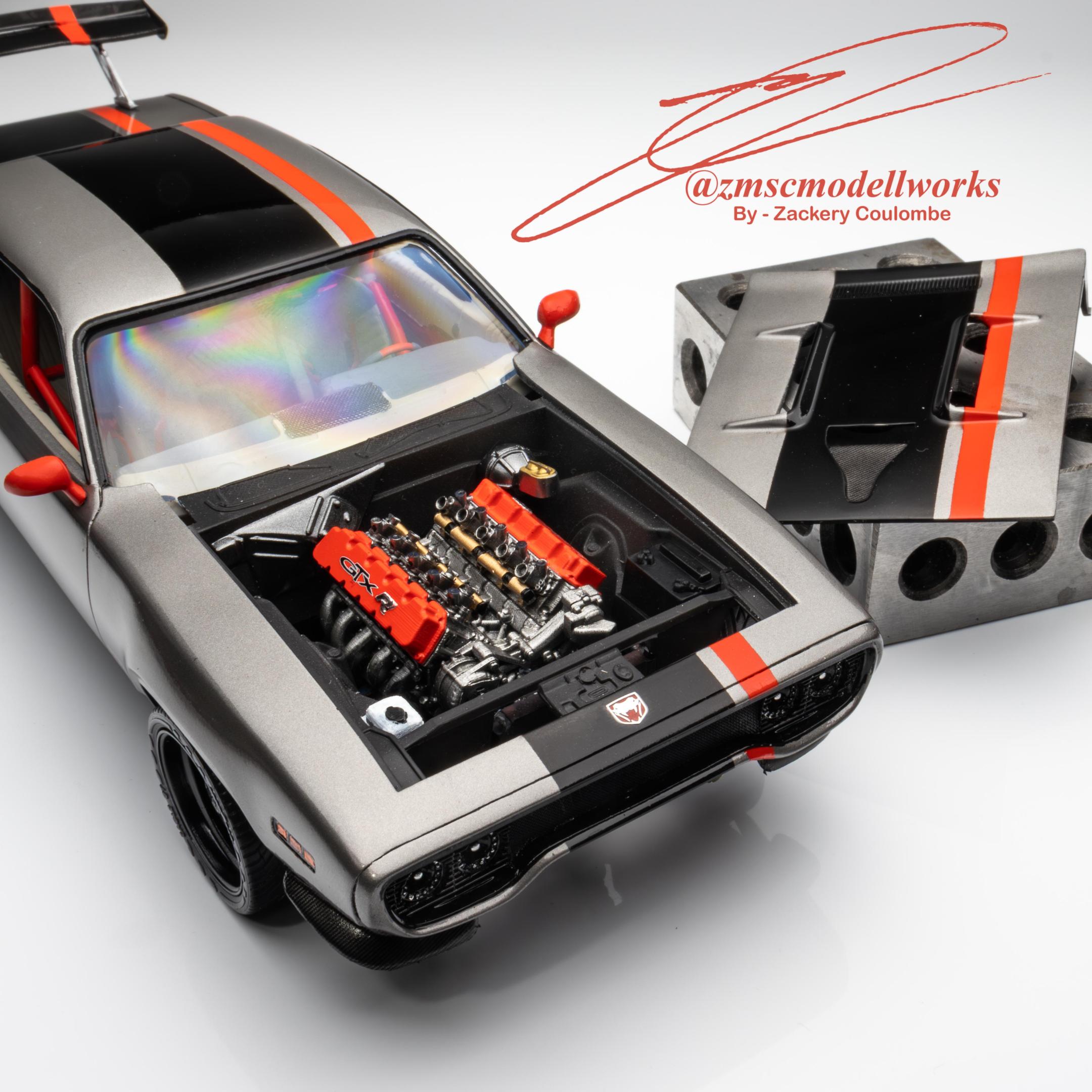 Next on the block of my heavily modified MOPARs is this 1969 Dodge Super Bee Ill start on the exterior and move down and in. First off and most notable is the large tail fin out the back. The profile was shaped off of the Dodge Coronet Super Bee's stripe that runs from the back of the rear quarter up to midway on the door. Besides that I wanted to keep the rest of the body lines yet make those more aggressive. 0.5mm Rod was laid along some of these sharper lines to extend them out from the body, the 2 part autobody filler was put in and sanded to blend everything together. 1x2mm rectangular styrene was used around the wheel arches and got the same treatment. The body was finished off with Splash Paints-Lemon Twist, a factory matched MOPAR color before being given 3 layers of Zero Paints Pearl Effect top coat. Decals were applied and then sealed in with Splash Paints 2K Clear. As I couldn't find any mirror STLs that suited the build, I went diving into the spares box and came across a bunch of parts I didn't use on an old Concept Camaro. These were left chrome to keep with a bit of the factory flair. I did however decide to not rechrome the front and rear bumpers as they sat out too wide from the body and required shortening. These were simply painted Steel from Splash Paints. With the huge wing out back, this prevented the trunk from opening and closing normally. The idea then was to do side opening trunks with a nitrous bottle and fuel cell on each side but erring on the side of not completing the build from being too complex, I opted to just re-scribe the panel lines to show two halves. The exhaust was initially going to run down the side of the rocker panels but mocking it up I felt like it was going to add too much visual weight si I ran the 3in exhaust all the way to the back like normal but entering the trunk spack from the back of the wheel arches. This was then "run" through to the outermost taillight housings and exits through there. The front grille was opened up to give some space in the nose for the radiator and supercharger heat exchanger while the headlight buckets themselves were removed and replaced with rounded lead wire to represent HALO lights. More airflow was gained by cutting out sections of the front bumper. Of course I had to add the yellow fog lamps. Originally the plan was going to use the Charger hood scoop from the 2 in 1 '68 kit but then while building my 07 Super Bee and Super Bee Wagons, I noticed that the black HEMI logo looked like a really good shape for a window so I made a template, rotated it 90 degrees and made that the top down window into the engine bay. The extra space up front was measured and cut for air extraction. Some 6.1L HEMI decals were sourced from the newer Revell Charger Super Bee with the scissor doors which was the donor kit to the Charger Super Bee XL. Wheels and Tires I could not remember what they were or where they came from but they were in the spares box and tickled my fancy at the time so they got body colored and blacked out as well, fairly certain that they scale measured at 22x13. The tires were painted with Splash Paints Rubber Black. 3D printed Brembo 6 Pots were body matched and paired to 18" drilled rotors. The front end was caged to make a custom subframe to mount the Hellcrate in. This allowed me to pretty much do whatever I wanted suspension wise on the front so I opted to do double wishbones and coilovers to modernize the ride height. The engine is the Hellcrate design from Motabas on Cults 3D, minus the exhaust manifolds. These were custom made, 4 to 1, equal length headers made scratch from 2.0mm lead wire leading into the dual 3in exhaust out back. With the dropped engine and custom subframe, over and down was required to get proper ground clearance The engine was plumbed, wired and belted to keep a clean look. Had this not been done in 2 months for a group build I probably would have not gone for a "tucked look" and made everything look more or less an OEm styled harness. The tube front end and the cylinder heads were body colored as well. Moving inside, nothing too crazy was done. While the back seat was "retained", its not much good now with the intricate, body matched roll cage installed. The dash was refaced with a flat sheet, riveted in with some custom '70s era NASCAR gauges with chrome bezels. Along with the mirrors and rear diff, the steering wheel + column also came from the Concept Camaro kit. The sequential shifter was a scratch made piece, the grip being made from clear styrene rod and dipped in Tamiya Clear Yellow. I usually keep the longest and thickest pieces in the spares box for instances like this. In keeping with the racecar theme, I made a digital light rev counter. Just a rectangular styrene piece with 0.25mm rod ends glued along and painted with clears gives a good effect on what exactly it may be. A simple set of factory MOPAR buckles finished off the interior. Hope You enjoy this one, let me know if you'd like to see more like this.