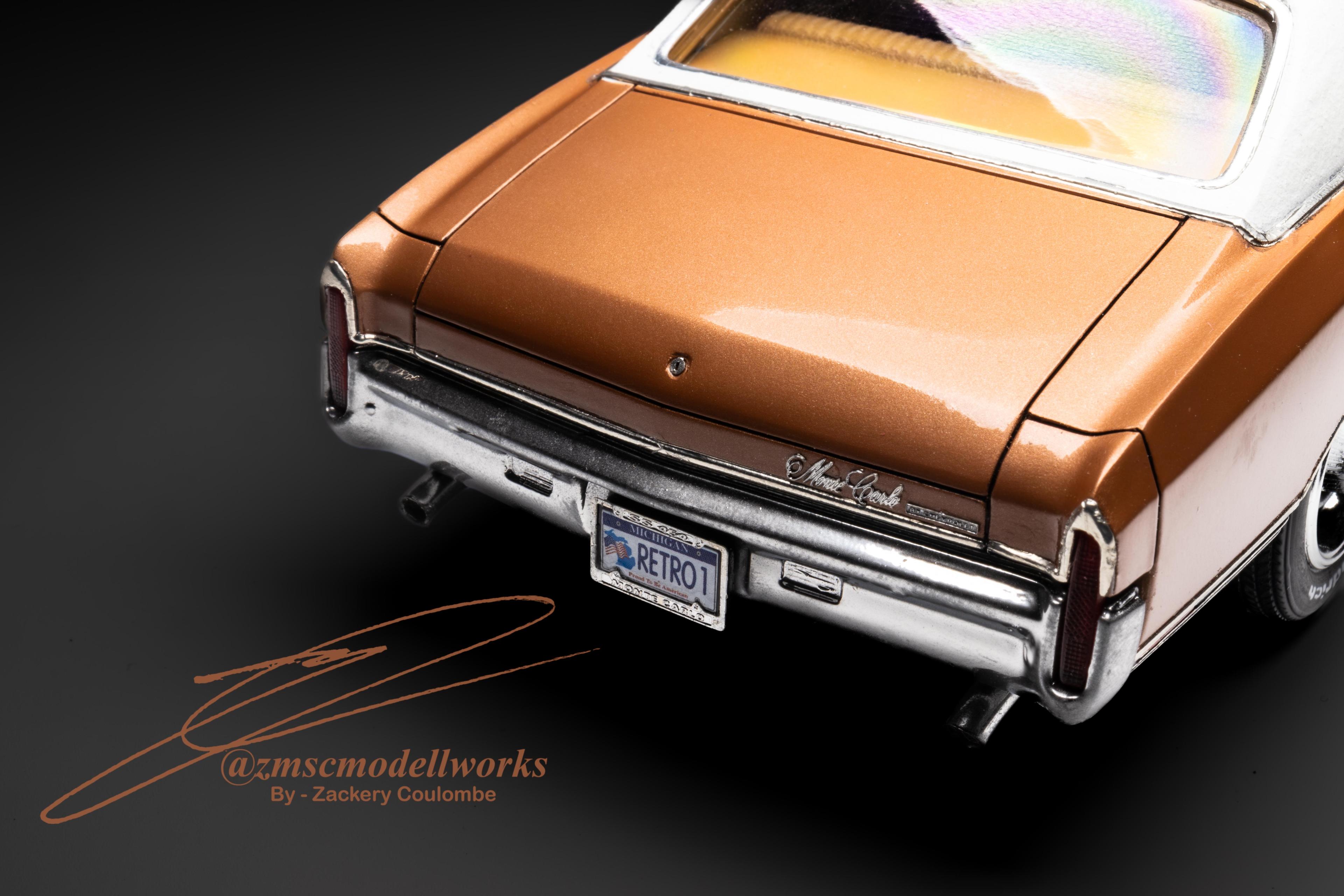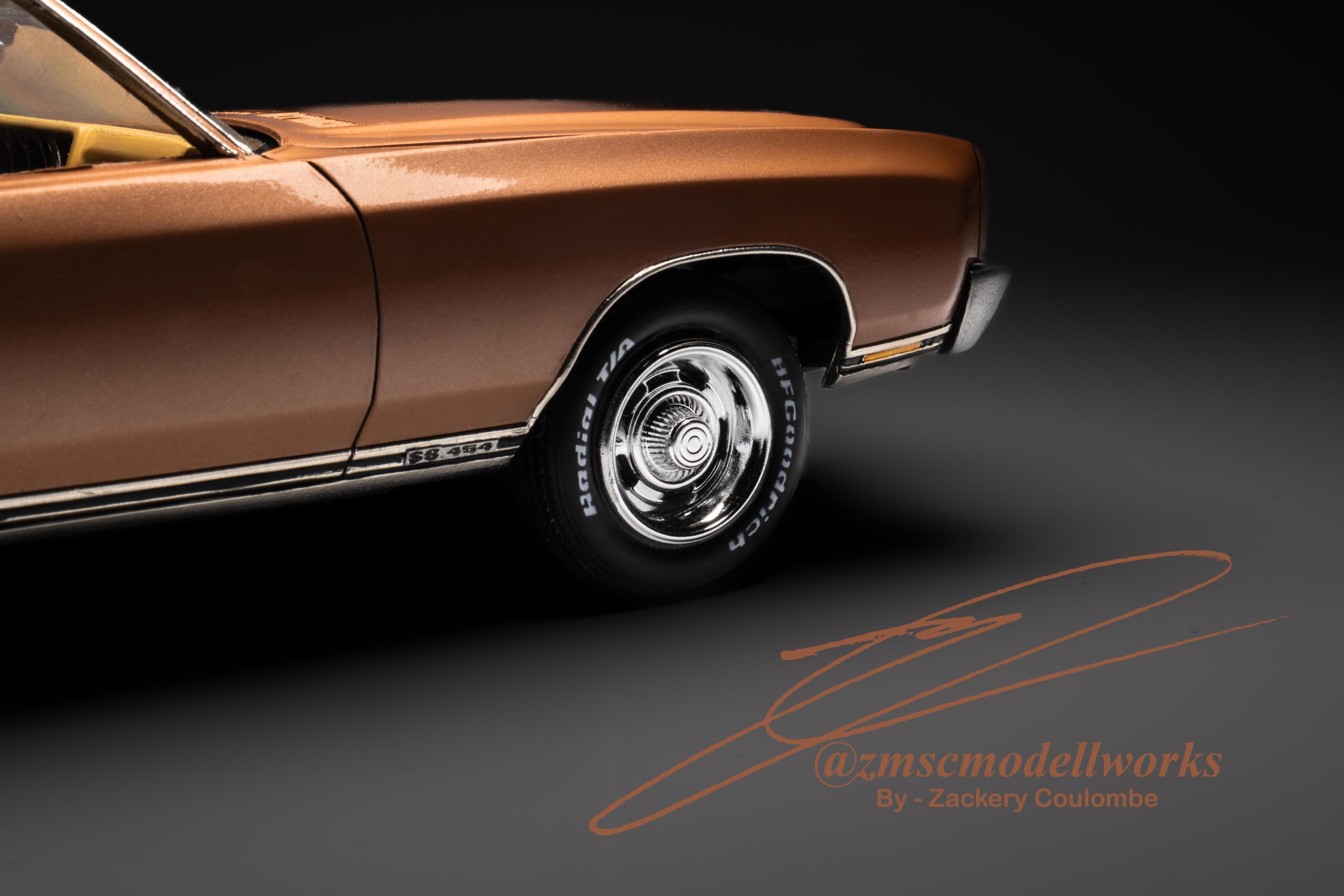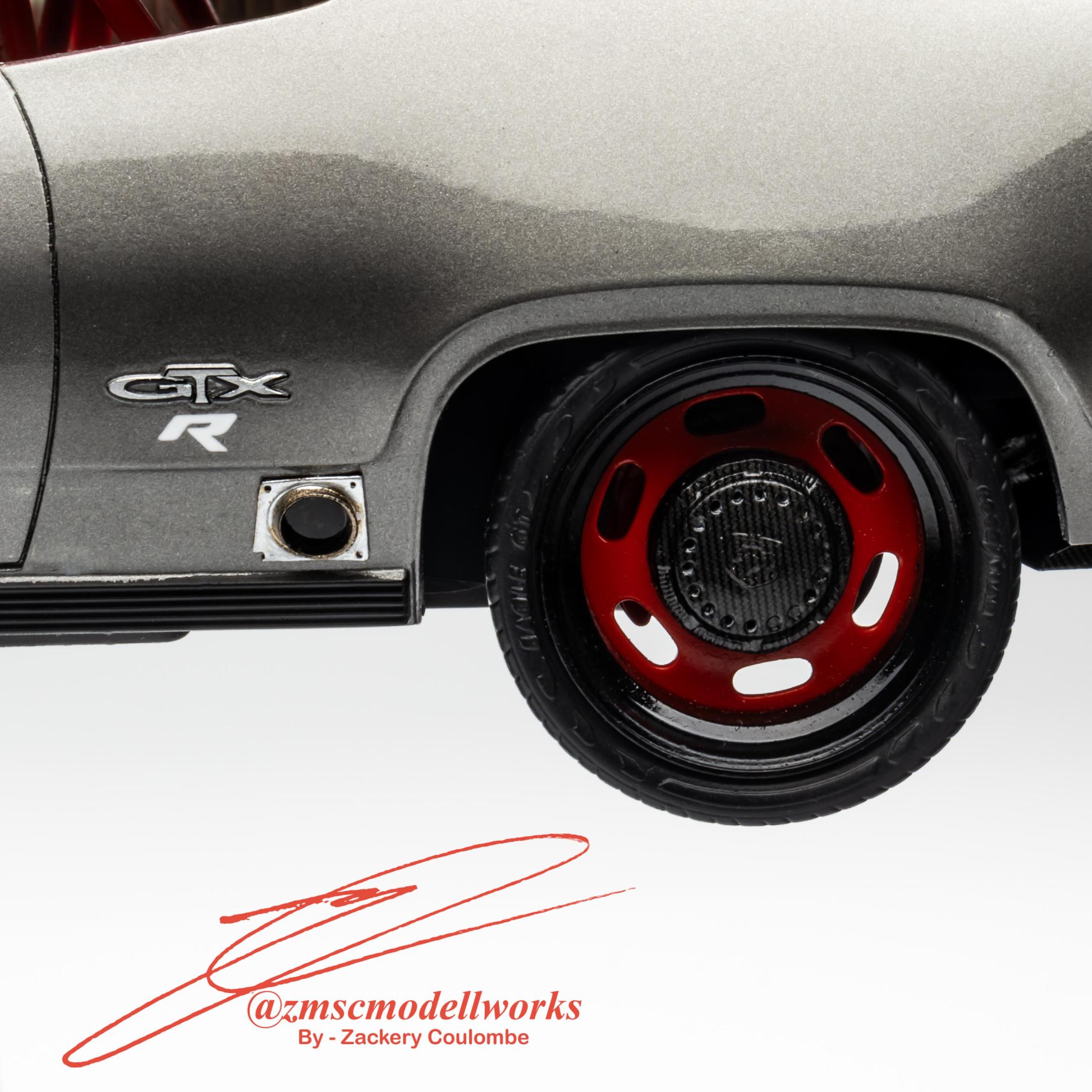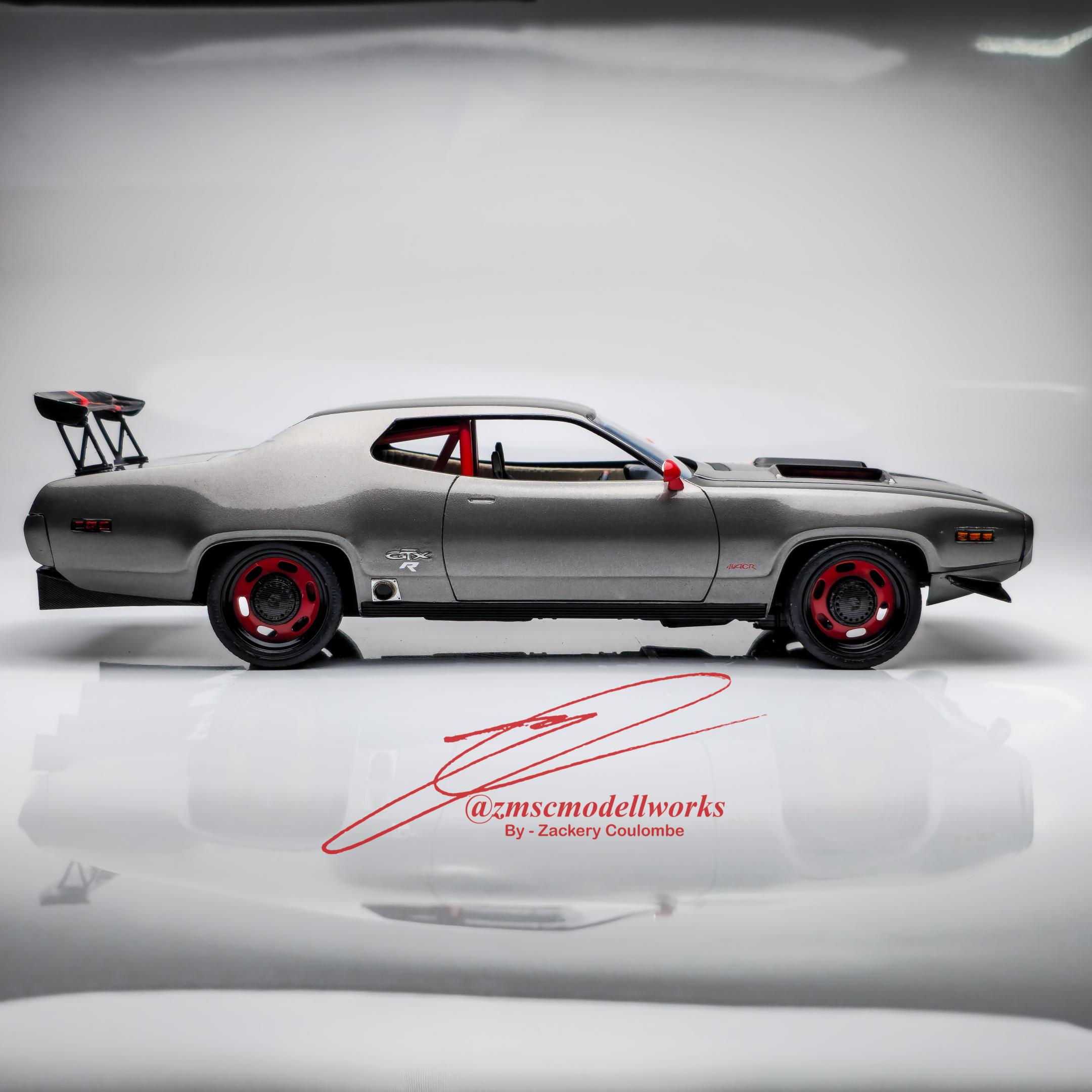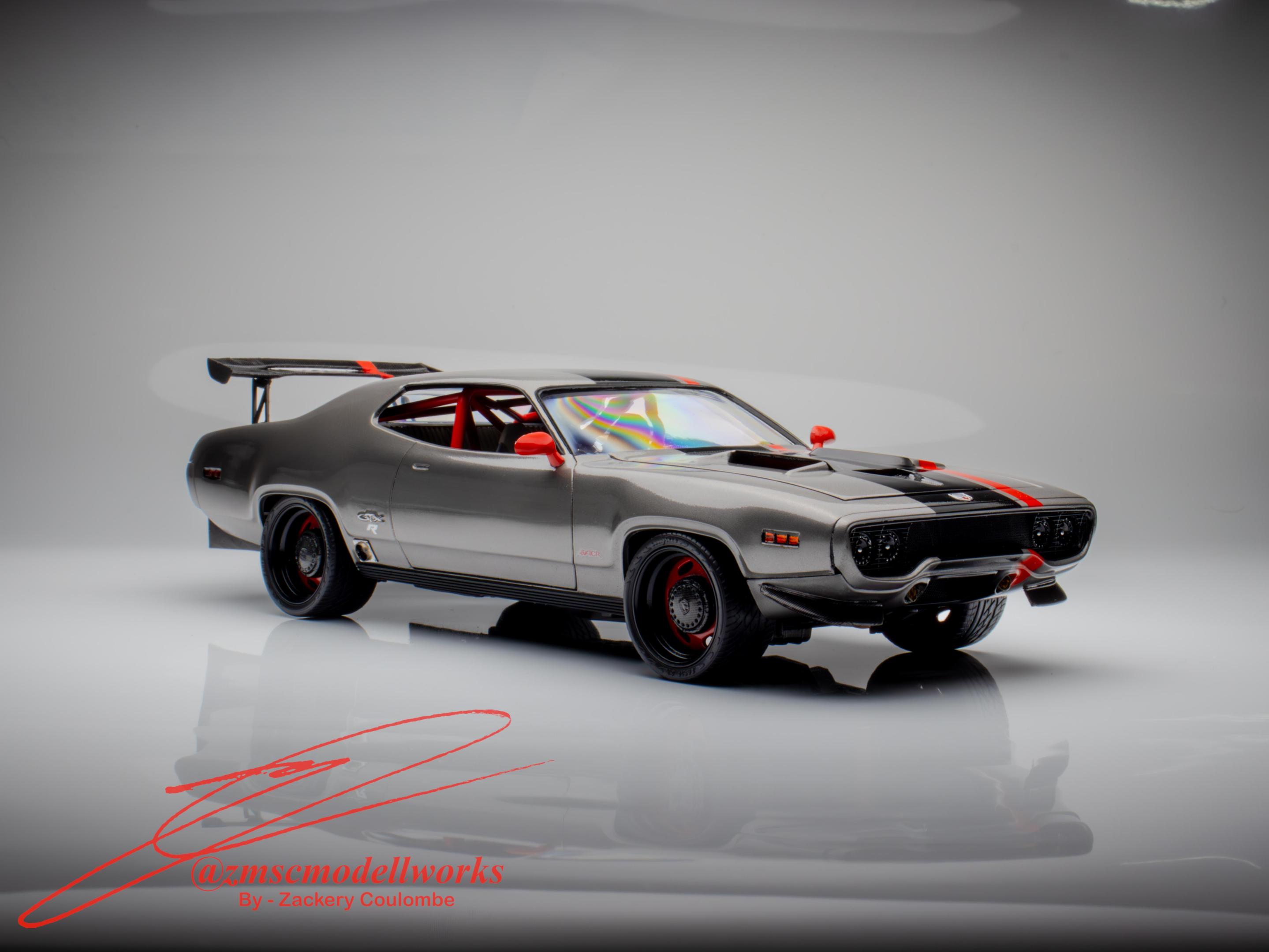 Next on the block of my heavily modified MOPARs is this 1969 Dodge Super Bee Ill start on the exterior and move down and in. First off and most notable is the large tail fin out the back. The profile was shaped off of the Dodge Coronet Super Bee's stripe that runs from the back of the rear quarter up to midway on the door. Besides that I wanted to keep the rest of the body lines yet make those more aggressive. 0.5mm Rod was laid along some of these sharper lines to extend them out from the body, the 2 part autobody filler was put in and sanded to blend everything together. 1x2mm rectangular styrene was used around the wheel arches and got the same treatment. The body was finished off with Splash Paints-Lemon Twist, a factory matched MOPAR color before being given 3 layers of Zero Paints Pearl Effect top coat. Decals were applied and then sealed in with Splash Paints 2K Clear. As I couldn't find any mirror STLs that suited the build, I went diving into the spares box and came across a bunch of parts I didn't use on an old Concept Camaro. These were left chrome to keep with a bit of the factory flair. I did however decide to not rechrome the front and rear bumpers as they sat out too wide from the body and required shortening. These were simply painted Steel from Splash Paints. With the huge wing out back, this prevented the trunk from opening and closing normally. The idea then was to do side opening trunks with a nitrous bottle and fuel cell on each side but erring on the side of not completing the build from being too complex, I opted to just re-scribe the panel lines to show two halves. The exhaust was initially going to run down the side of the rocker panels but mocking it up I felt like it was going to add too much visual weight si I ran the 3in exhaust all the way to the back like normal but entering the trunk spack from the back of the wheel arches. This was then "run" through to the outermost taillight housings and exits through there. The front grille was opened up to give some space in the nose for the radiator and supercharger heat exchanger while the headlight buckets themselves were removed and replaced with rounded lead wire to represent HALO lights. More airflow was gained by cutting out sections of the front bumper. Of course I had to add the yellow fog lamps. Originally the plan was going to use the Charger hood scoop from the 2 in 1 '68 kit but then while building my 07 Super Bee and Super Bee Wagons, I noticed that the black HEMI logo looked like a really good shape for a window so I made a template, rotated it 90 degrees and made that the top down window into the engine bay. The extra space up front was measured and cut for air extraction. Some 6.1L HEMI decals were sourced from the newer Revell Charger Super Bee with the scissor doors which was the donor kit to the Charger Super Bee XL. Wheels and Tires I could not remember what they were or where they came from but they were in the spares box and tickled my fancy at the time so they got body colored and blacked out as well, fairly certain that they scale measured at 22x13. The tires were painted with Splash Paints Rubber Black. 3D printed Brembo 6 Pots were body matched and paired to 18" drilled rotors. The front end was caged to make a custom subframe to mount the Hellcrate in. This allowed me to pretty much do whatever I wanted suspension wise on the front so I opted to do double wishbones and coilovers to modernize the ride height. The engine is the Hellcrate design from Motabas on Cults 3D, minus the exhaust manifolds. These were custom made, 4 to 1, equal length headers made scratch from 2.0mm lead wire leading into the dual 3in exhaust out back. With the dropped engine and custom subframe, over and down was required to get proper ground clearance The engine was plumbed, wired and belted to keep a clean look. Had this not been done in 2 months for a group build I probably would have not gone for a "tucked look" and made everything look more or less an OEm styled harness. The tube front end and the cylinder heads were body colored as well. Moving inside, nothing too crazy was done. While the back seat was "retained", its not much good now with the intricate, body matched roll cage installed. The dash was refaced with a flat sheet, riveted in with some custom '70s era NASCAR gauges with chrome bezels. Along with the mirrors and rear diff, the steering wheel + column also came from the Concept Camaro kit. The sequential shifter was a scratch made piece, the grip being made from clear styrene rod and dipped in Tamiya Clear Yellow. I usually keep the longest and thickest pieces in the spares box for instances like this. In keeping with the racecar theme, I made a digital light rev counter. Just a rectangular styrene piece with 0.25mm rod ends glued along and painted with clears gives a good effect on what exactly it may be. A simple set of factory MOPAR buckles finished off the interior. Hope You enjoy this one, let me know if you'd like to see more like this.