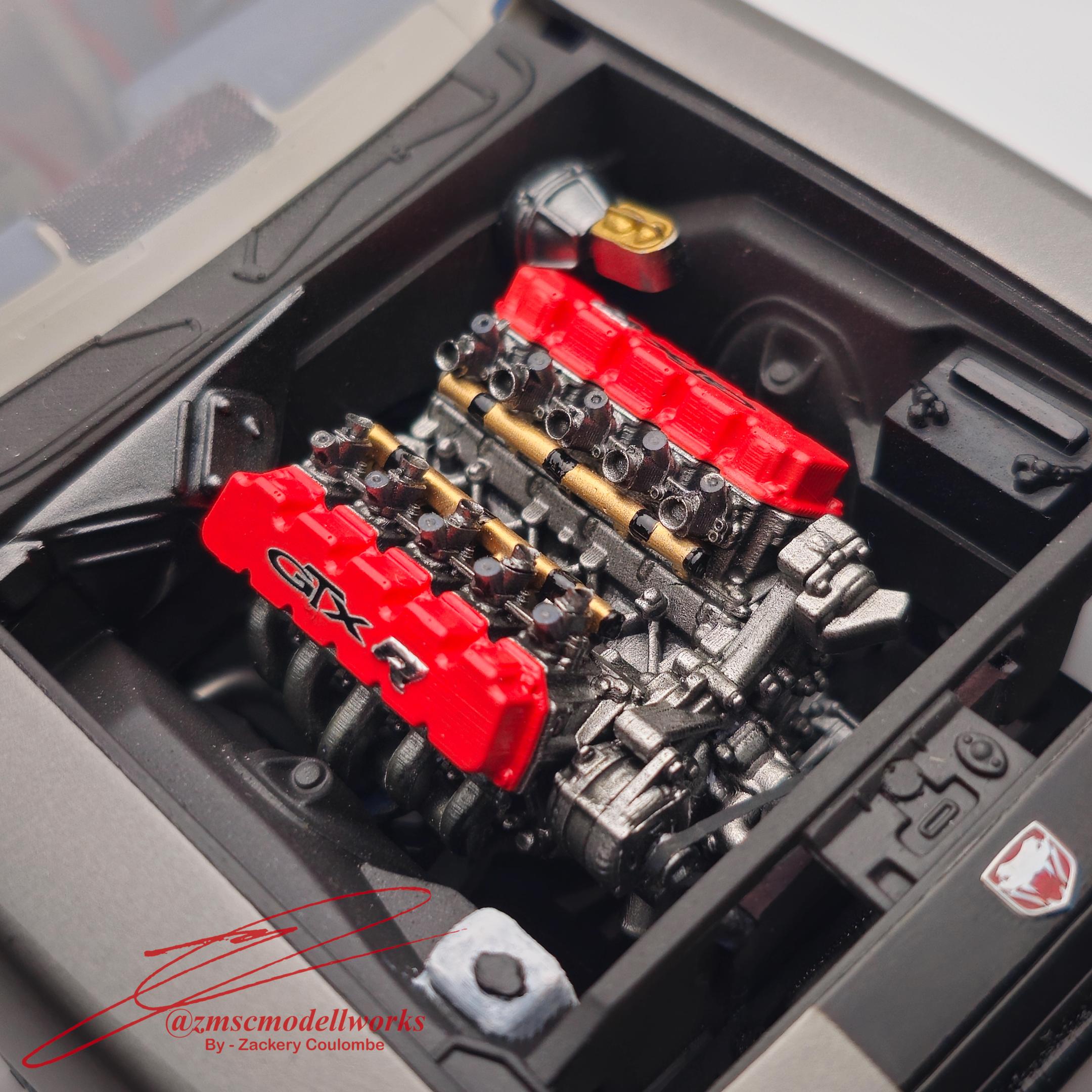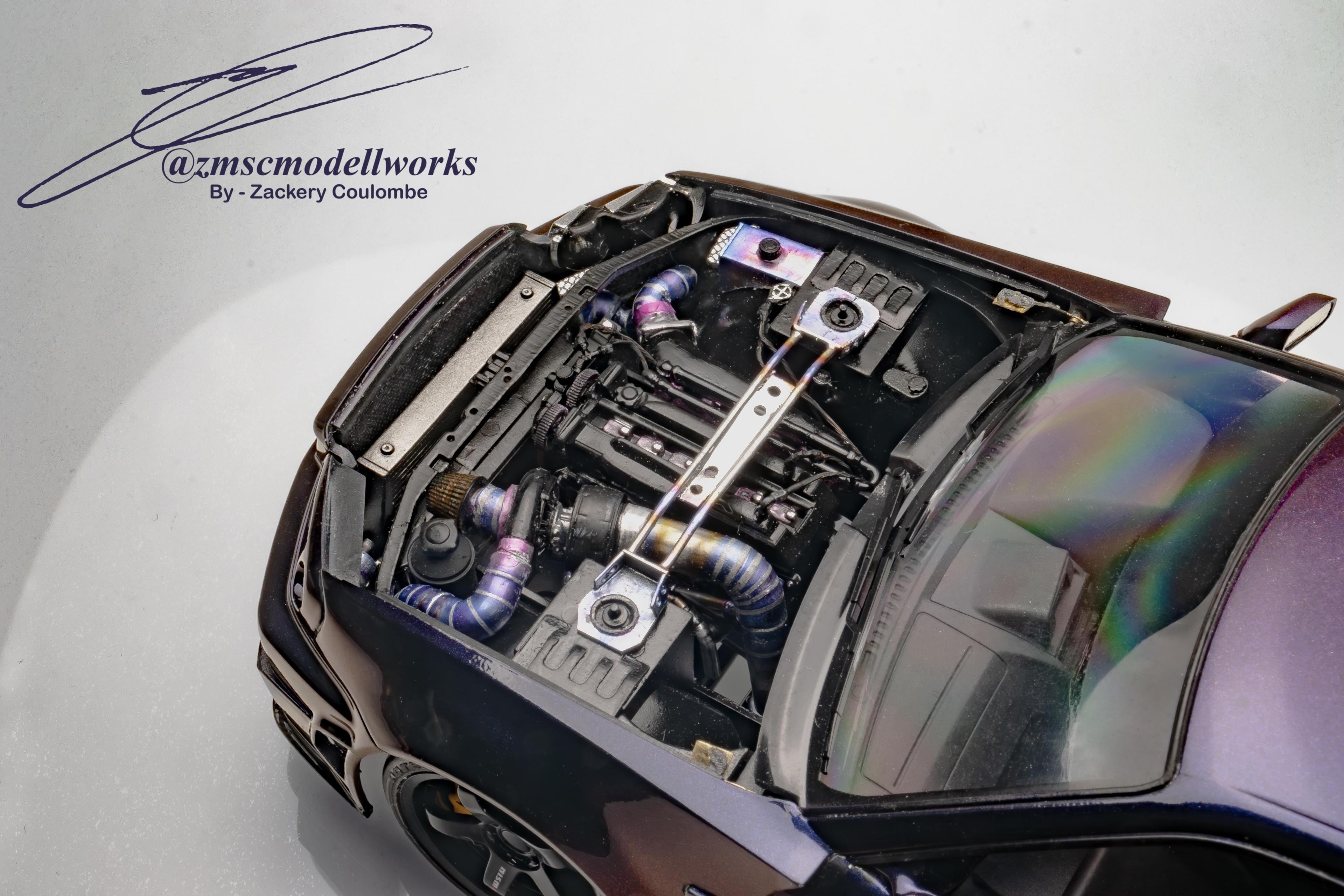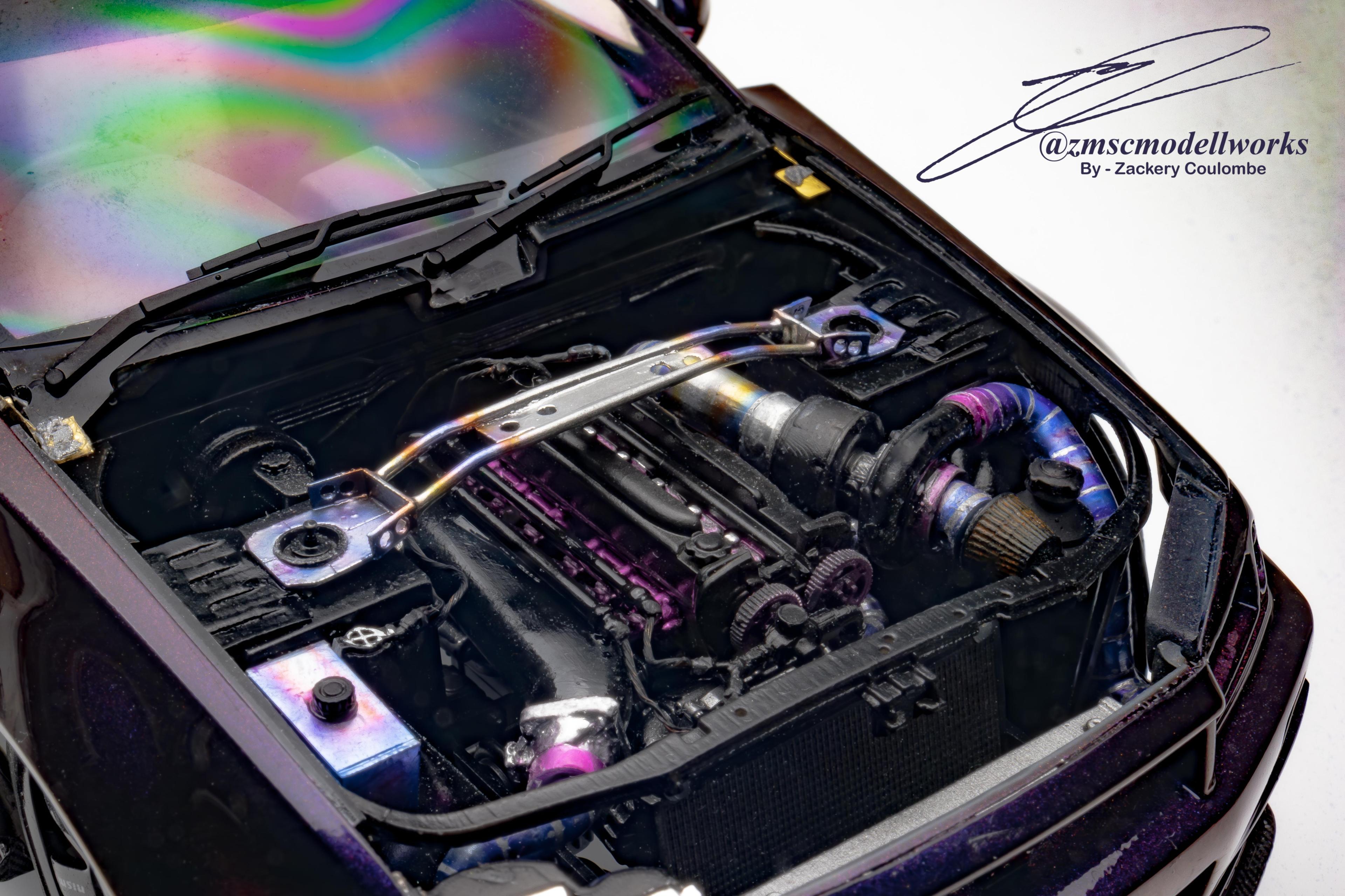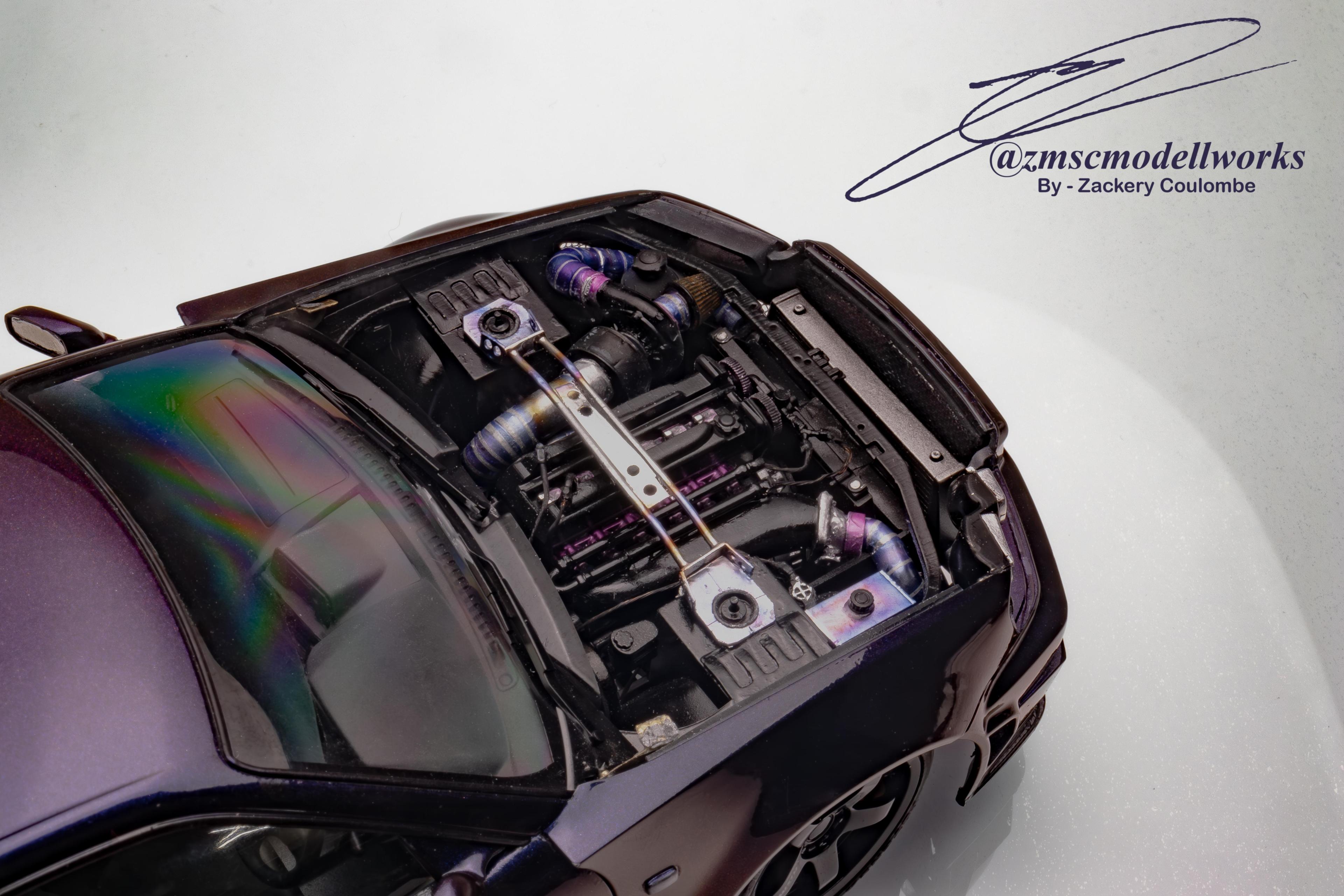Fully 3D printed engine bay and drivetrain. Paint is Splash Paints 2K Primer Black, Midnight Purple 3 and 2K Clear. Scale Motorsports Carbon Fiber - Pewter Twill.