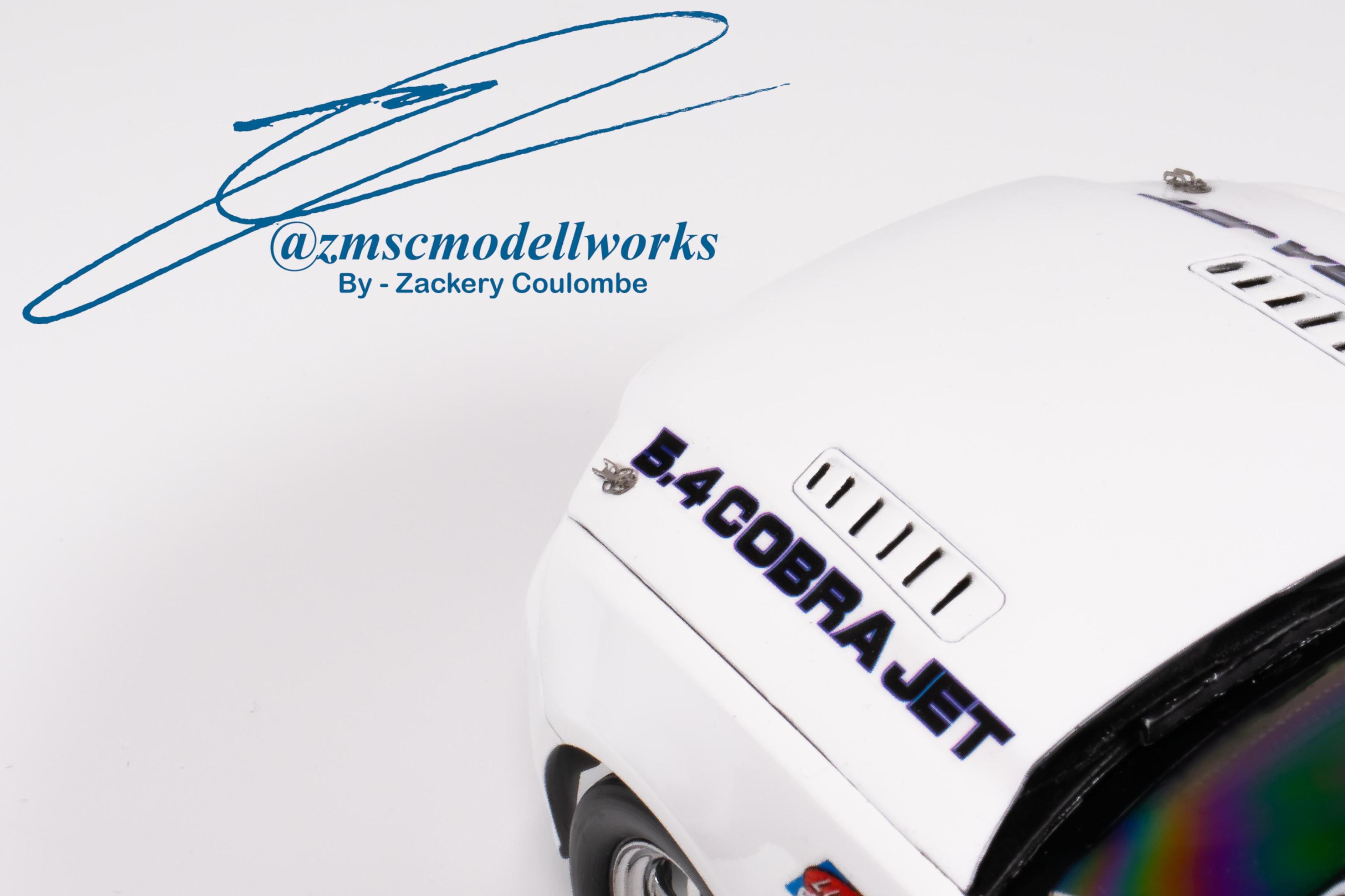 @Maurice Henderson Thank you a tonne for your criticism, and just so that its clear, this is NOT sarcasm. I truly do appreciate when someone with more experience and more knowledge tells me exactly where I went wrong or how I should have done things. This was the first drag car I really build with intent. It was part of a 2 month Racing The Strip buildoff on instagram. Box unopened. The intent was originally to build the CJ but when I opened the box I had no idea the amount of work that was going to be undertaken. I found alot of my references on places like bringatrailer and Mecum and compiled them HERE . Yes the transmission is not correct as it was a compromise between fitment and time. it should have a 3spd Auto but instead is a 5spd stock tranny from the kit. I did manage to find the proper engine/ transmission combos now so when I do the next one it will be 3D printed and accurate. The window markings were a total guess, and I guess were almost right. I believe ( and correct me if I'm wrong because of your knowledge) but the original 3 test mules Ford sent out to test wore XX markings. Again, could be wrong but at least I guessed half right. Thanks again for your feedback, and in the future, do you have any resources to look at for markings and classes? I have a few more factory stock builds in the lineup that I would like to get right next time. PM me with those details when you have a minute because I would love to pick your brain.
