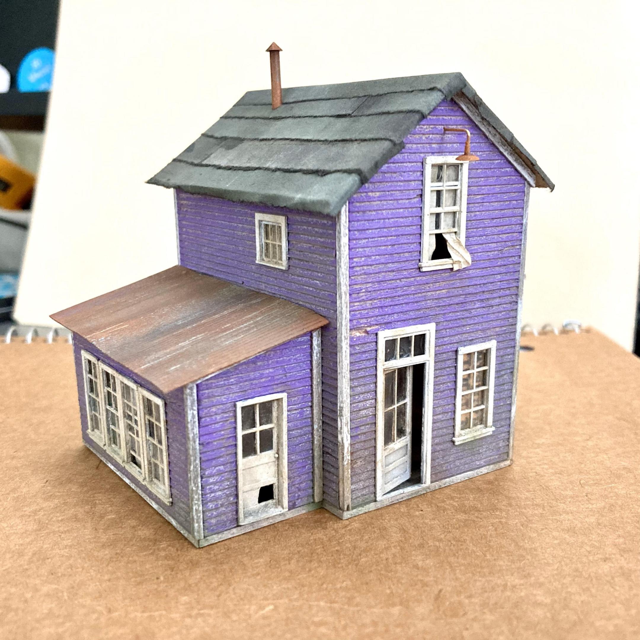 Greetings ... this is a little 1:87 dio I am currently working on, it's The Barberton House. When I'm not building I spend a lot of time sketching old houses, barns, and sheds in little pocket notebooks, this build is based off of one of those sketches. I wish I could find that sketch! I used Northeastern Scale Lumber for the siding, the windows and doors are a combo of Tichy Train and NSL. This will sit on a little foam base surrounded by a few old Rusty Stumps resin clutter piles and some landscaping. The tin roof is also from NSL and the tar paper is art paper. I used a variety of enamel washes and pigments to weather everything. I am also realizing that using my phone has been convenient to take photos the default image format is not so forum friendly.