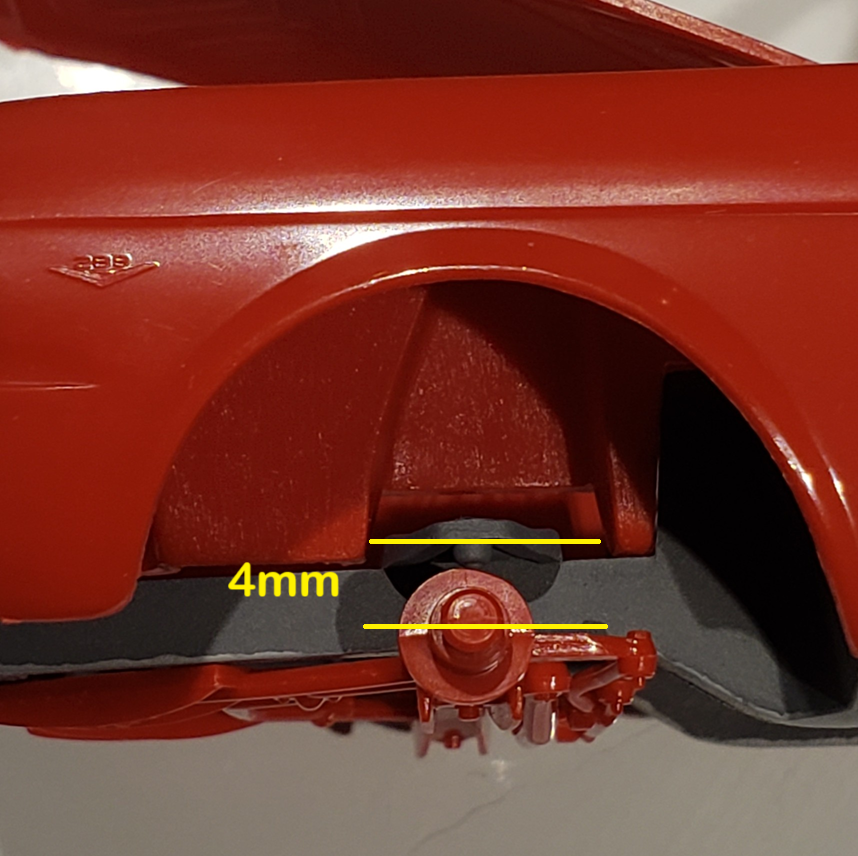 I've got the original Monogram issue of this kit on my bench at the moment. I think it sits a wee bit to high in the front for a stock Mustang, and certainly too high for a proper street machine. The rear seems fine to me for stock, or if you want a bit of forward rake or to fit a taller tire in the back. As Mark said, the front is easily lowered by moving the wheel mounting tab up. Simply cut and glue. With a little extra styrene, you can get almost 4mm of drop this way without touching anything else on the front suspension. It's a pretty big change, so test this first with the wheels/tires you're planning to use to be sure everything clears. The back end is a little more complicated, because of the one piece molded leaf springs and rear axle. There's really not much material to take off the spring shackles. You can try flattening the leafs a little, but you've got very little wiggle room, unless you want the rear mounts to hang off the frame. Maybe you can get a millimeter or two this way, and that might be all you need. Personally, I would remove the rear end from the leafs and drop it by shimming accordingly. The one challenge to this method is keeping everything square, but if you drill some locating holes first and use the chassis as a jig, you can get everything glued back up without too much trouble. -