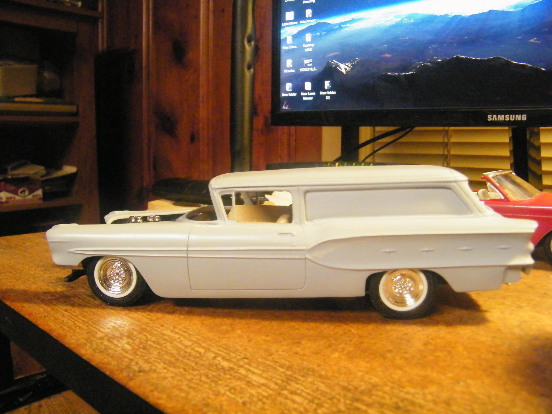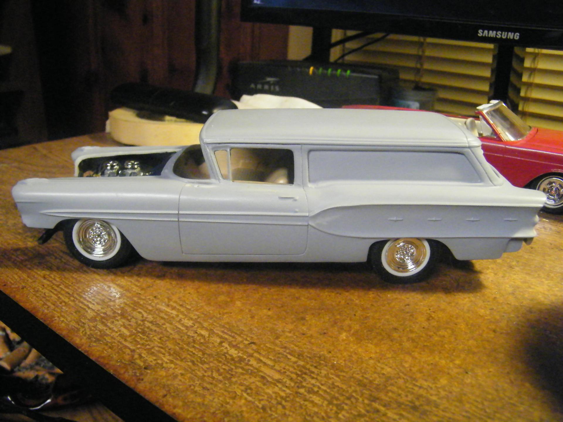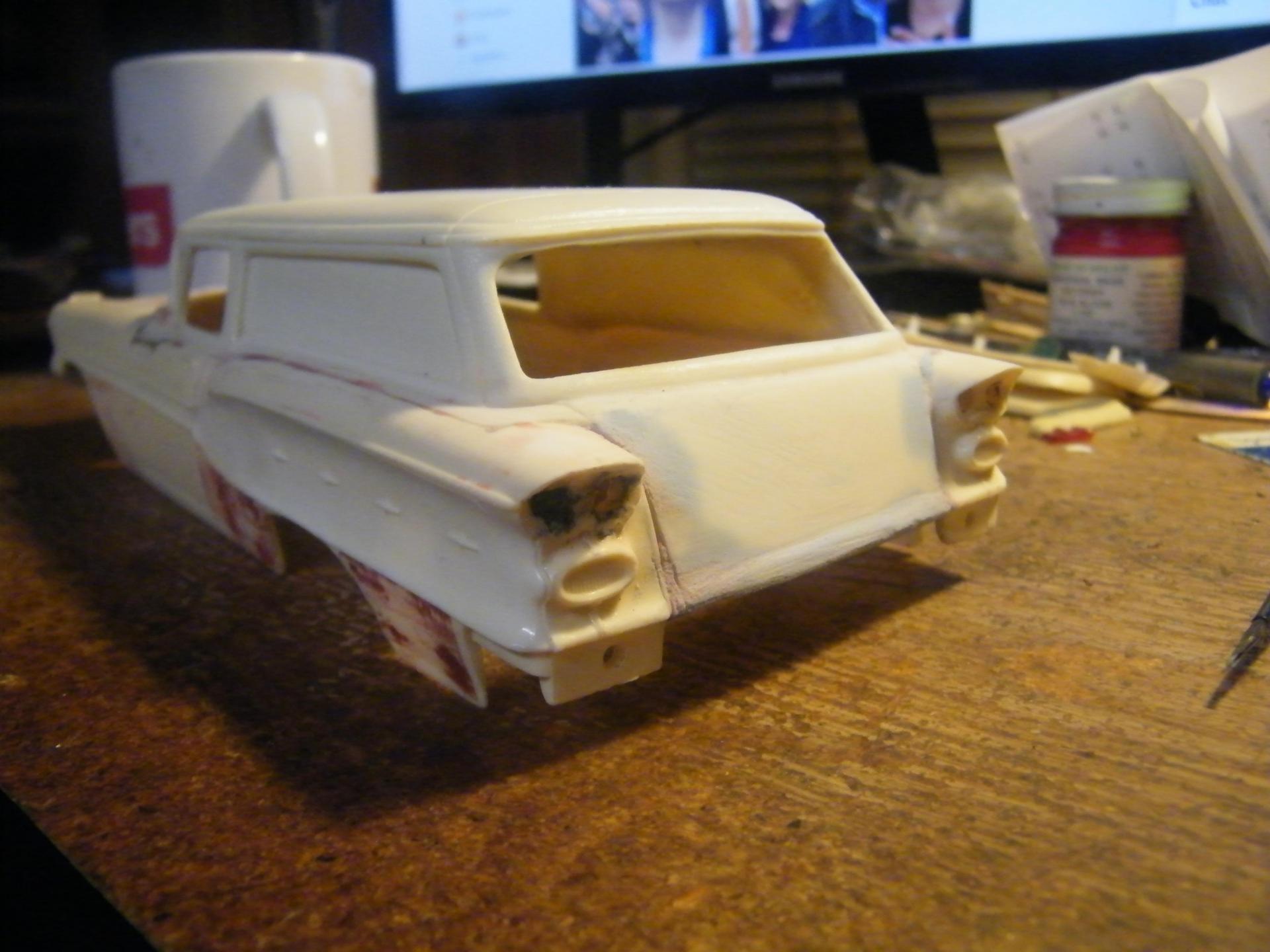 2. The basic body was a 1958 Bonneville convertible and bought a Jimmy Flintstone 1958 Chevy Sedan Delivery for the roof and tailgate section. There was little different in the tailgate area I had to work on and took a bit of time to get it looking halfway right. The rear bumper I removed all the guards and exhaust ports on it. And yes next one goes to a caster who will be casting them