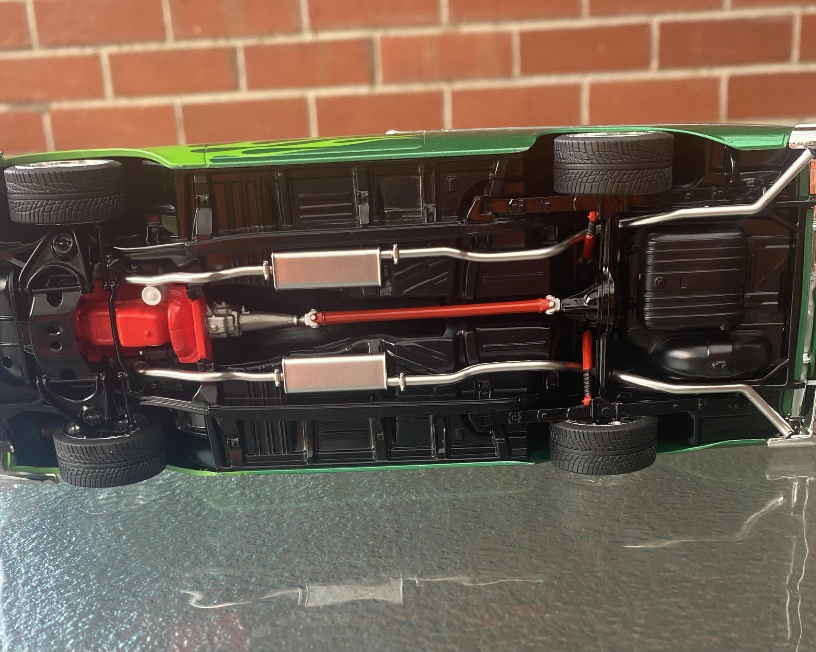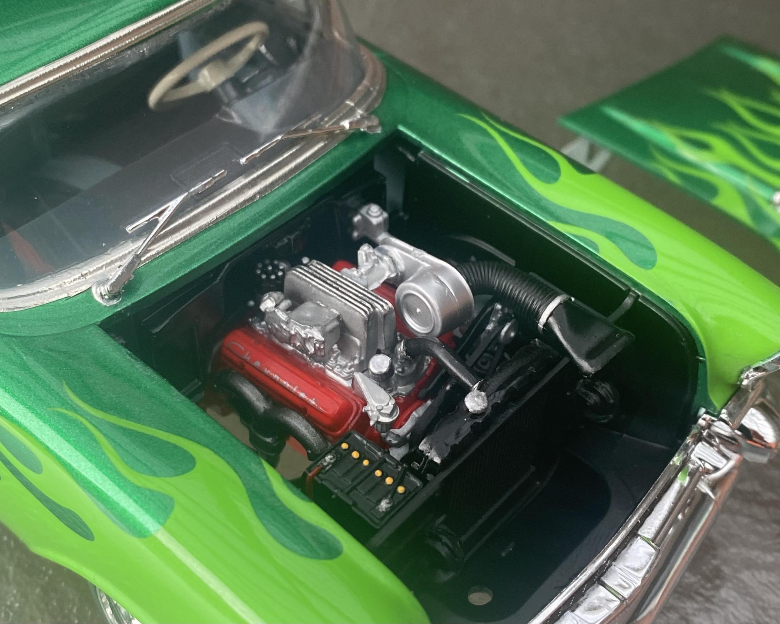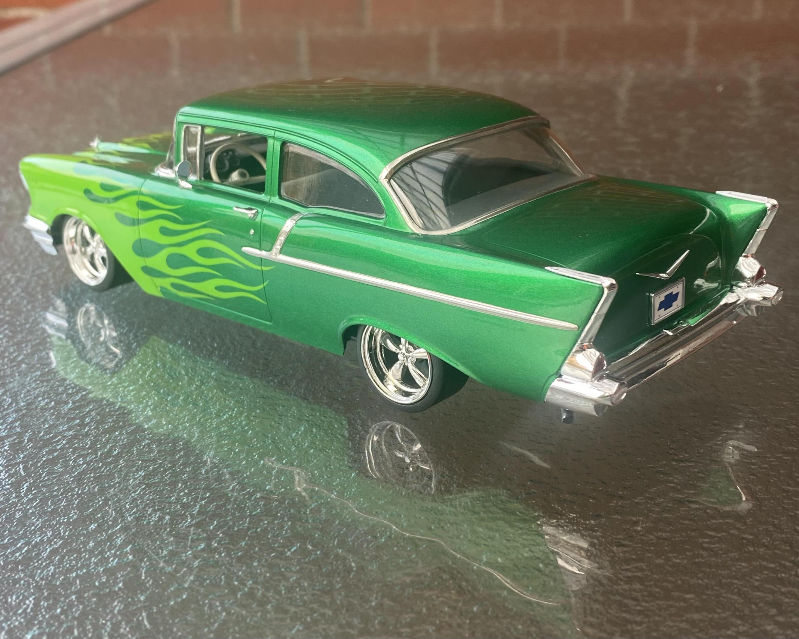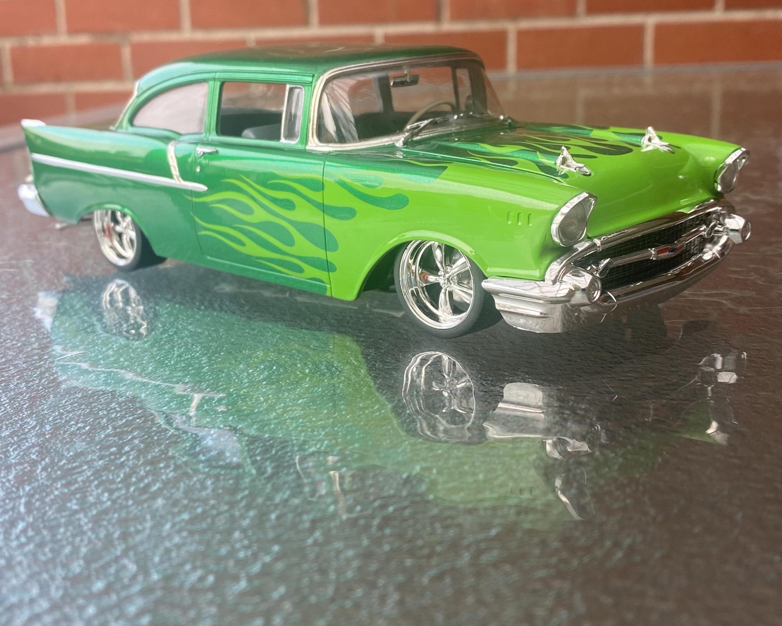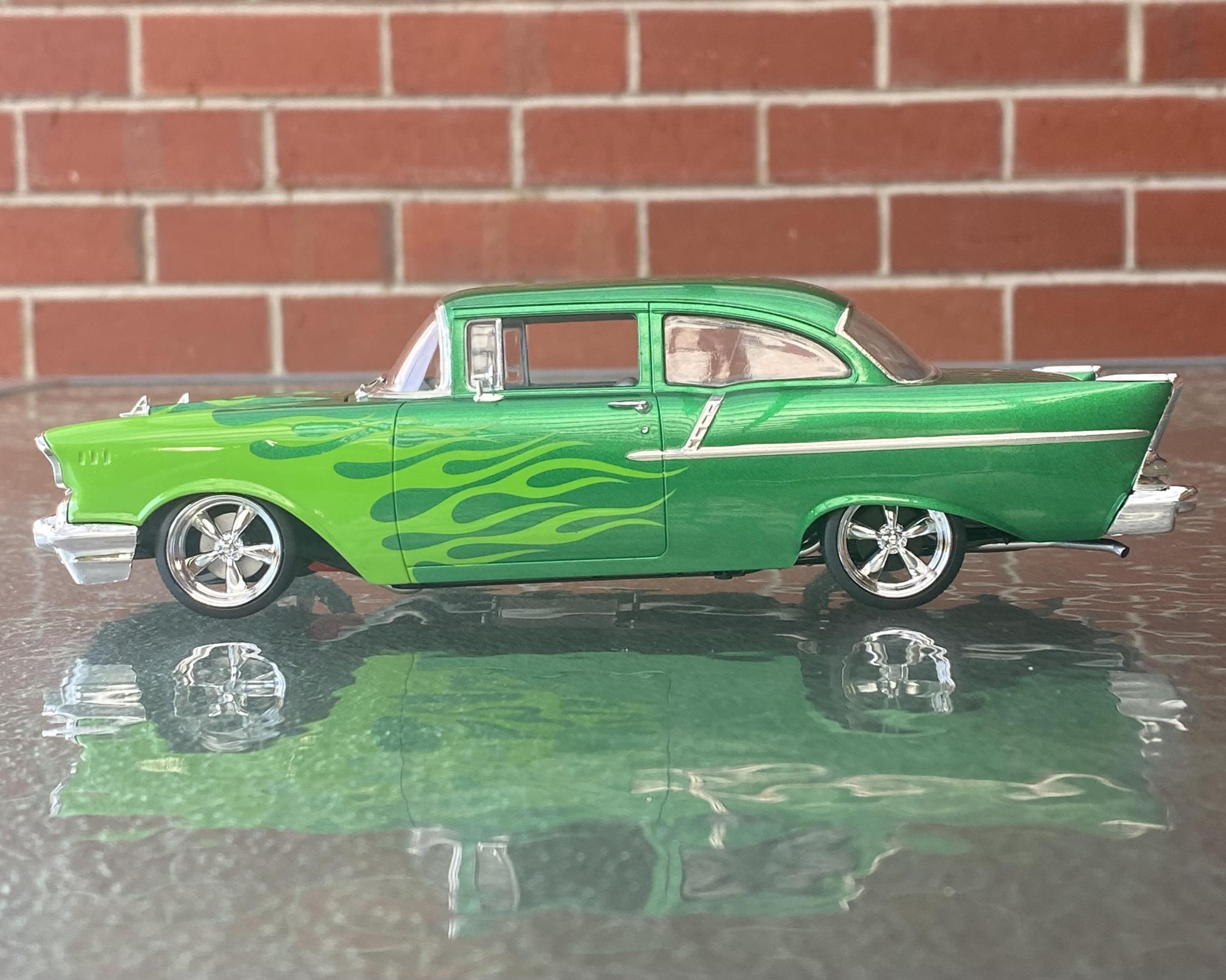 G’day everyone. Just finished this one. Built OOB except for the Pegasus wheels. I modified the kit suspension to get it nice and low, finished it in Tamiya ts-20 with ts-22 flames airbrushed on with the help of a lazy modeller mask and cleared with ts-13. 57 Chevies are one of the few cars l think look good with flames and I’m pretty happy with how it turned out. Thanks for looking and any comments welcome. Cheers, Stuart.