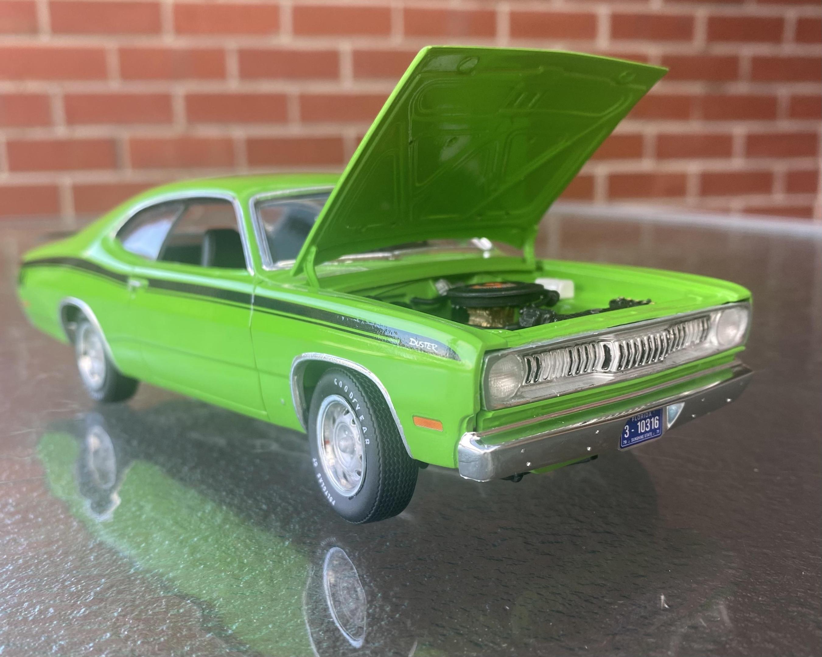 Hi everyone, I built this one recently. I didn’t know much about Dusters apart from the fact the image of one featured on the cover of the album Heartbeat City by 80’s rock group The Cars. After doing some research on the Duster, I discovered that they are a highly sought after muscle car, considered by many to be a potent performer for a small block engine. l found it a great kit to build, the only drama was getting the side stripes straight. I finished it in Tamiya ts-22 as it was close to factory colour Sassy Grass Green. Thanks for looking. Cheers, Stu.