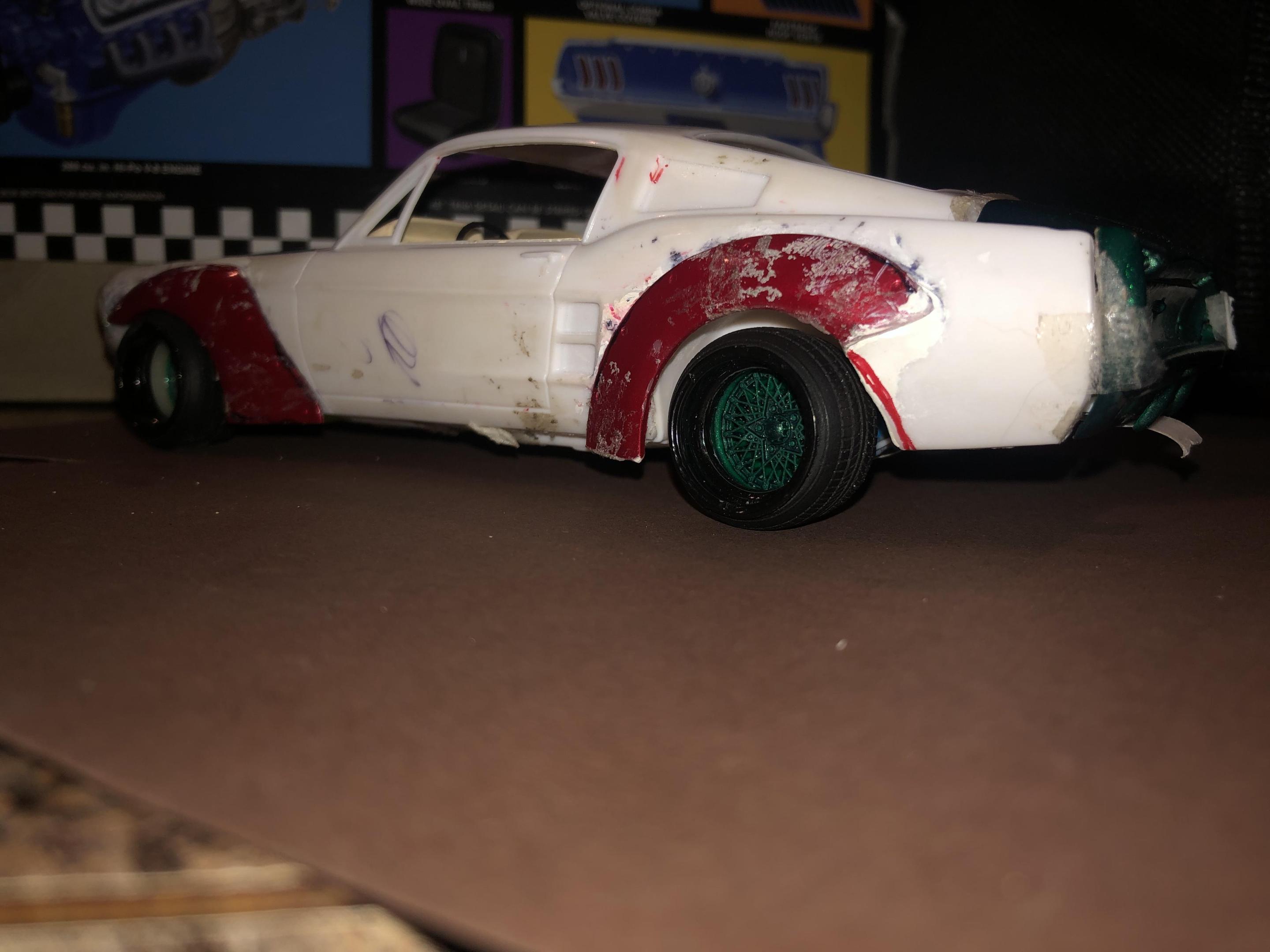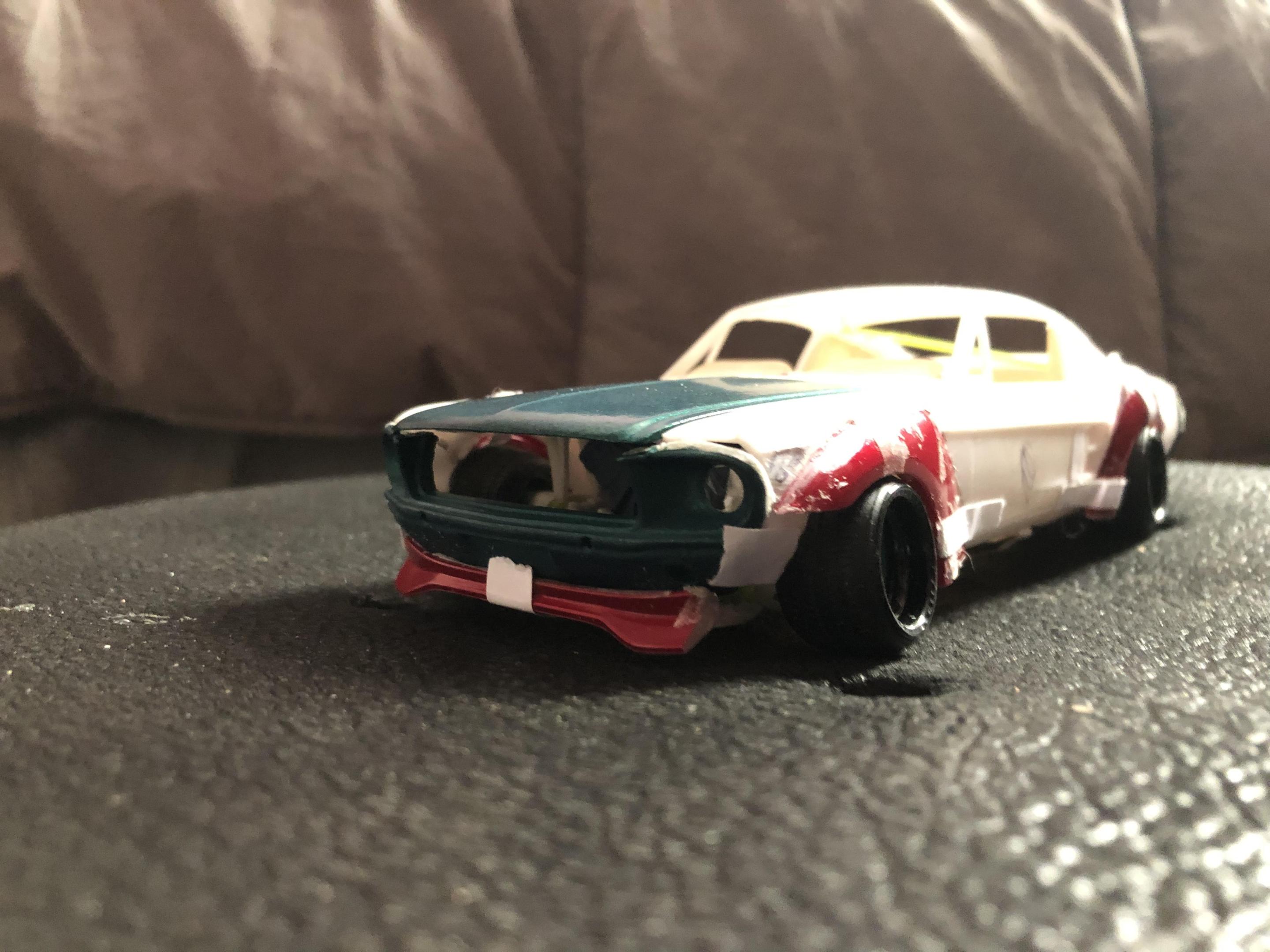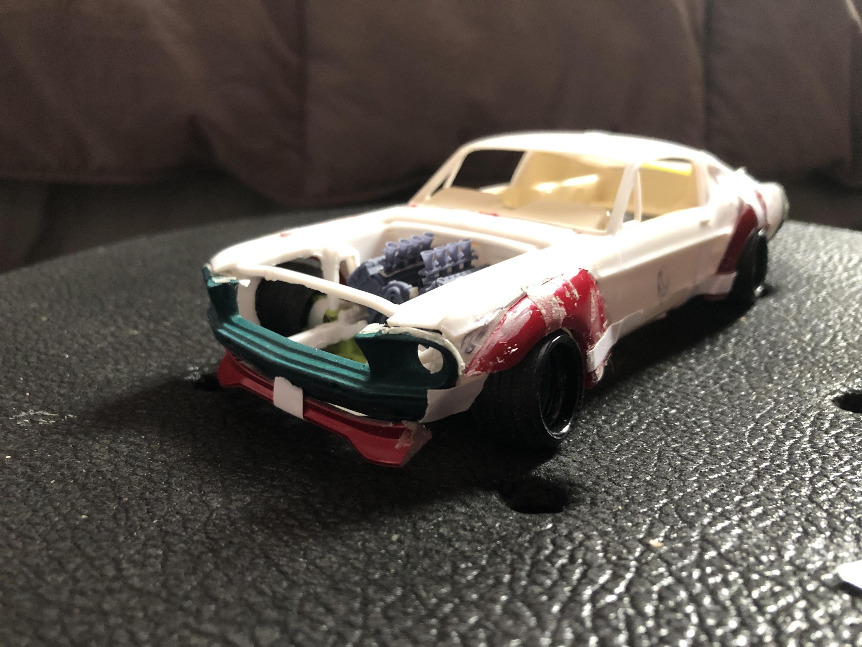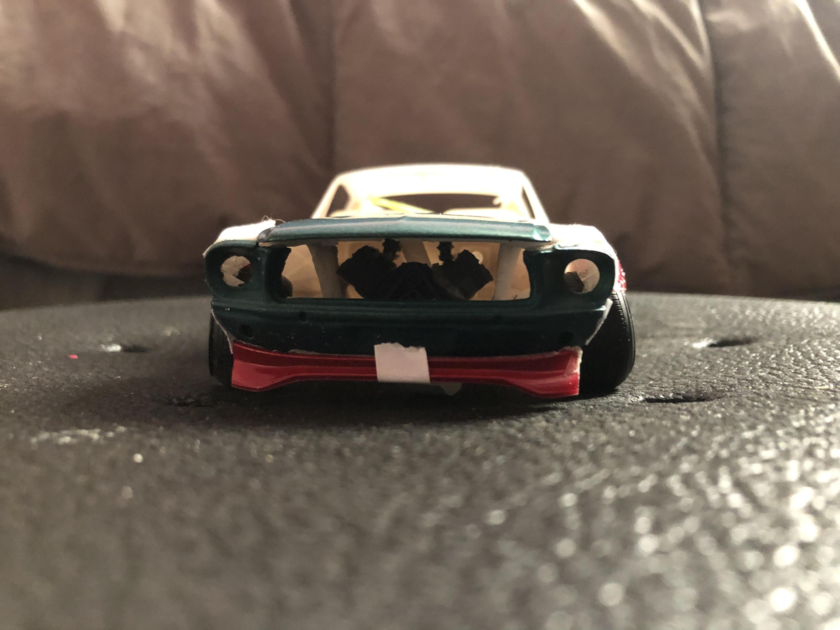 2025 Cannonball Run - 50 years since the 1975 run.JimmyRiggins replied to Mattilacken's topic in Community Builds Some progress has been made on the mustang , unfortunately due to camera related issues I was not able to document some of the progress. I started to build an enclosure for a rear mounted radiator setup (I’m really working to take weight off of the front wheels) with some strong puller fans to keep the car nice and cool! there will be a small remainder of a rear window above the radiator area to retain some rear window visibility, I have an interesting idea on how I’ll use mirrors to my advantage to mitigate blind spots. Where the camera left off is, the exhaust for an f1 car doesn’t lend itself well to a car with fenders. So some surgery was required… mr. Riggins went down to the yard and picked up a set of aftermarket headers from an old rusty super stock dart, (the spacing between cylinders worked out pretty darn close to perfect, the Revell dart kit truly is one of my favourite kits to pick parts from!! (Builds nice too though!)) broke out the welding machine, and grafted those pipes to the exhaust flanges from the f1 headers. Now we have a free flowing set of headers that will clear the steering shaft and flow like a race car should! Pics for proof later 😉