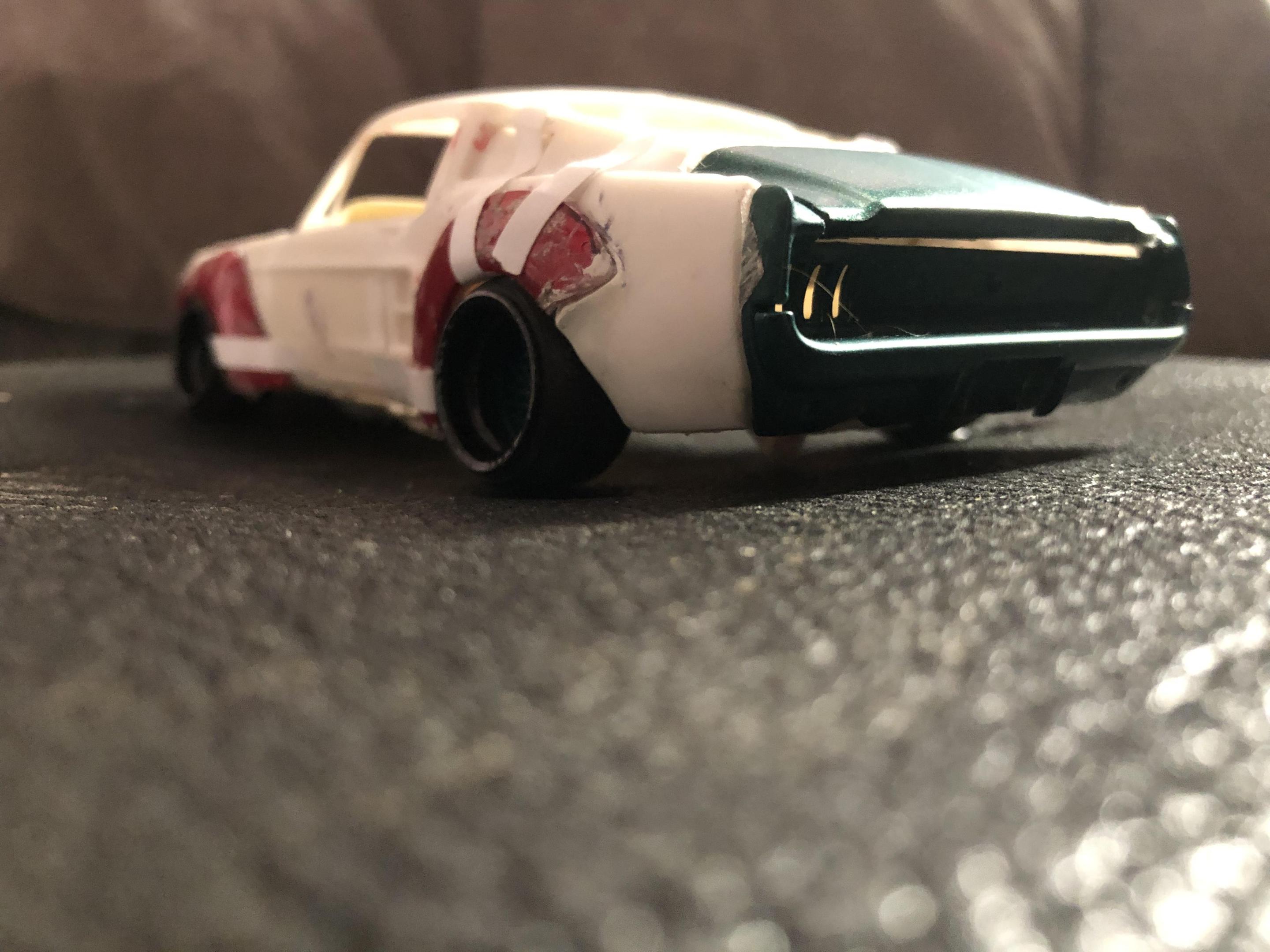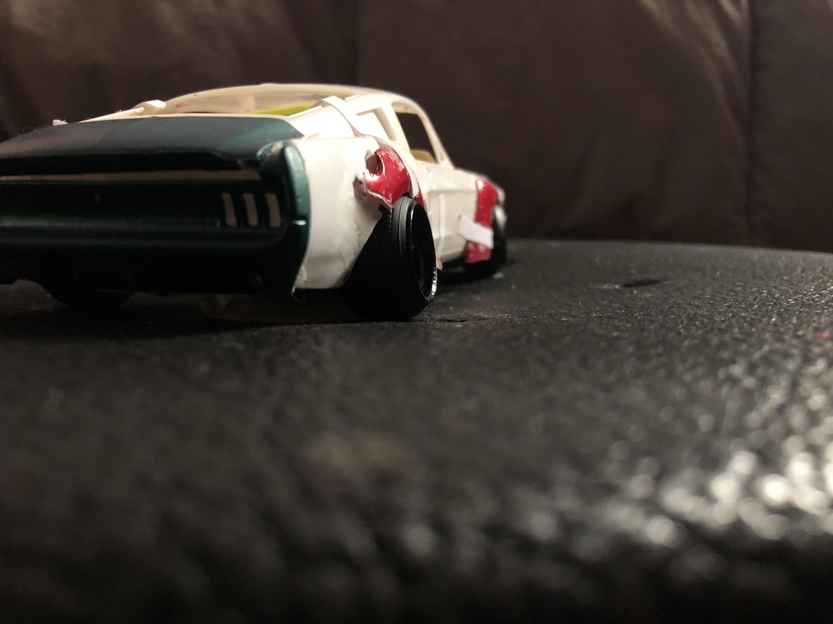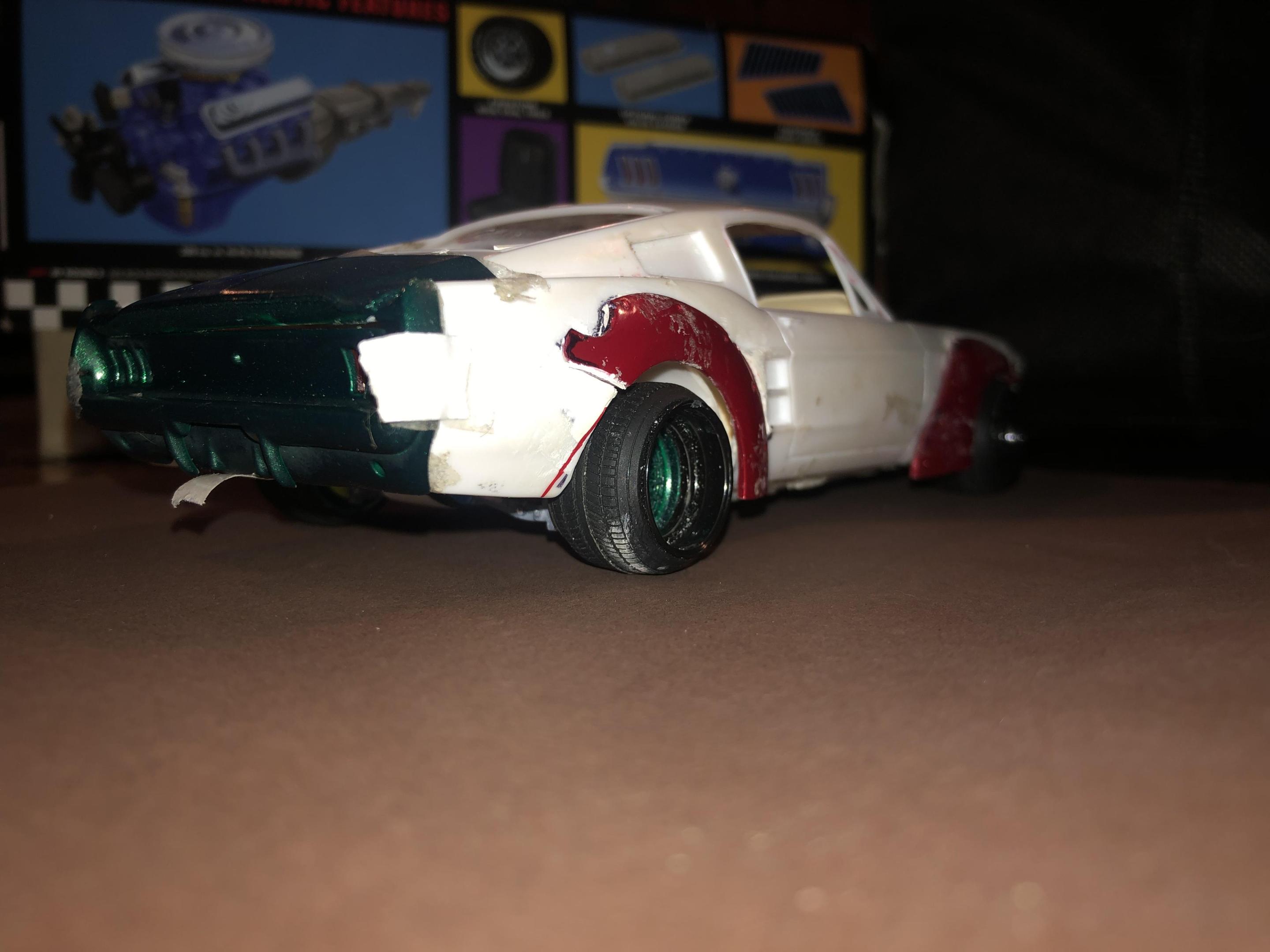 2025 Cannonball Run - 50 years since the 1975 run.JimmyRiggins replied to Mattilacken's topic in Community Builds Some progress has been made on the mustang , unfortunately due to camera related issues I was not able to document some of the progress. I started to build an enclosure for a rear mounted radiator setup (I’m really working to take weight off of the front wheels) with some strong puller fans to keep the car nice and cool! there will be a small remainder of a rear window above the radiator area to retain some rear window visibility, I have an interesting idea on how I’ll use mirrors to my advantage to mitigate blind spots. Where the camera left off is, the exhaust for an f1 car doesn’t lend itself well to a car with fenders. So some surgery was required… mr. Riggins went down to the yard and picked up a set of aftermarket headers from an old rusty super stock dart, (the spacing between cylinders worked out pretty darn close to perfect, the Revell dart kit truly is one of my favourite kits to pick parts from!! (Builds nice too though!)) broke out the welding machine, and grafted those pipes to the exhaust flanges from the f1 headers. Now we have a free flowing set of headers that will clear the steering shaft and flow like a race car should! Pics for proof later 😉
