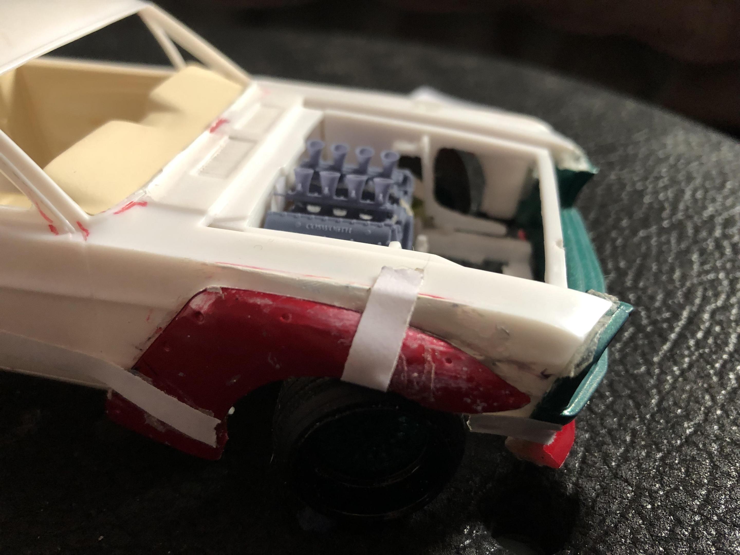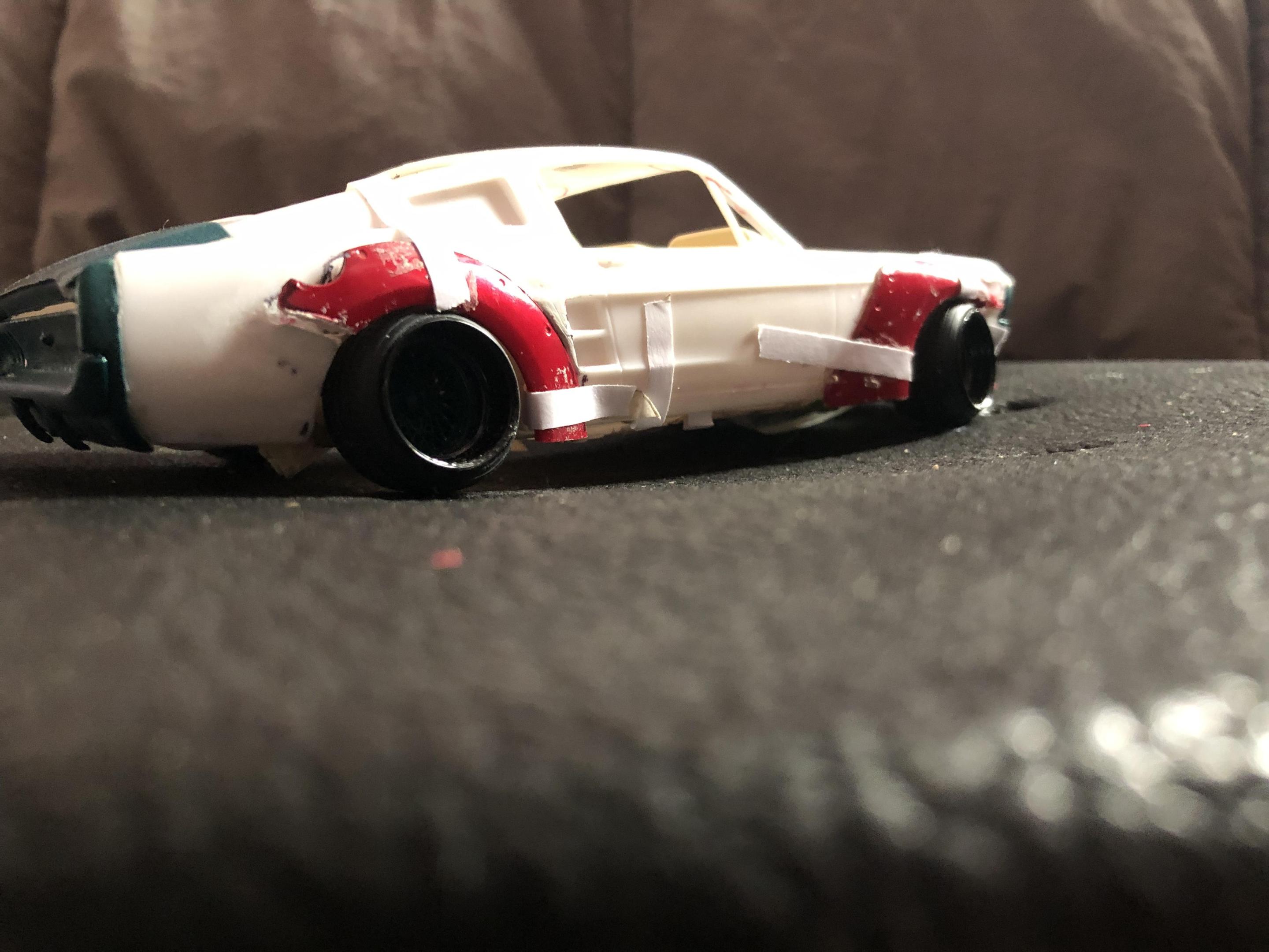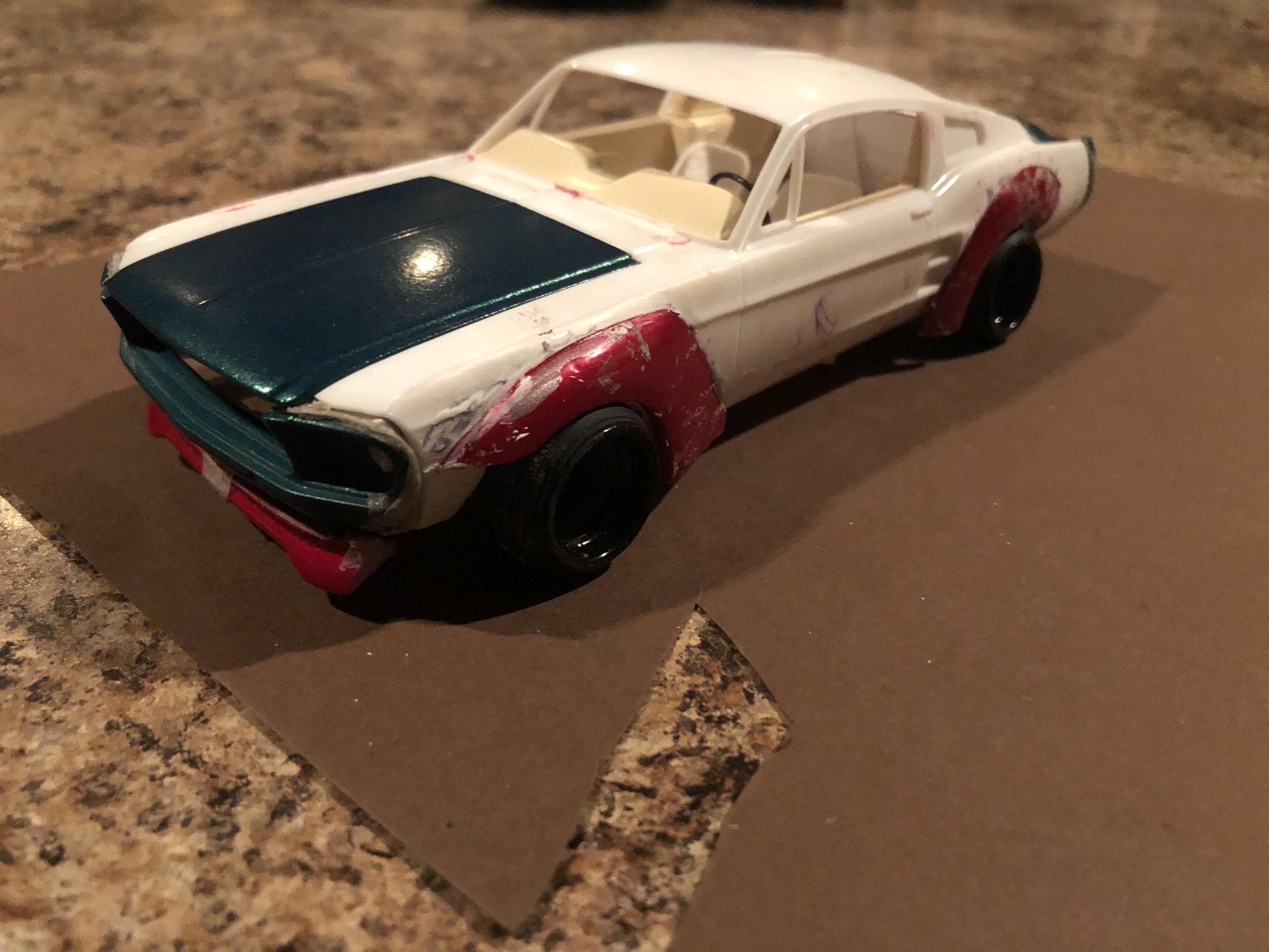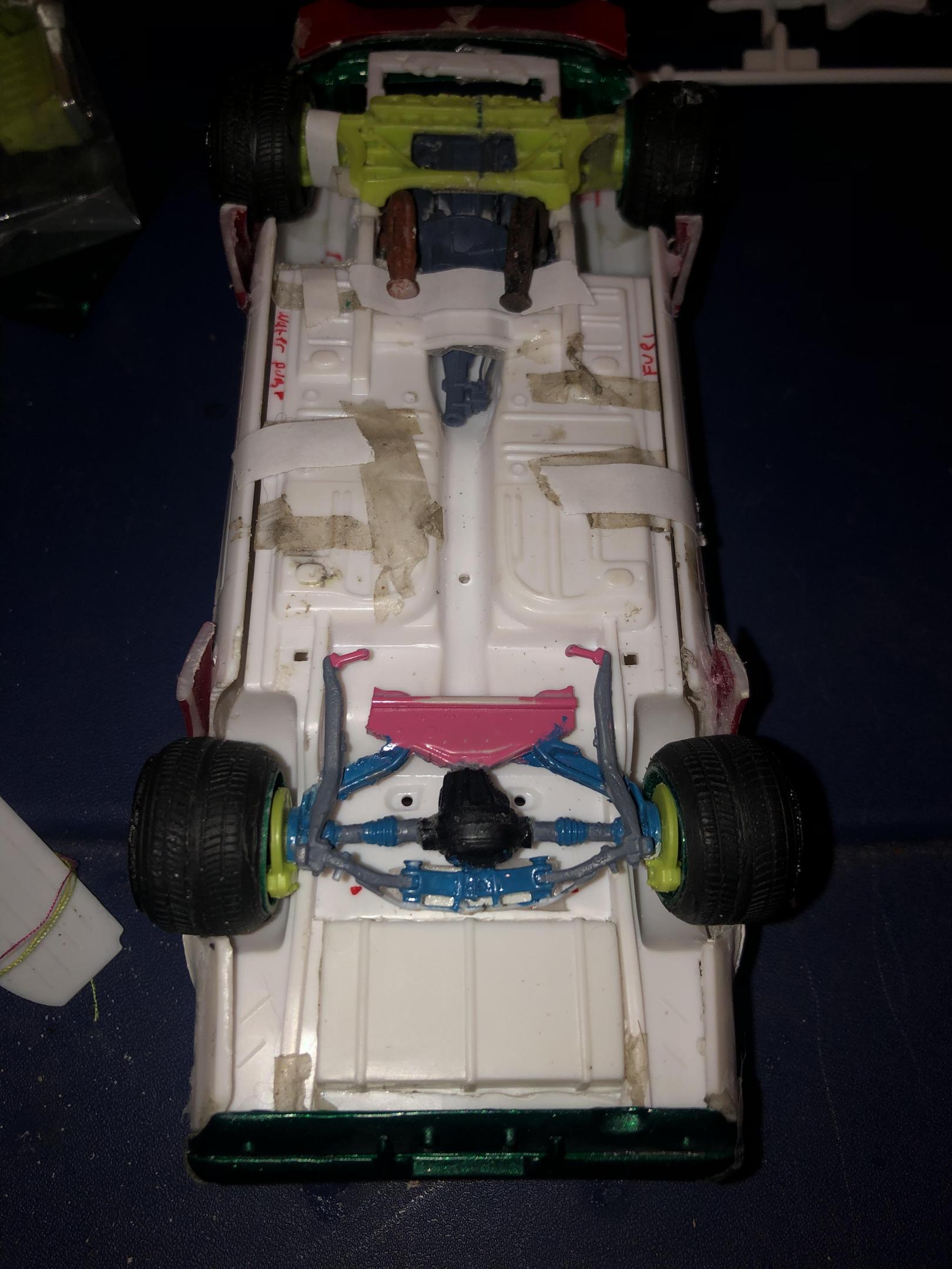 2025 Cannonball Run - 50 years since the 1975 run.JimmyRiggins replied to Mattilacken's topic in Community Builds Some progress has been made on the mustang , unfortunately due to camera related issues I was not able to document some of the progress. I started to build an enclosure for a rear mounted radiator setup (I’m really working to take weight off of the front wheels) with some strong puller fans to keep the car nice and cool! there will be a small remainder of a rear window above the radiator area to retain some rear window visibility, I have an interesting idea on how I’ll use mirrors to my advantage to mitigate blind spots. Where the camera left off is, the exhaust for an f1 car doesn’t lend itself well to a car with fenders. So some surgery was required… mr. Riggins went down to the yard and picked up a set of aftermarket headers from an old rusty super stock dart, (the spacing between cylinders worked out pretty darn close to perfect, the Revell dart kit truly is one of my favourite kits to pick parts from!! (Builds nice too though!)) broke out the welding machine, and grafted those pipes to the exhaust flanges from the f1 headers. Now we have a free flowing set of headers that will clear the steering shaft and flow like a race car should! Pics for proof later 😉