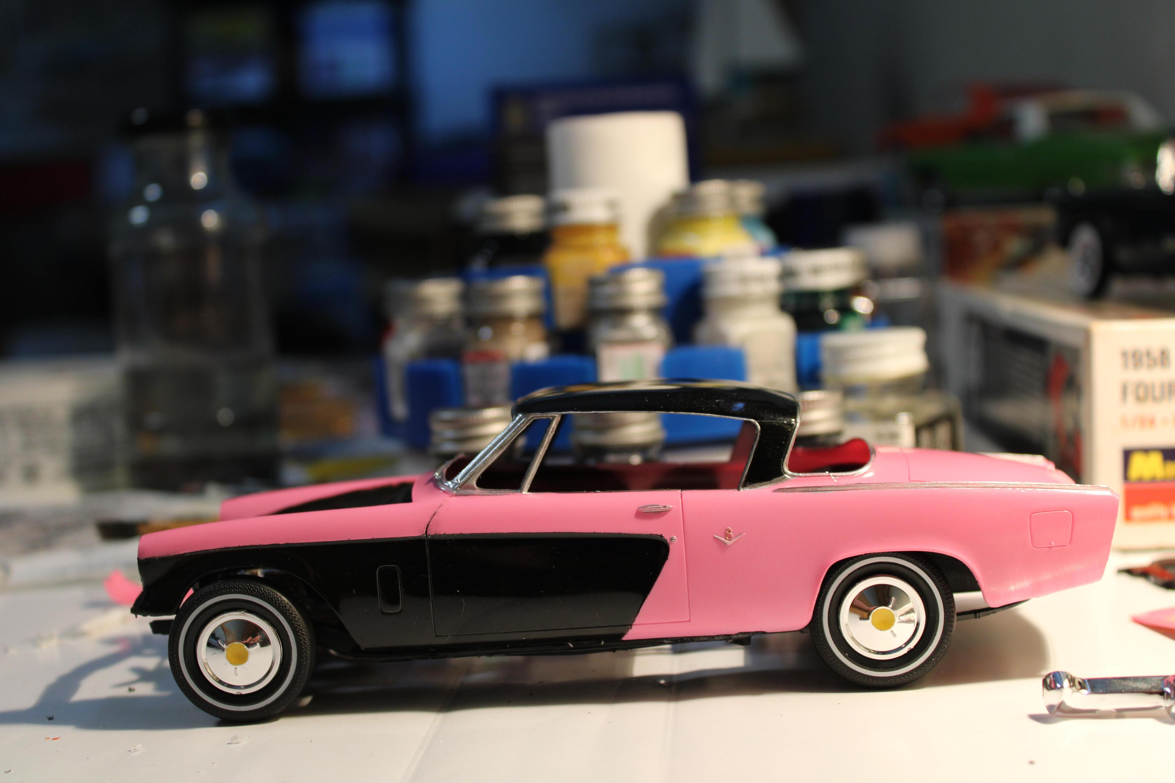 Here it is, finally completed. Took a little less than a week, but it's here. Little issue with the suspension; I went with the lowered stance on the front, but it turns out it hits the ground before the wheels do, but it still looks cool. The most exotic colour I've put on any of my models, not only because it's pink, but because that was my first can of Tamiya paint.