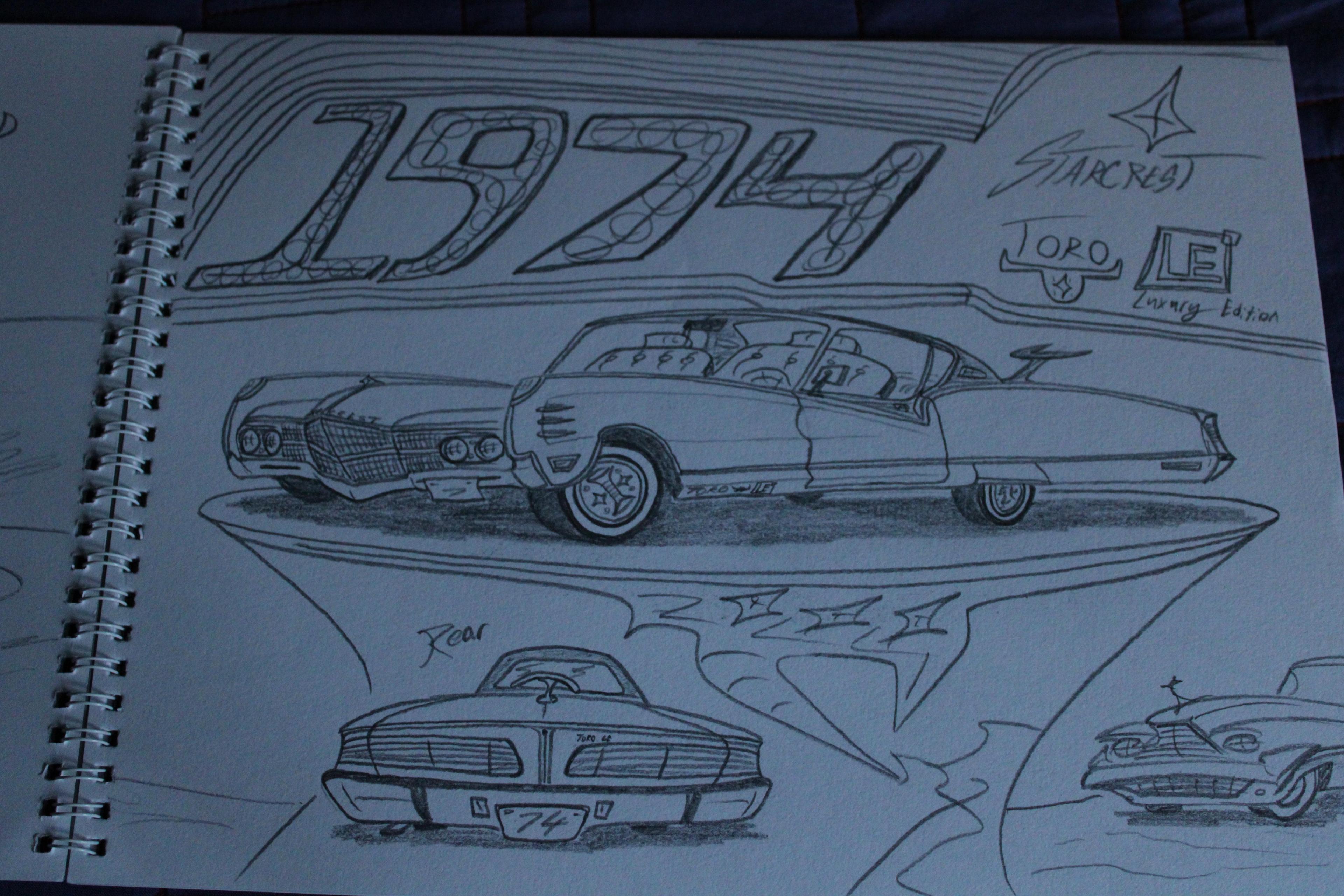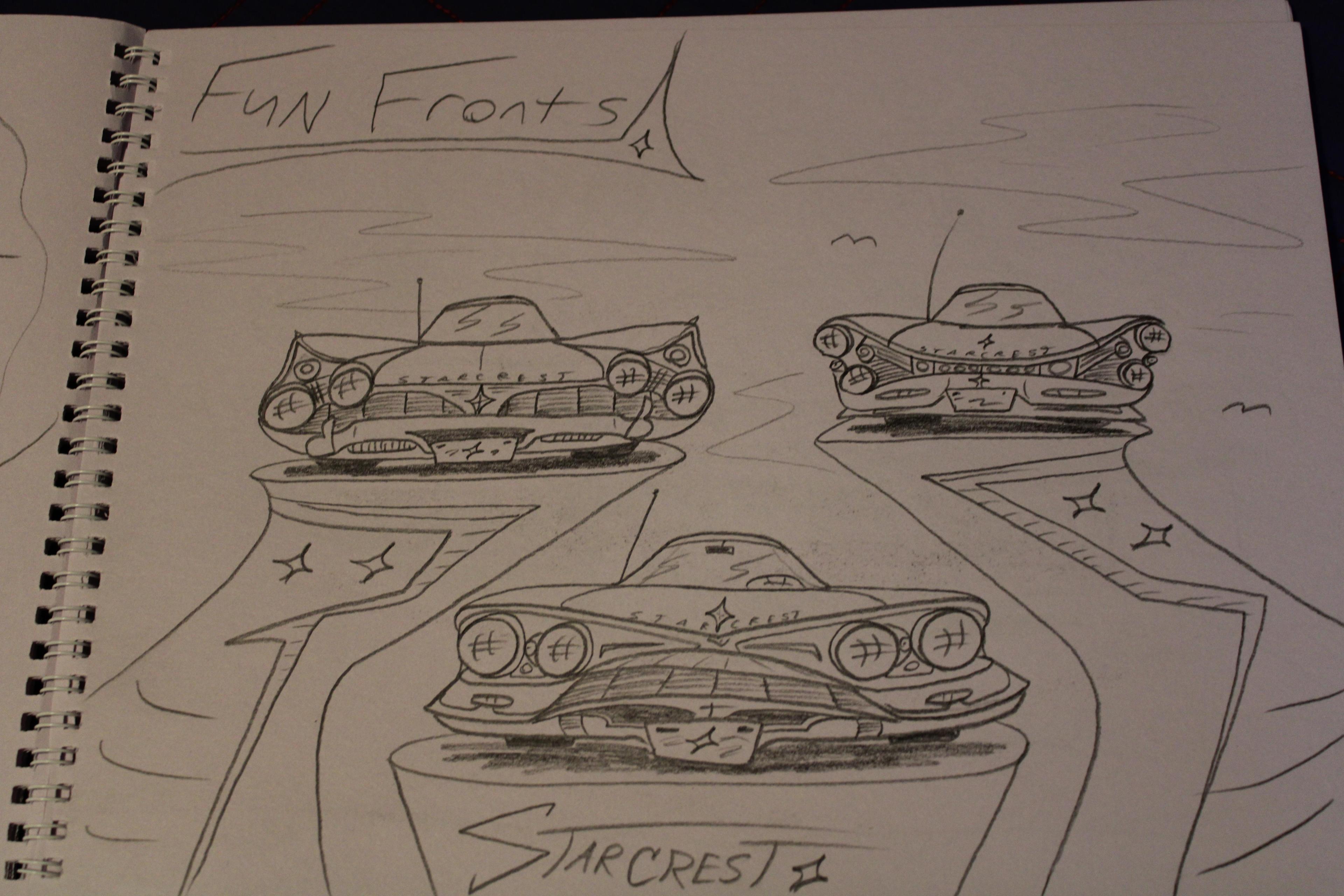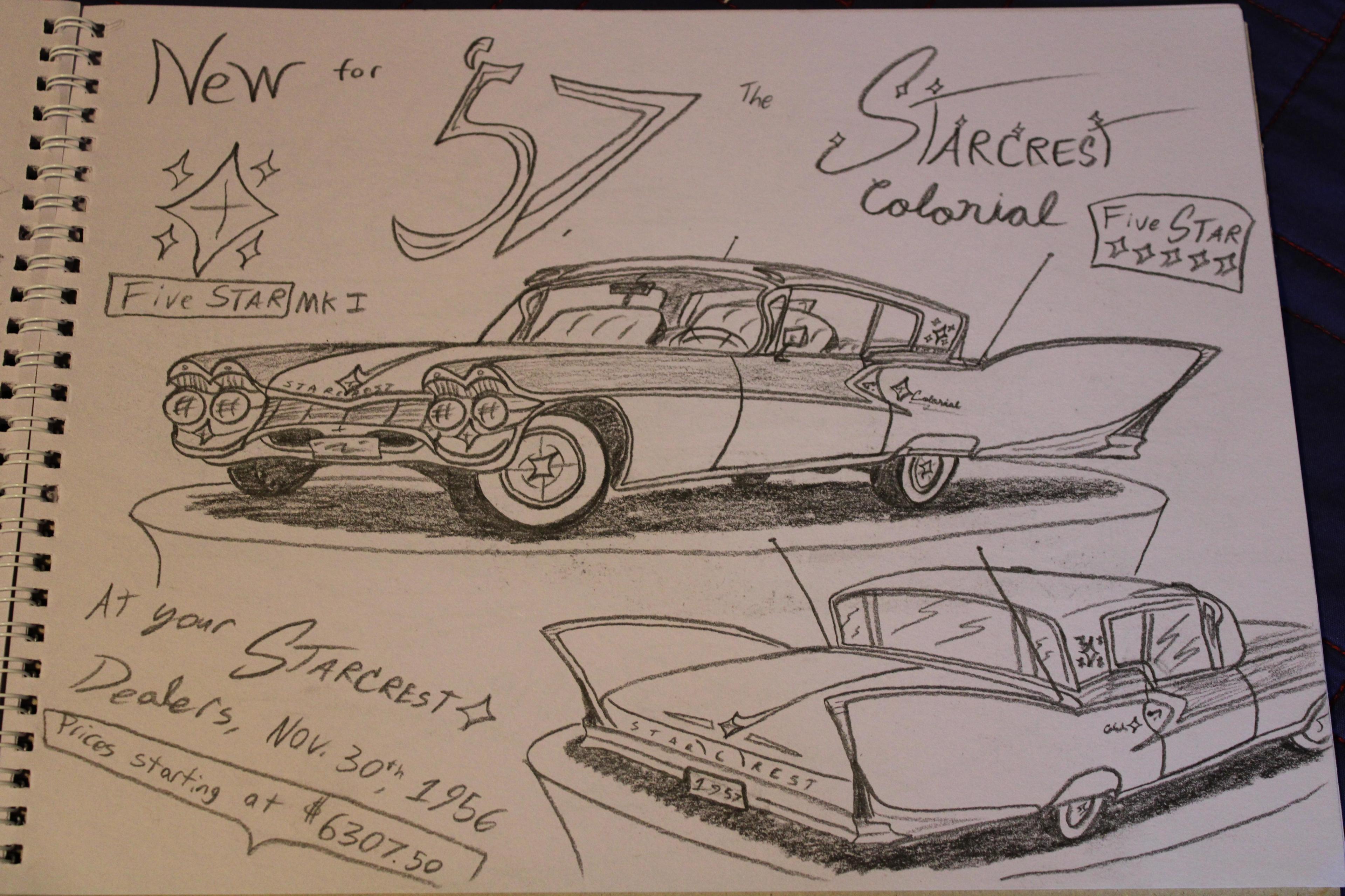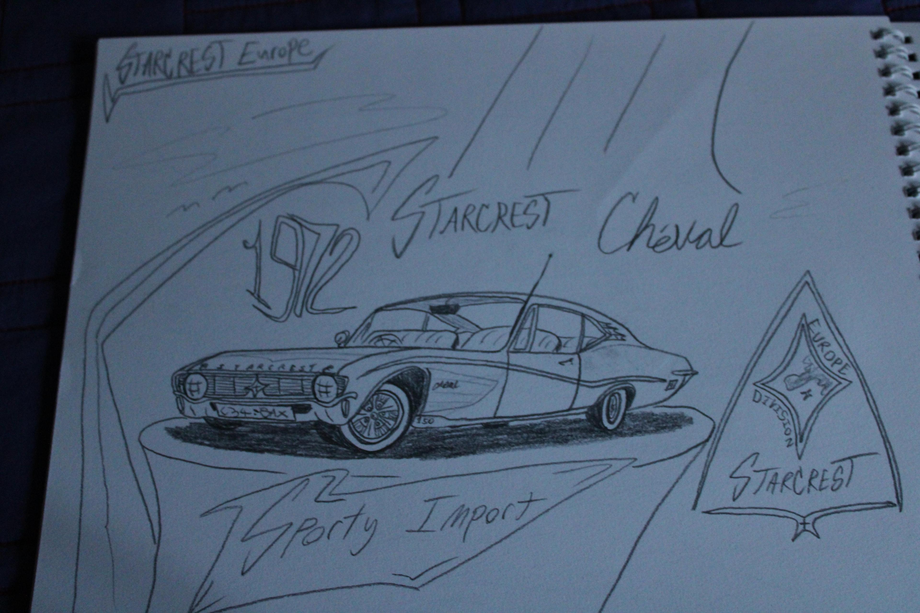 Here are some of my personal drawings of concept design cars; I made up a brand called "Starcrest" so some of my cars are labeled as such, and some are no-names. I will add more because I have a lot; when the other kids at school were on their cell phones, I was nose-deep in my drawing books making these artistic cars instead.