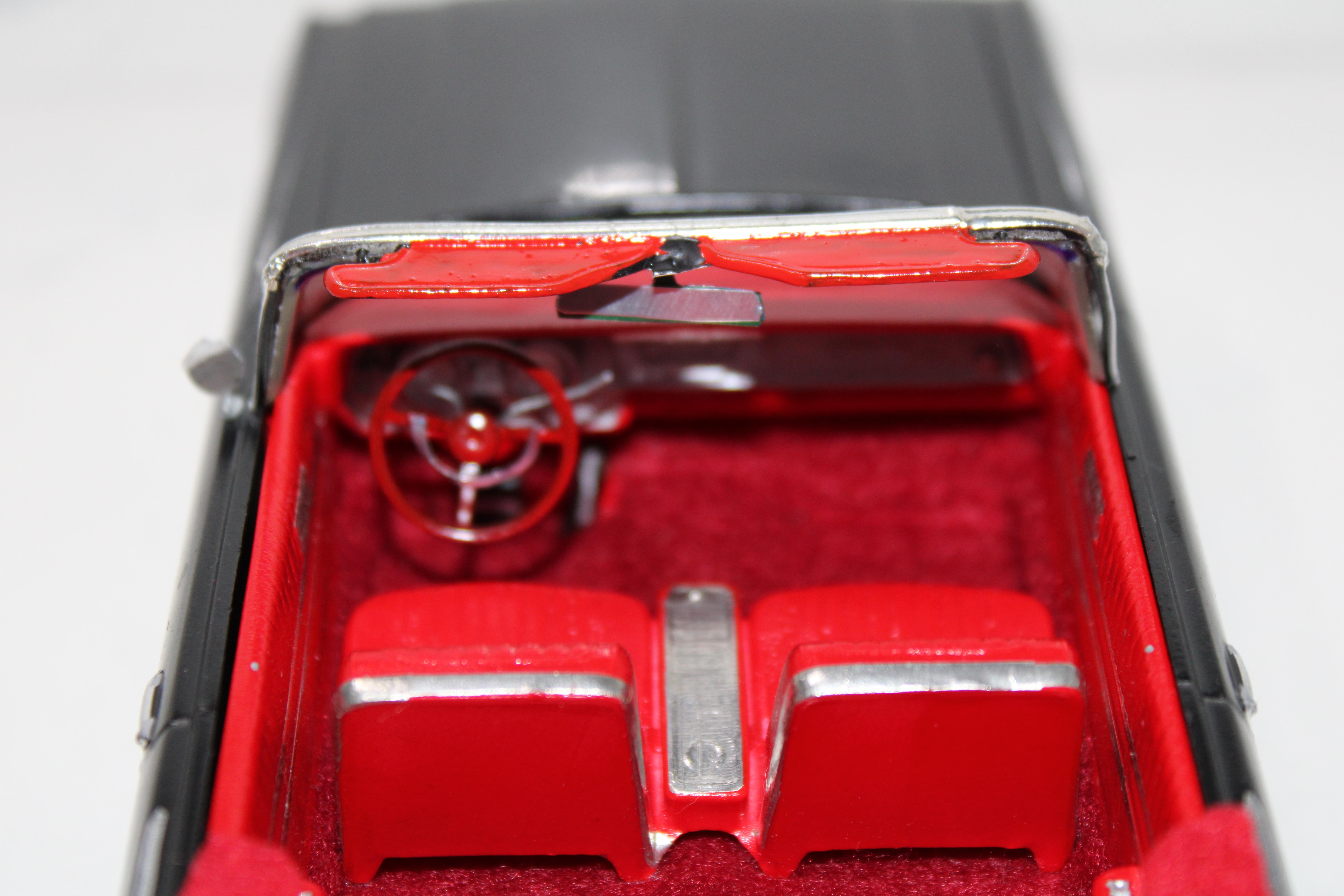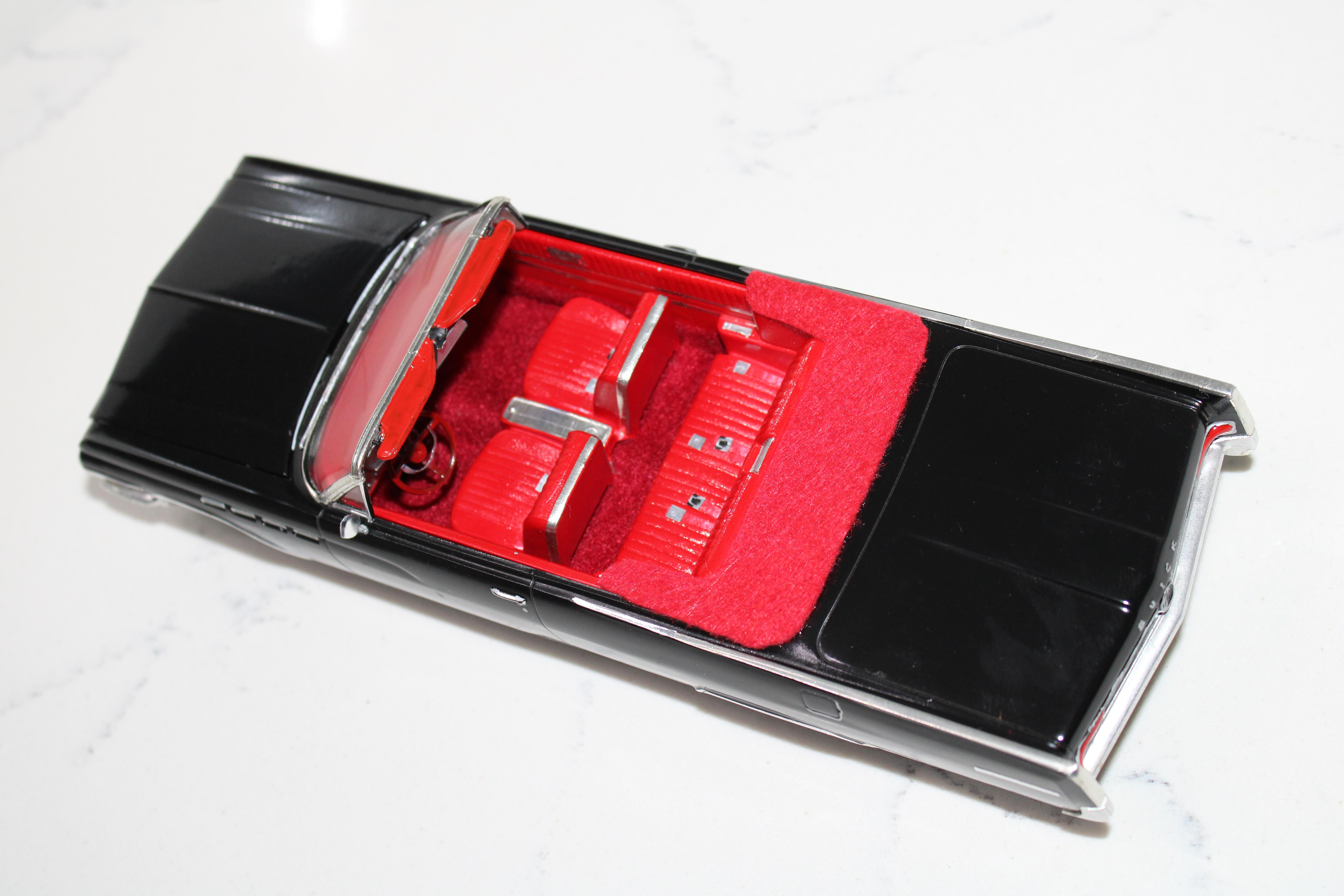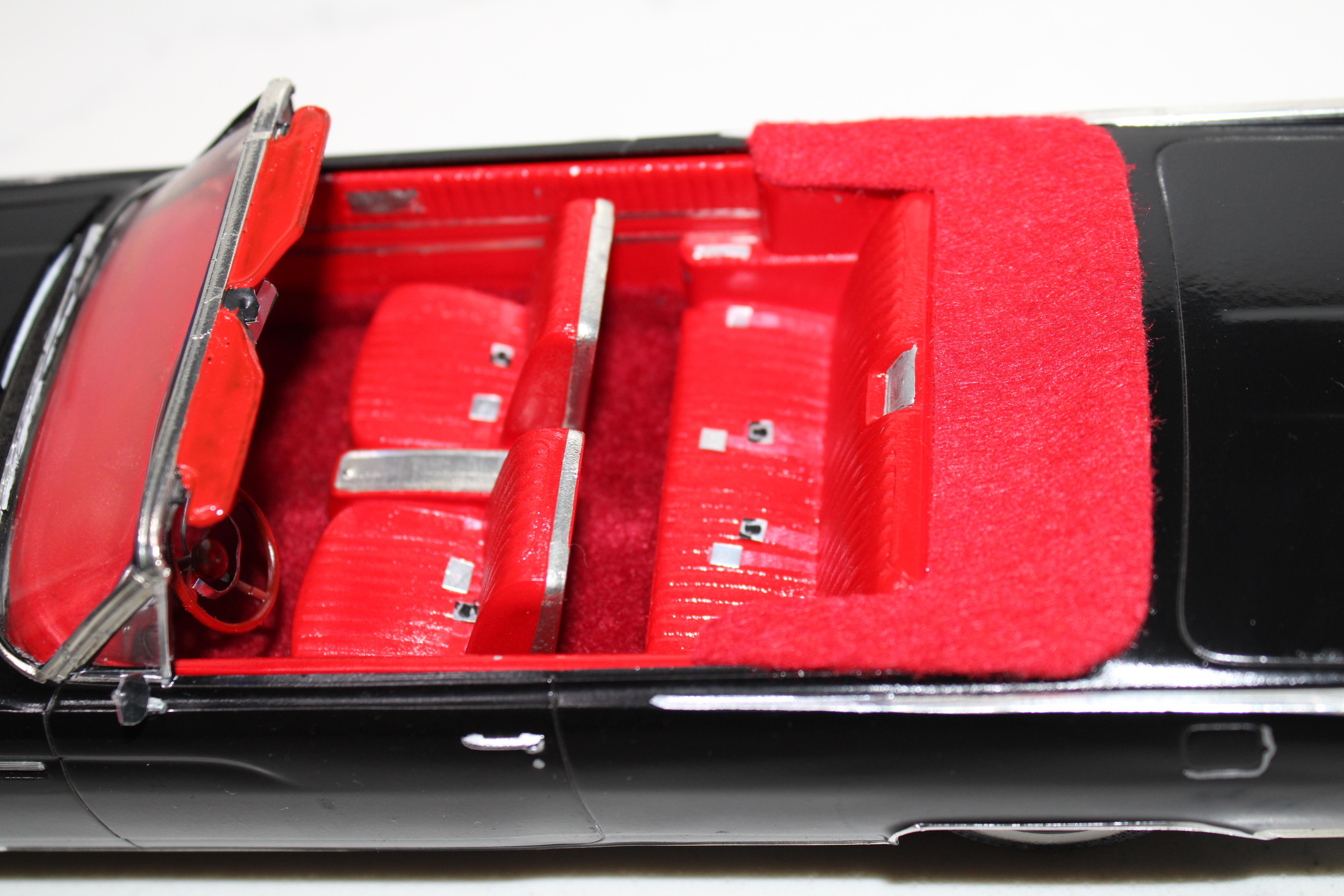 AMT 1/25 scale 1969 Chevrolet Impala SS 427 in Burgundy with black vinyl top. This one is a restored and detailed dealership promotional model made from two model cars(one hardtop and the other a convertible) to create one complete car with all original parts. I've included pics of the condition of this car the way I found it and also the donor which was the convertible. I might fix up the droptop too or do something with it. I worked on the similar parts of the '69 and '70 Impala simultaneously. Like one week I worked on the chassis of both cars, the next week interiors of both cars, the following week the bodies and so on.