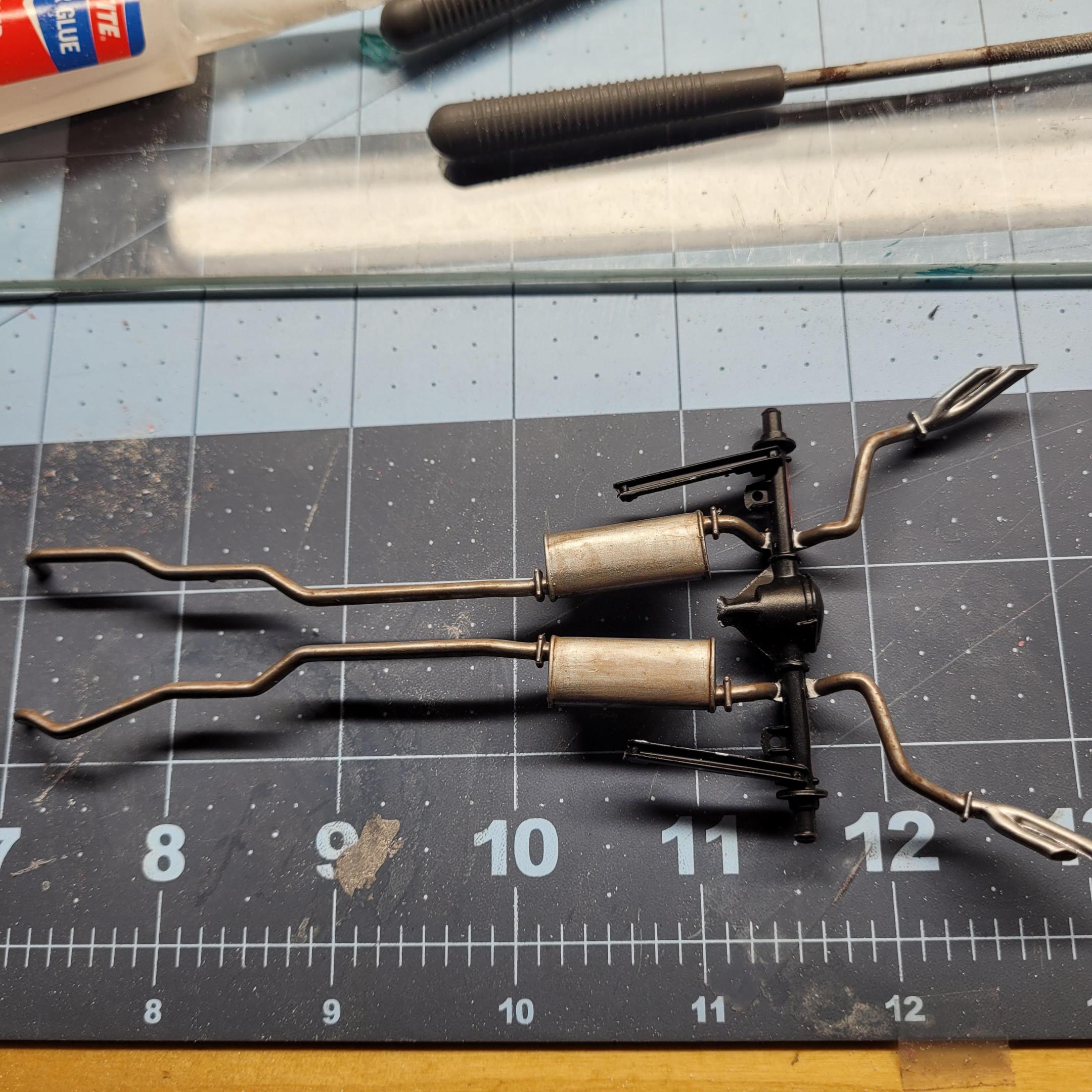 Did a bit more on the dash details, only two of the four gauges have anything that resembles detail, I may just end up with decals. Not sure. I also lowered the front end and in the process tried to make look like actual spindles, I think it looks ok. Decided to weather the exhaust a bit, rust things up. I think I'm going to make this look driven, as realistic is I can get it. Thinking about trying to make linkage for the 4 speed.
