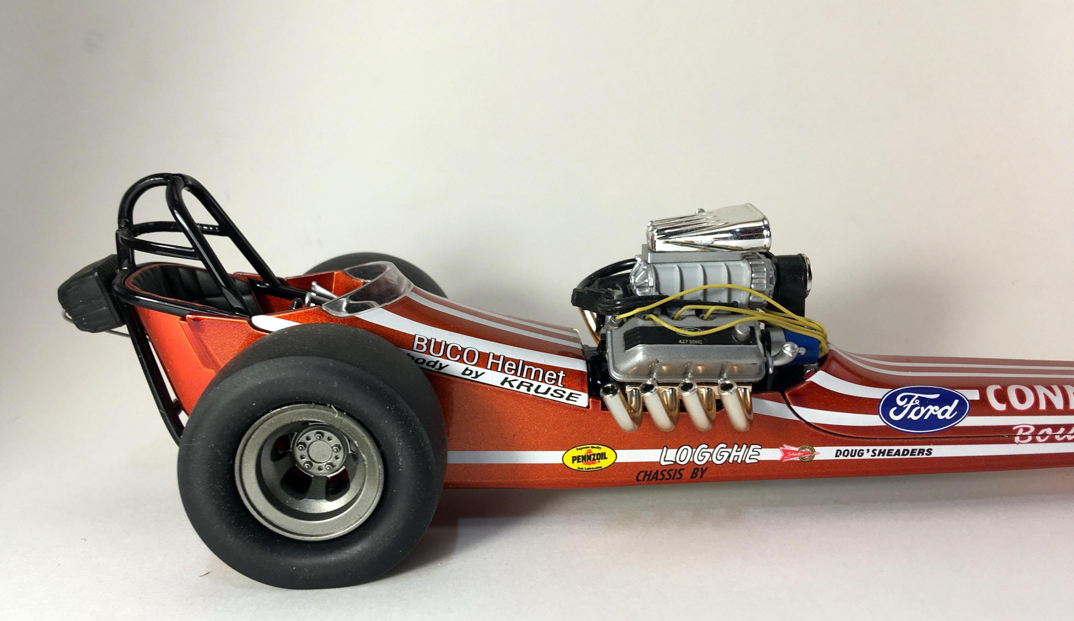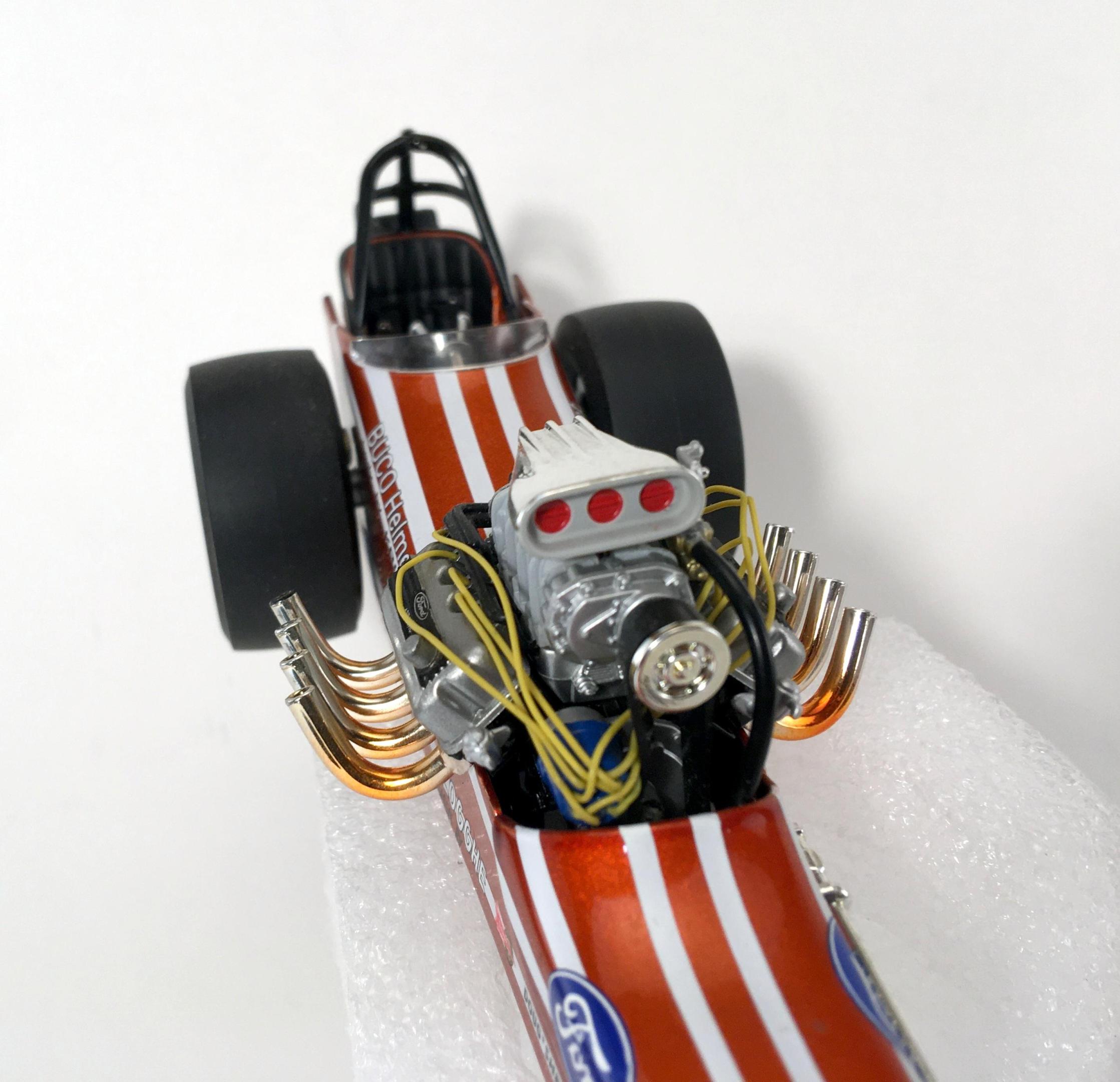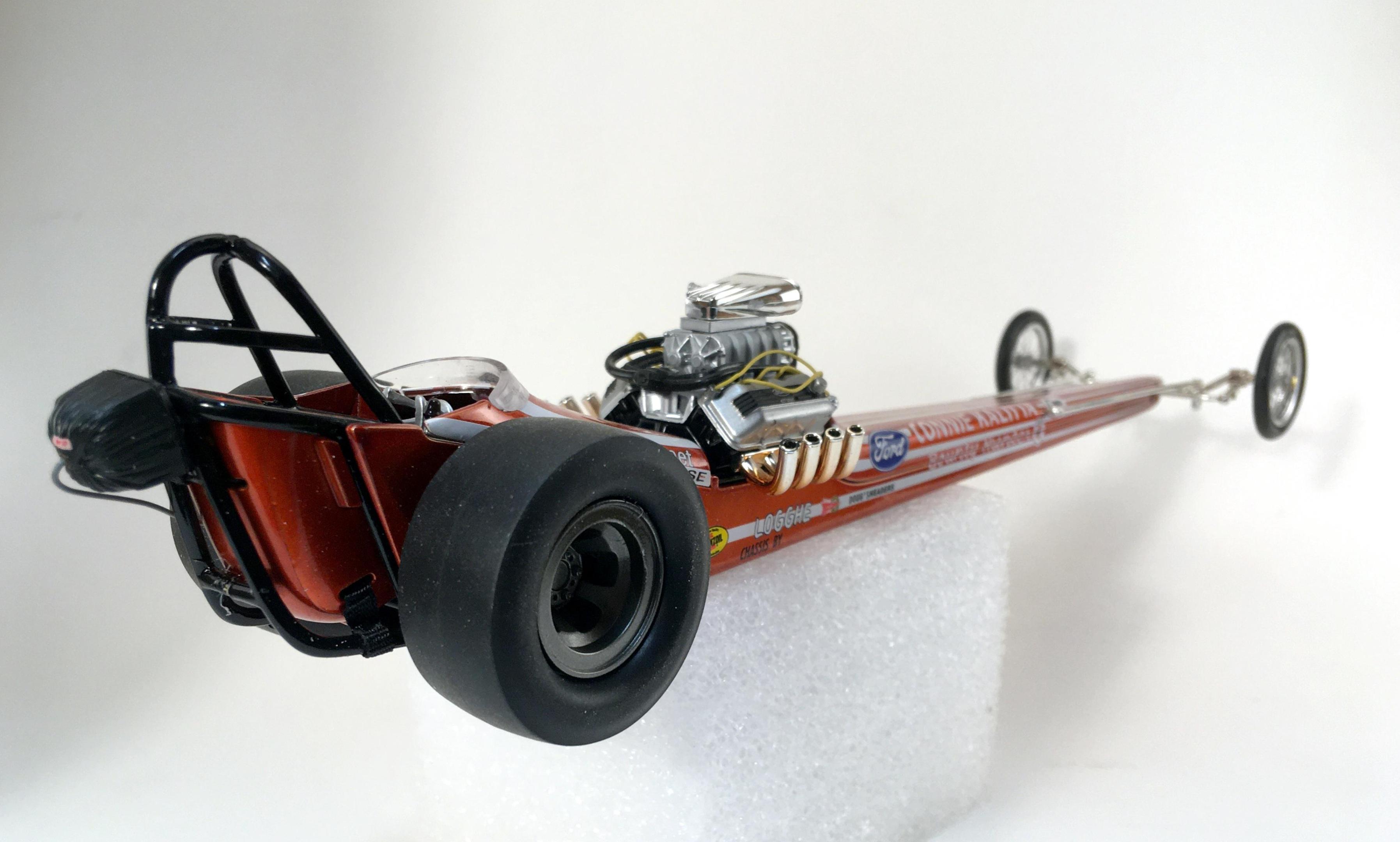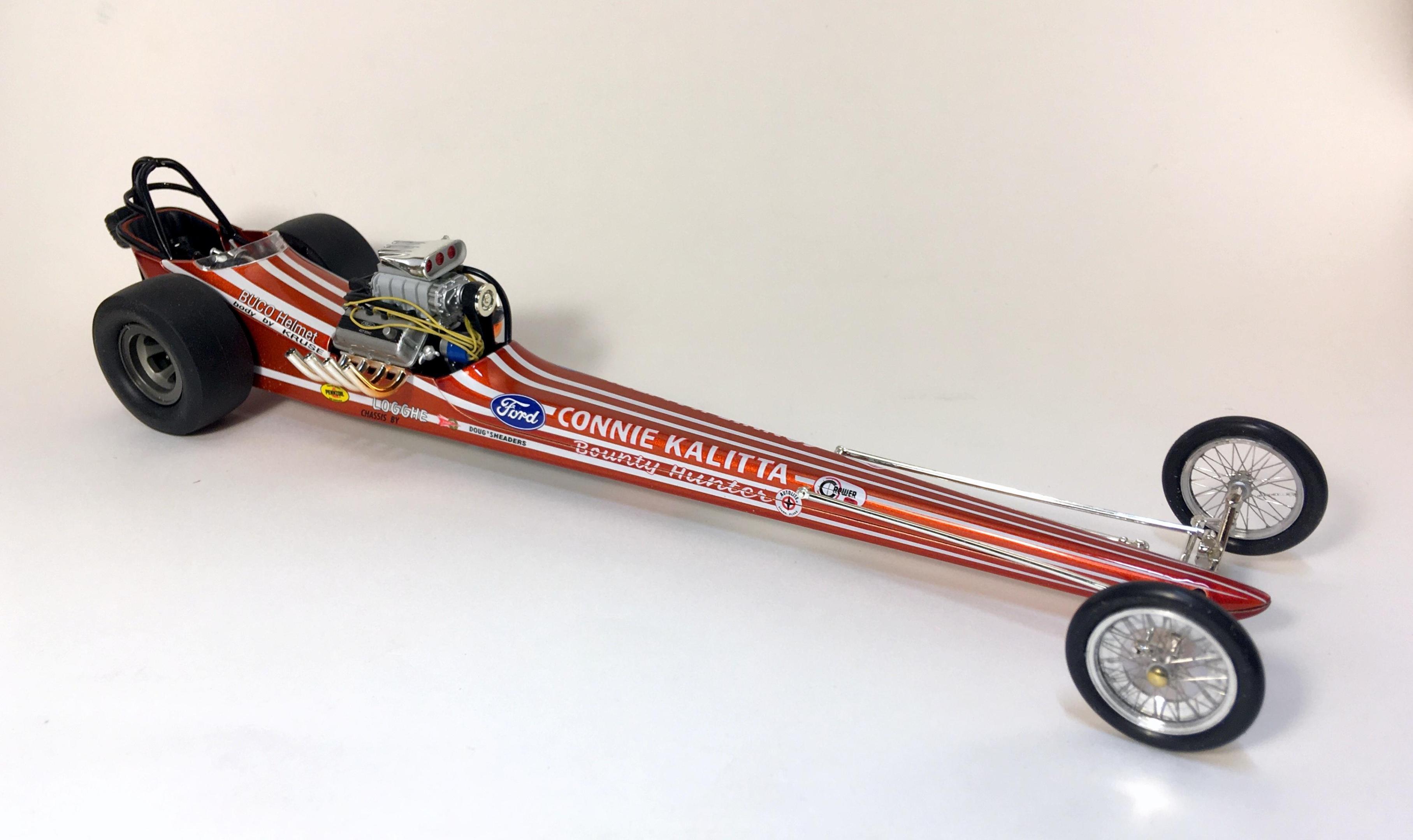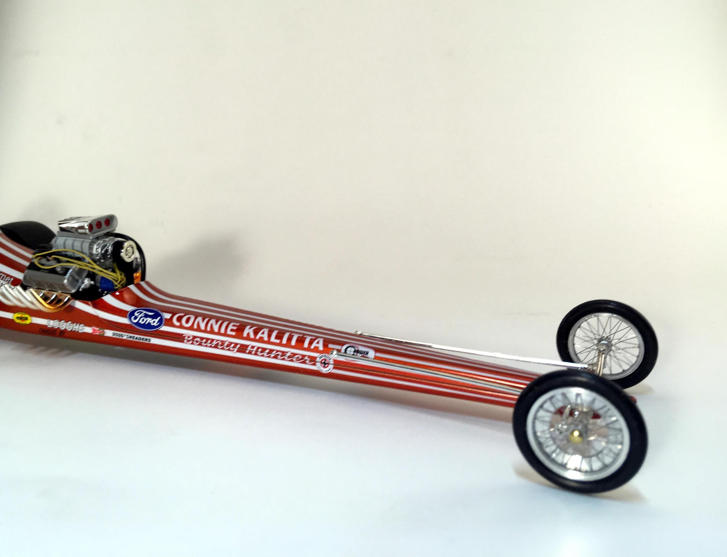 Several years ago I purchased a 1/24 scale diecast model of Connie Kalitta's 1967 Ford SOHC top fuel dragster made by 1320. It's a great representation of Kalitta's dragster but I was disappointed in the front spoked wheels. They were plastic and just didn't look as realistic as the rest of the model. So, I bought some after market metal spoked wheels and put them on the front instead of the original plastic ones. Now it looks much better. The wheels I bought: "curtr8tzing 19" 1/25 scale wire wheels 36 spoke .790" dia" (available from Ted's Modeling Marketplace). See photos: Connie Kalitta raced Fords from 1966 to 1970, enjoying major success with the SOHC engine. He won both the AHRA and NHRA Winternationals in 1967. Connie's best quarter mile time with the SOHC was 6.81 seconds at 219 mph.