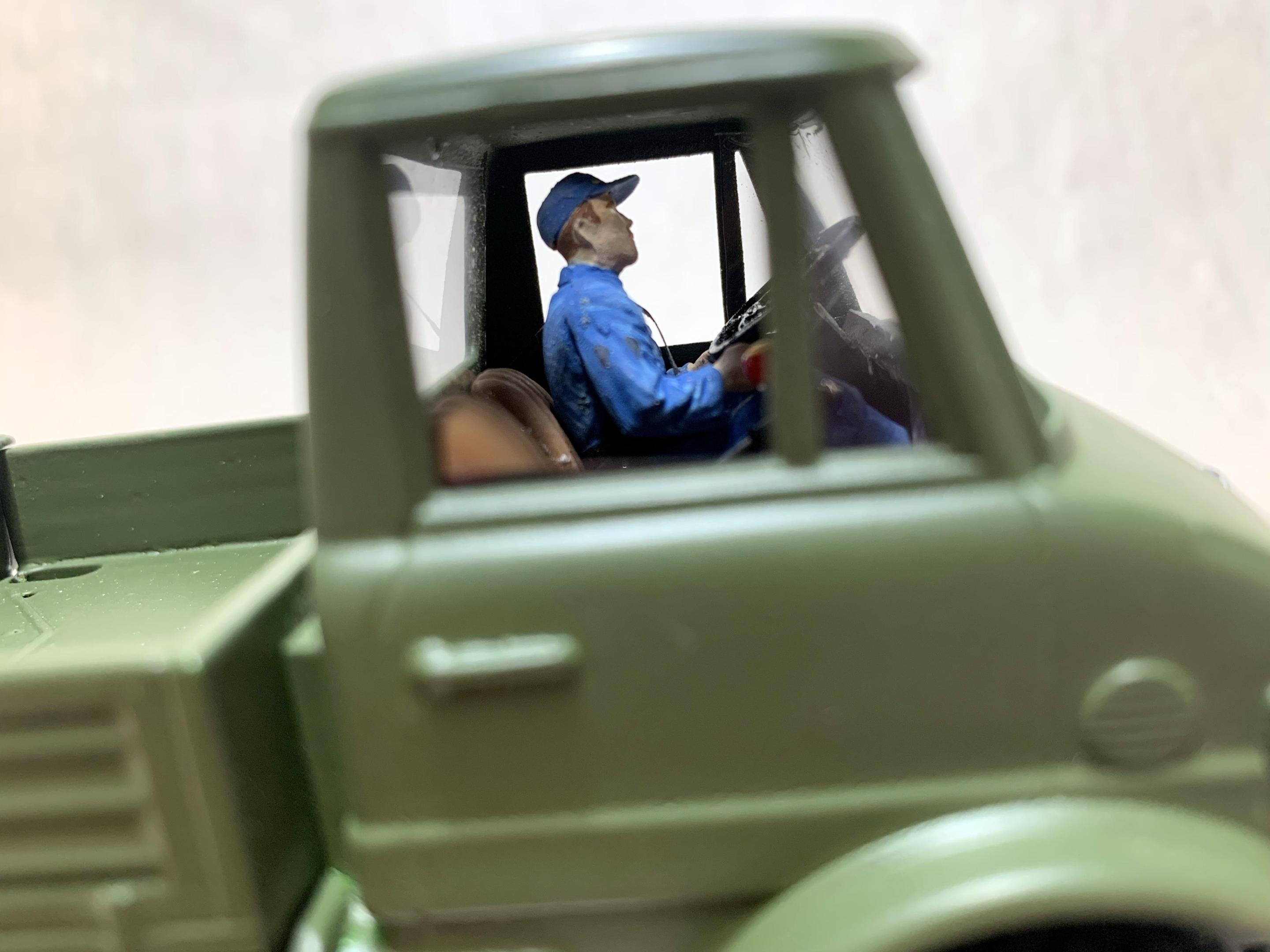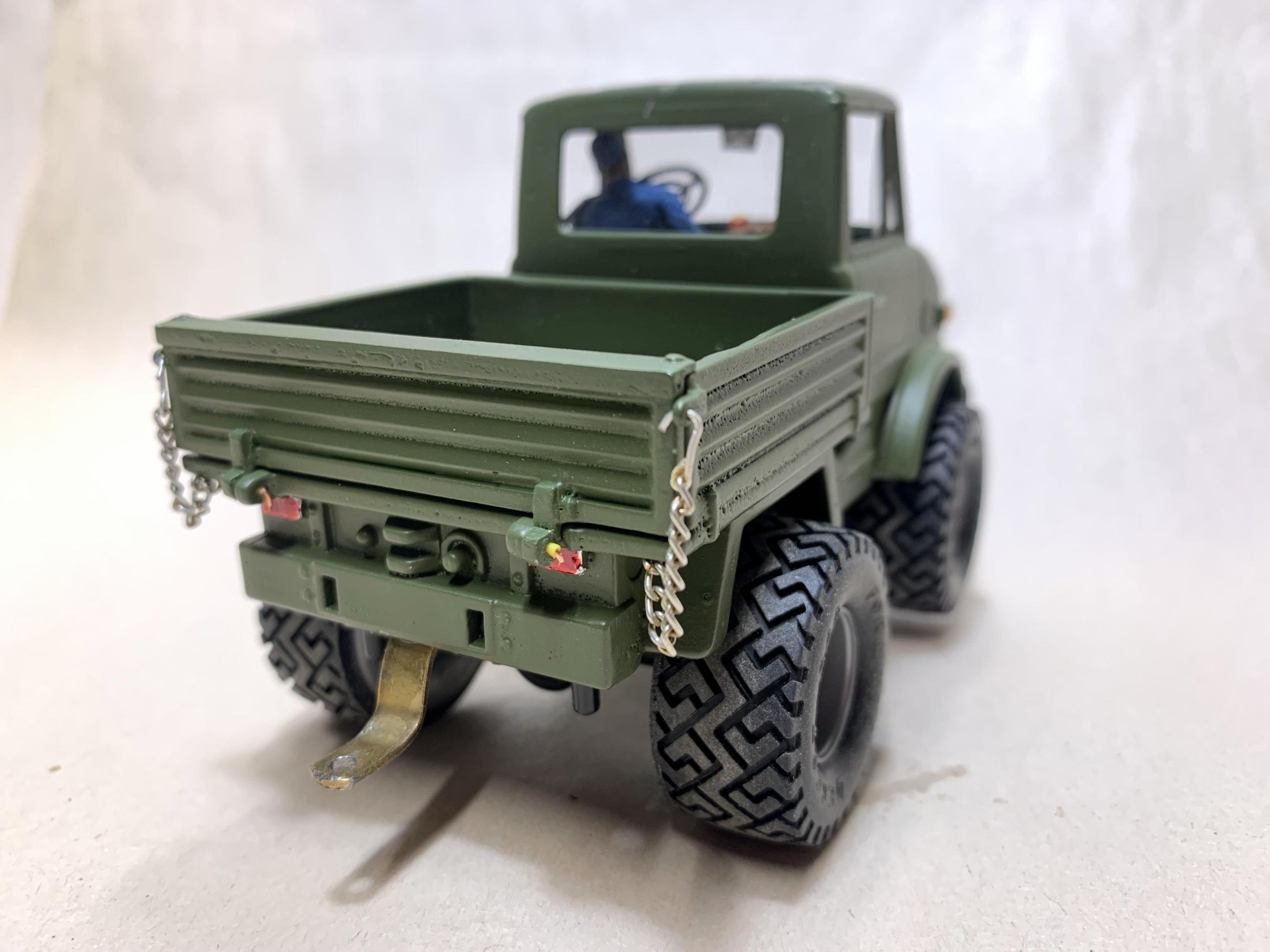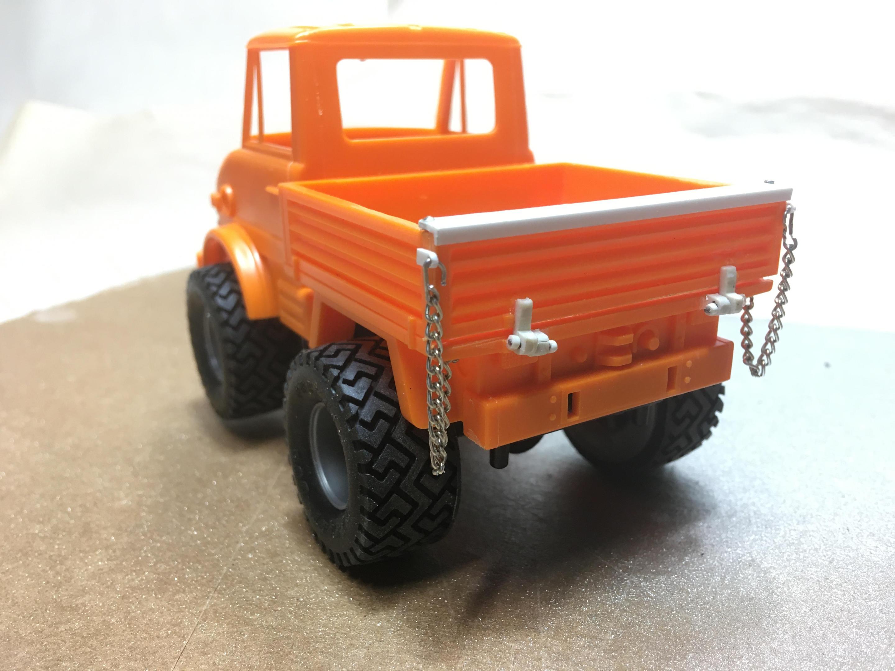 I used a 1/32 scale Tamiya motorized Unimog to make a service, utility and tow vehicle for my slot car track, Overlook Raceway Park. The following photos show the model in the build process and the finished version on track. It doesn't move very fast, but it does make its way around the track and can serve as a tow truck when the need arises. It also adds a bit of scenery to my track. Along the way, I added an interior and a driver, cut out the back panel of the pickup box and hinged it and made some retaining chains, and added a tow bar with ball. For the tow truck I scratch built a towing apparatus and made it removeable so I can use the Unimog as a service/utility vehicle or as a tow truck. I painted it with Tamiya military paint out of the spray can.