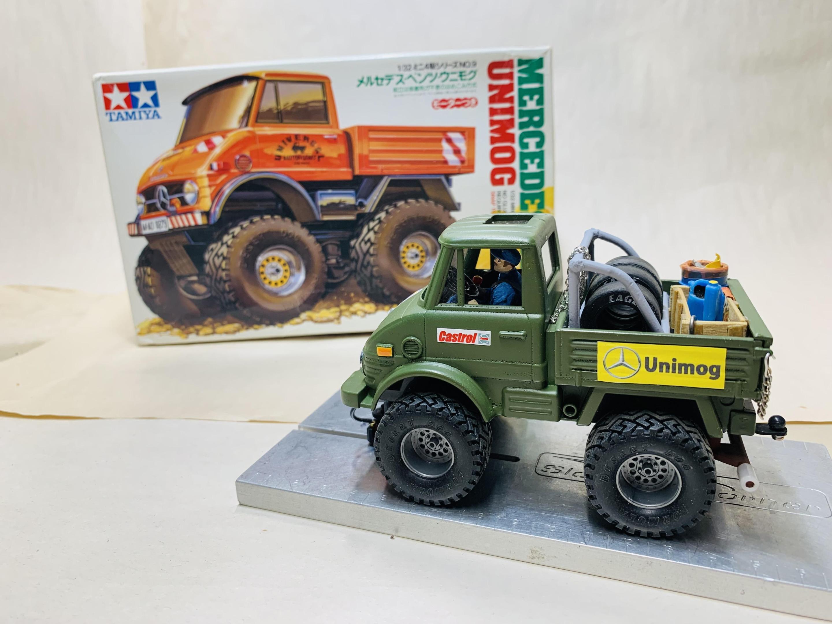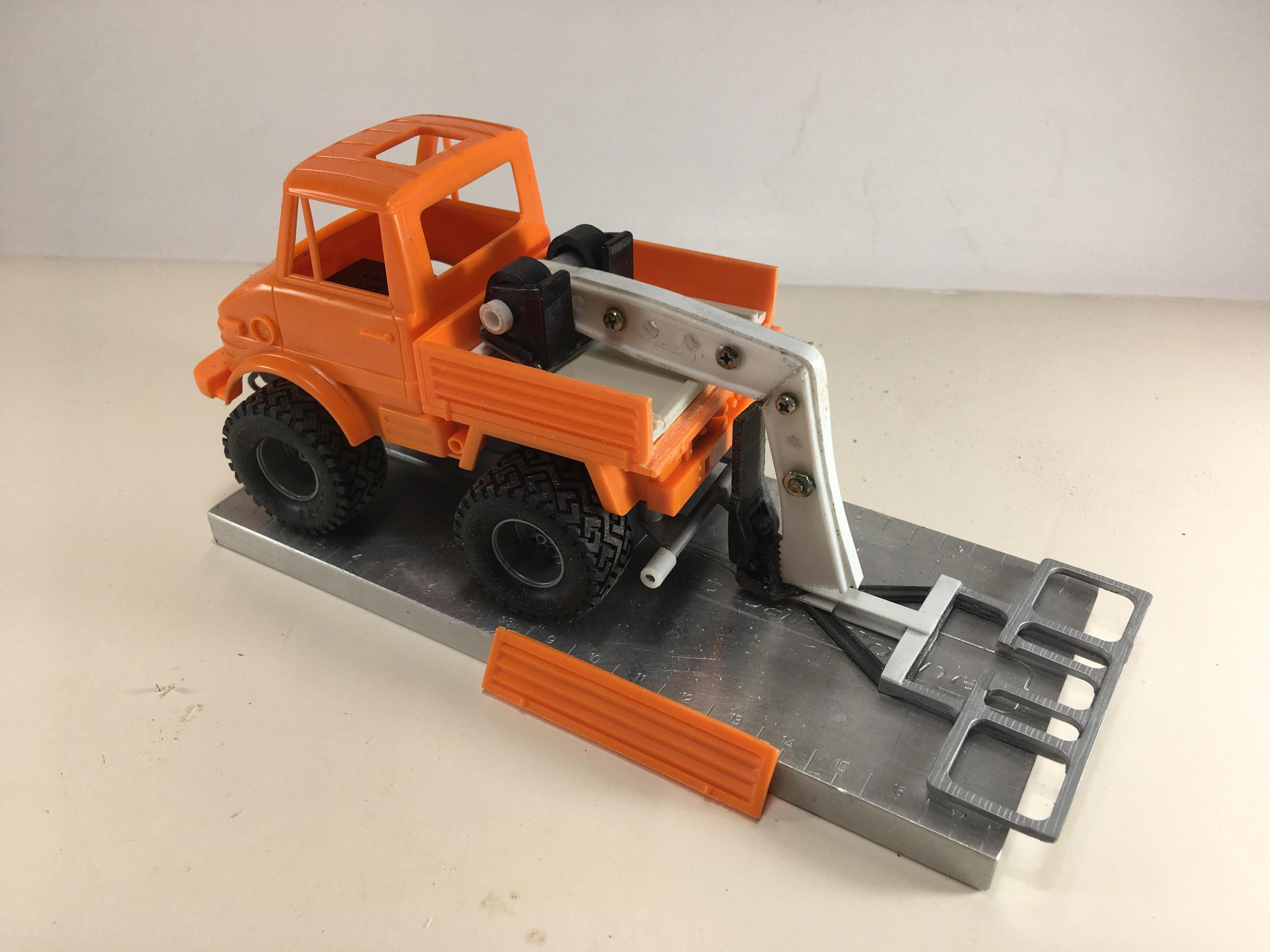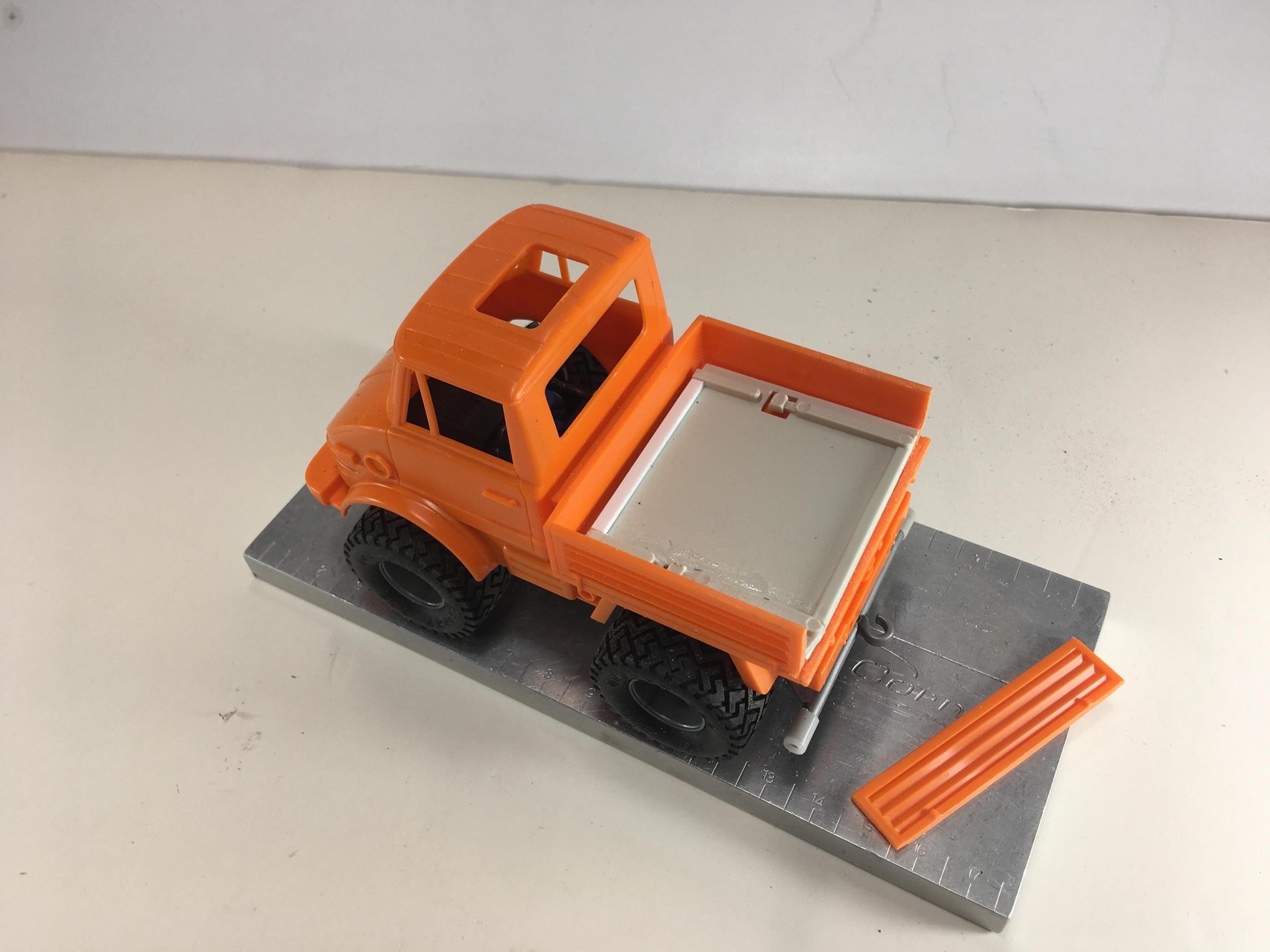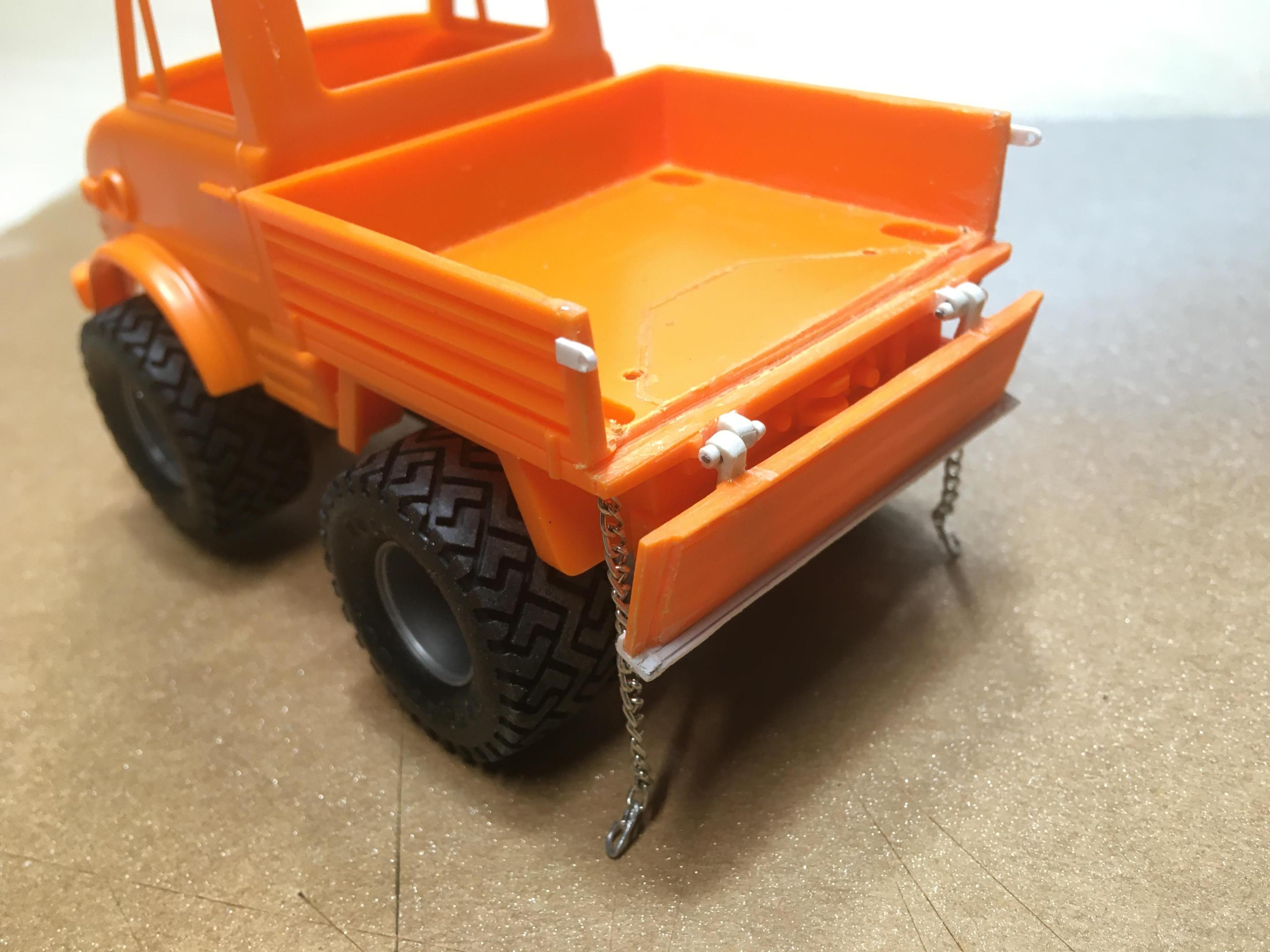 I used a 1/32 scale Tamiya motorized Unimog to make a service, utility and tow vehicle for my slot car track, Overlook Raceway Park. The following photos show the model in the build process and the finished version on track. It doesn't move very fast, but it does make its way around the track and can serve as a tow truck when the need arises. It also adds a bit of scenery to my track. Along the way, I added an interior and a driver, cut out the back panel of the pickup box and hinged it and made some retaining chains, and added a tow bar with ball. For the tow truck I scratch built a towing apparatus and made it removeable so I can use the Unimog as a service/utility vehicle or as a tow truck. I painted it with Tamiya military paint out of the spray can.