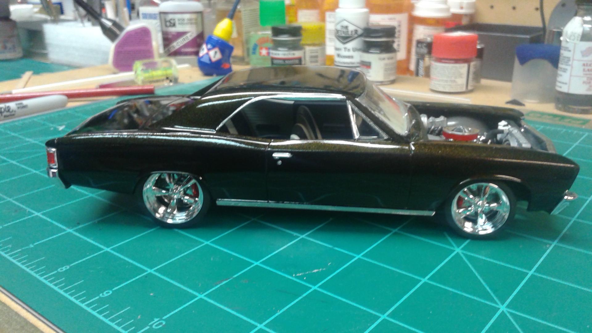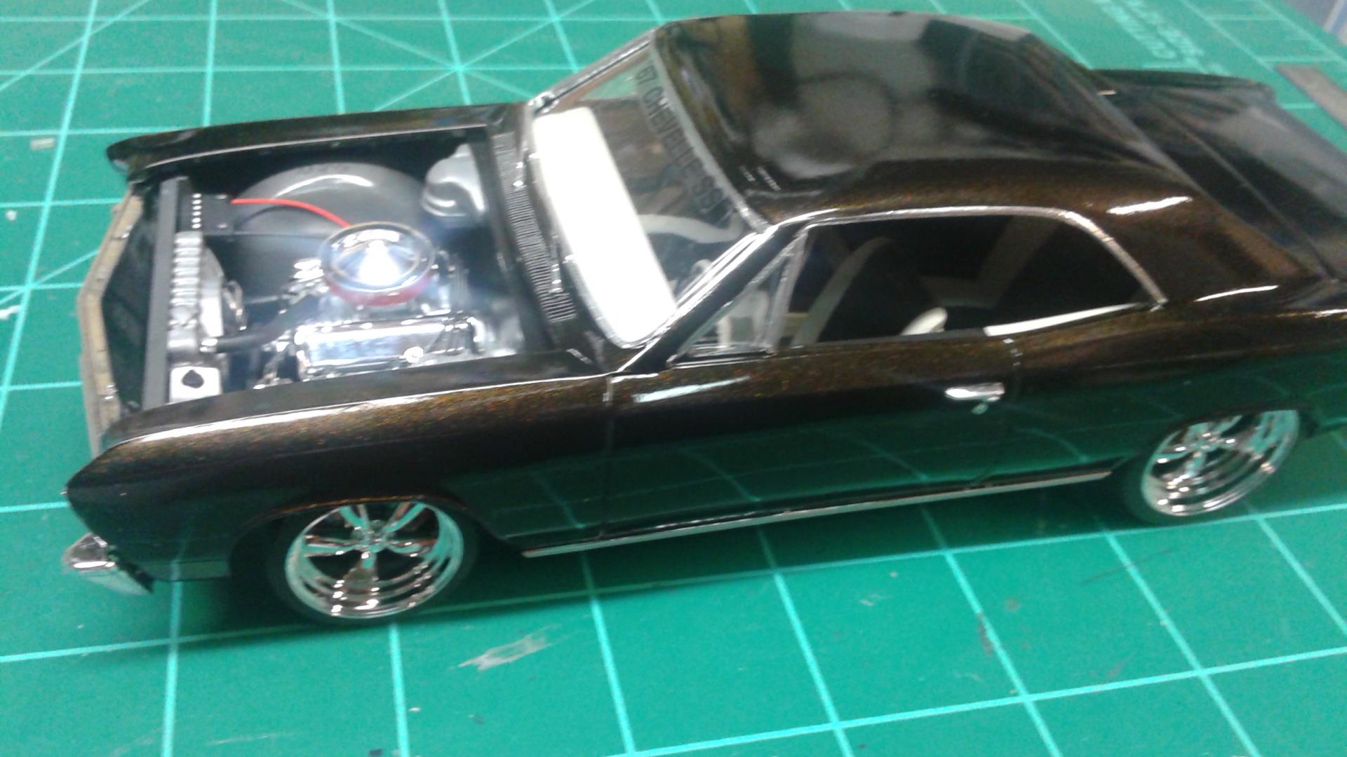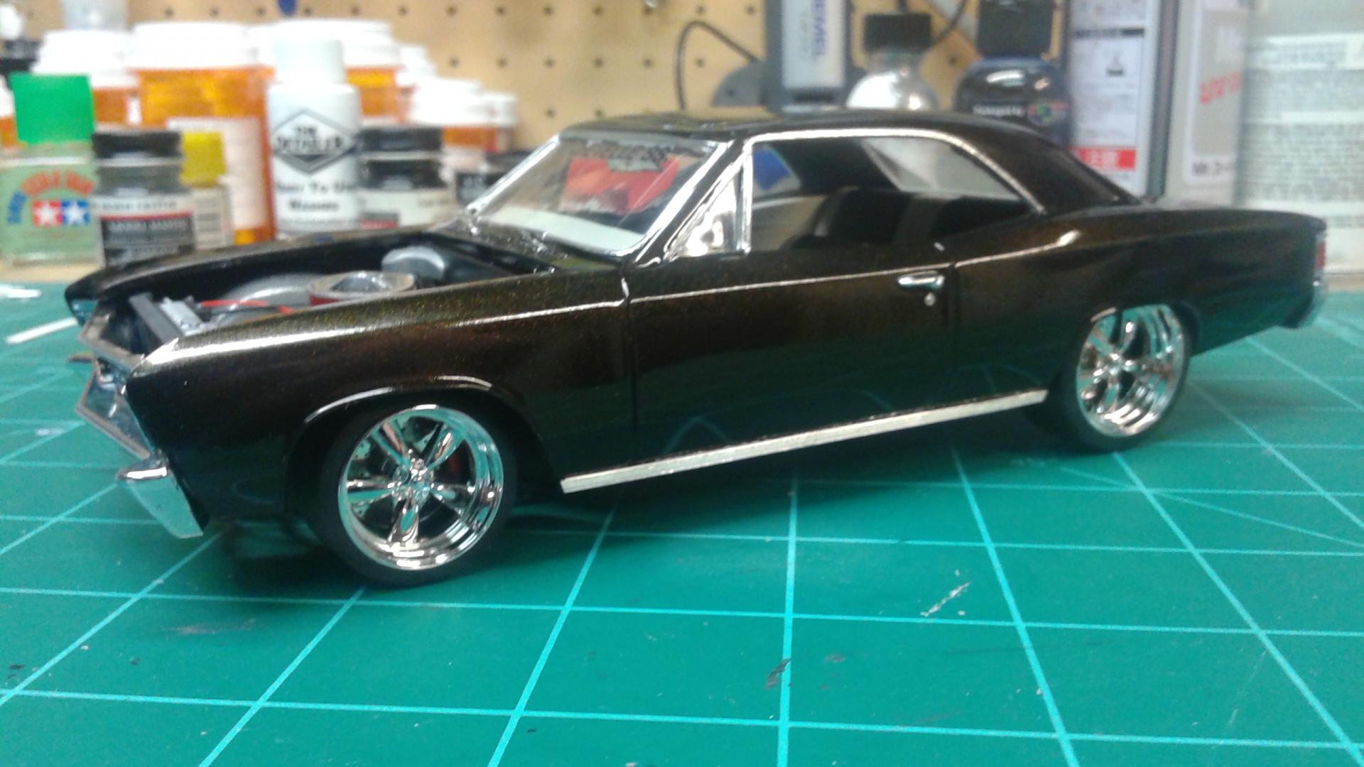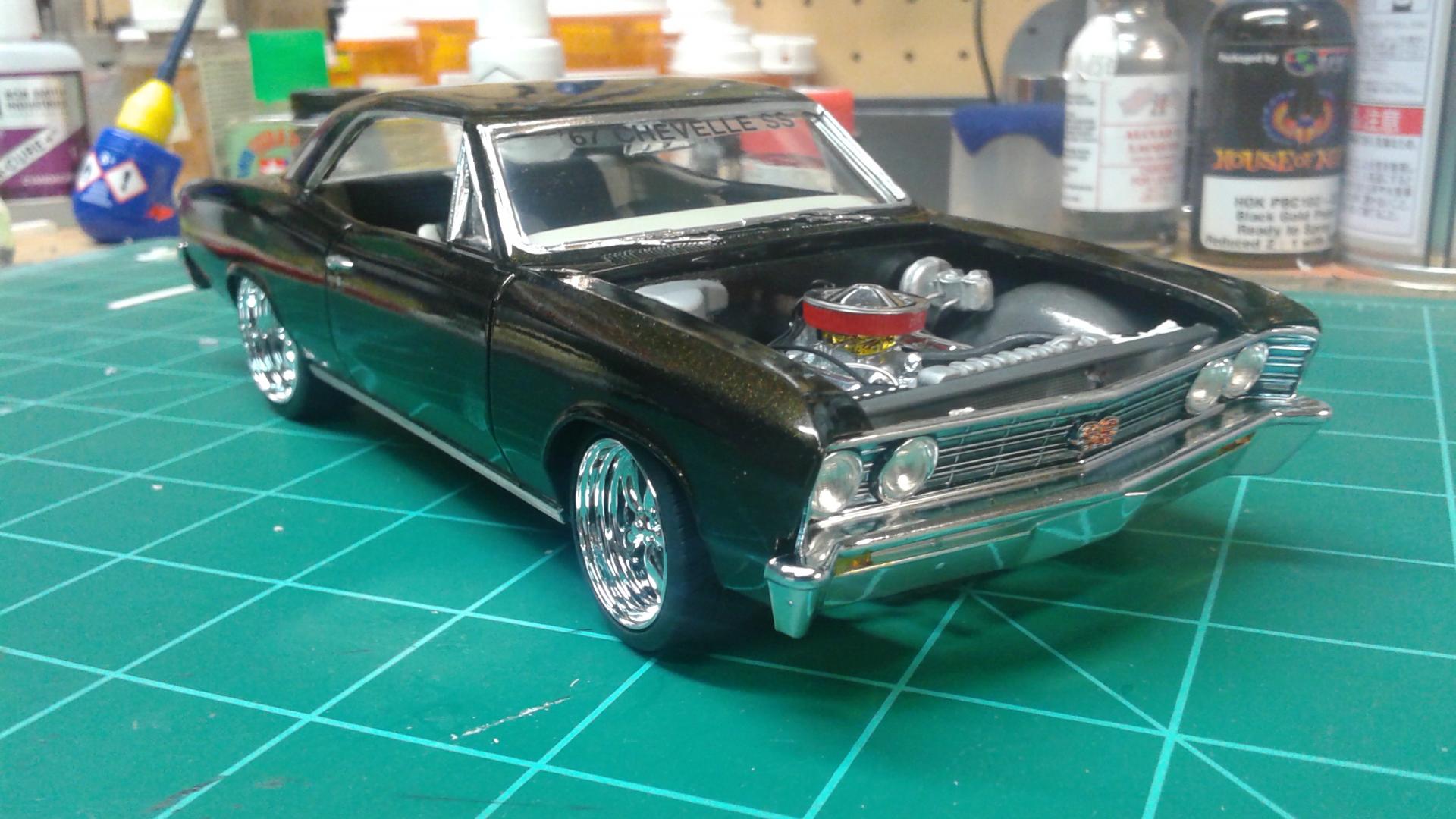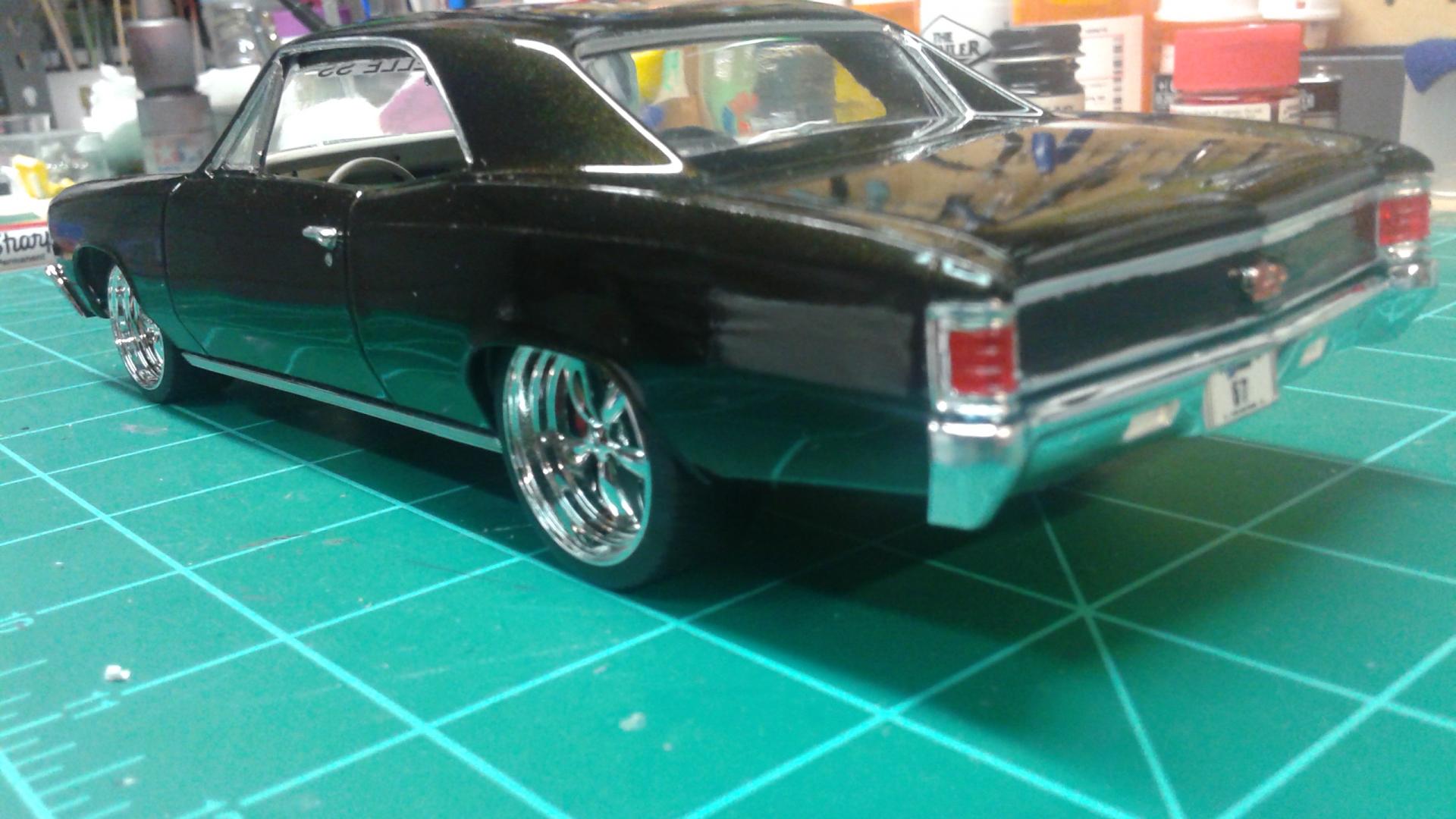 Sorry it's been while since I downloaded anything! Well this is my first build of the year 67 Chevelle pro touring pegasus wheels and disk brake. house of color pearl black over silver base and three coats of clear. Stock motor with wiring two tone interior black light gray some photo etched inside aluminum drive shafts and soldering for exhaust pipe. I did this build for my wife hope she likes it! ! Sorry for the wagon in pic.
