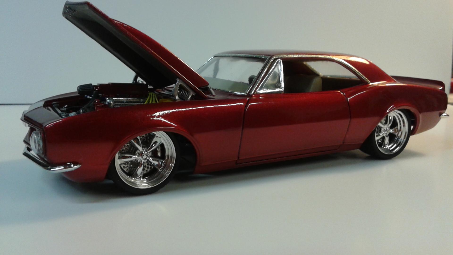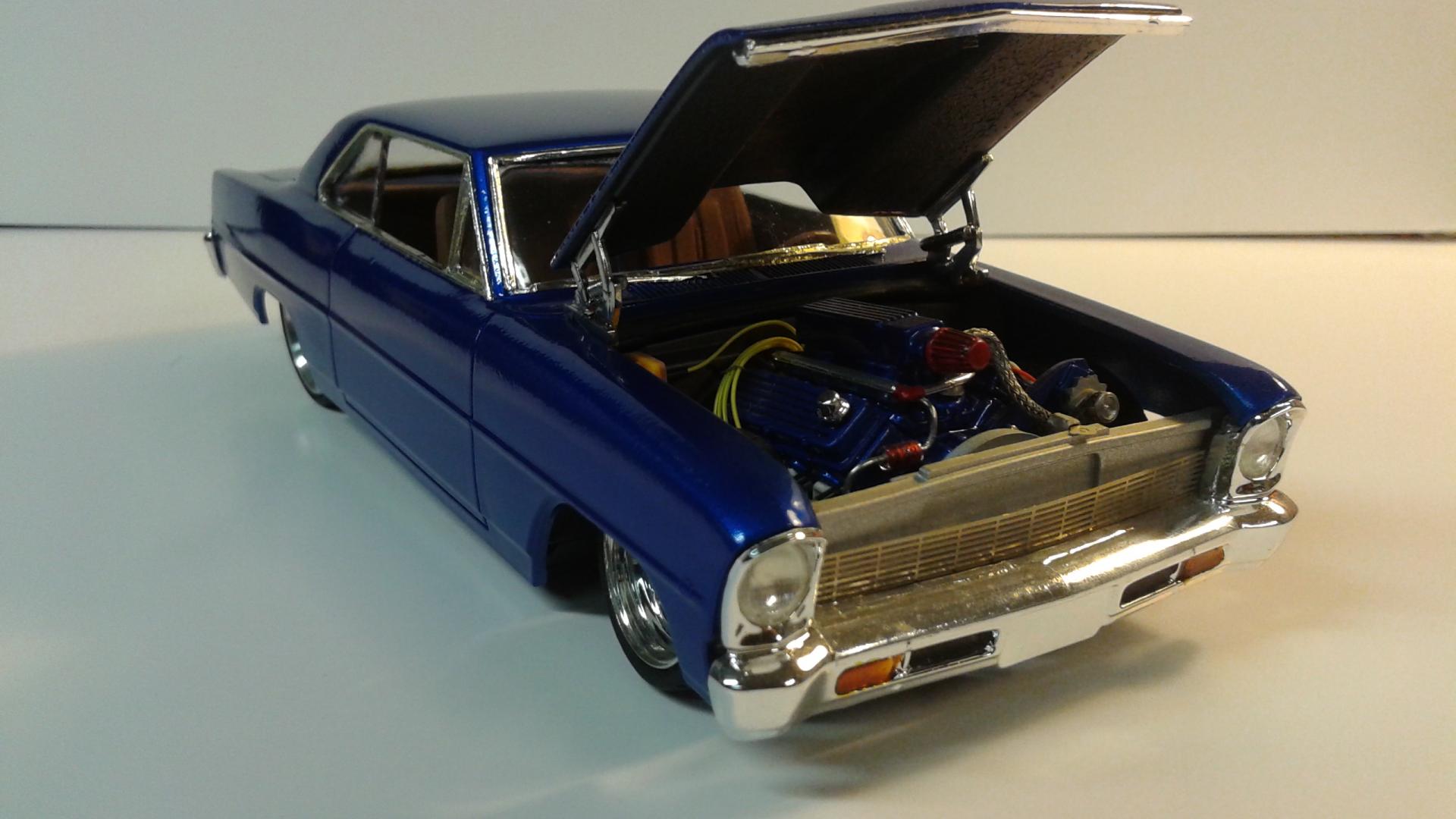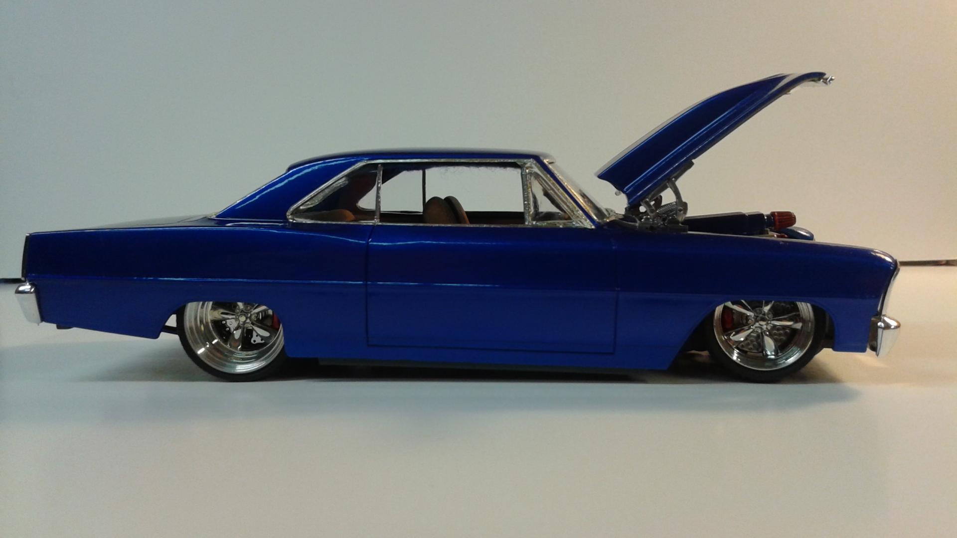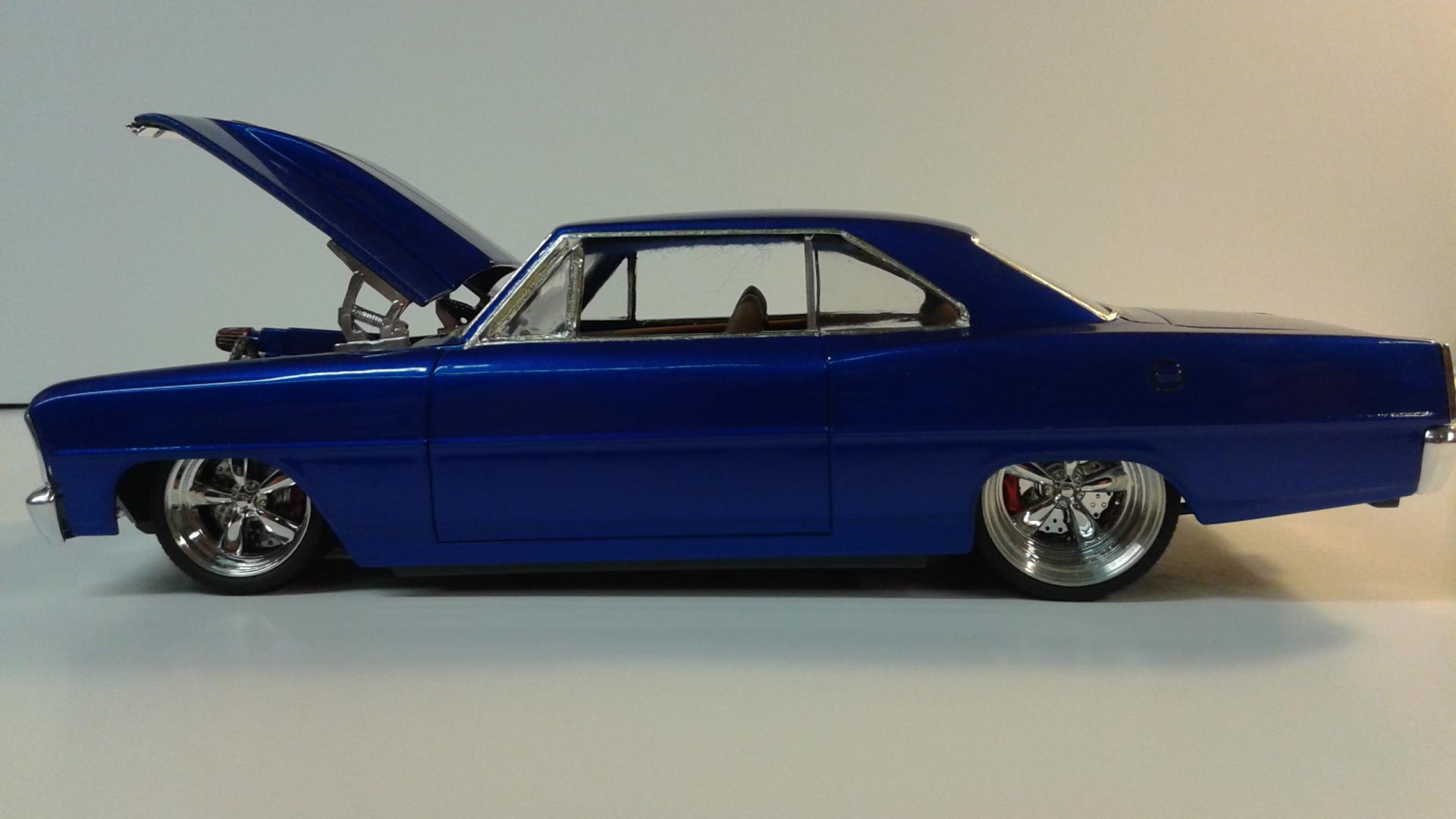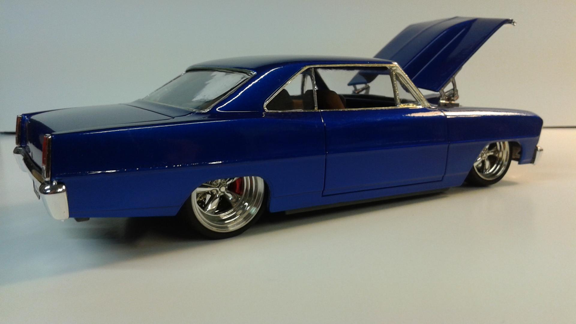Sorry it's been while since I downloaded anything! Well this is my first build of the year 67 Chevelle pro touring pegasus wheels and disk brake. house of color pearl black over silver base and three coats of clear. Stock motor with wiring two tone interior black light gray some photo etched inside aluminum drive shafts and soldering for exhaust pipe. I did this build for my wife hope she likes it! ! Sorry for the wagon in pic.