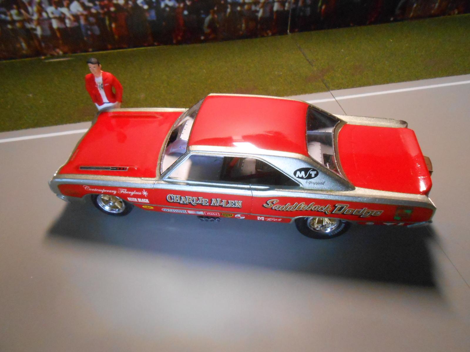 One of my favorite things I like to do with model building is to make sets (or groups) of cars for specific purposes, usually for mini displays. These are cars from my Early Dragster Evolution group diorama which focuses on the early front engine Dragsters. The first 3 cars were custom built to fit this theme. All the cars have high detail motors and interiors along with nice paint finished and period graphics. 1) The Bug- Officially recognized by NHRA as the first Rail Job (or Dragster), this car was originally built from an old Model A frame that had a pesticide sprayer on it used on the family orchards. Built in 1950, the flathead Ford could hit 113 MPH in the quarter mile. 2) Bob's Mobil Special- By 1955, the 'in thing' for Dragsters was to use leftover Indy or Midget car bodies for aerodynamics. Running a modified gas small block Chevy,I built this car from an old Atlantis Dragster with extra body parts molded in. 3) Straightaway Engineering- By 1960, it was determined that the aerodynamics offered by the full bodies did not offset the extra weight. This blown Pontiac powered car was typical of the era and could run 173 MPH. 4) Ramchargers- By 1965, new lightweight custom bodies began to emerge. Combined with the new 426 Hemi, these cars were now over 200 MPH. As an extra bonus, the new bodies gave race teams a new source of income...sponsor advertising. 5) Jade Grenade- By 1969, front engine Dragsters had hit their high water mark. The longer, more powerful cars were now capable of running over 225 MPH. 6) Swamp Rat 14- After a horrific transmission explosion in 1970, Don Garlitts came up with a new style rear engine Dragster that was both safer and faster than the old front engine slingshots. By 1972, most all the front engine cars were sitting in barns and fields gathering dust. A new era of Dragsters had begun. The last shot is my '98 Shelly Anderson rail (featured in another post) with two early cars. This is a great visual on how the Dragsters had evolved to that point. ENJOY