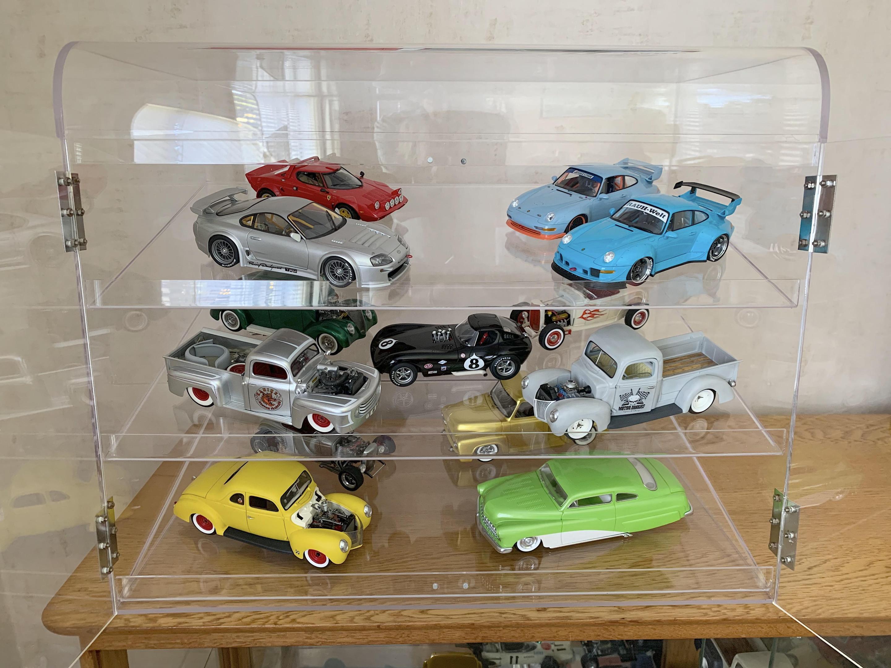 You could have a look around for acrylic food display cabinets as they come in a wide variety of shapes and sizes. The one I have here is completely dust proof and when you work out the number of cars that can be fitted inside it worked out far cheaper than buying individual cases.