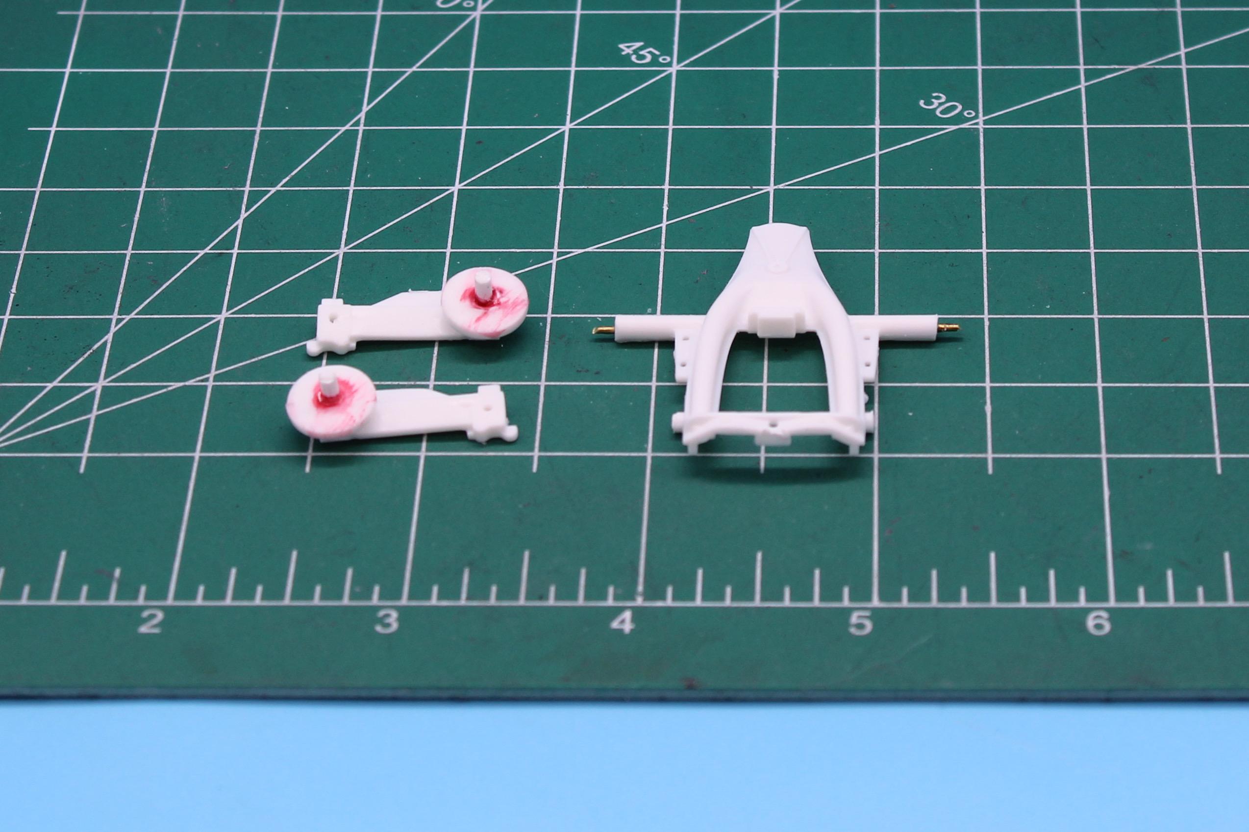 Thanks fellas! Only a quick post tonight because my wife had plans for me this evening that I forgot (but she didn’t…) Rear end on this Revell kit is cleverly molded and easy as pie to put together…if you’re going stock height, which I’m not: What I like to do with these is separate the trailing arms and driveshafts from the assembly (I’m sure that wishbone shaped brace has a particular name in VW-circles…anyone know?) then pin them with brass rod so they rotate like the real thing and then just lock them in place where I’ve got them where I want them. Here’s a before, with the offset on the wheels fixed so the track width is right: The separated rear suspension setup: And the stance adjusted to where I want it: Not a big project, and easier than the front now I’ve figured it out… more soon, soon as I’ve done more!