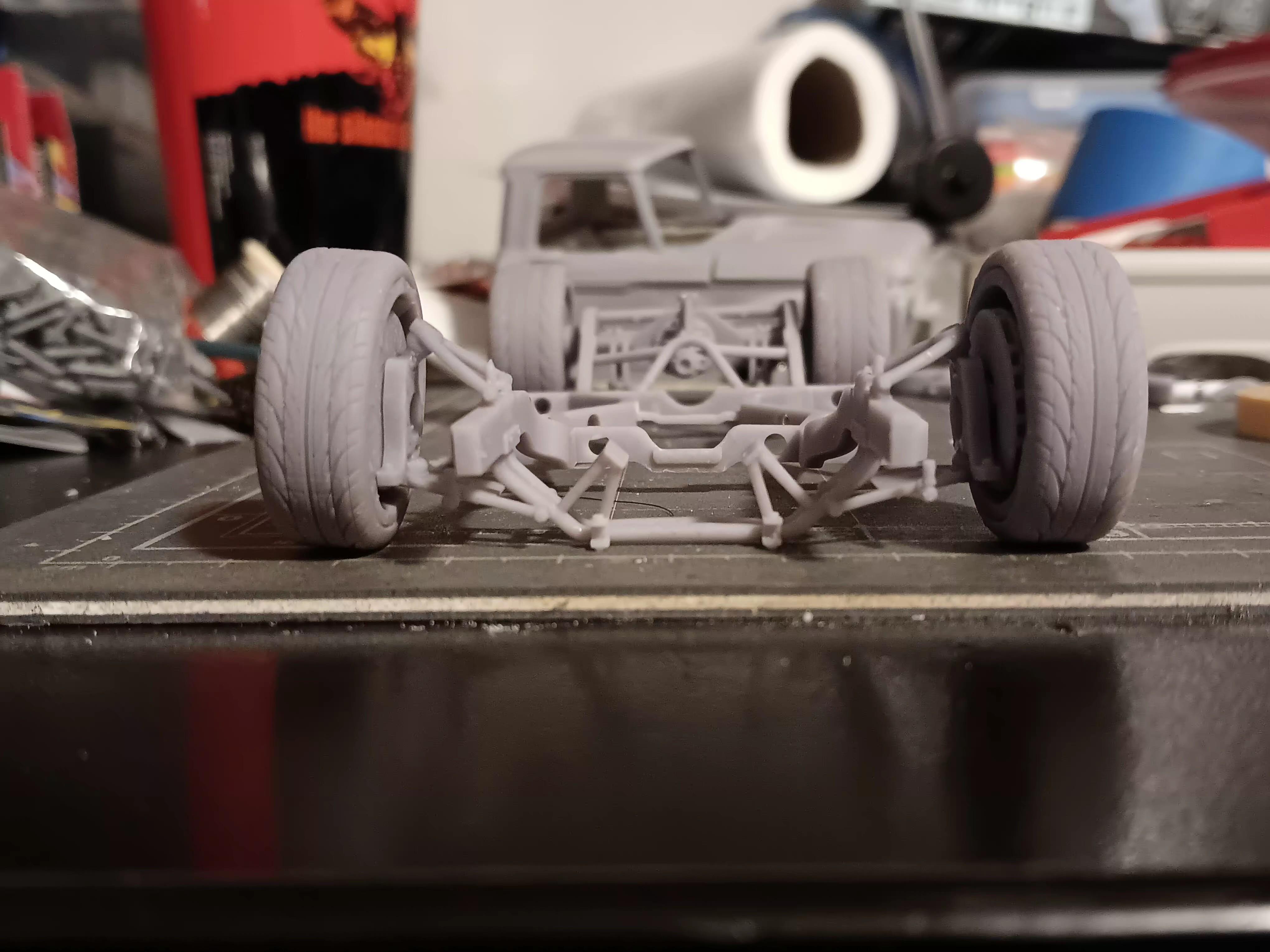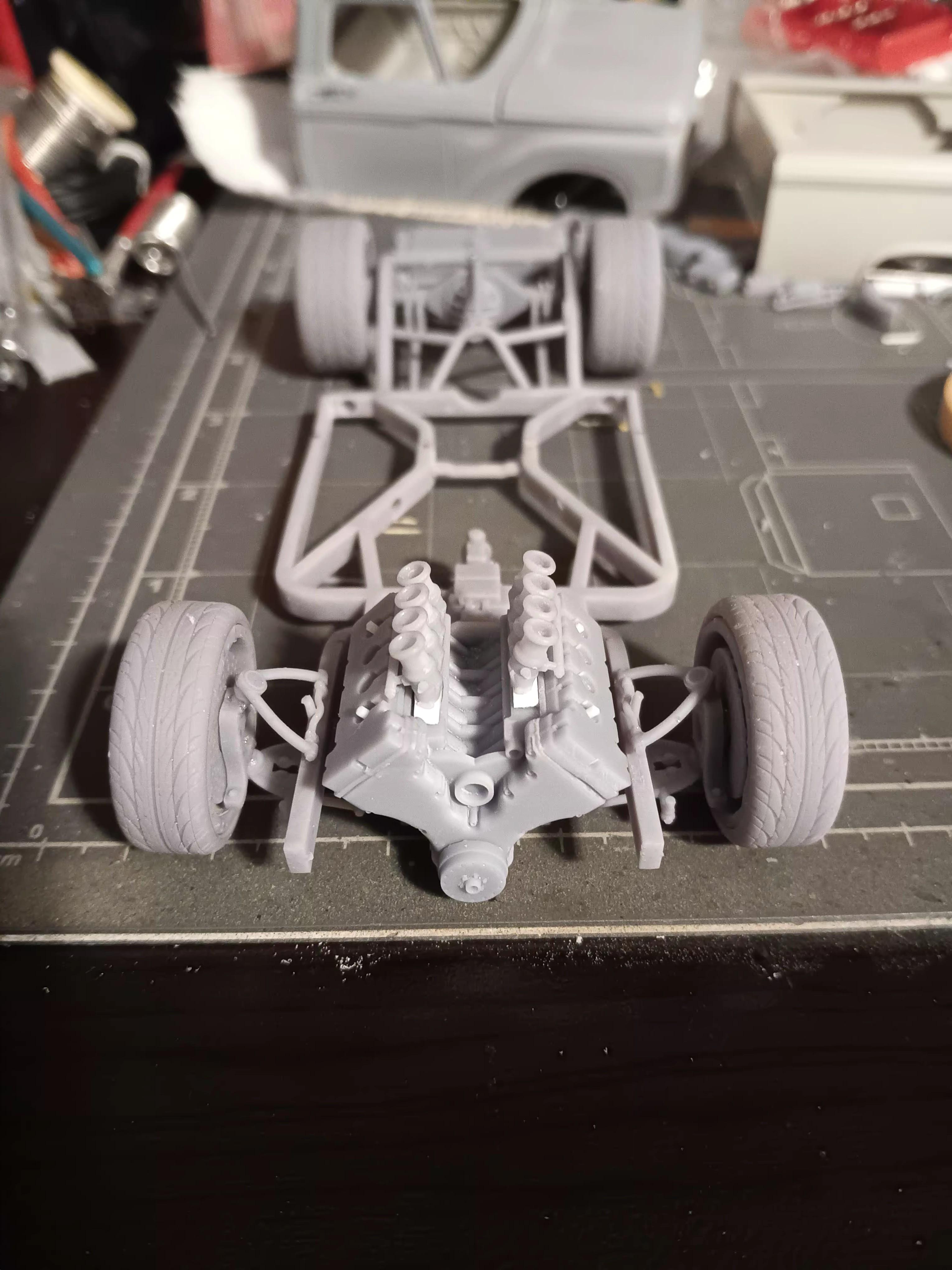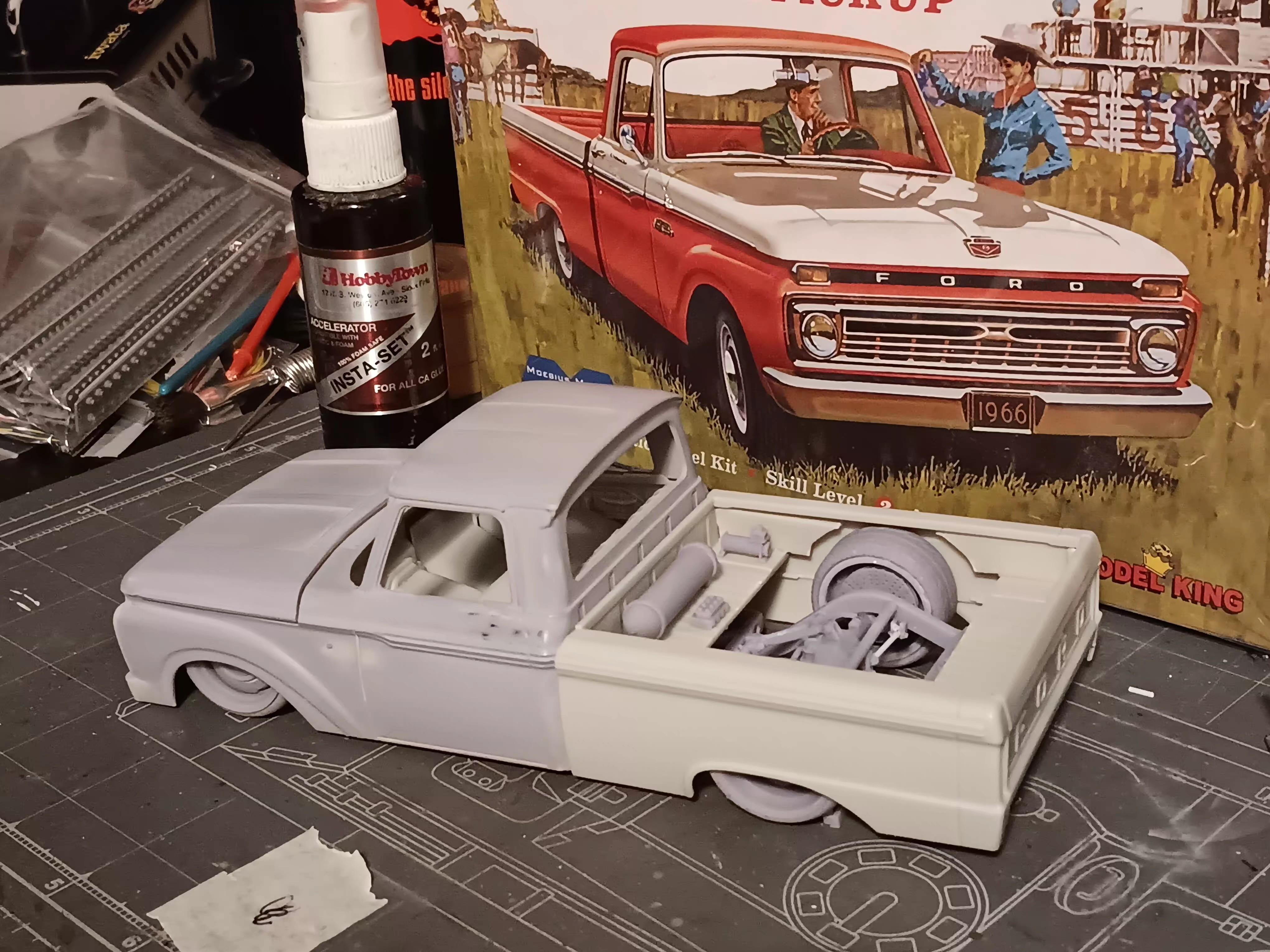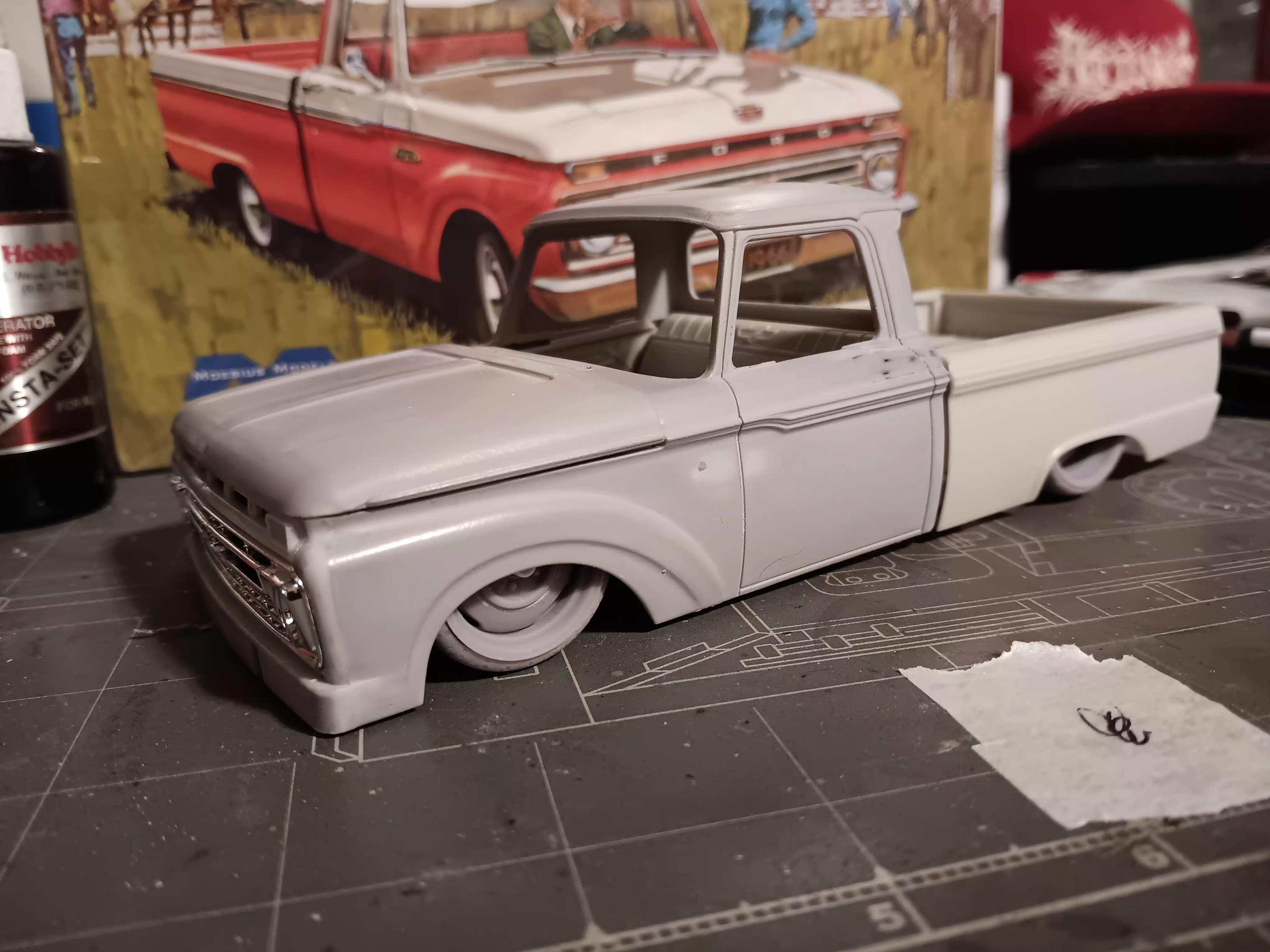 Moebius/ Model King 1966 F100 Styleside short bed resto mod "Hard Parked" Edition The only parts used oob are the interior tub, seat, dash & wheel, and of course, the body. This truck is almost entirely 3d printed. I used a custom chassis with all tubular suspension components, bags that are modified to fit, as well as the pumps & tank. Some very nice 21" factory style steelies. Billet Coyote with ITB's and a pair of small block chevy headers that fit coincidentally, too well. Batteries, switches, radiator & cap, etc etc. Lots and lots of dry fitting and adjusting with a slow setting CA glue. Once the suspension was finalized, I had to set the track width to get the wheel fit flush. I filled the door handles, emblems and gas cap for a nice shaved esthetic. Now I can finally finish up the body work on the inside of the bed and scratch a tonneau cover.