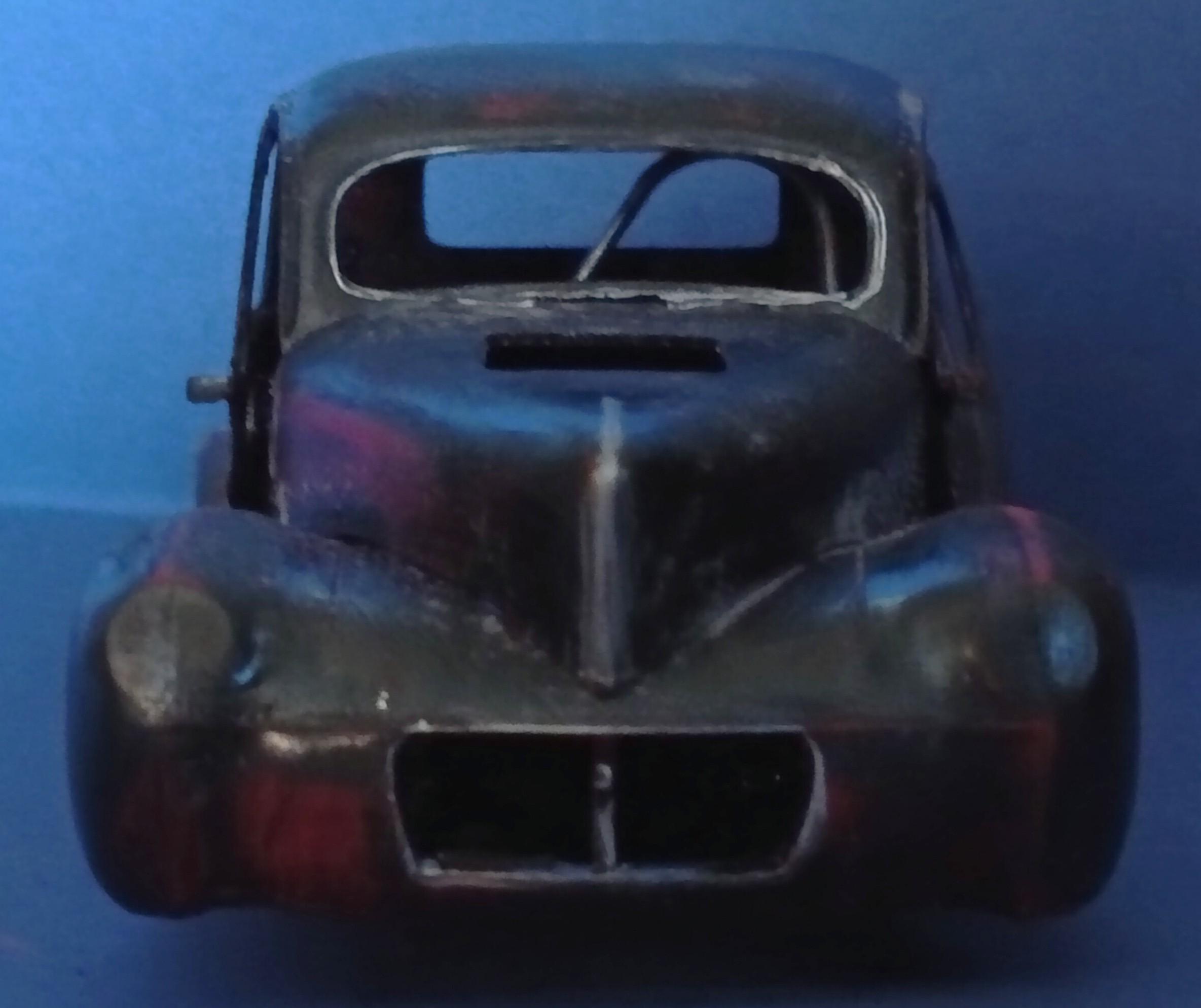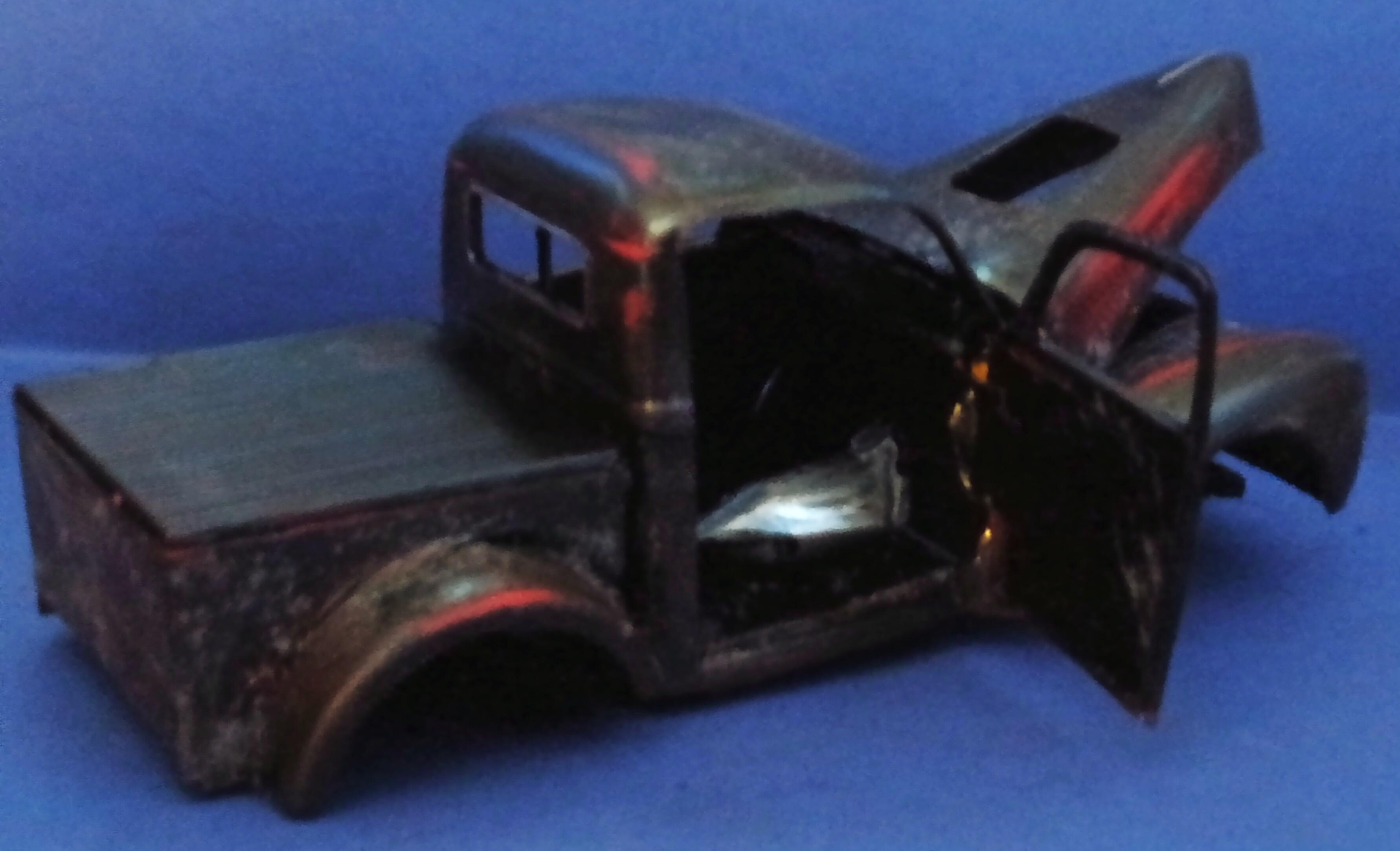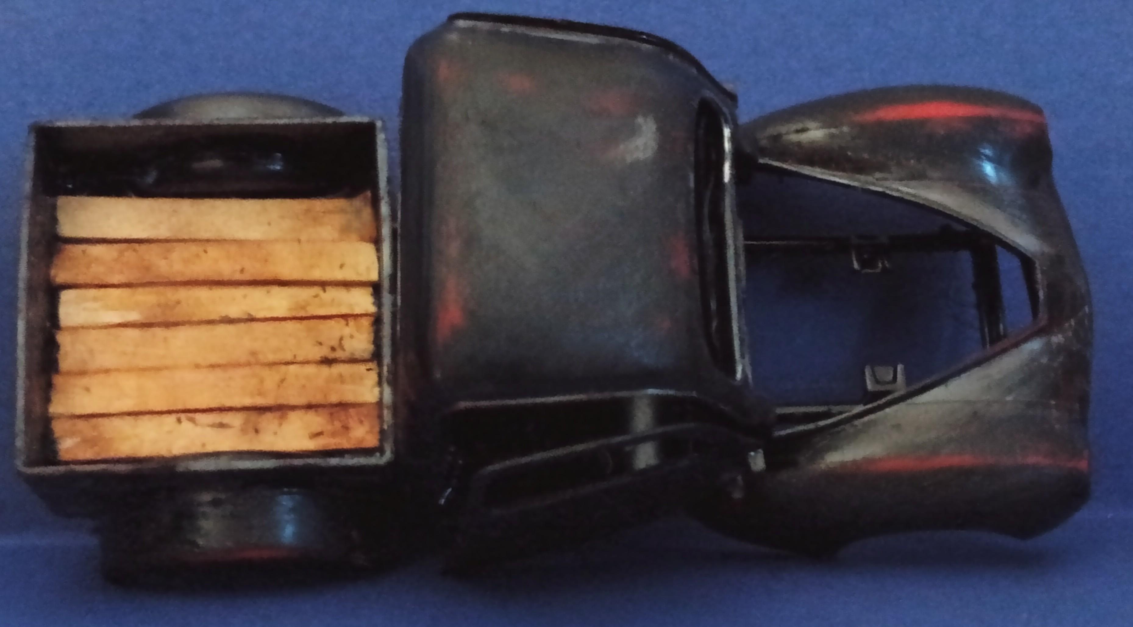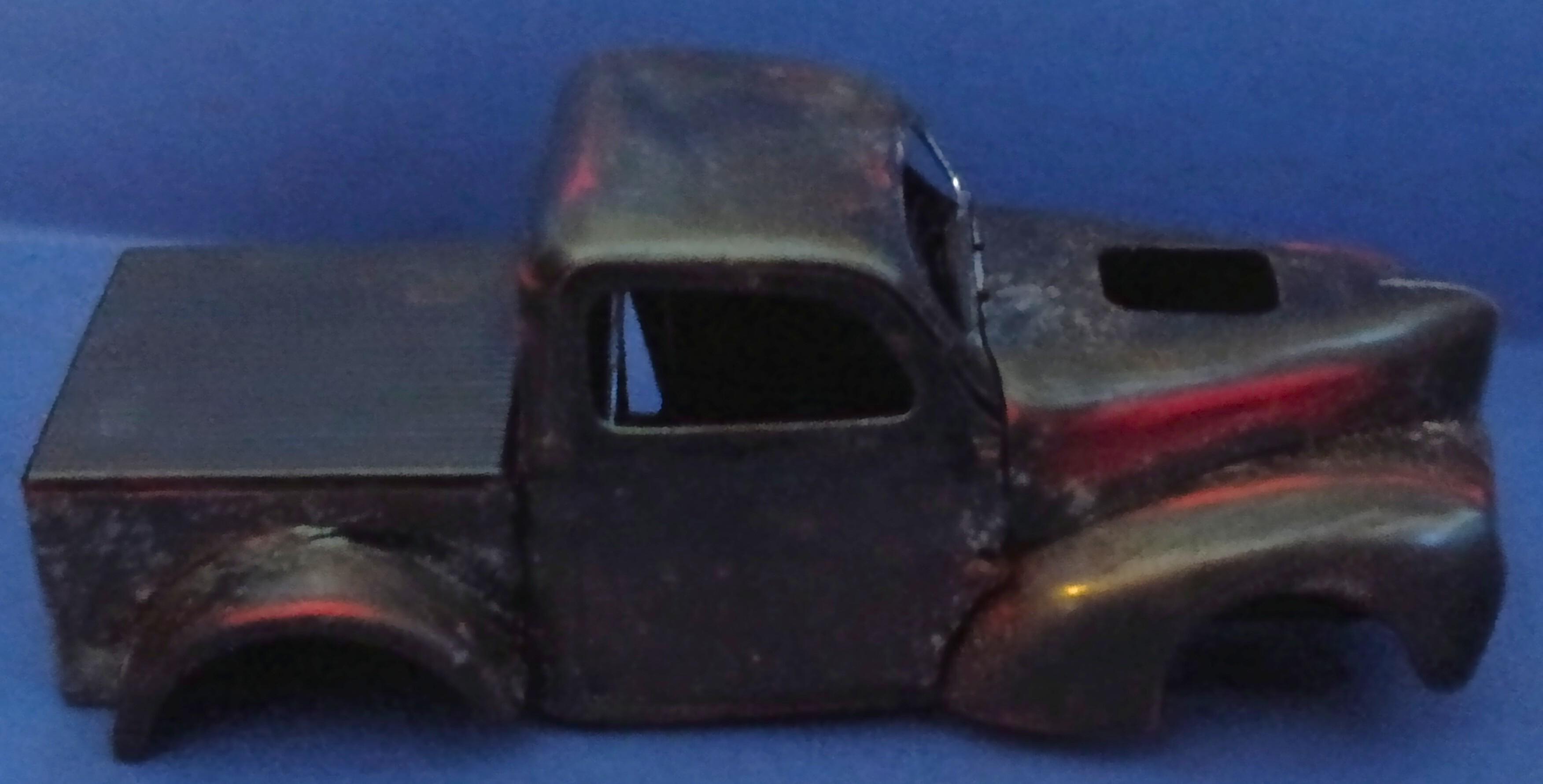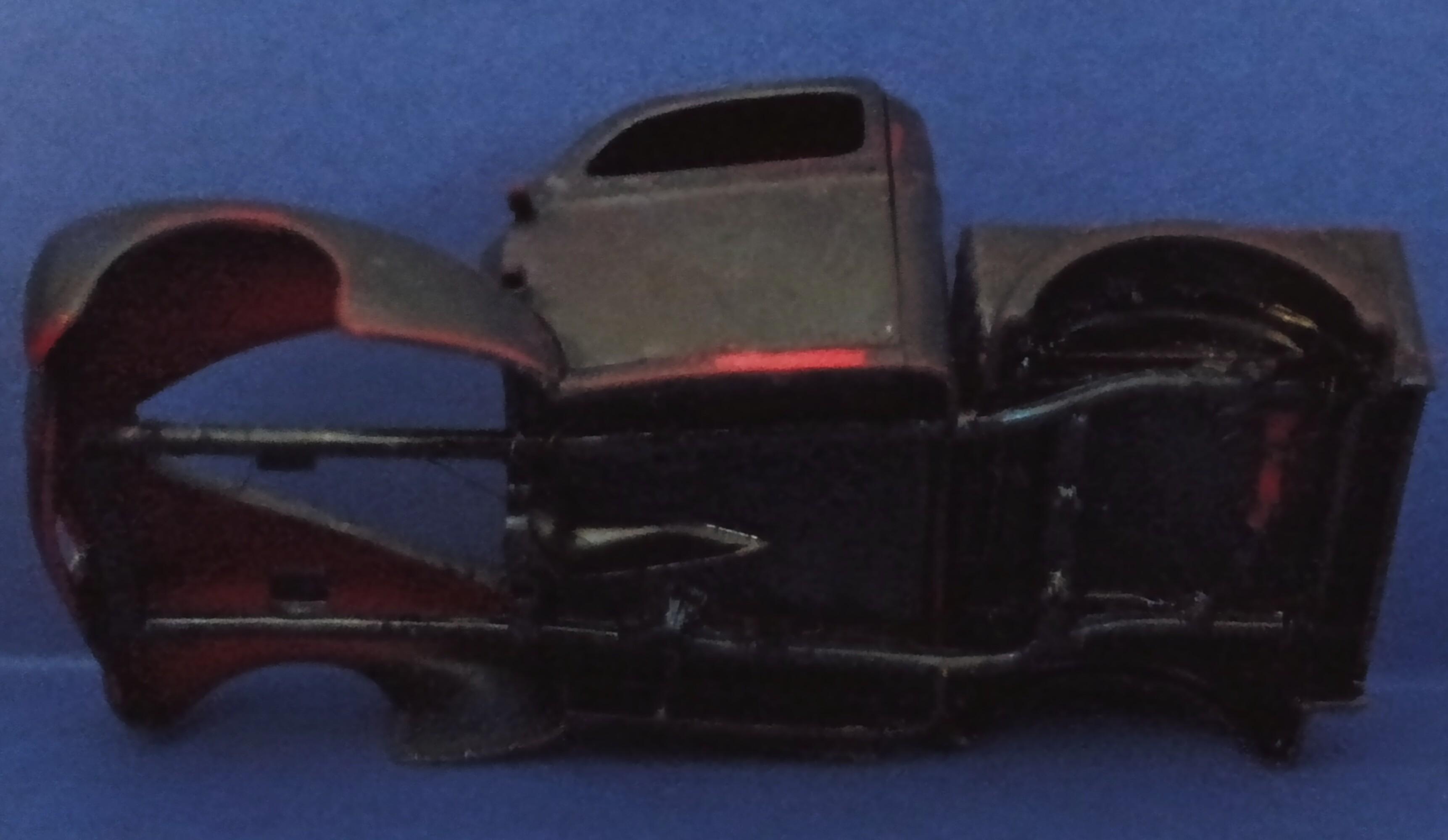 Start on a Jim Keeler tooling Revell '40 Willys Overland pickup gasser in "out of longterm storage" condition. The build is getting a DeSoto hemi V8 swap with custom headers and a chrome dropped axle, some areas of red will be replaced with corrosion, interior will be 2-tone buff & black with simulated age wear, a few parts/oil/gas logos will go on the firewall, hood sides and glass, and a scratchbuilt wood slat bed floor is installed with a battery to be placed in the front left corner. Wheels are kit supplied with AMT Racemaster slicks in back/MPC Goodyear Polyglas up front. Weathered finish is Krylon satin black sanded down, rubbed with Grumbacher oil pastels in burnt sienna/raw umber and dusted with talcum, with a homemade black/rust wash over certain areas. Droopy hinges are made with an old political sticker cut into strips and are to be concealed behind the dash and gauge panel/door cards.